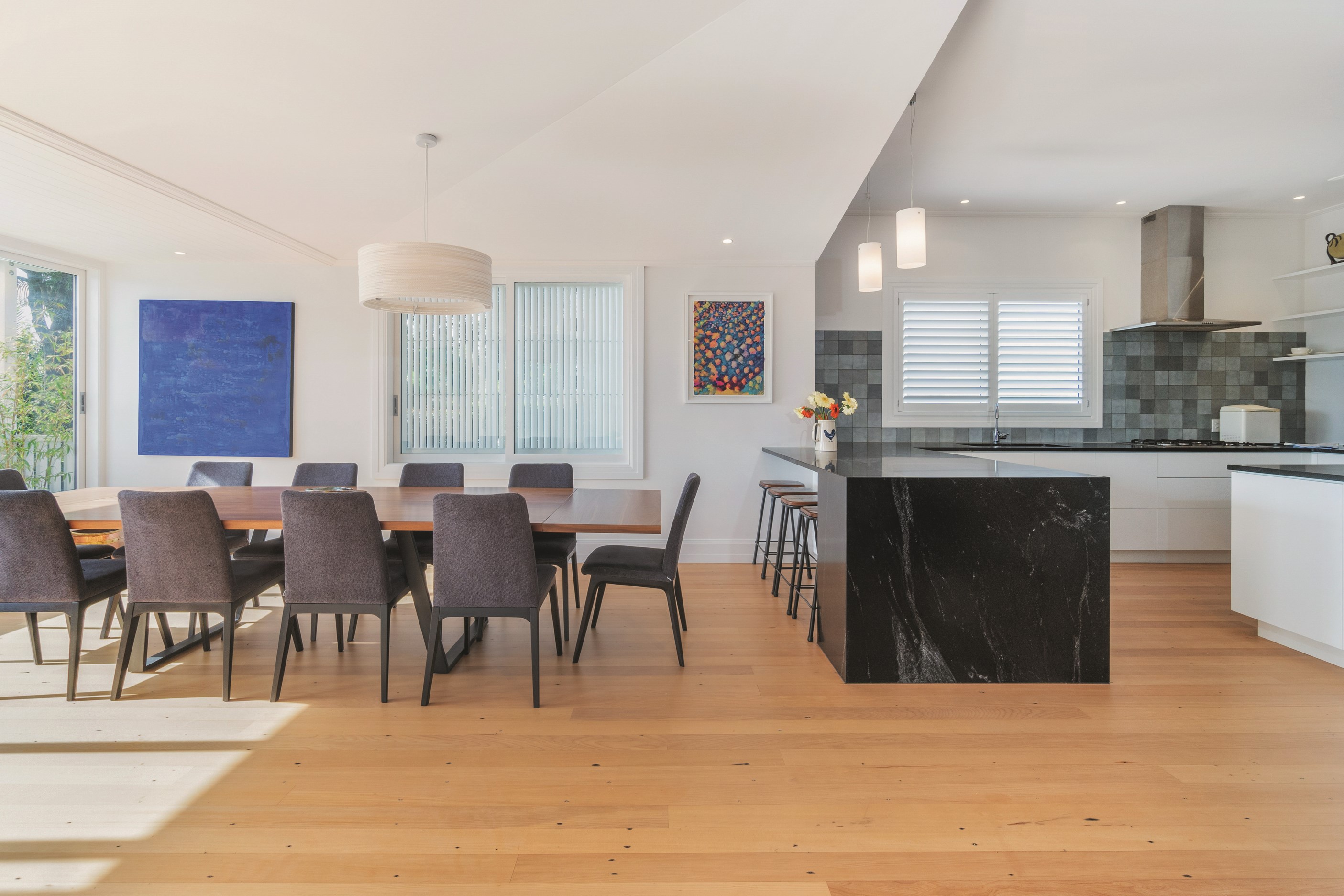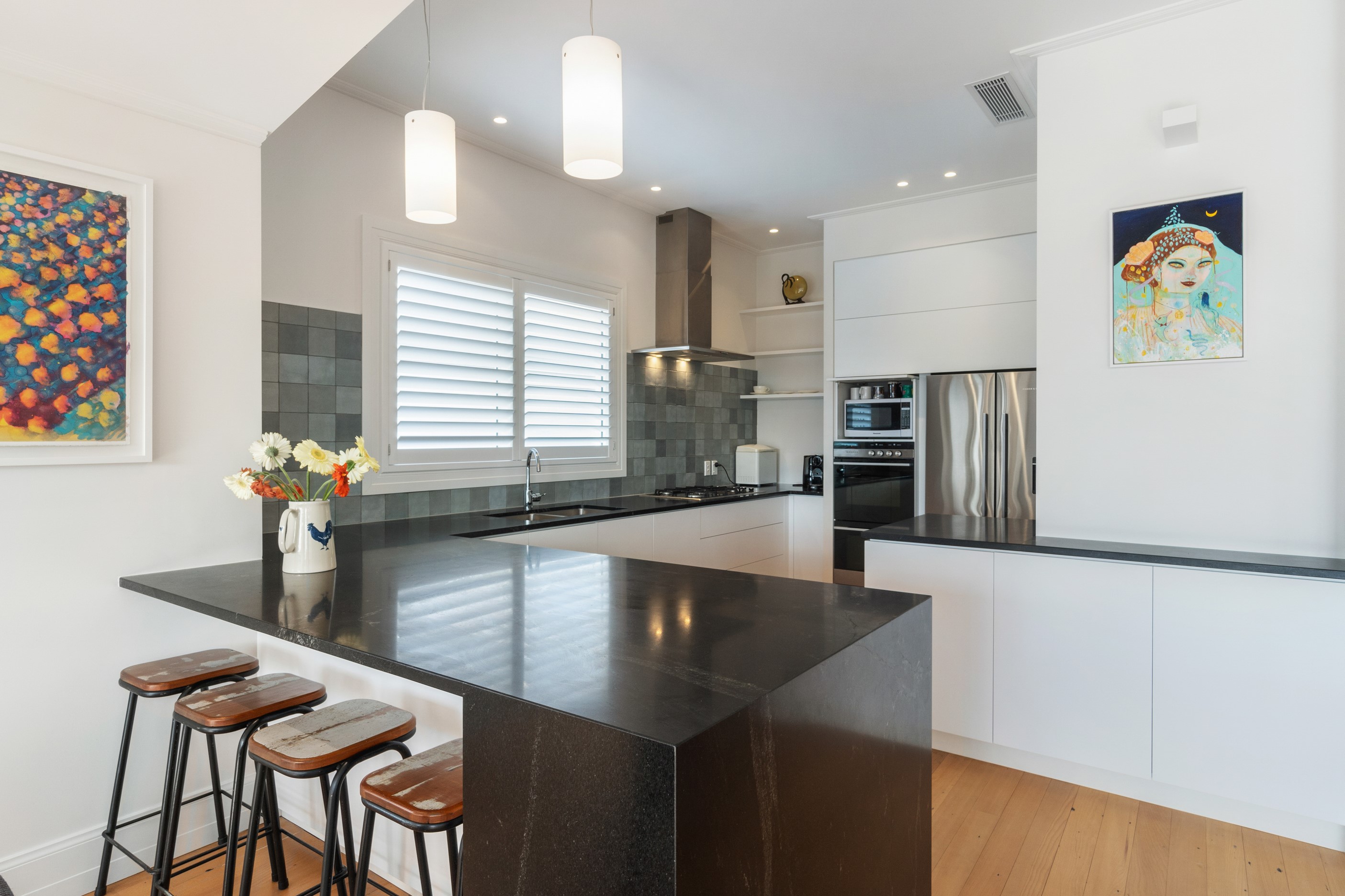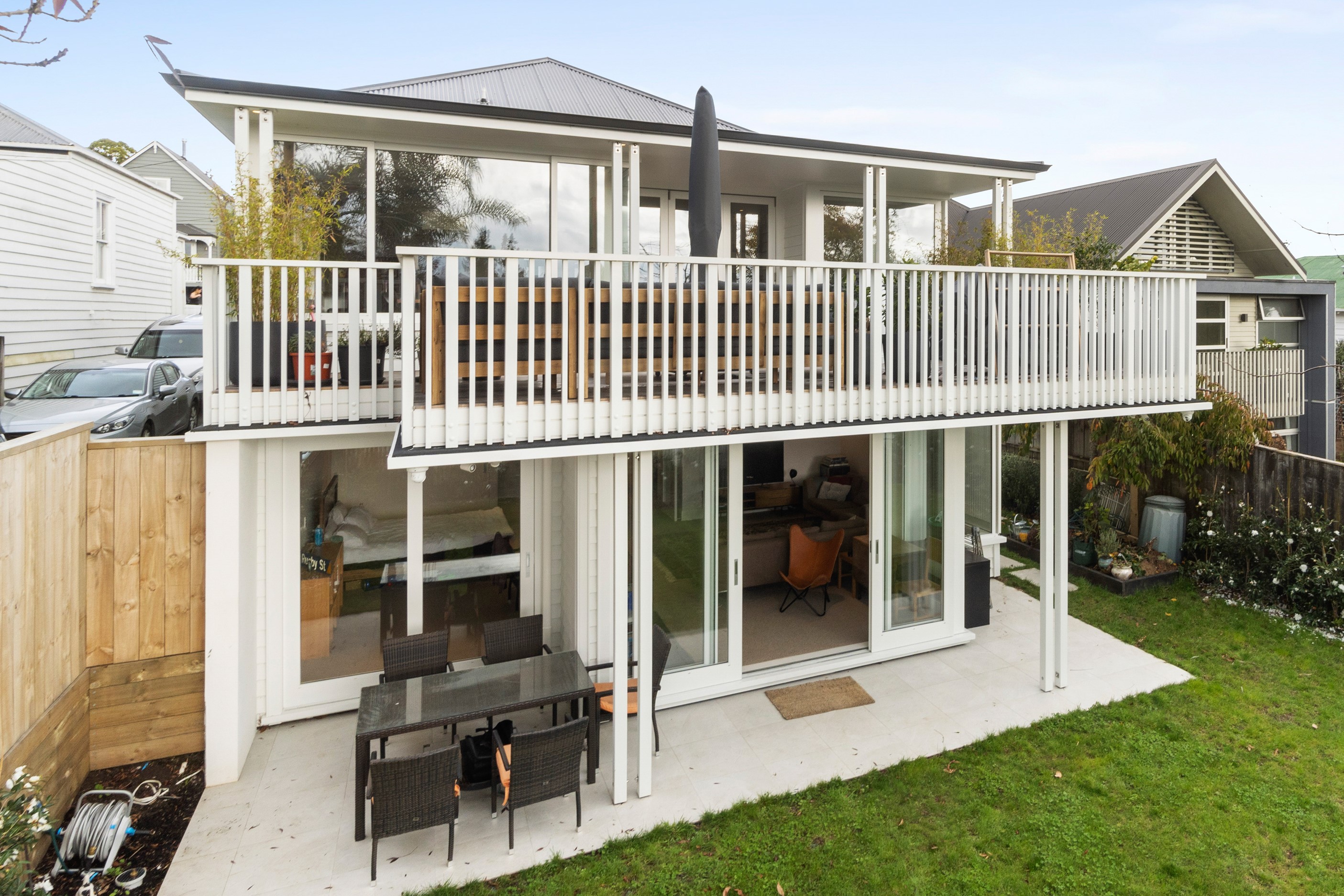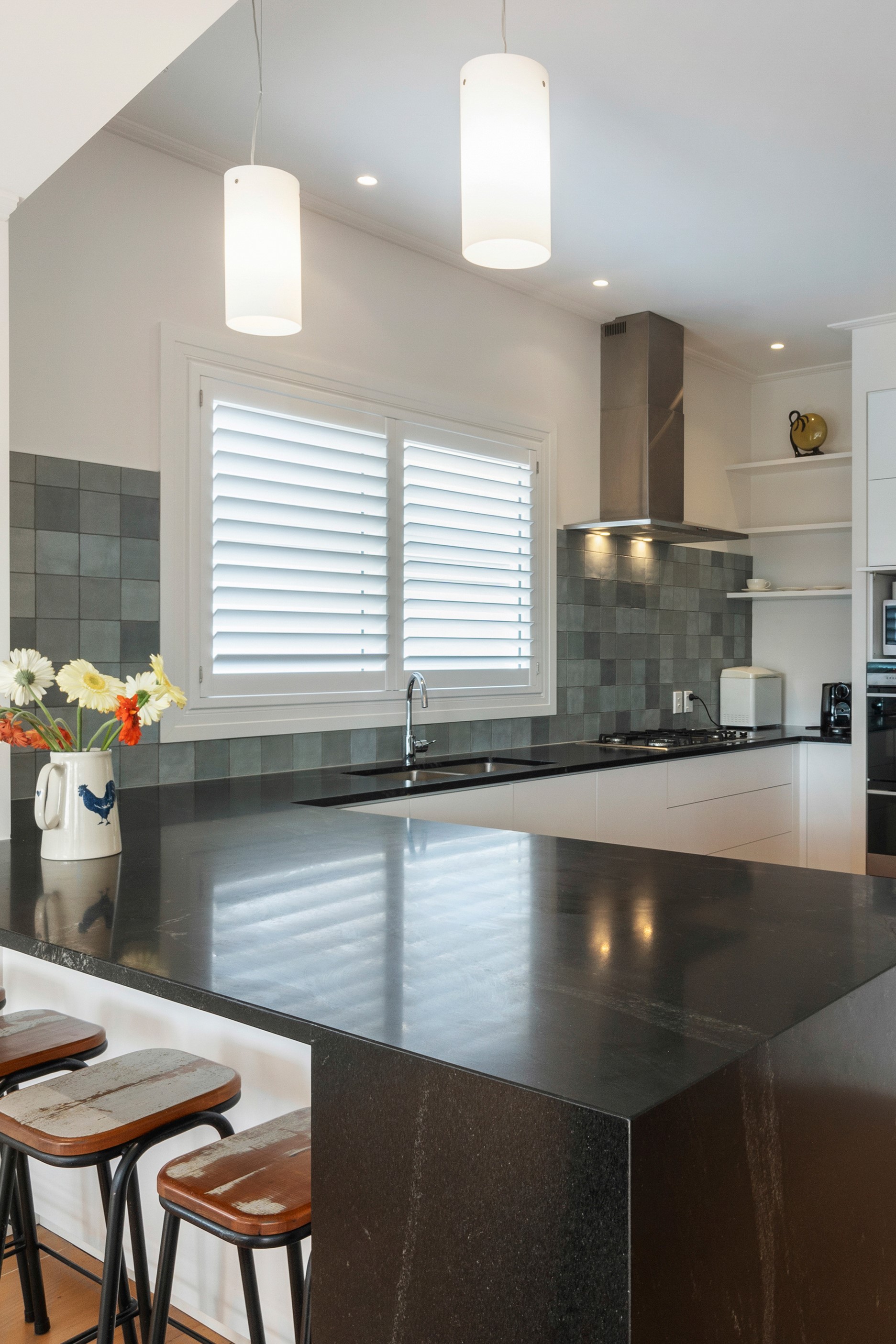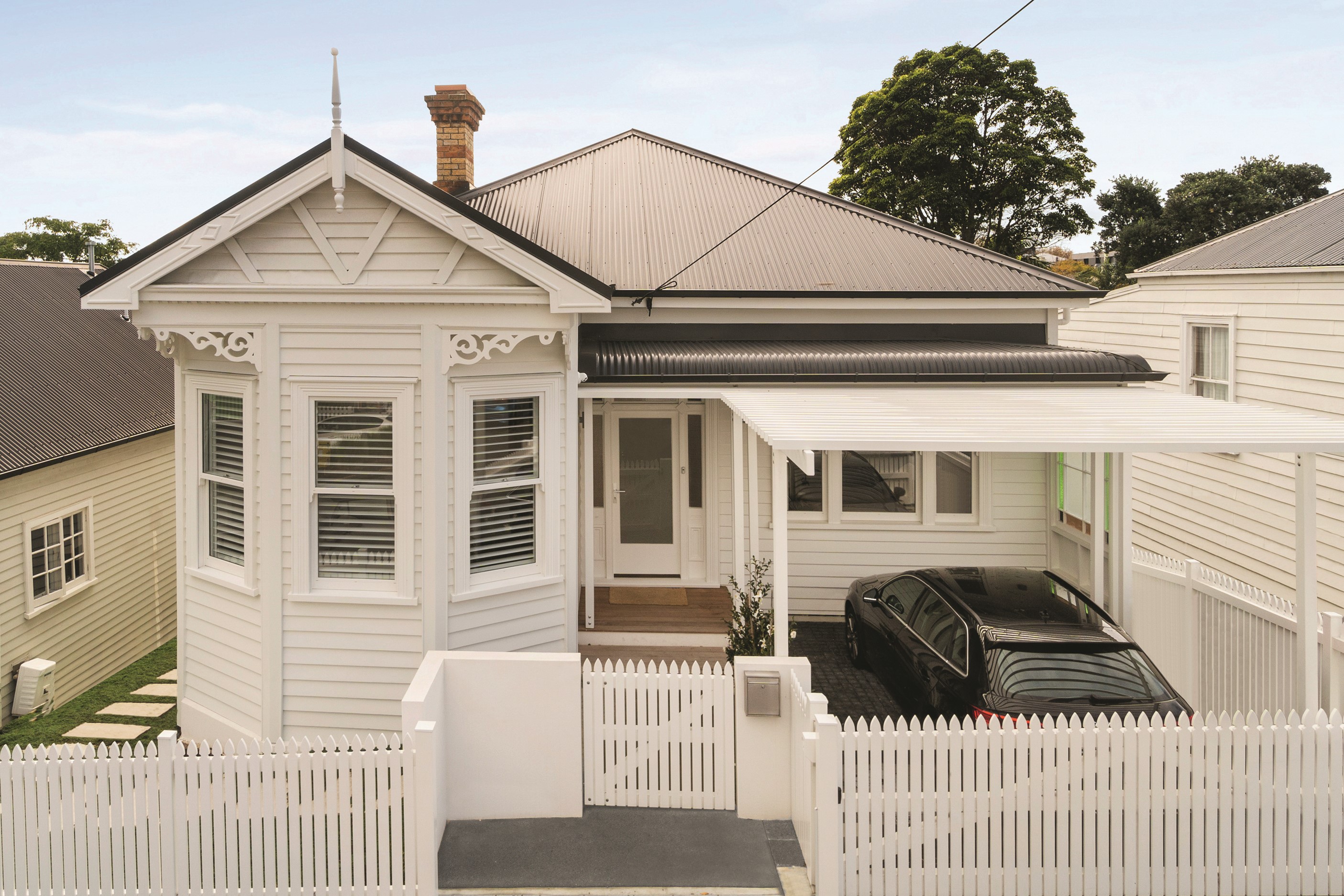 When renovating an existing home, it is common practice to add extra living space. But the owners of this tired inner-suburban villa had a further request on their wish list, one that many take for granted – an off-street parking space for the family car. With a tight site and limited access, there were some big challenges to overcome. Yet the potential to create something special was even bigger. Precise planning and clever design allowed for covered, secure parking. Next on the list was maximising the spectacular views and privacy afforded by the elevation at the back of the site. The home was extended to add a second living space here. A full-width balcony on the upper level soaks up the sunshine and light, while providing shelter for the paved outdoor living space below. Although the house has essentially been rebuilt, it retains its original character – right down to replicating and repairing the pressed-metal ceilings and supporting and retaining a redundant, now decorative, original brick chimney. The result is a charming, yet modern home that seamlessly fits into its neighbourhood.
