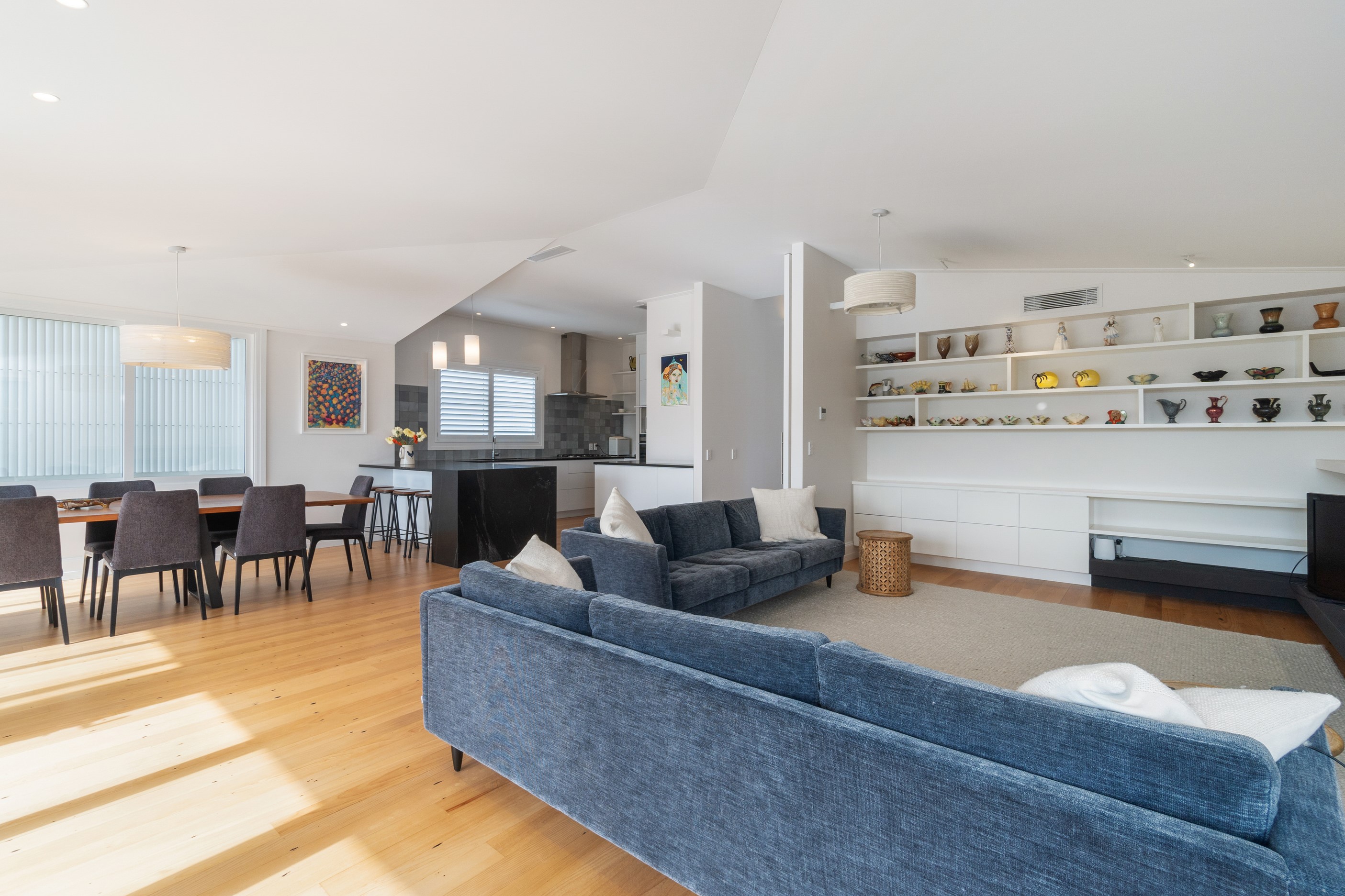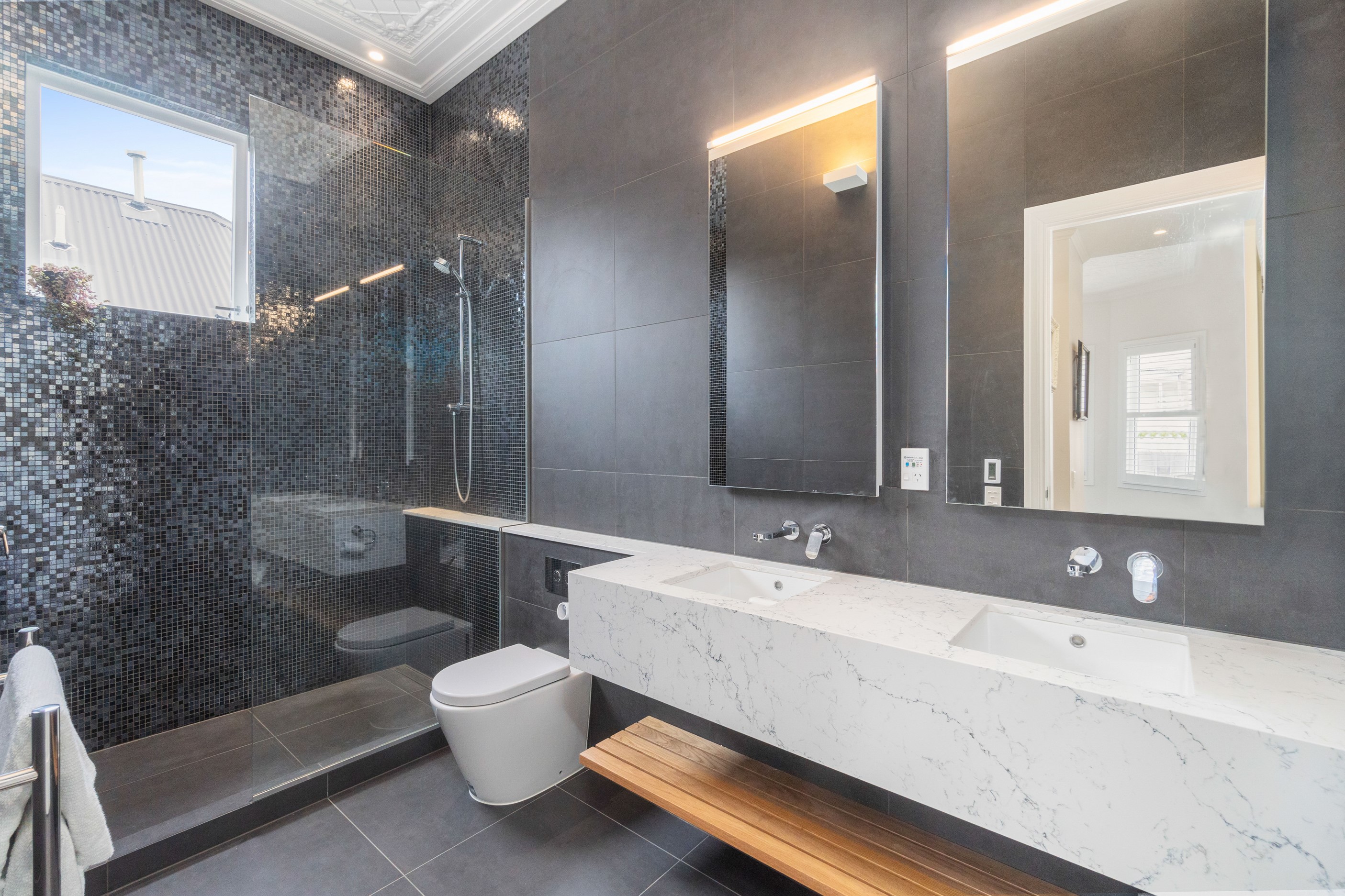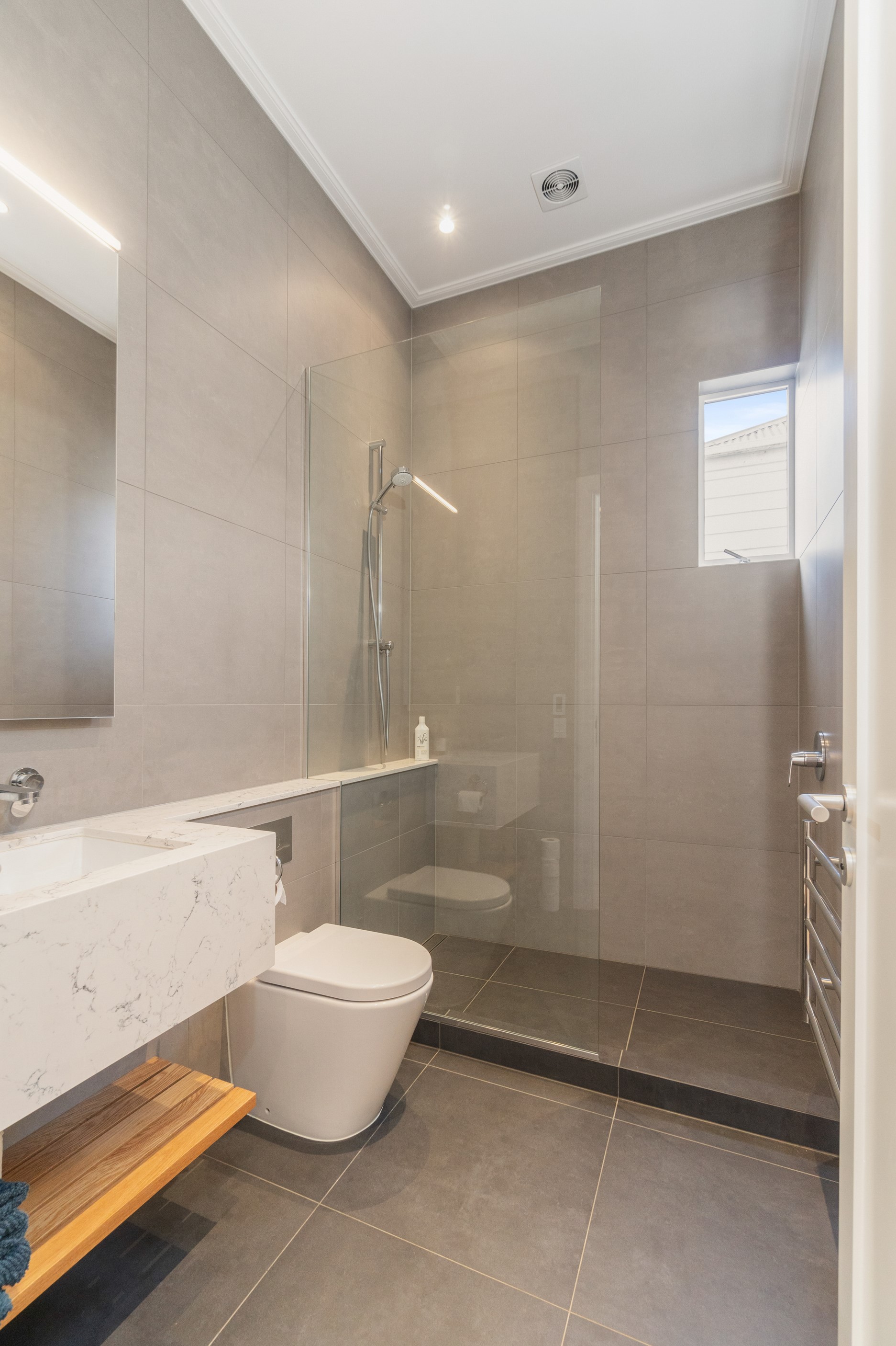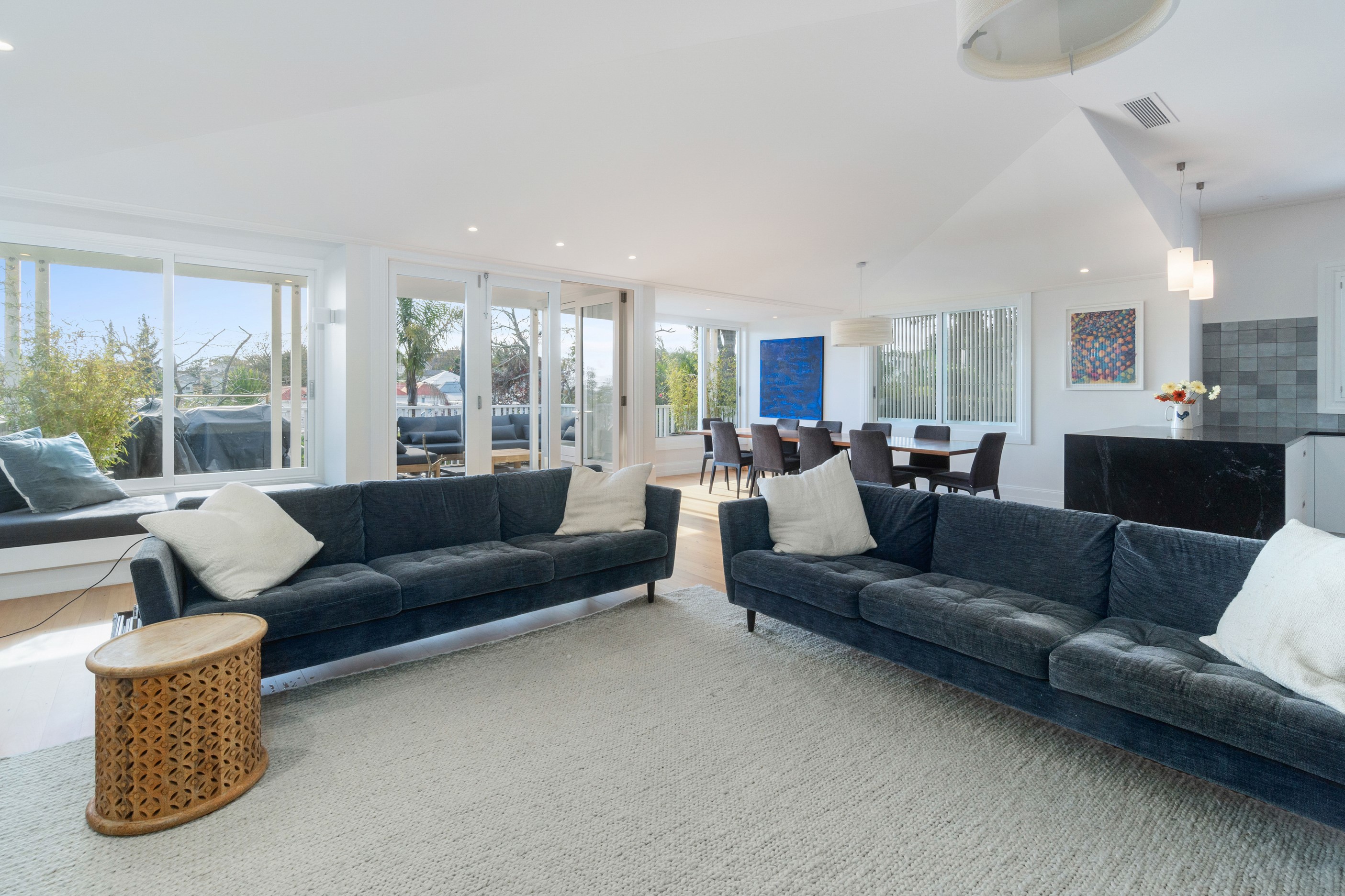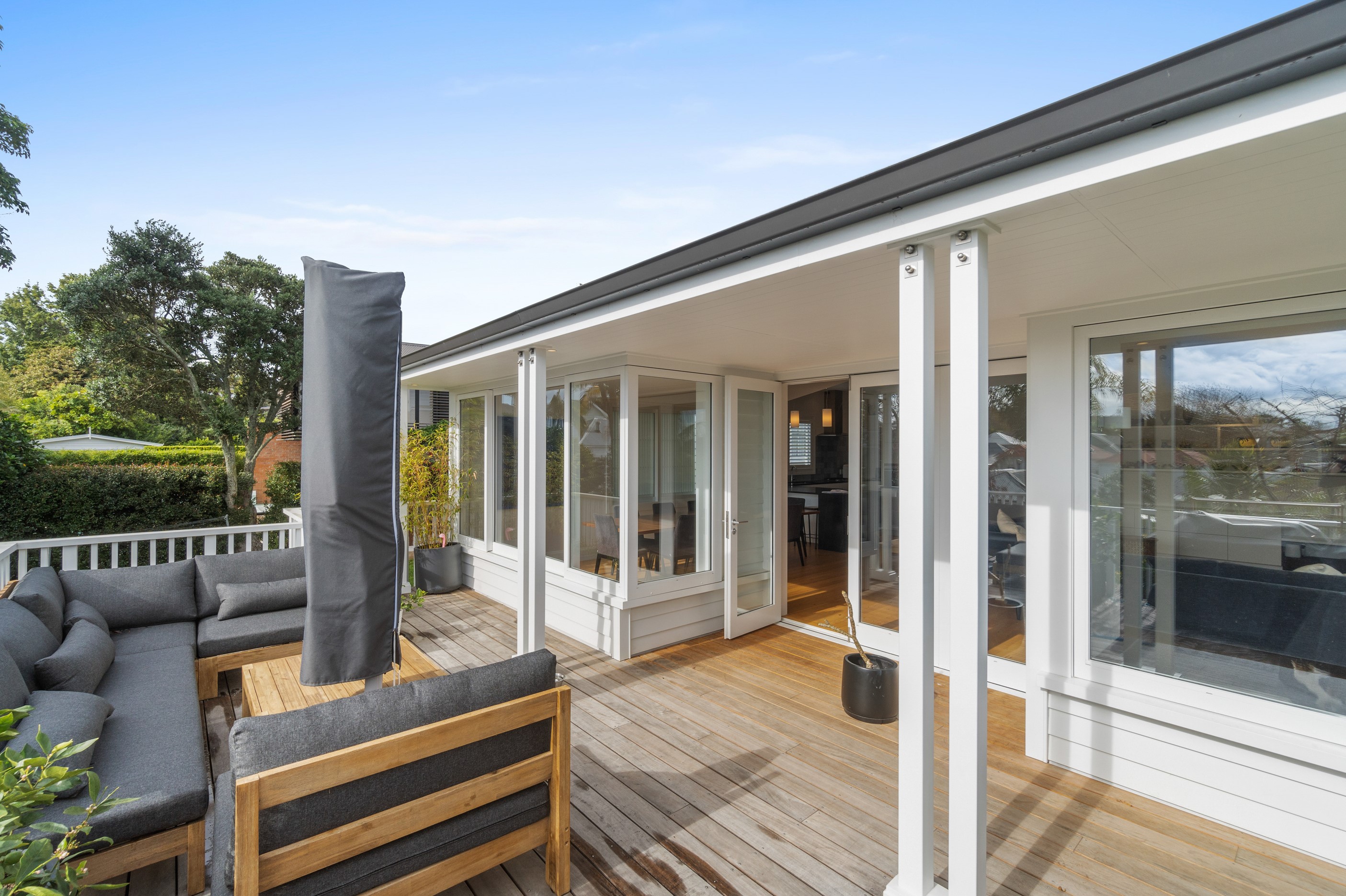 When renovating an existing home, it is common practice to add extra living space. But the owners of this tired inner-suburban villa had a further request on their wish list, one that many take for granted – an off-street parking space for the family car. With a tight site and limited access, there were some big challenges to overcome. Yet the potential to create something special was even bigger. Precise planning and clever design allowed for covered, secure parking. Next on the list was maximising the spectacular views and privacy afforded by the elevation at the back of the site. The home was extended to add a second living space here. A full-width balcony on the upper level soaks up the sunshine and light, while providing shelter for the paved outdoor living space below. Although the house has essentially been rebuilt, it retains its original character – right down to replicating and repairing the pressed-metal ceilings and supporting and retaining a redundant, now decorative, original brick chimney. The result is a charming, yet modern home that seamlessly fits into its neighbourhood.