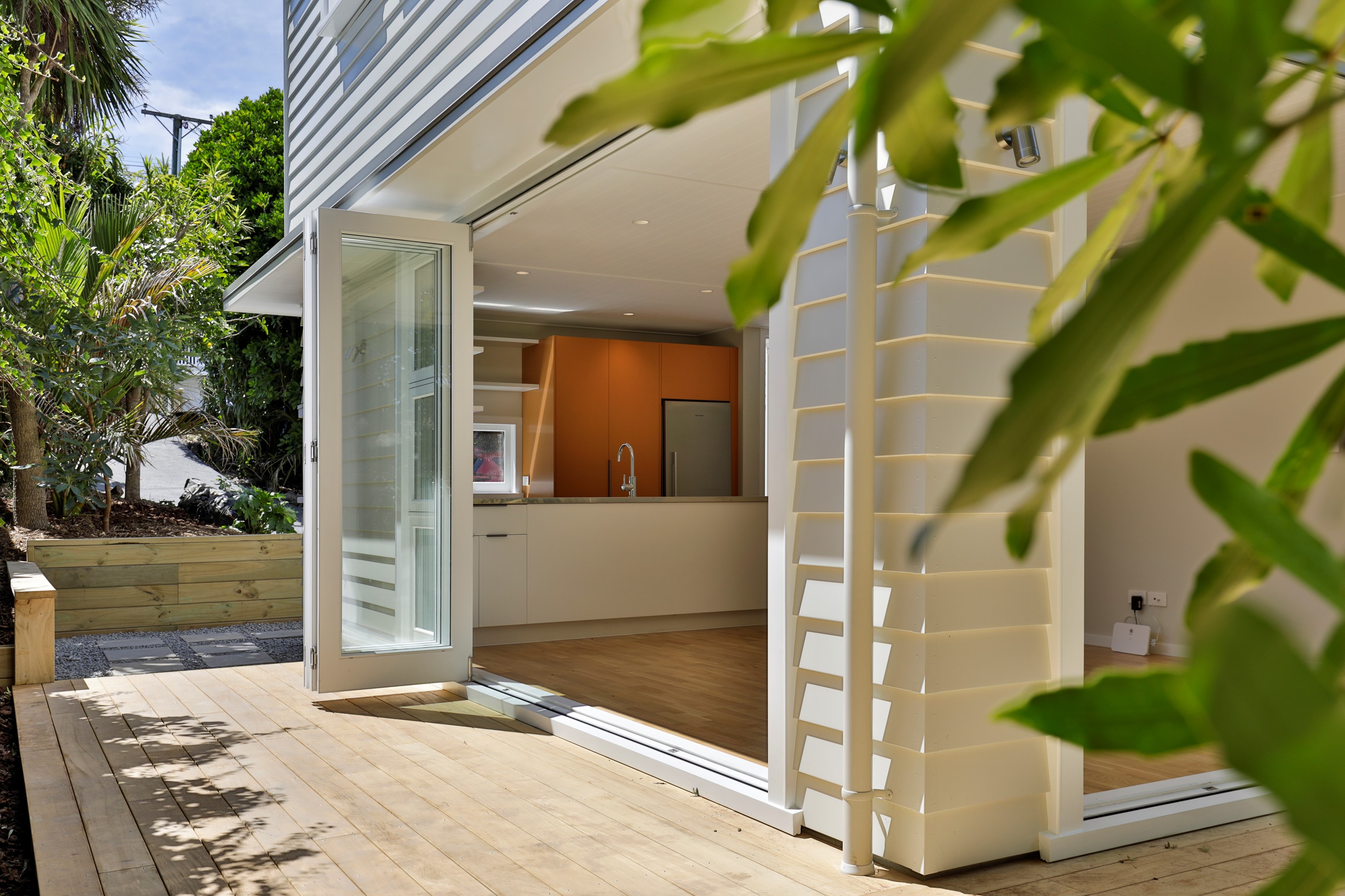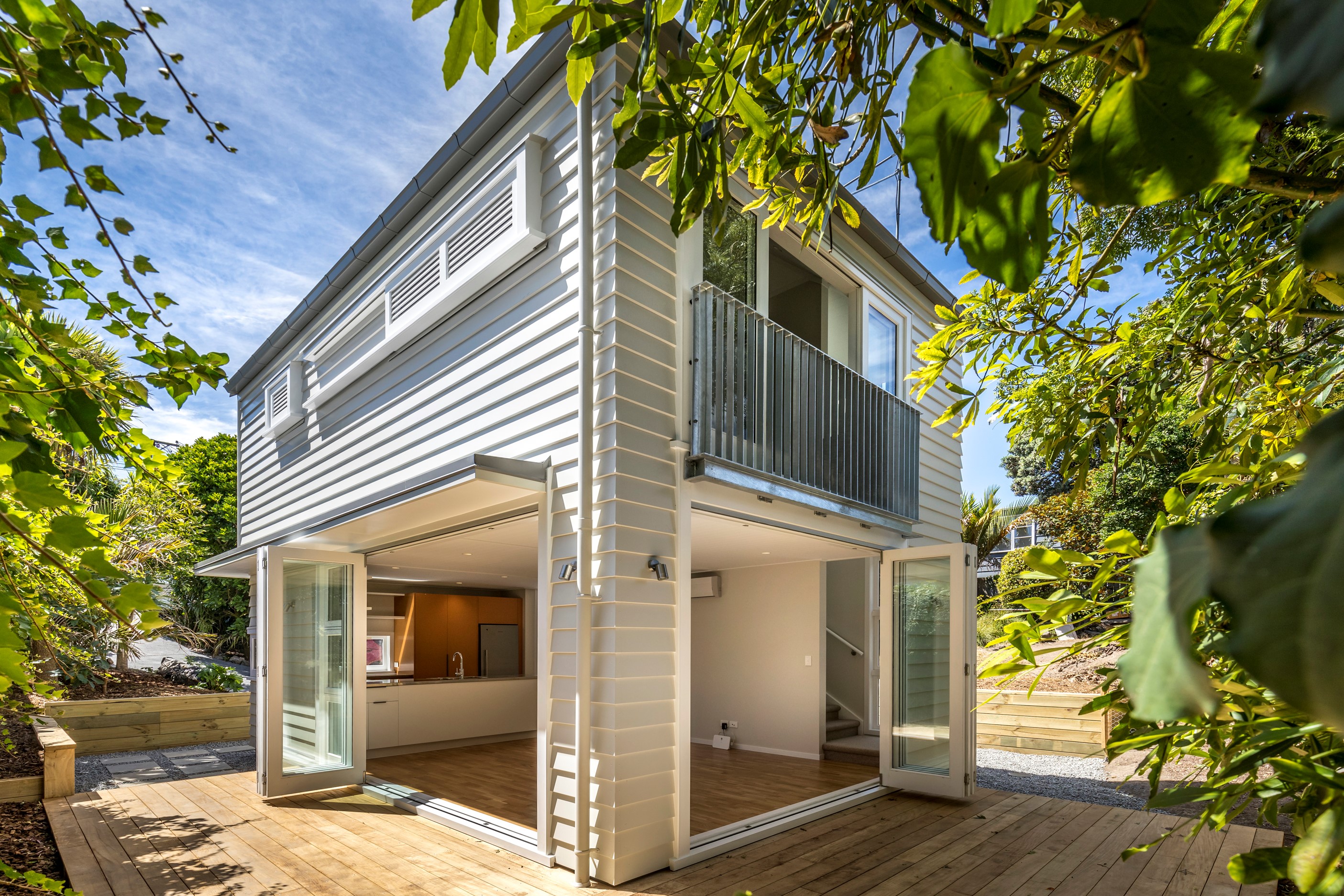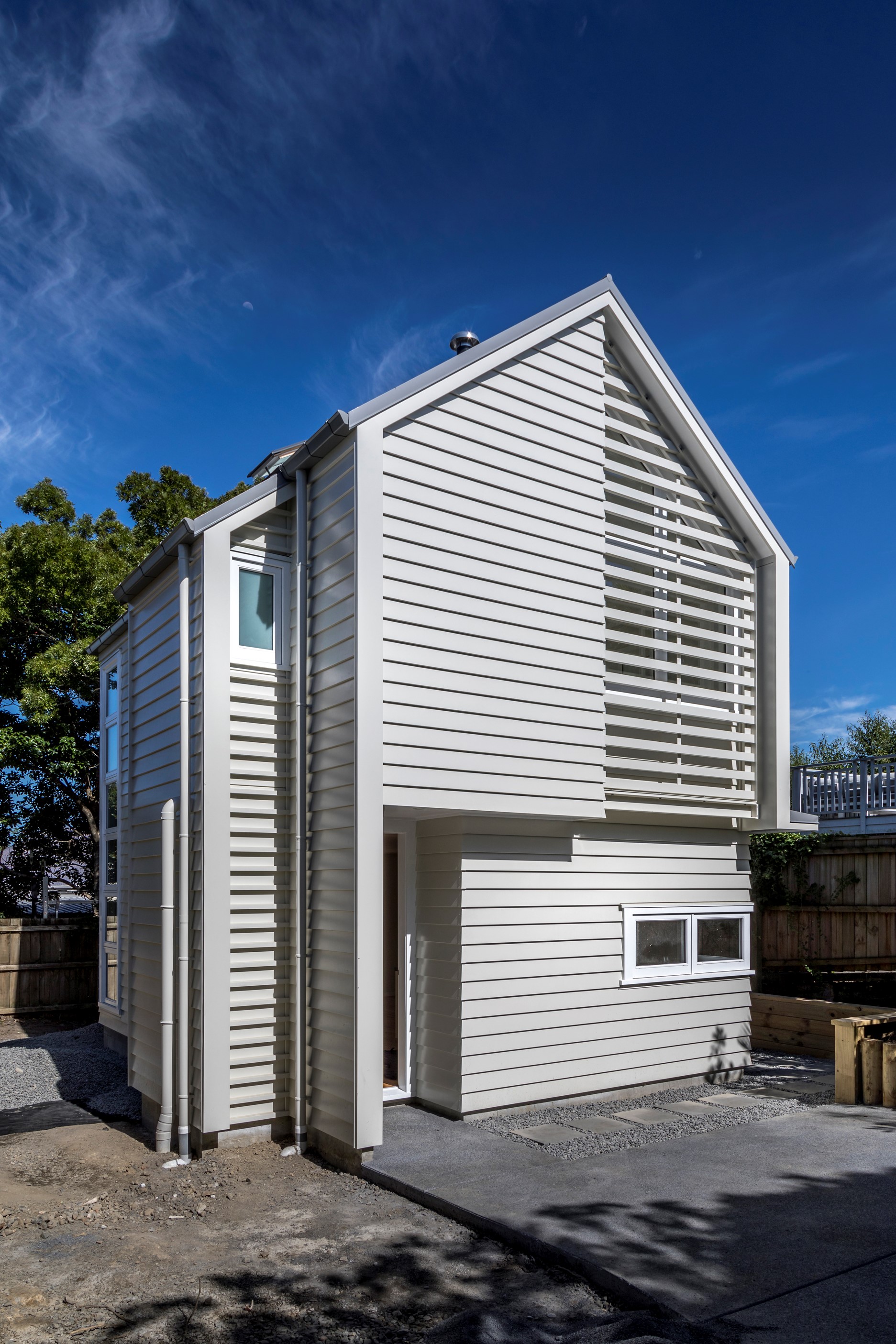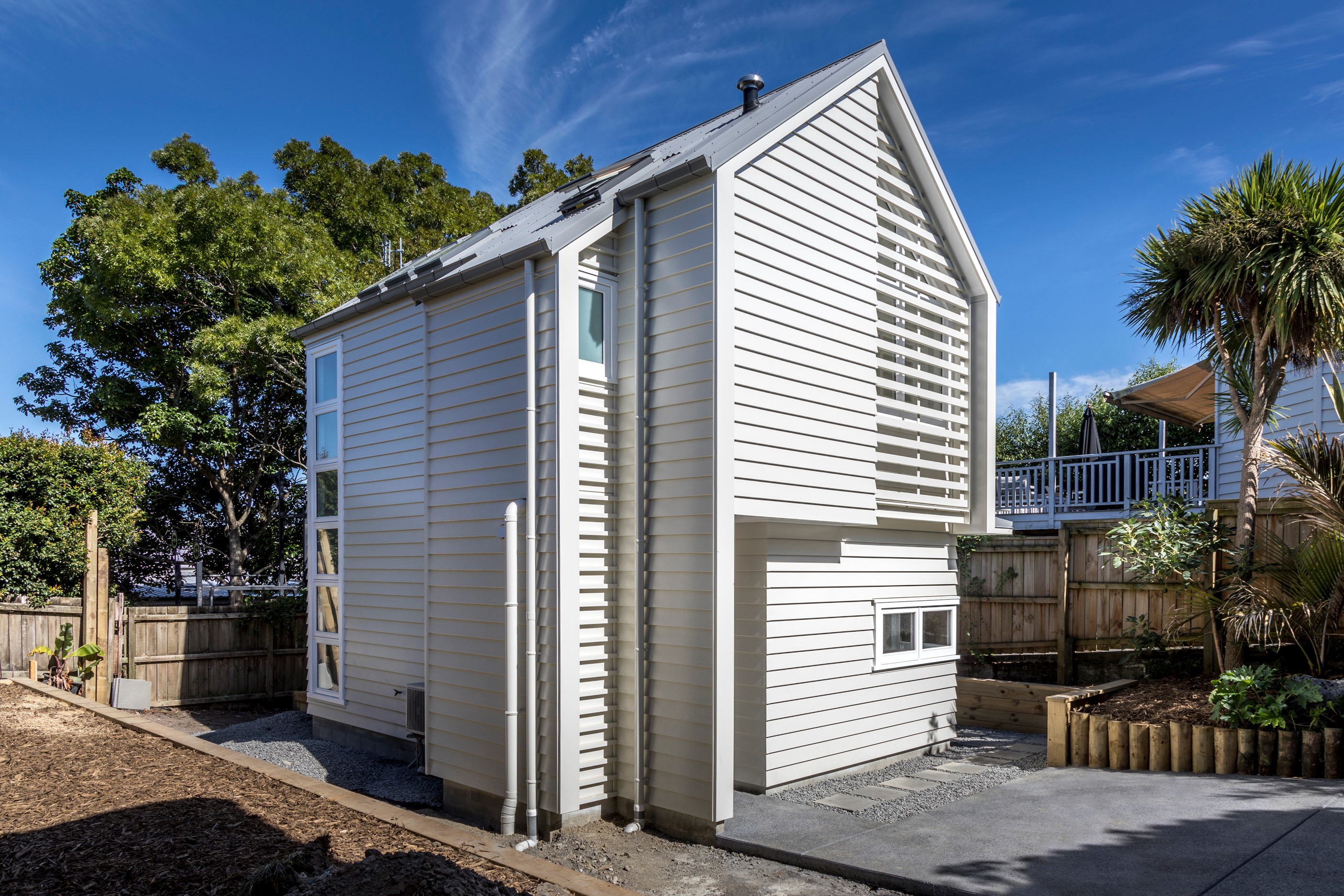 Who says minor dwellings need to be boxy and plain? This 65sqm architectural house in the central city is a great example of thinking outside the usual square or rectangle. The thoughtful design fits into its character neighbourhood, makes efficient use of its limited footprint, and the workmanship is top-drawer. The lower level has an open-plan kitchen/dining/lounge, plus a tucked-away laundry. The living space is bathed in natural light, thanks to bifold doors on two walls that open directly to decking and the trees that surround it. And small doesn’t mean that details need to be sacrificed for space. You’ll find V-groove ply ceilings, custom timber joinery throughout and stairs that feature windows from the ground floor right through to the ceiling of the top storey. Upstairs are two bedrooms – one with a balustrade and doors that open wide and look out onto trees. But perhaps the crowning glory of this wee house is the exterior, which is bold and adventurous, but references the gables and lines of the older homes that surround it. Small, but perfectly formed.