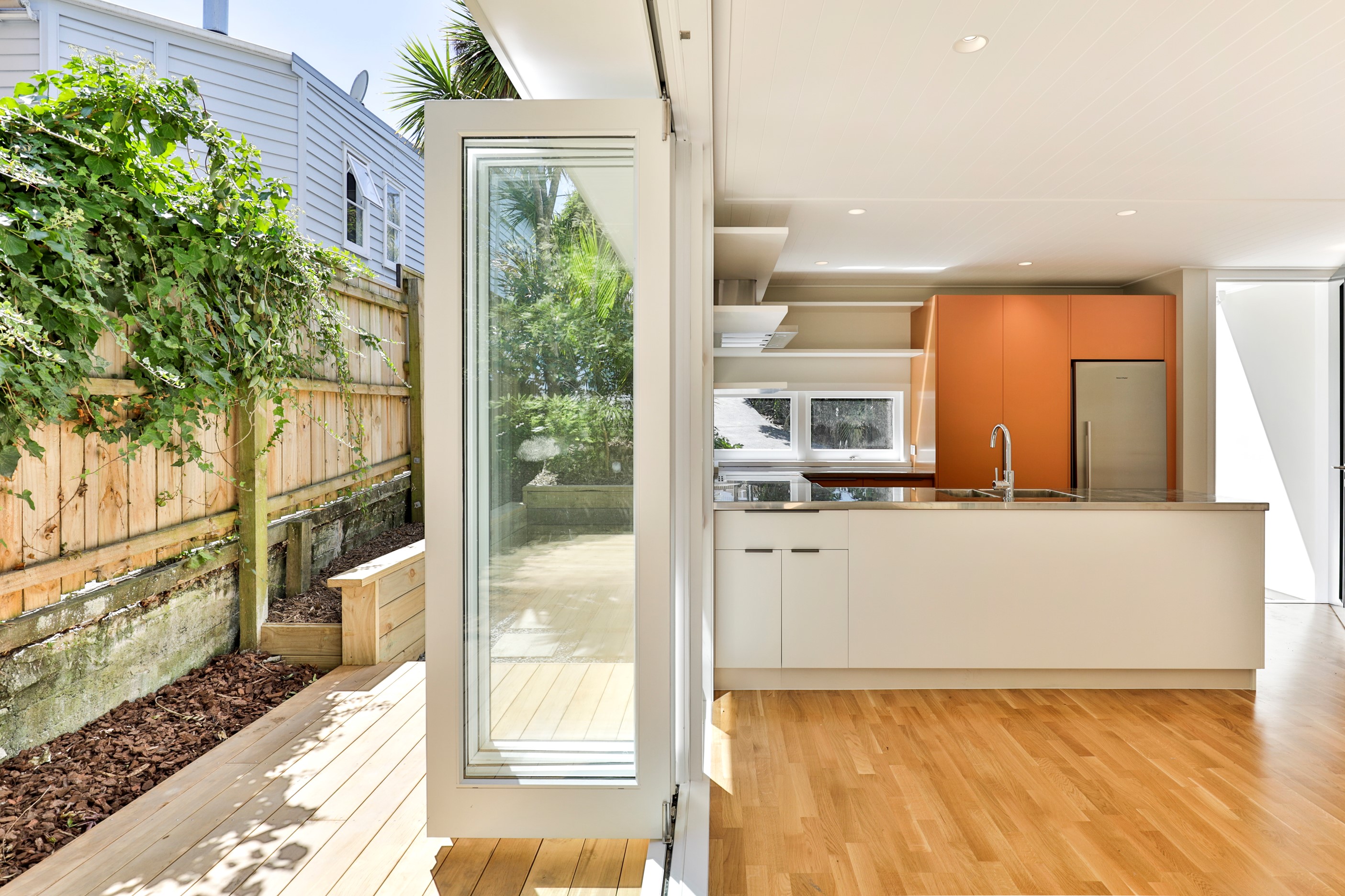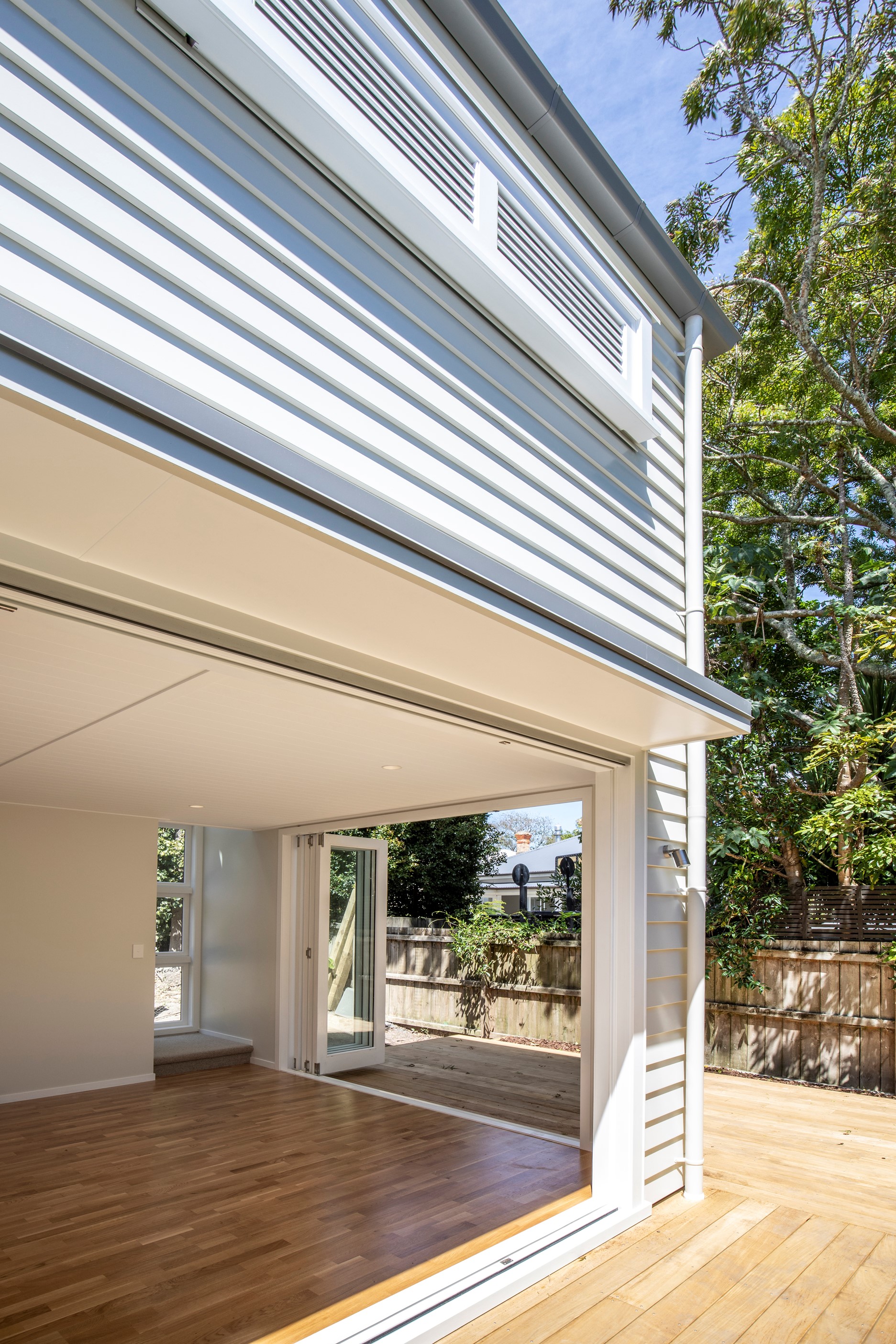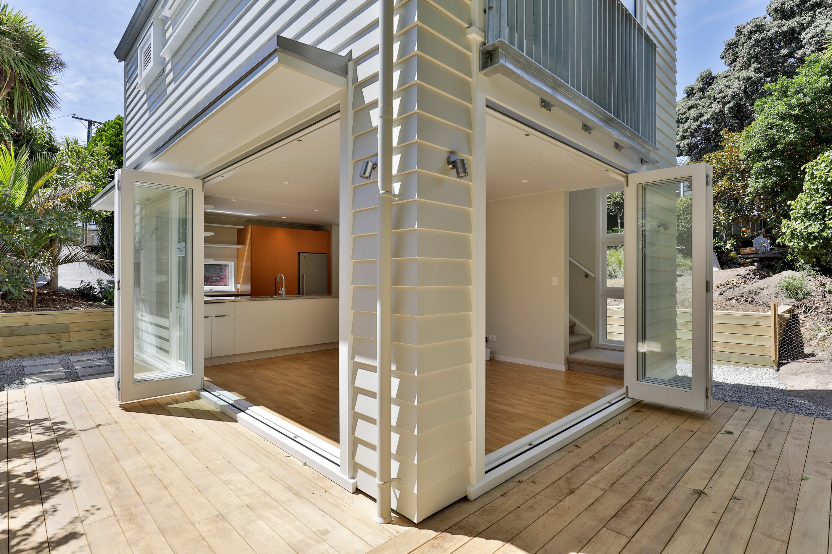 Who says minor dwellings need to be boxy and plain? This 65sqm architectural house in the central city is a great example of thinking outside the usual square or rectangle. The thoughtful design fits into its character neighbourhood, makes efficient use of its limited footprint, and the workmanship is top-drawer. The lower level has an open-plan kitchen/dining/lounge, plus a tucked-away laundry. The living space is bathed in natural light, thanks to bifold doors on two walls that open directly to decking and the trees that surround it. And small doesn’t mean that details need to be sacrificed for space. You’ll find V-groove ply ceilings, custom timber joinery throughout and stairs that feature windows from the ground floor right through to the ceiling of the top storey. Upstairs are two bedrooms – one with a balustrade and doors that open wide and look out onto trees. But perhaps the crowning glory of this wee house is the exterior, which is bold and adventurous, but references the gables and lines of the older homes that surround it. Small, but perfectly formed.