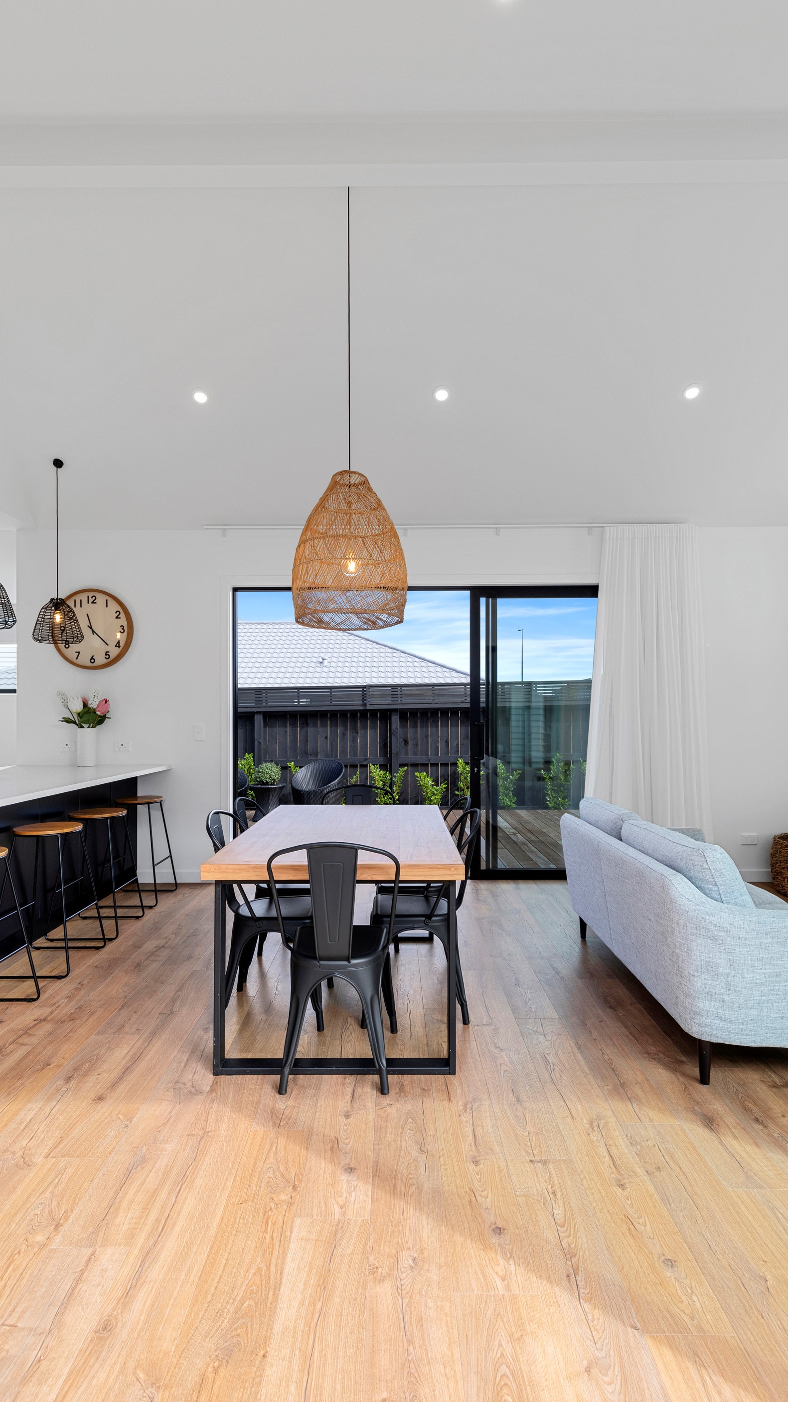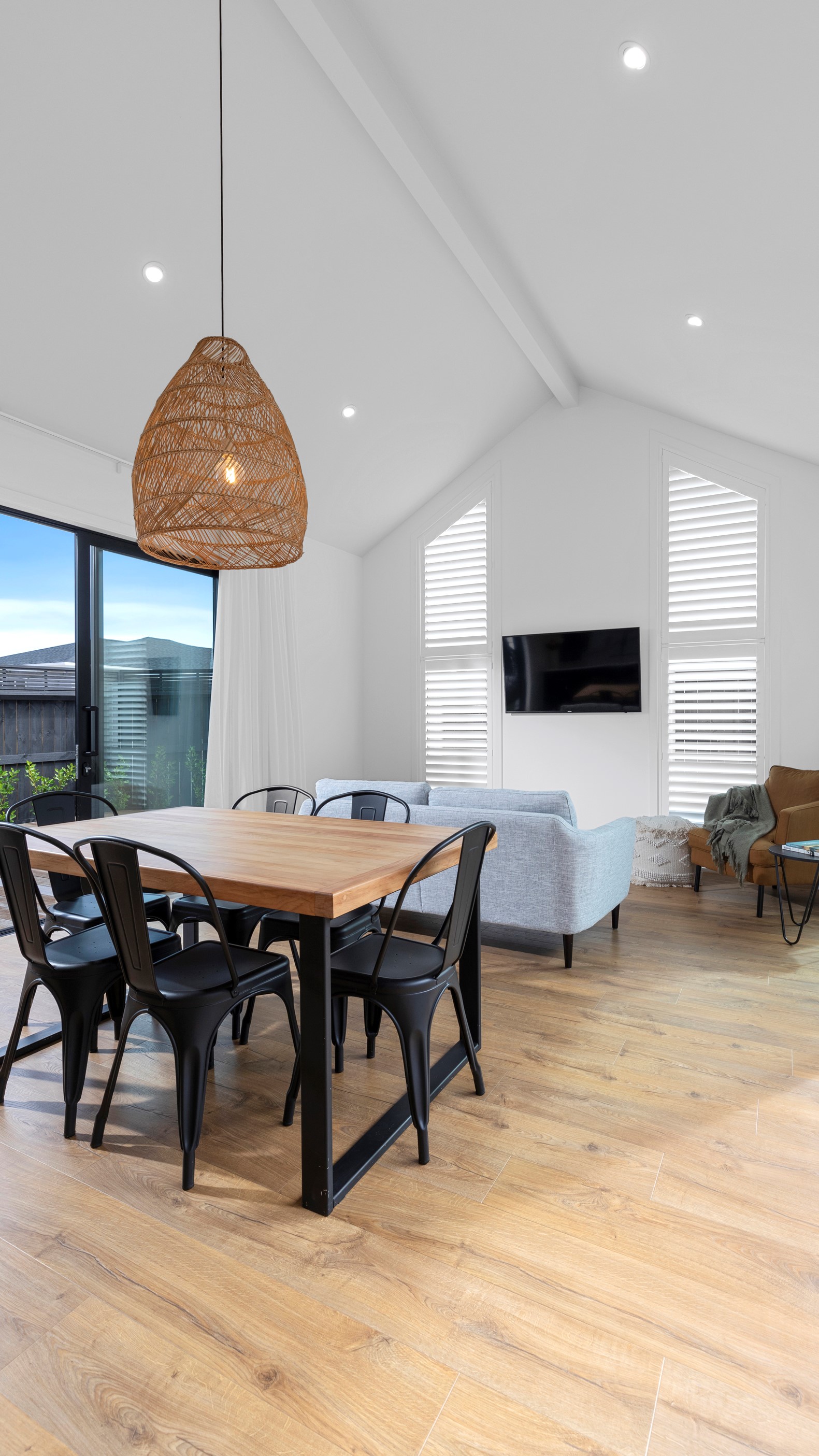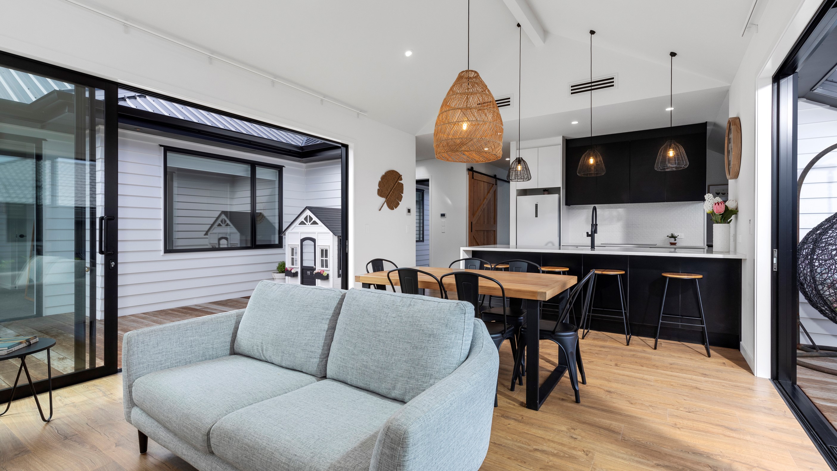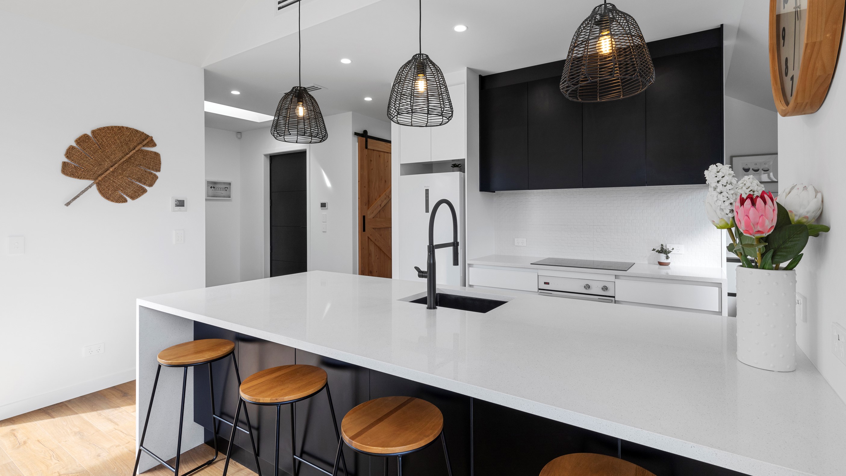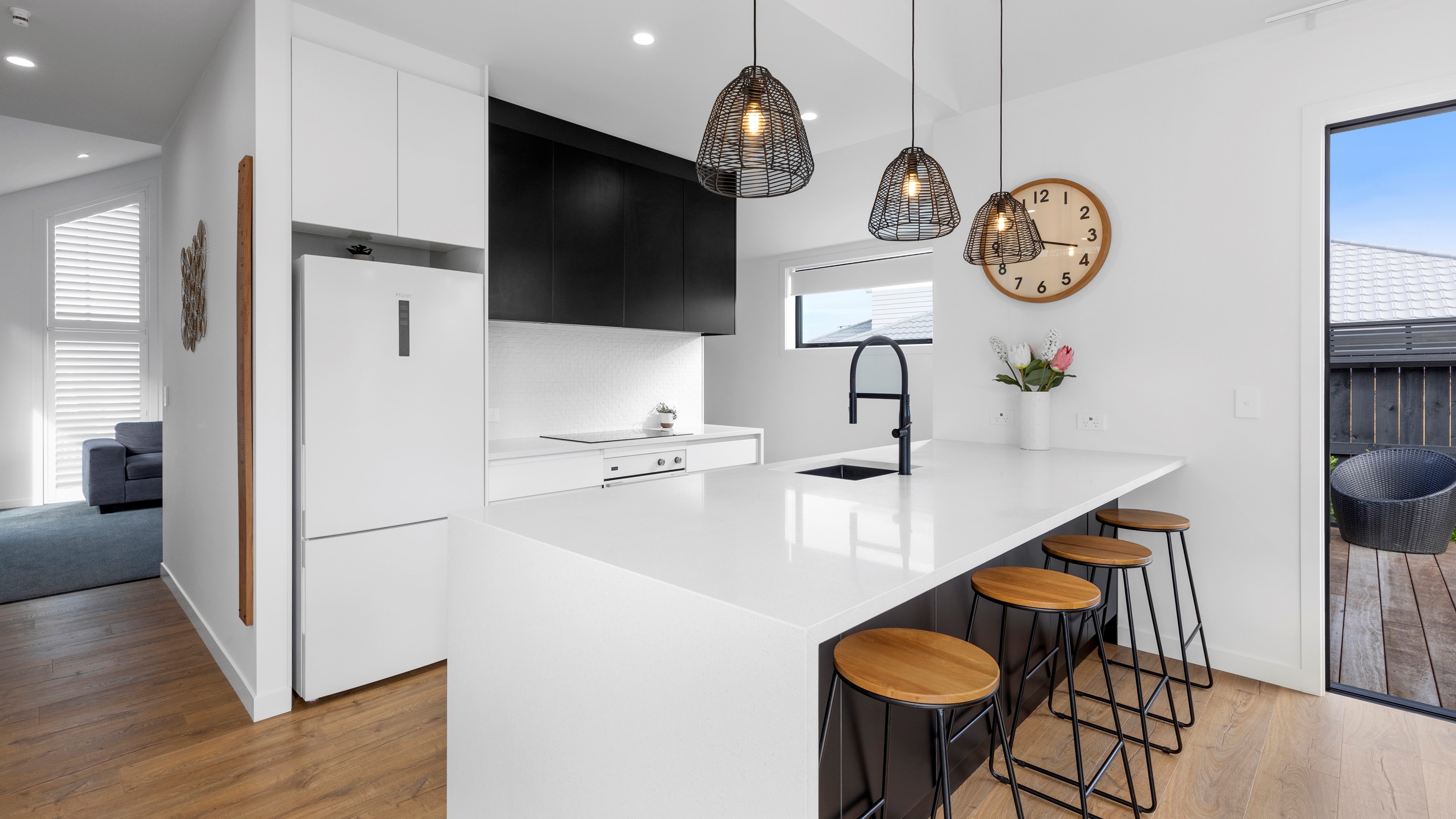 This standout four-bedroom home makes a statement in contrasting black and white. The house is strategically designed and split into two living and bedroom wings. The result is a double-gabled frontage with grand internal cathedral raking ceilings. Full wraparound decks are easily accessed through extra-wide sliders from the living area, providing lots of level space for children to play safely outside, and of course, for enjoying outdoor entertaining. The 227sqm footprint includes two living areas and two bathrooms, so there is room for everyone to relax. The minimalist kitchen is sleek and chic, with a wide island bench and breakfast bar featuring a waterfall edge. A custom-made macrocarpa barn door adds just a hint of rustic charm. The bathrooms carry through the white aesthetic, complemented beautifully with quality black fittings and fixtures. With fully ducted air-conditioning and underfloor heating, the home is cool in summer and warm in winter. Three skylights bring in even more light to this bright, open-plan residence.