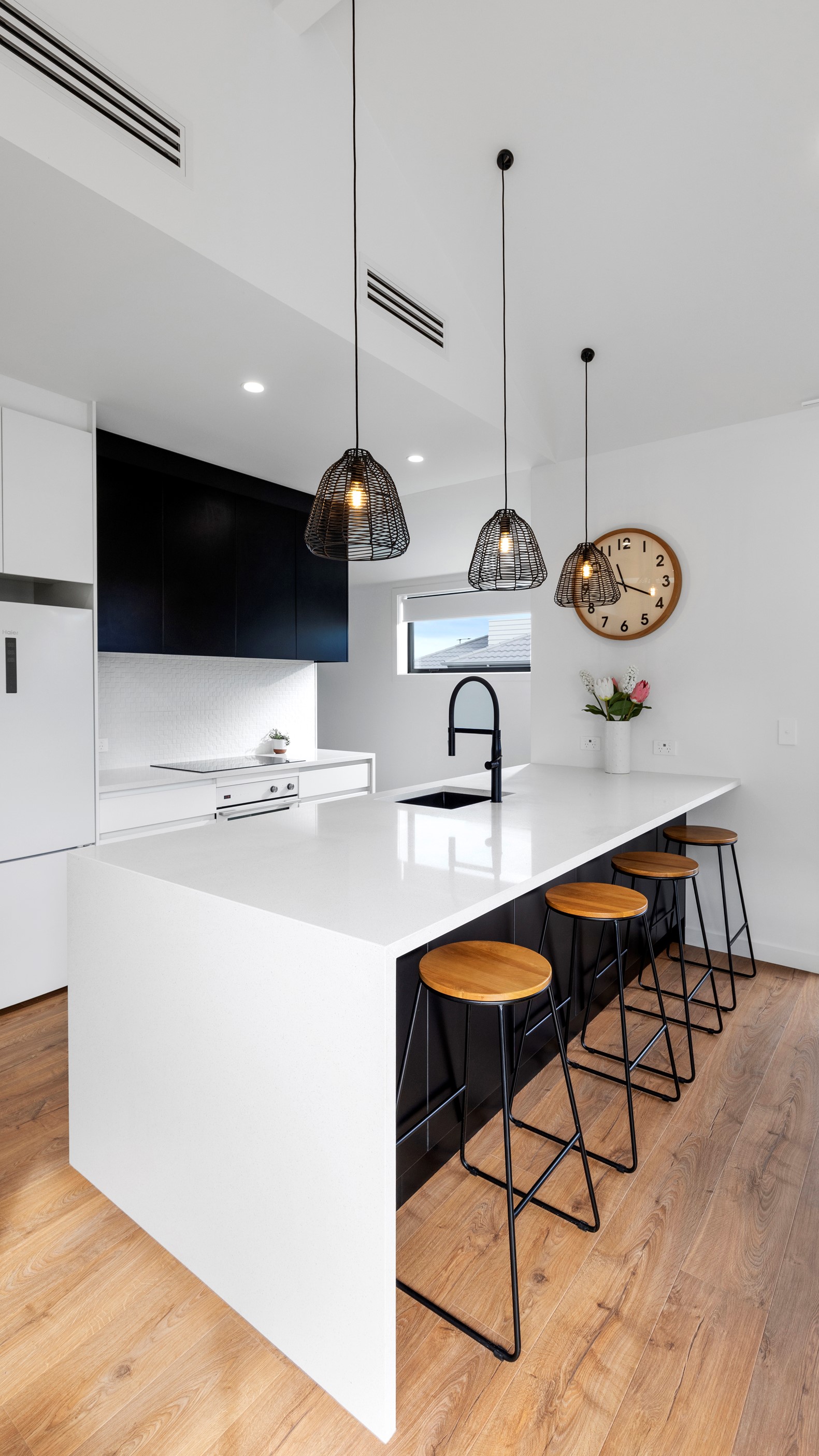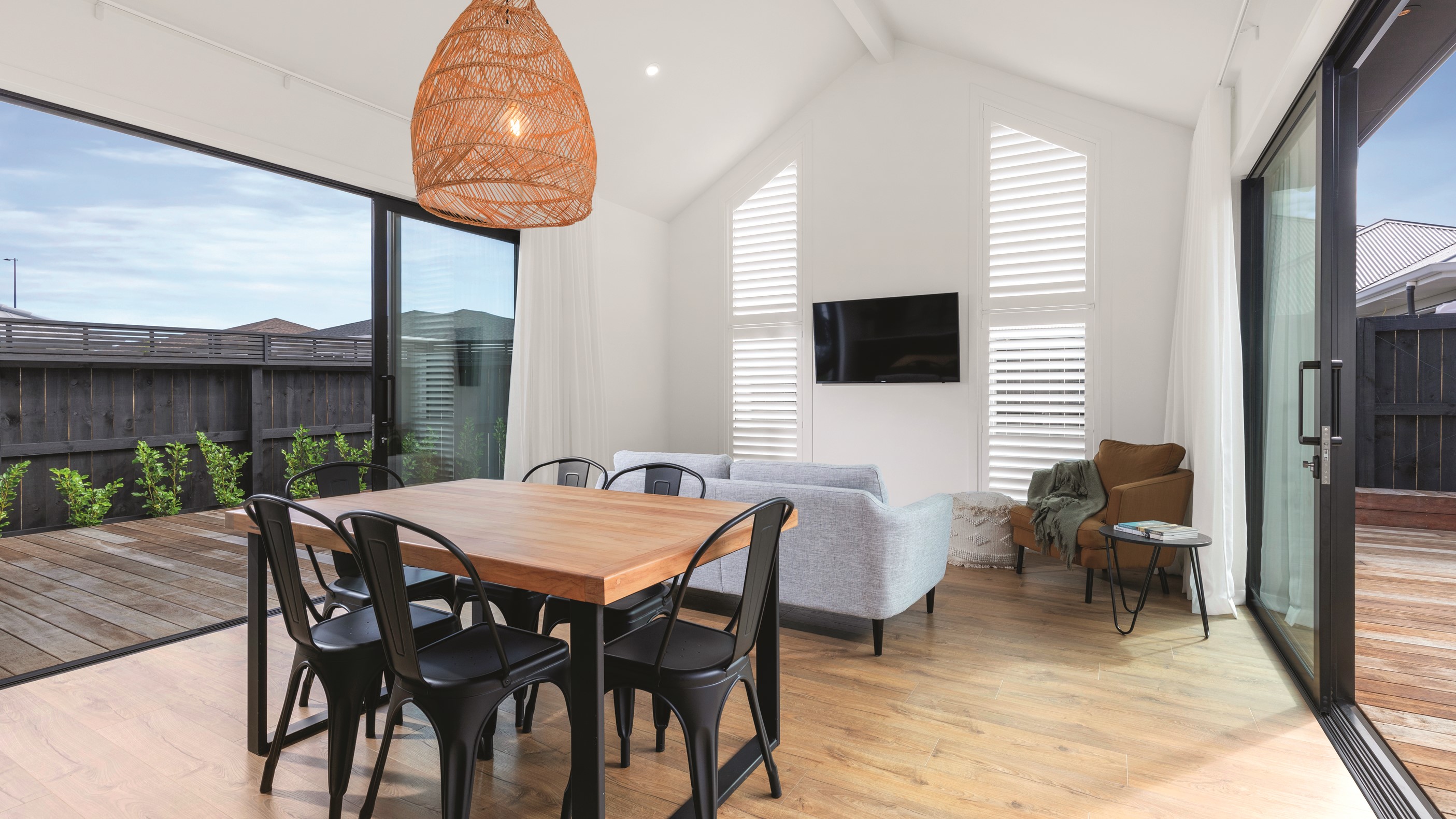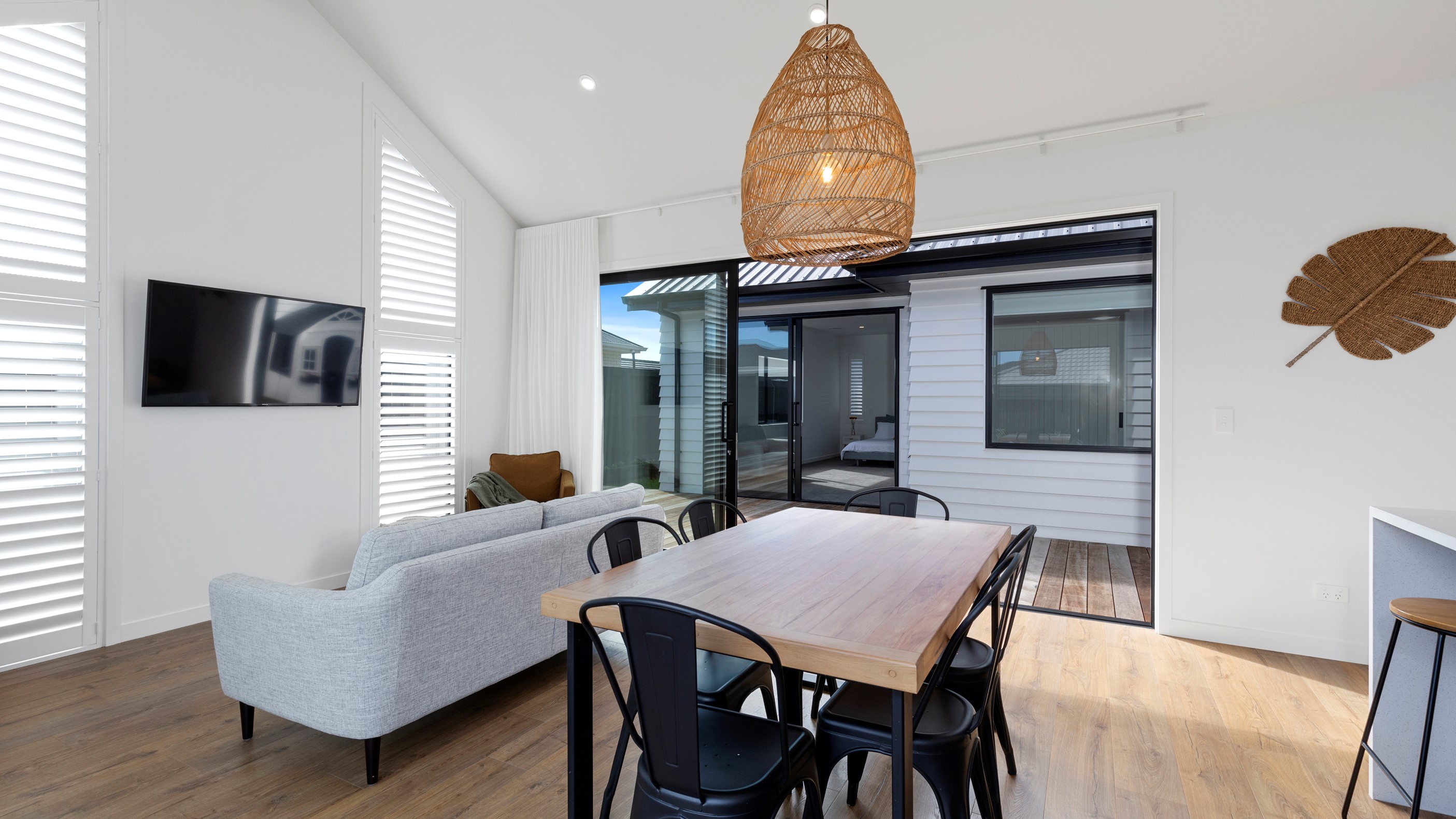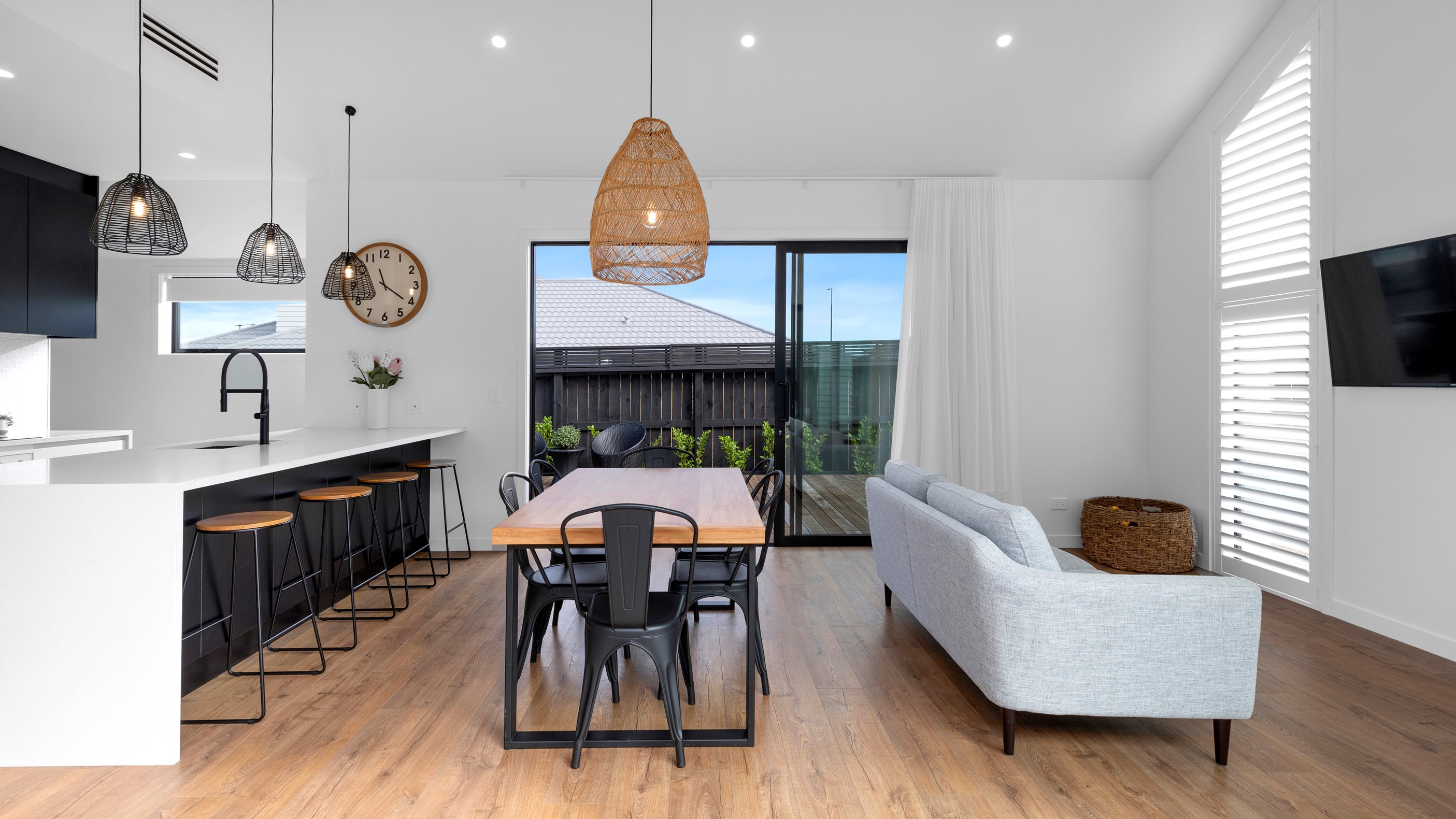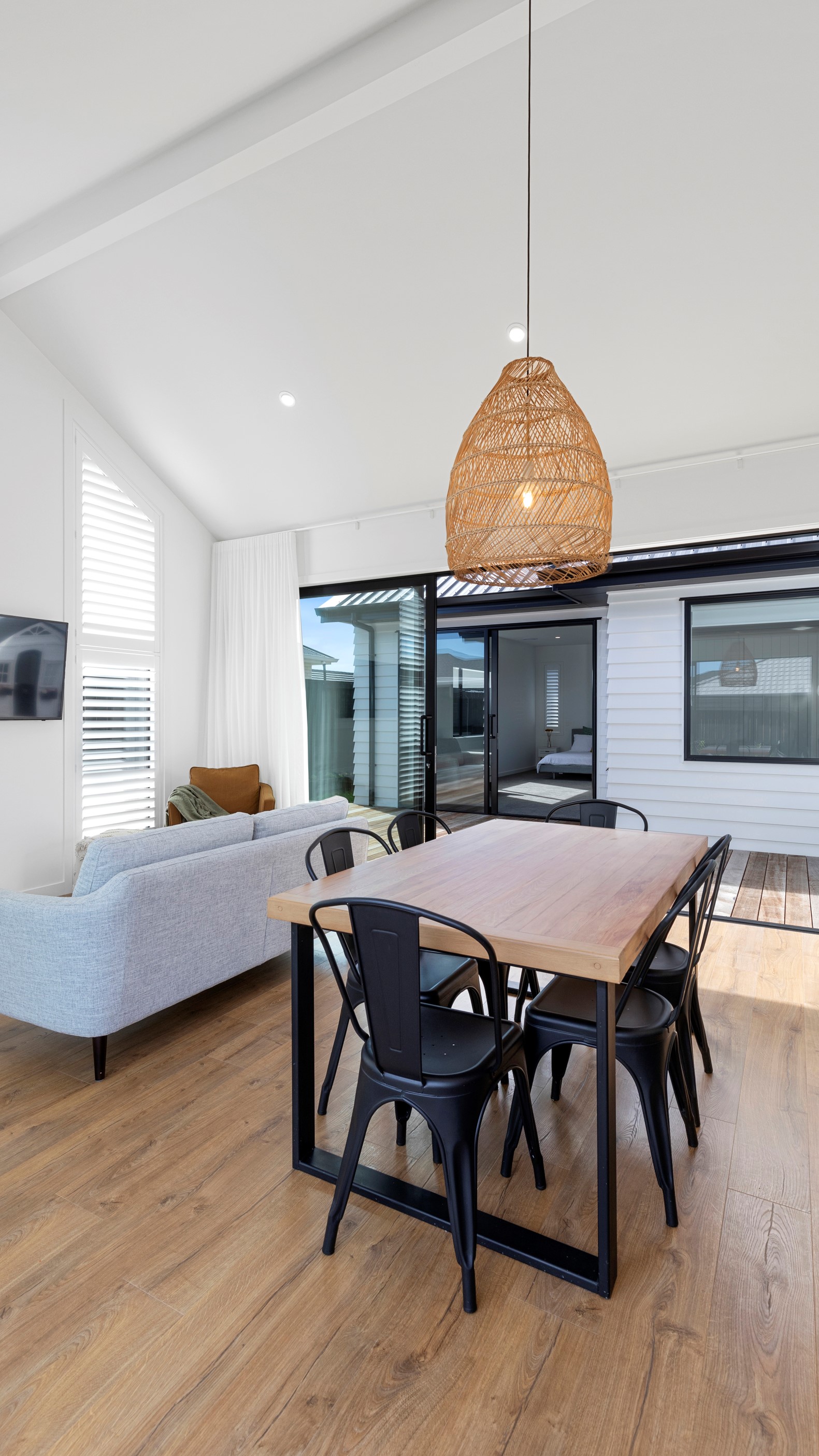 This standout four-bedroom home makes a statement in contrasting black and white. The house is strategically designed and split into two living and bedroom wings. The result is a double-gabled frontage with grand internal cathedral raking ceilings. Full wraparound decks are easily accessed through extra-wide sliders from the living area, providing lots of level space for children to play safely outside, and of course, for enjoying outdoor entertaining. The 227sqm footprint includes two living areas and two bathrooms, so there is room for everyone to relax. The minimalist kitchen is sleek and chic, with a wide island bench and breakfast bar featuring a waterfall edge. A custom-made macrocarpa barn door adds just a hint of rustic charm. The bathrooms carry through the white aesthetic, complemented beautifully with quality black fittings and fixtures. With fully ducted air-conditioning and underfloor heating, the home is cool in summer and warm in winter. Three skylights bring in even more light to this bright, open-plan residence.