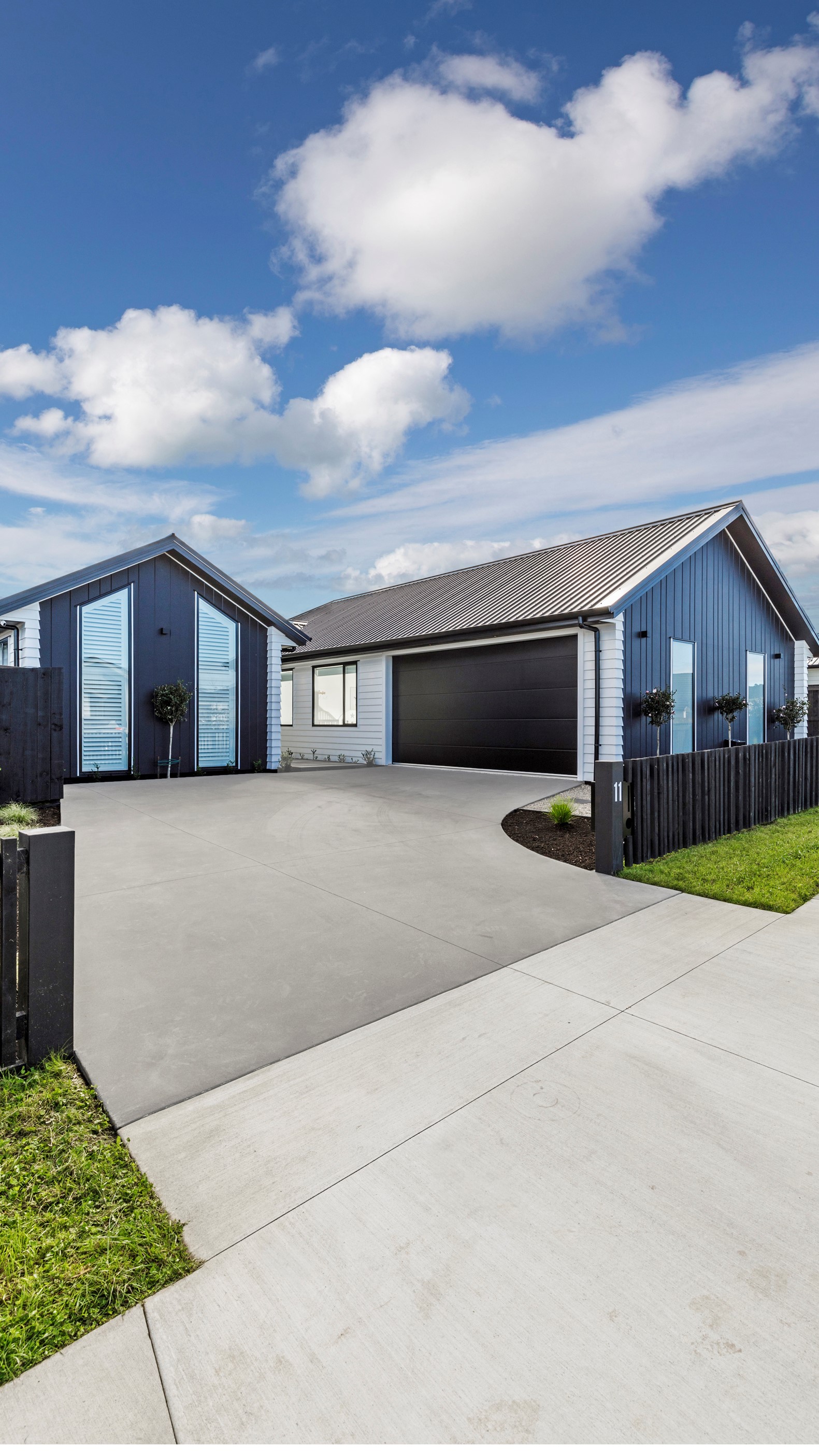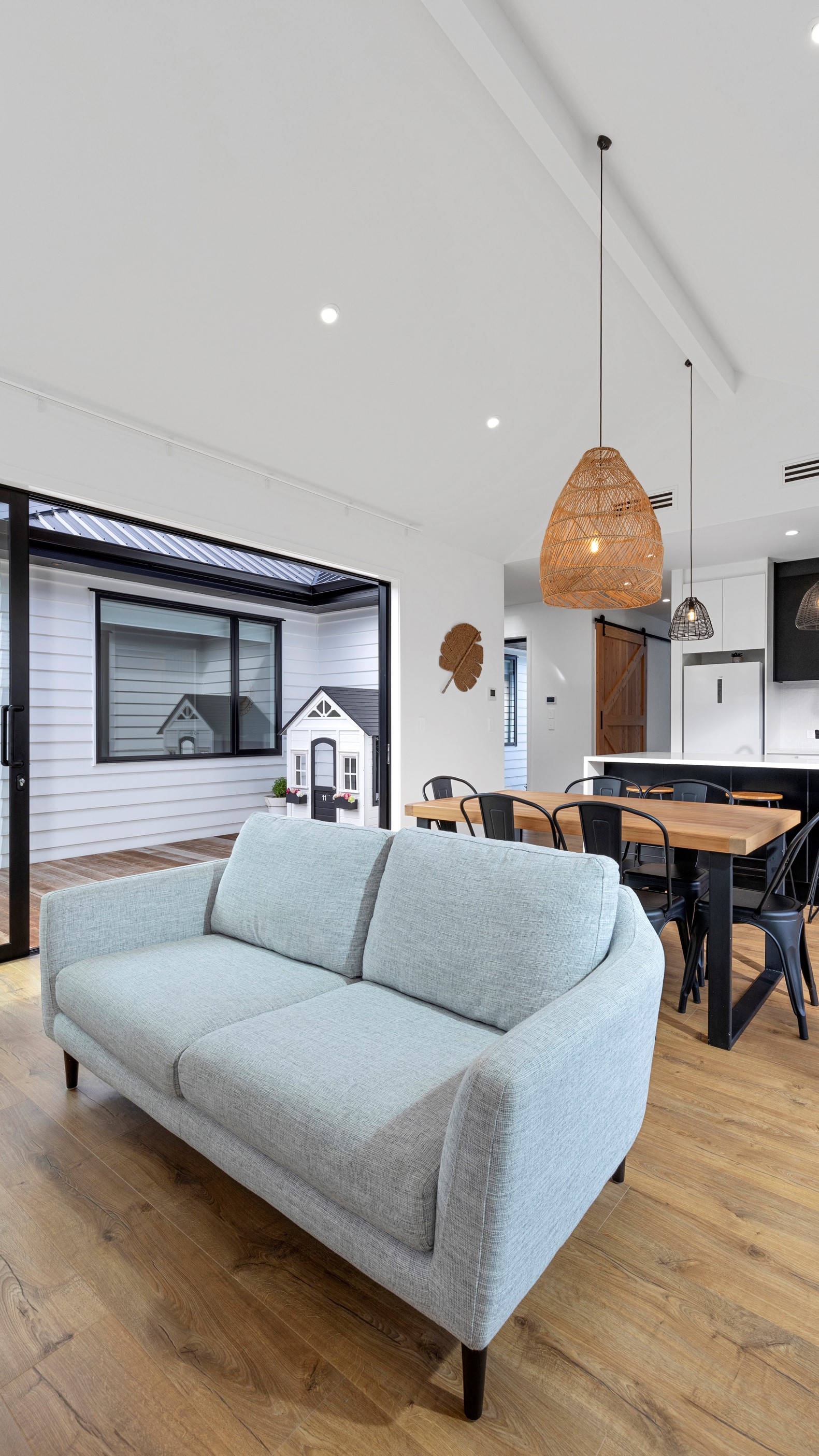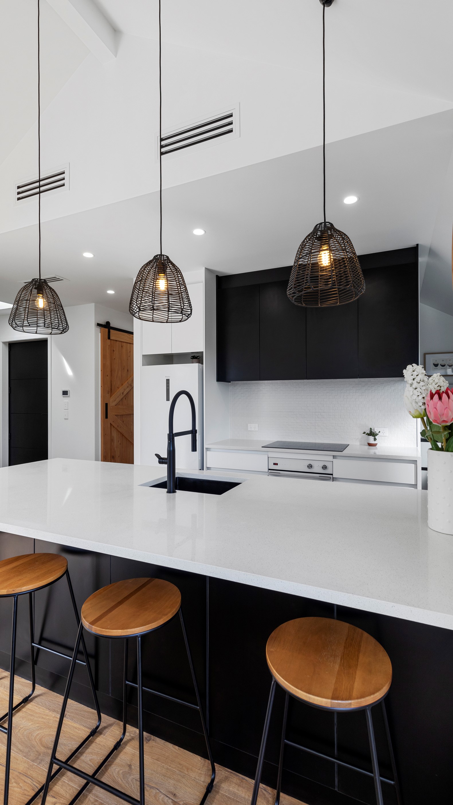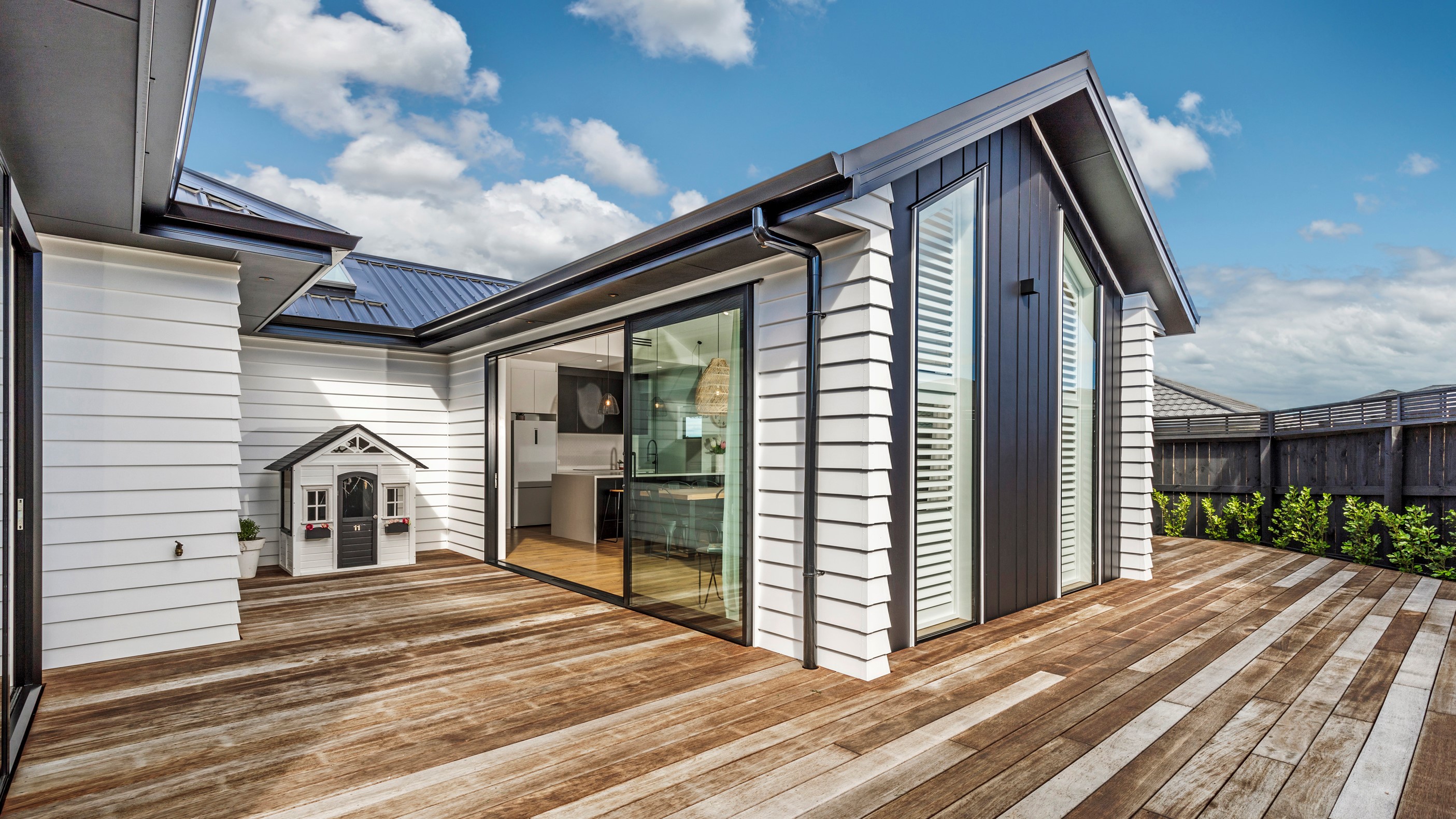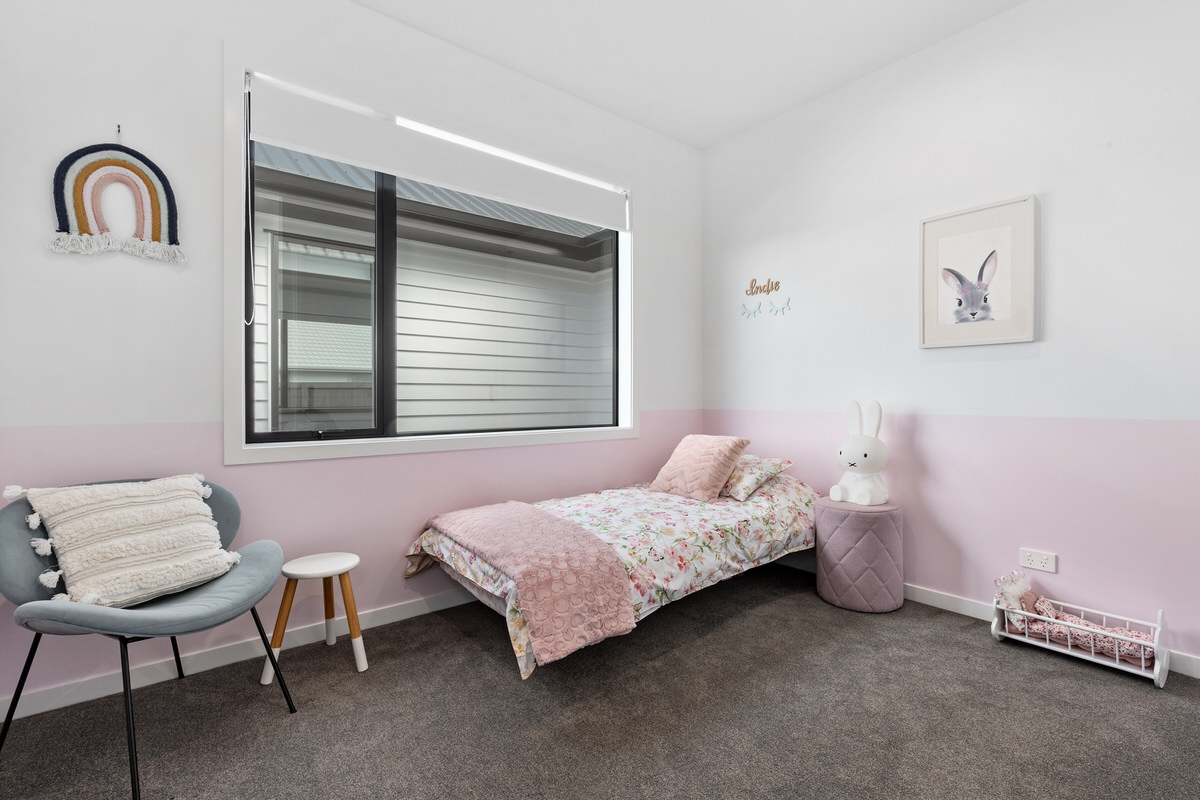 This standout four-bedroom home makes a statement in contrasting black and white. The house is strategically designed and split into two living and bedroom wings. The result is a double-gabled frontage with grand internal cathedral raking ceilings. Full wraparound decks are easily accessed through extra-wide sliders from the living area, providing lots of level space for children to play safely outside, and of course, for enjoying outdoor entertaining. The 227sqm footprint includes two living areas and two bathrooms, so there is room for everyone to relax. The minimalist kitchen is sleek and chic, with a wide island bench and breakfast bar featuring a waterfall edge. A custom-made macrocarpa barn door adds just a hint of rustic charm. The bathrooms carry through the white aesthetic, complemented beautifully with quality black fittings and fixtures. With fully ducted air-conditioning and underfloor heating, the home is cool in summer and warm in winter. Three skylights bring in even more light to this bright, open-plan residence.