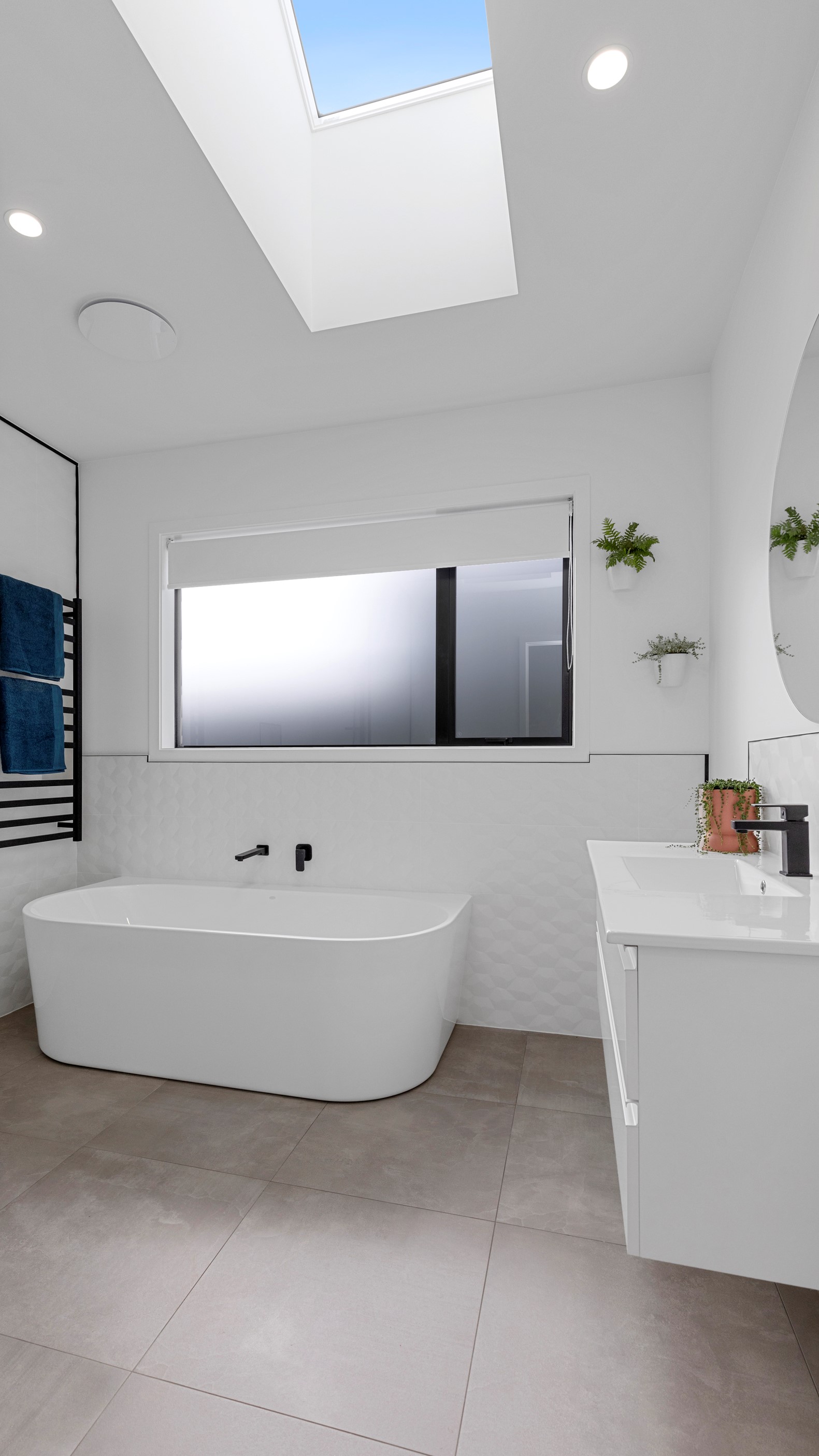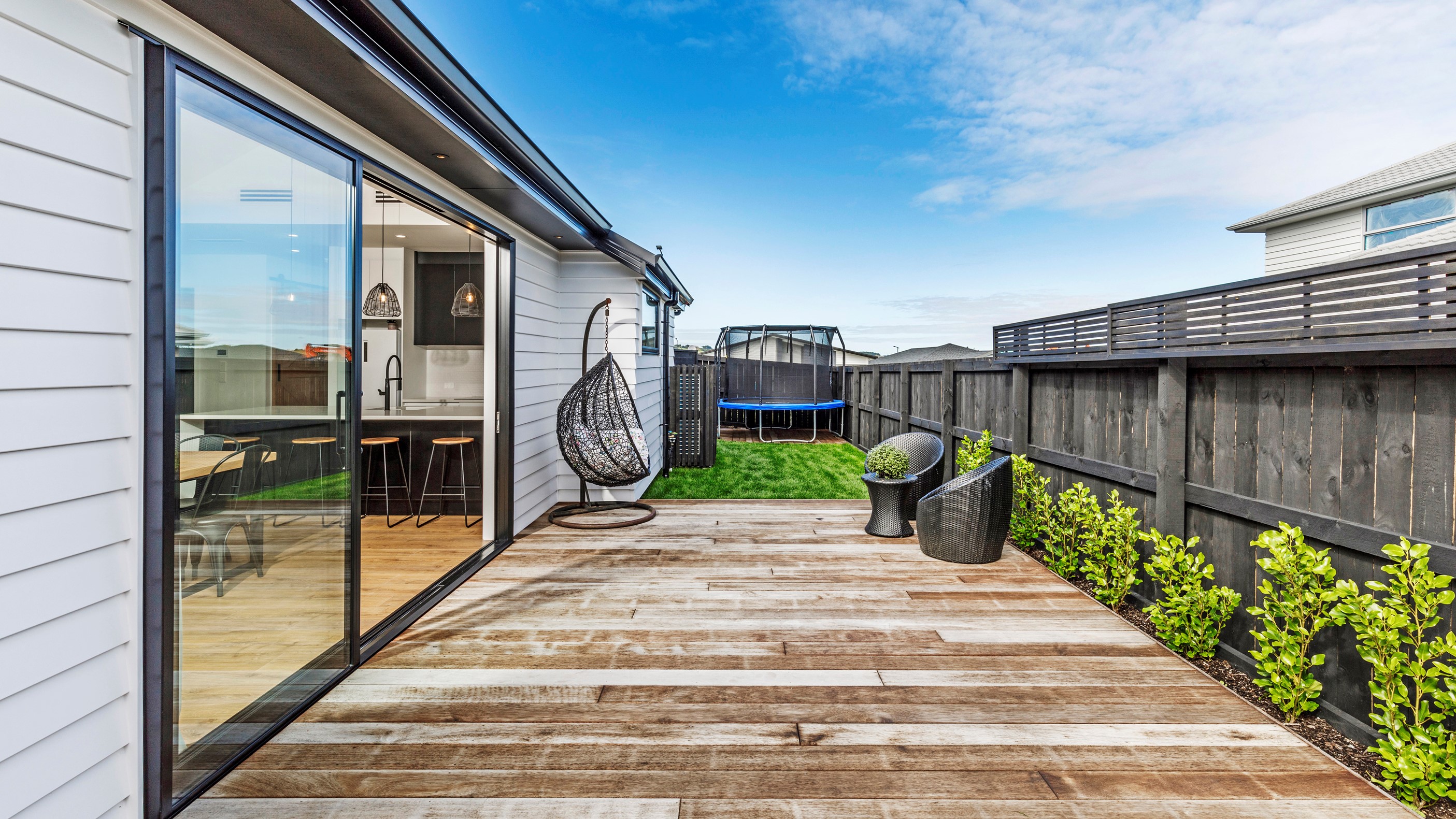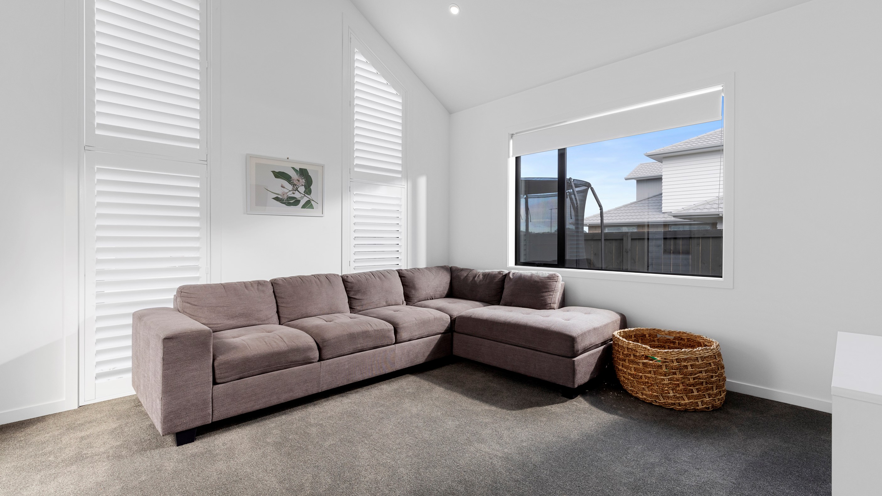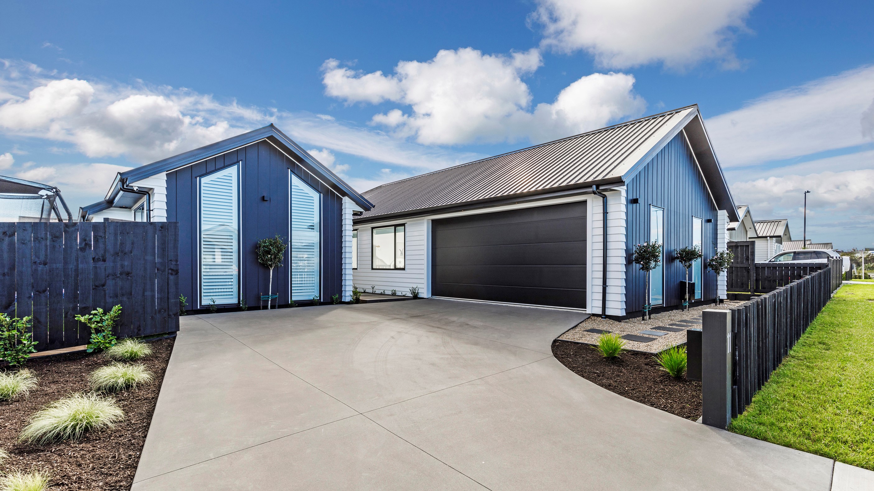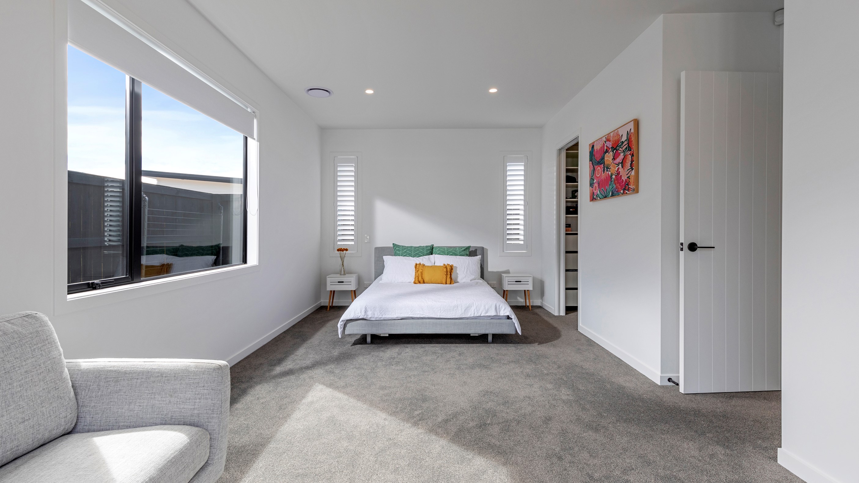 This standout four-bedroom home makes a statement in contrasting black and white. The house is strategically designed and split into two living and bedroom wings. The result is a double-gabled frontage with grand internal cathedral raking ceilings. Full wraparound decks are easily accessed through extra-wide sliders from the living area, providing lots of level space for children to play safely outside, and of course, for enjoying outdoor entertaining. The 227sqm footprint includes two living areas and two bathrooms, so there is room for everyone to relax. The minimalist kitchen is sleek and chic, with a wide island bench and breakfast bar featuring a waterfall edge. A custom-made macrocarpa barn door adds just a hint of rustic charm. The bathrooms carry through the white aesthetic, complemented beautifully with quality black fittings and fixtures. With fully ducted air-conditioning and underfloor heating, the home is cool in summer and warm in winter. Three skylights bring in even more light to this bright, open-plan residence.