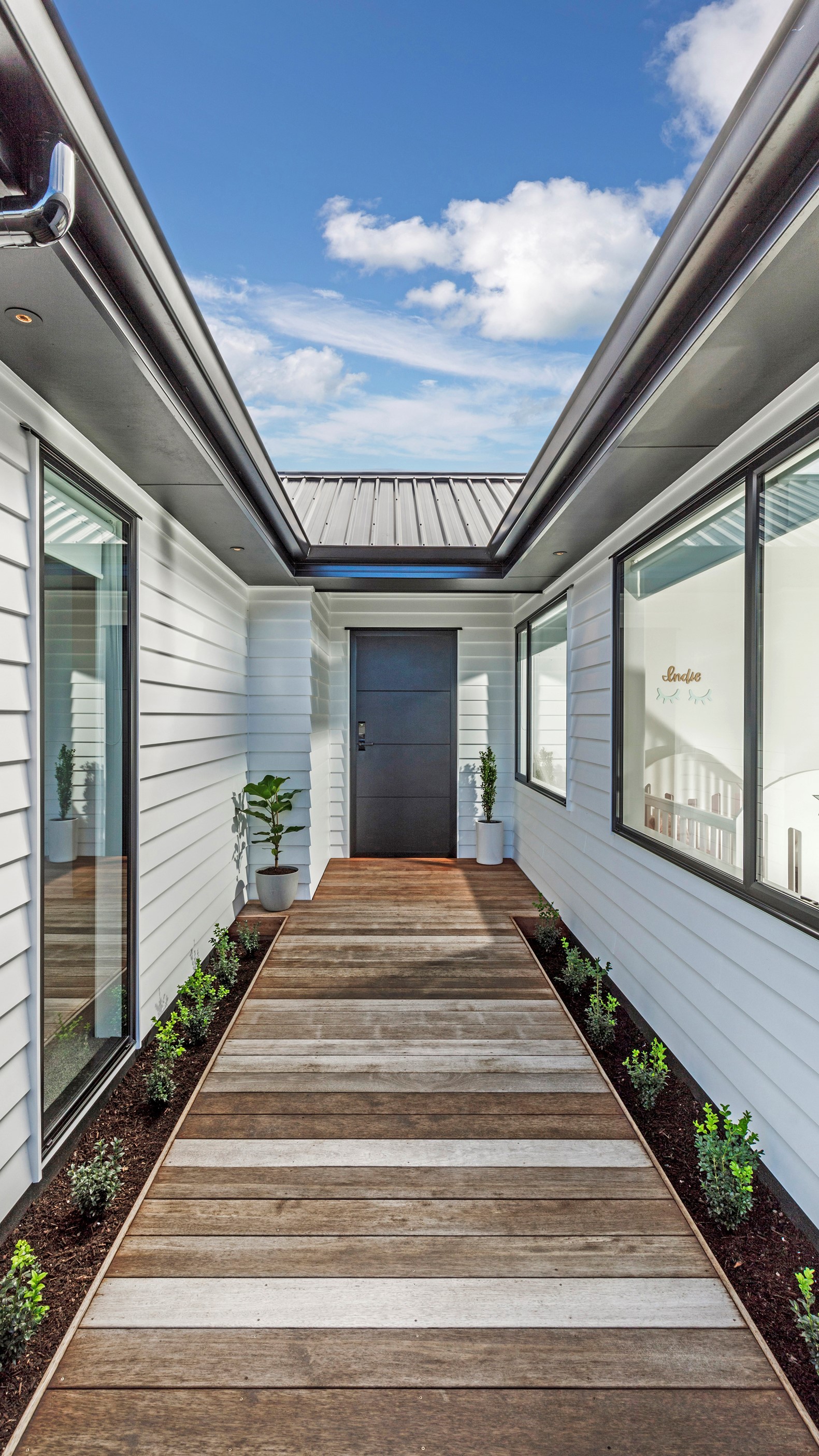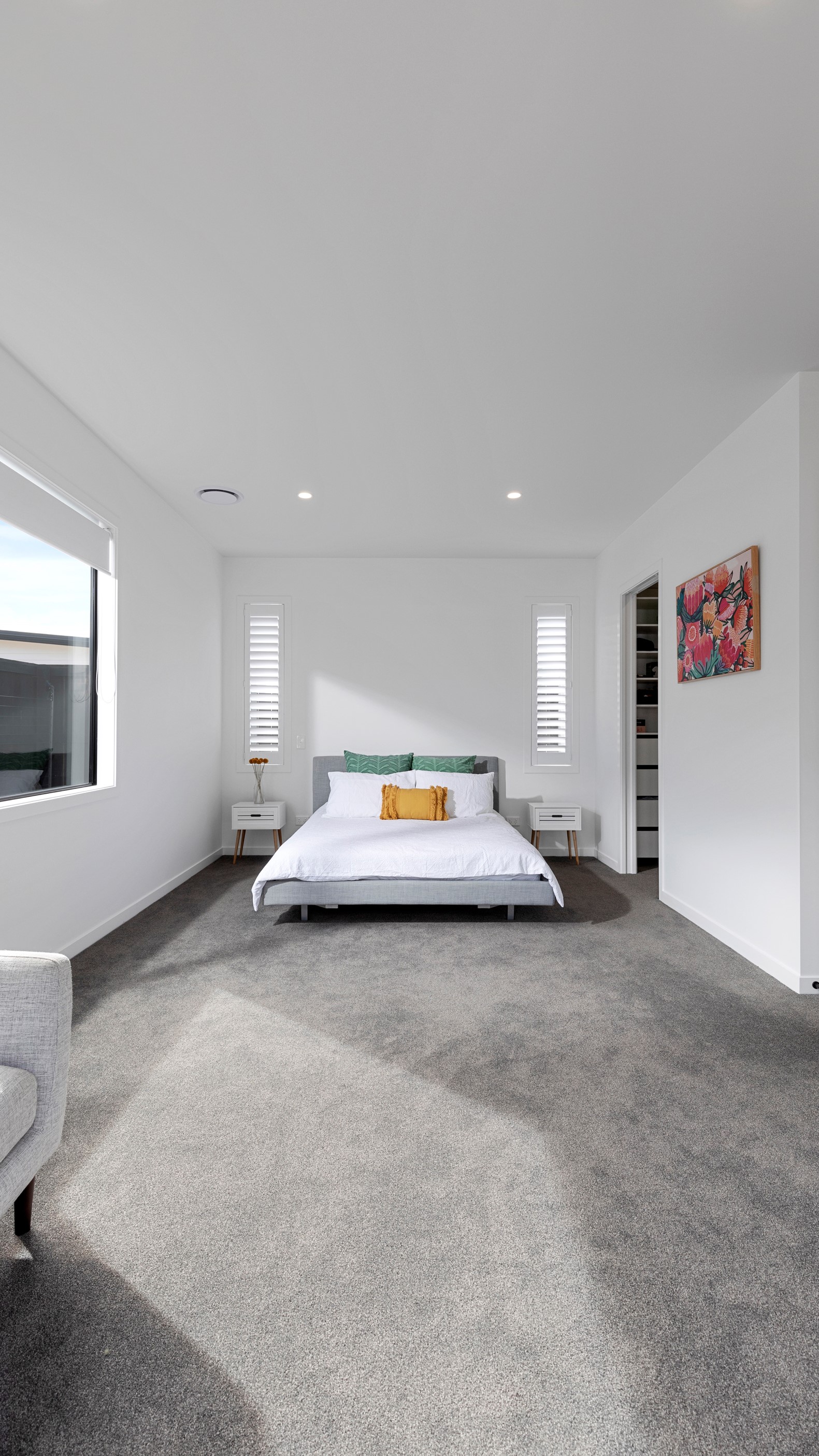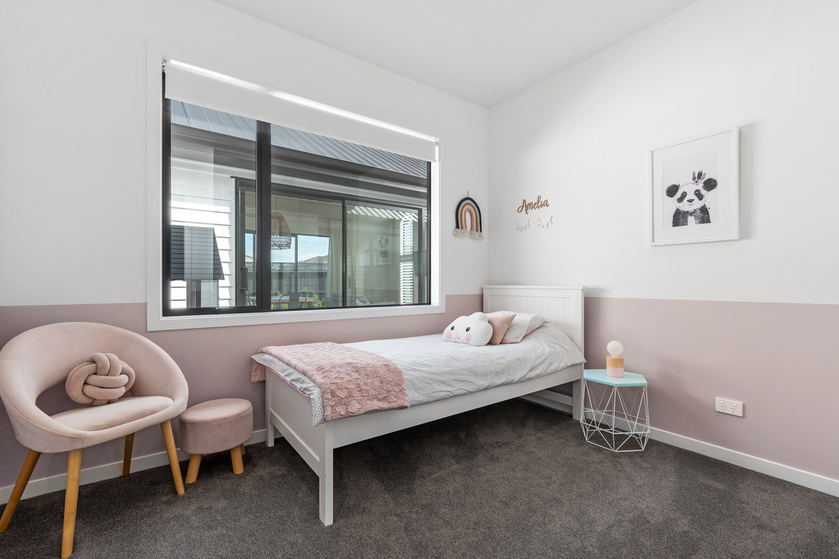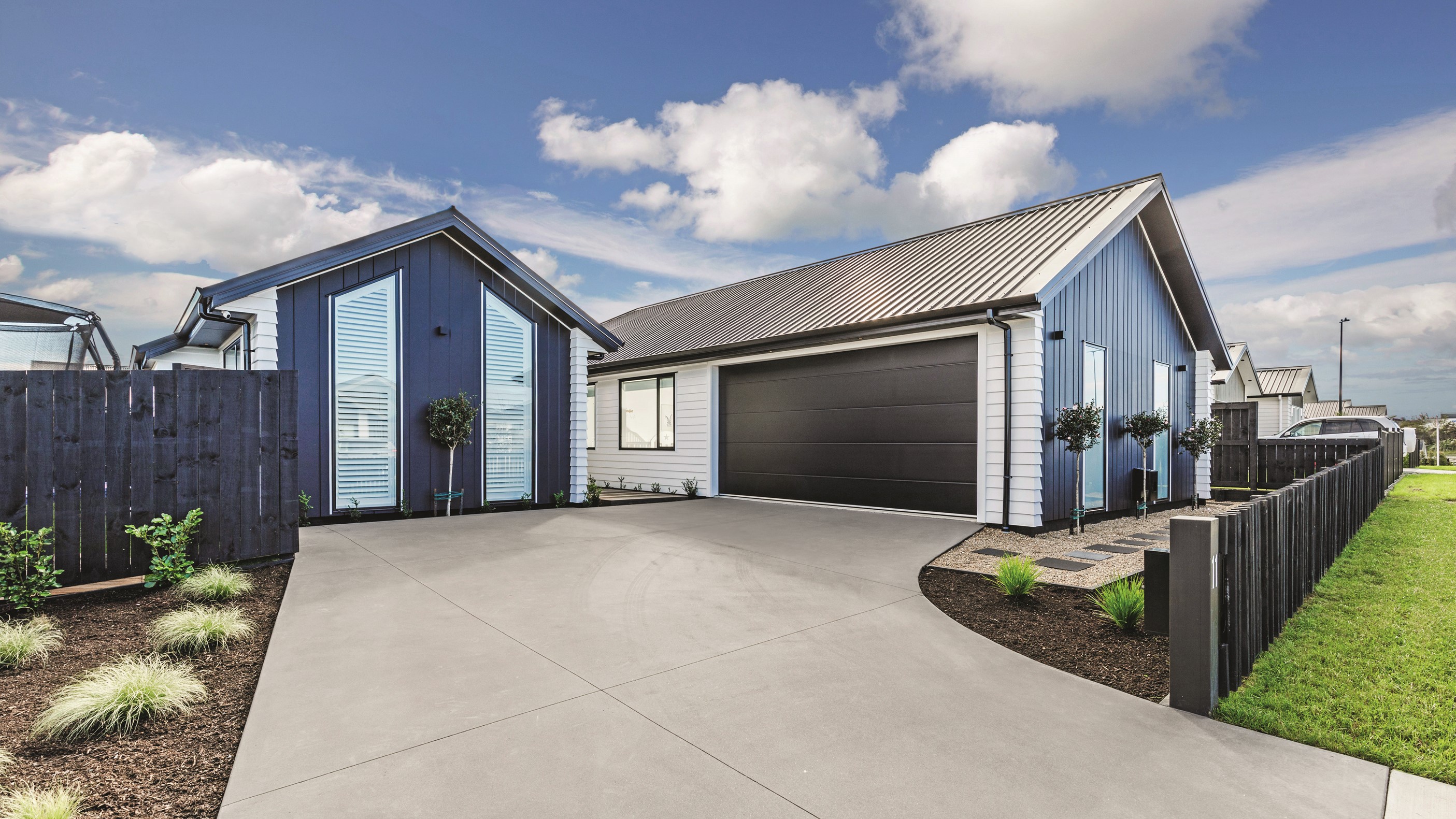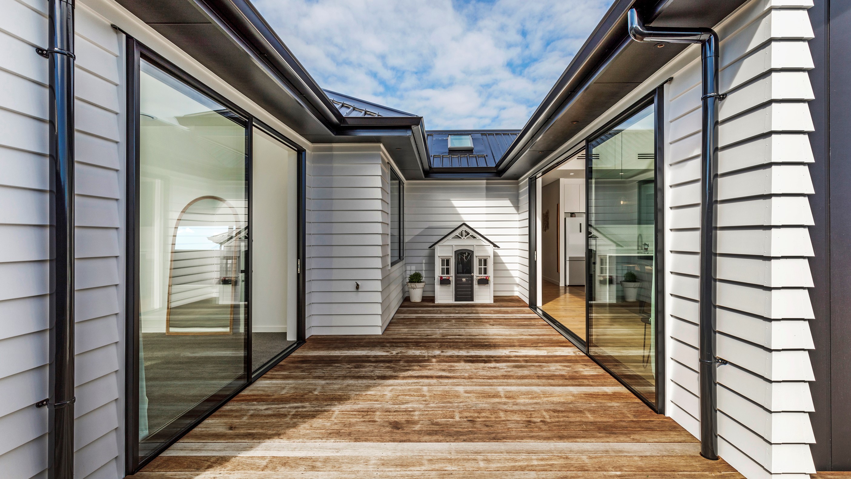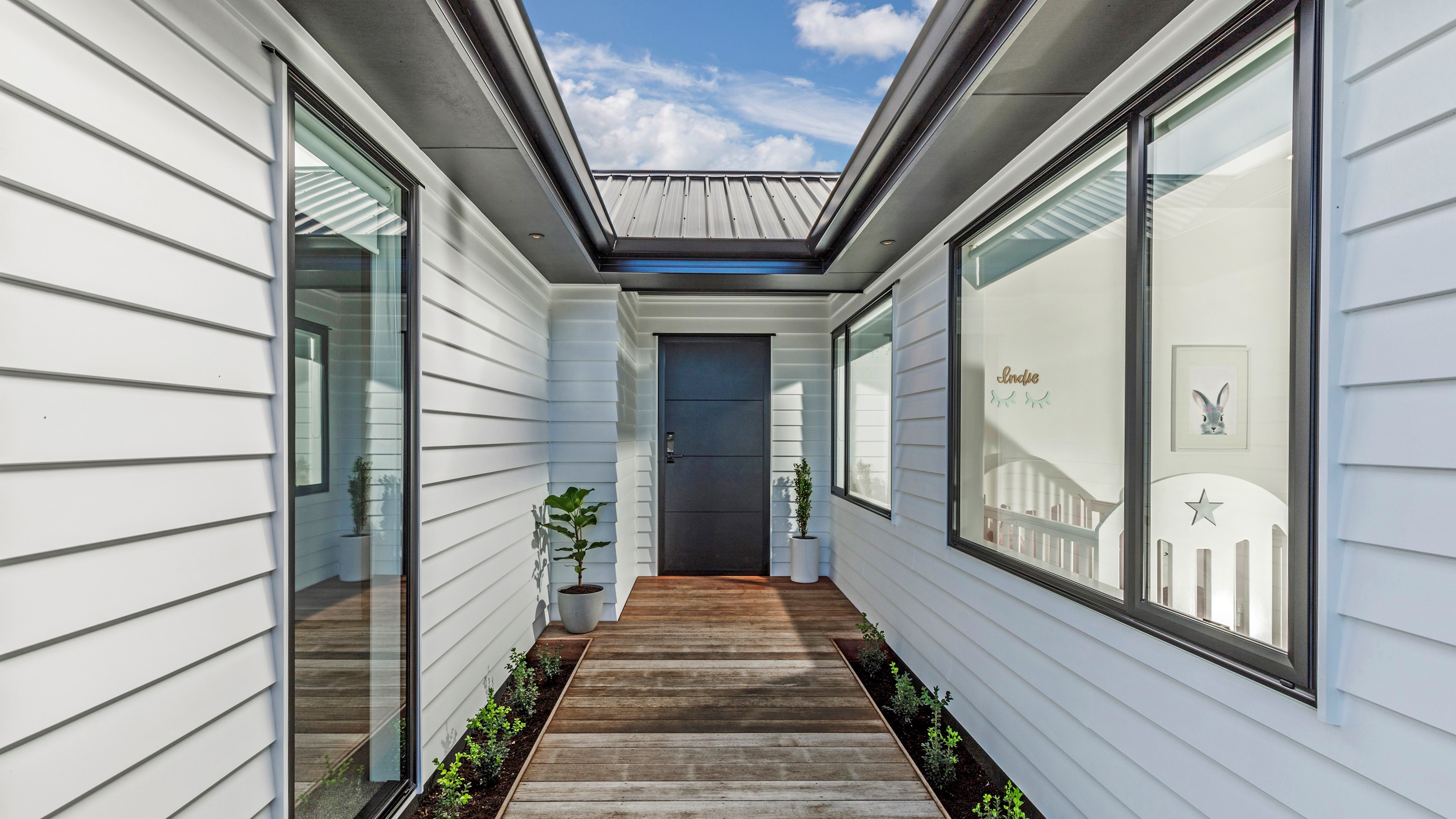 This standout four-bedroom home makes a statement in contrasting black and white. The house is strategically designed and split into two living and bedroom wings. The result is a double-gabled frontage with grand internal cathedral raking ceilings. Full wraparound decks are easily accessed through extra-wide sliders from the living area, providing lots of level space for children to play safely outside, and of course, for enjoying outdoor entertaining. The 227sqm footprint includes two living areas and two bathrooms, so there is room for everyone to relax. The minimalist kitchen is sleek and chic, with a wide island bench and breakfast bar featuring a waterfall edge. A custom-made macrocarpa barn door adds just a hint of rustic charm. The bathrooms carry through the white aesthetic, complemented beautifully with quality black fittings and fixtures. With fully ducted air-conditioning and underfloor heating, the home is cool in summer and warm in winter. Three skylights bring in even more light to this bright, open-plan residence.