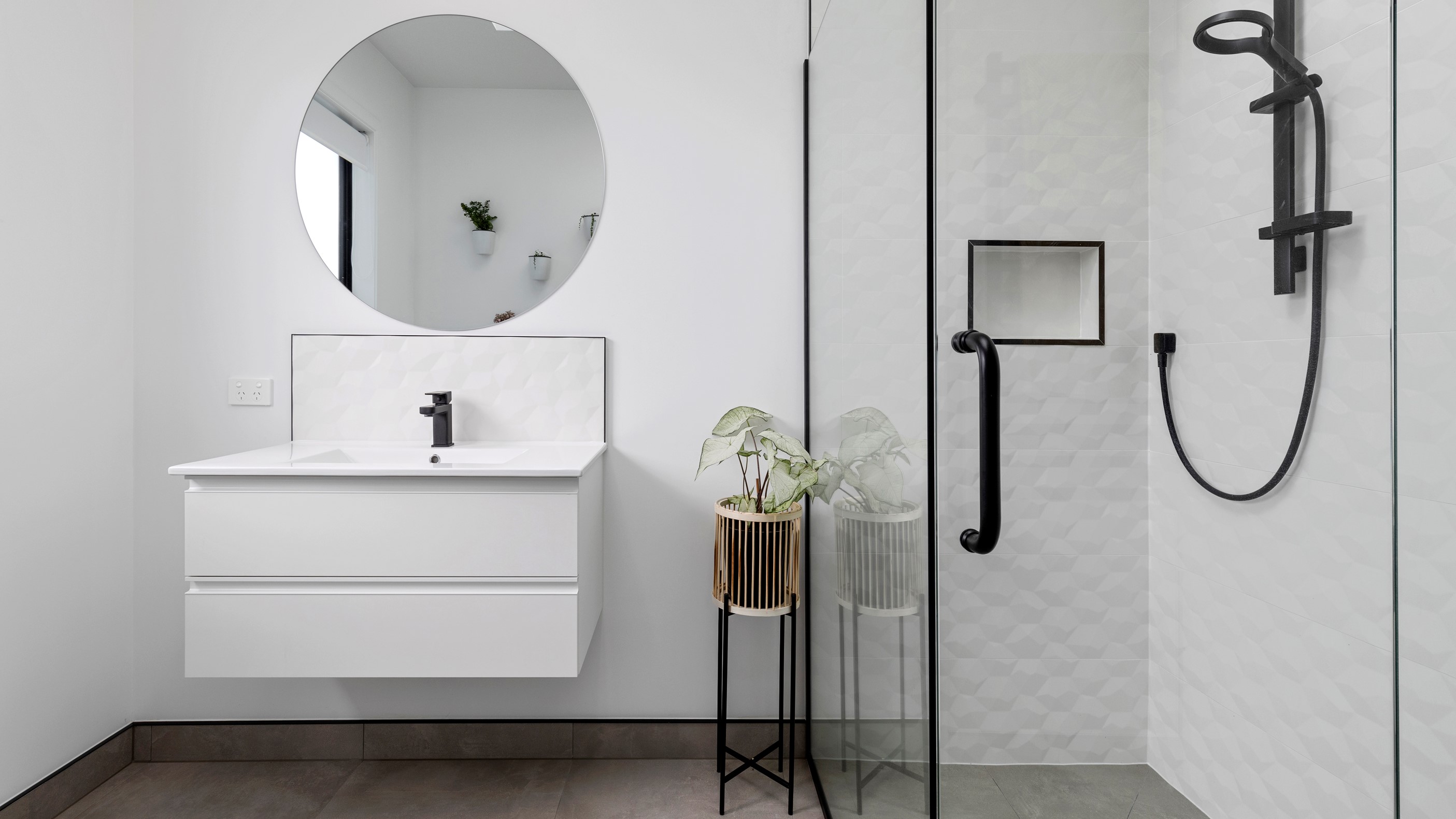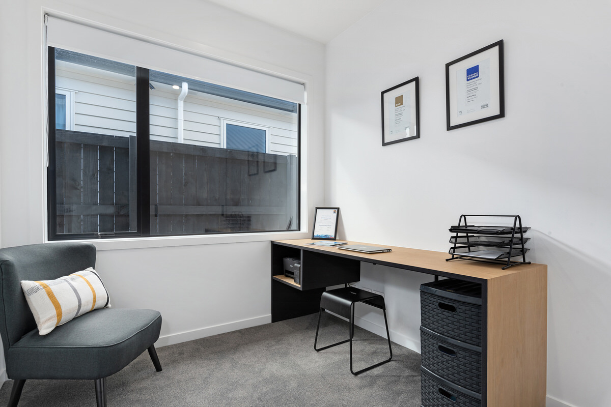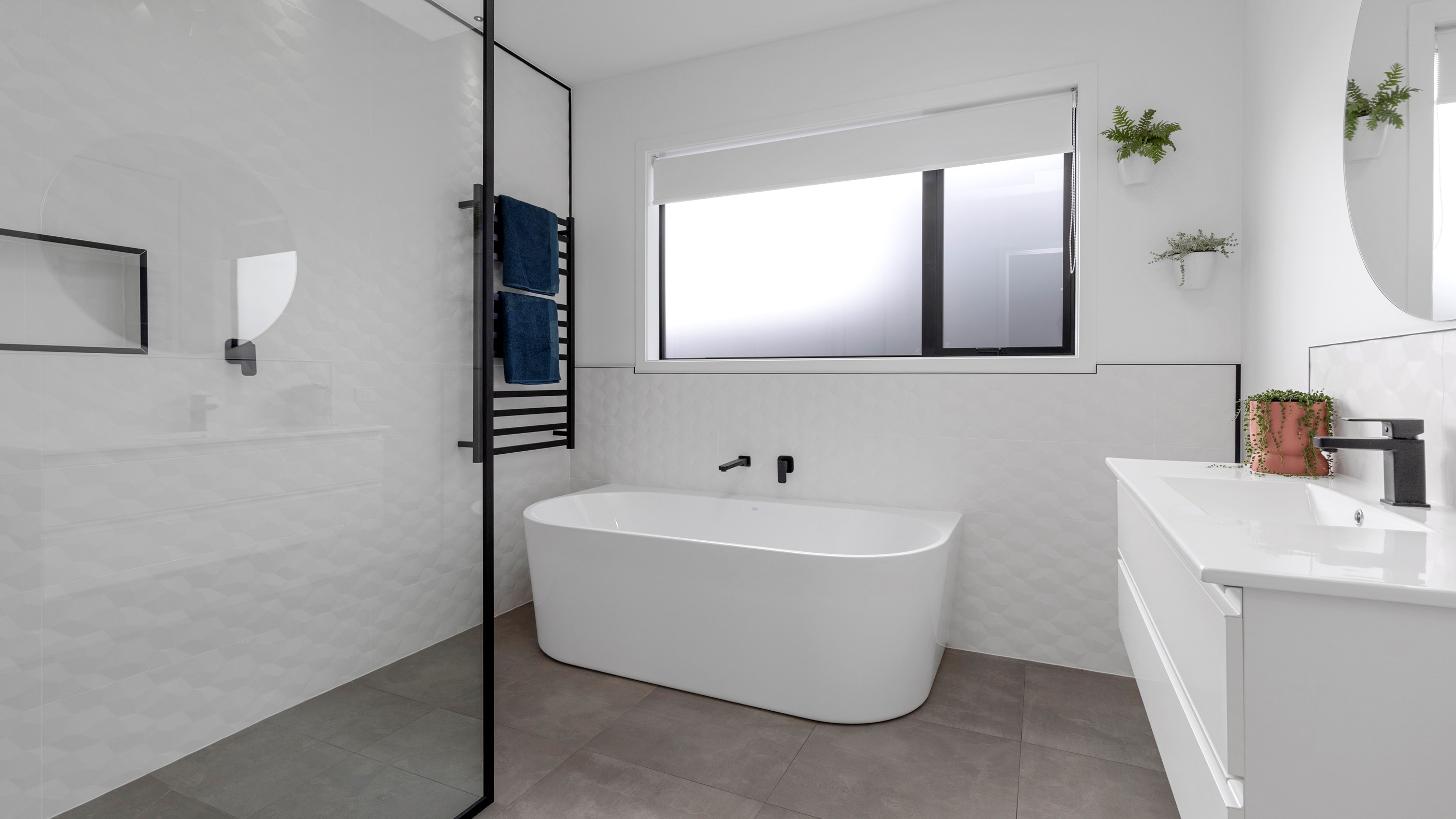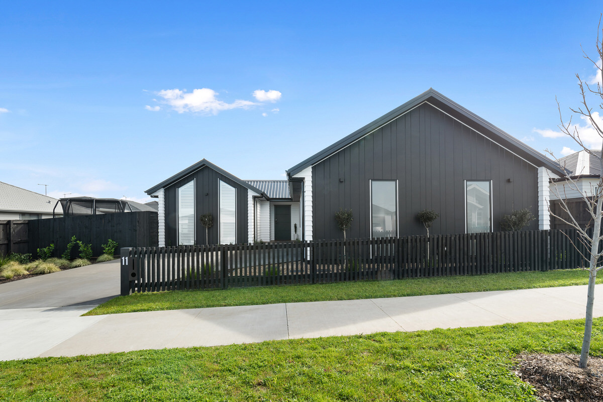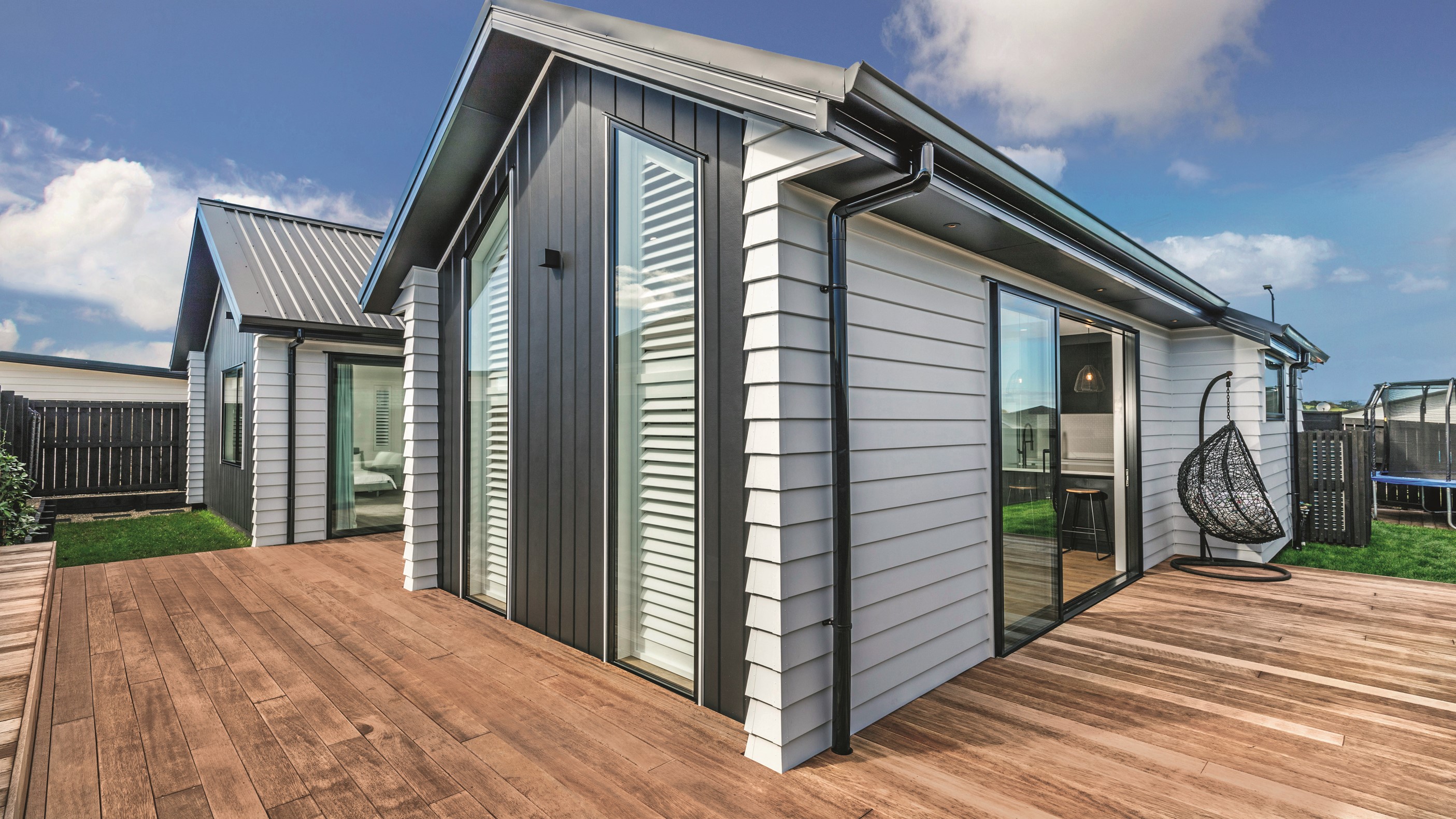This standout four-bedroom home makes a statement in contrasting black and white. The house is strategically designed and split into two living and bedroom wings. The result is a double-gabled frontage with grand internal cathedral raking ceilings. Full wraparound decks are easily accessed through extra-wide sliders from the living area, providing lots of level space for children to play safely outside, and of course, for enjoying outdoor entertaining. The 227sqm footprint includes two living areas and two bathrooms, so there is room for everyone to relax. The minimalist kitchen is sleek and chic, with a wide island bench and breakfast bar featuring a waterfall edge. A custom-made macrocarpa barn door adds just a hint of rustic charm. The bathrooms carry through the white aesthetic, complemented beautifully with quality black fittings and fixtures. With fully ducted air-conditioning and underfloor heating, the home is cool in summer and warm in winter. Three skylights bring in even more light to this bright, open-plan residence.