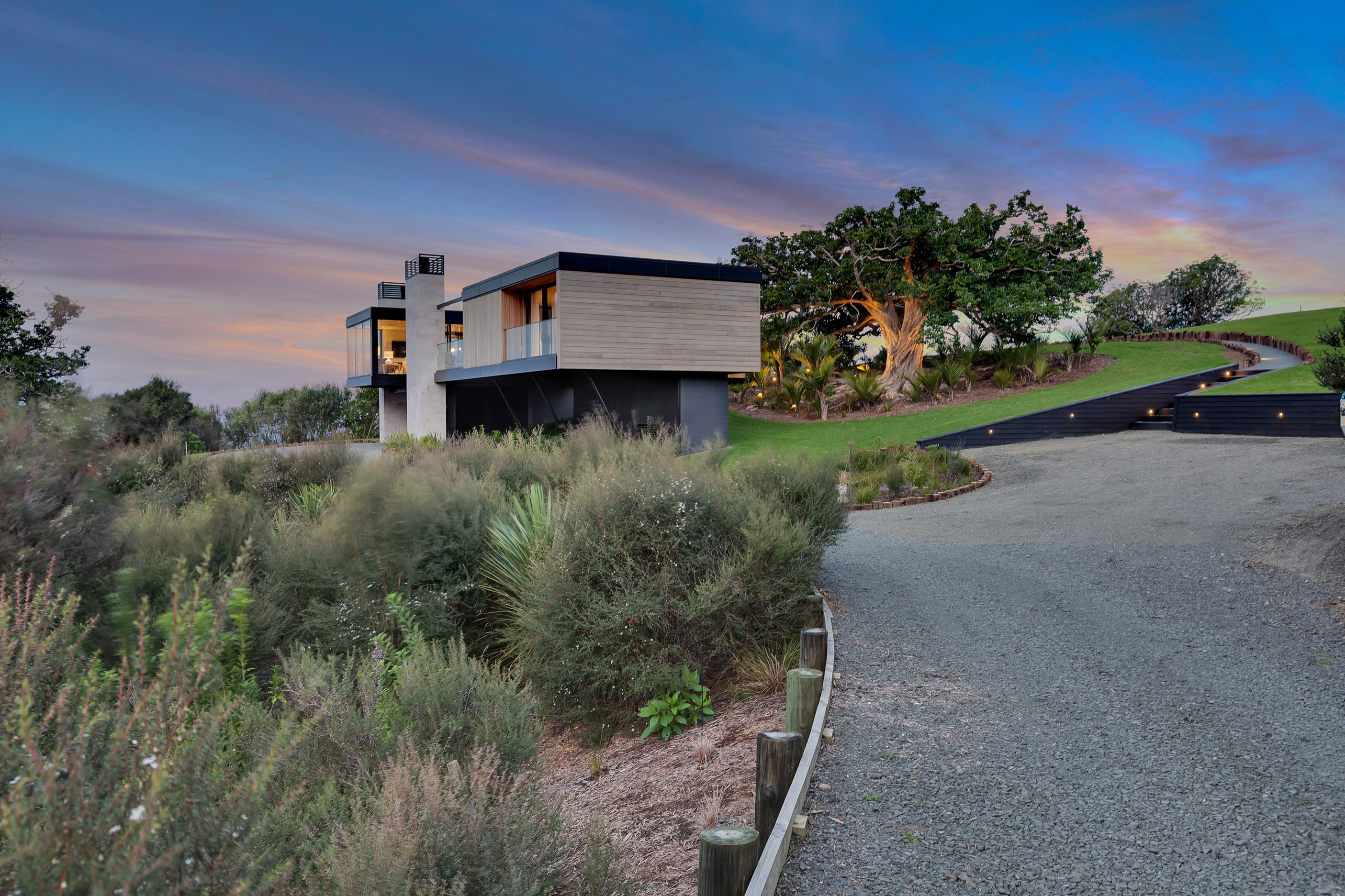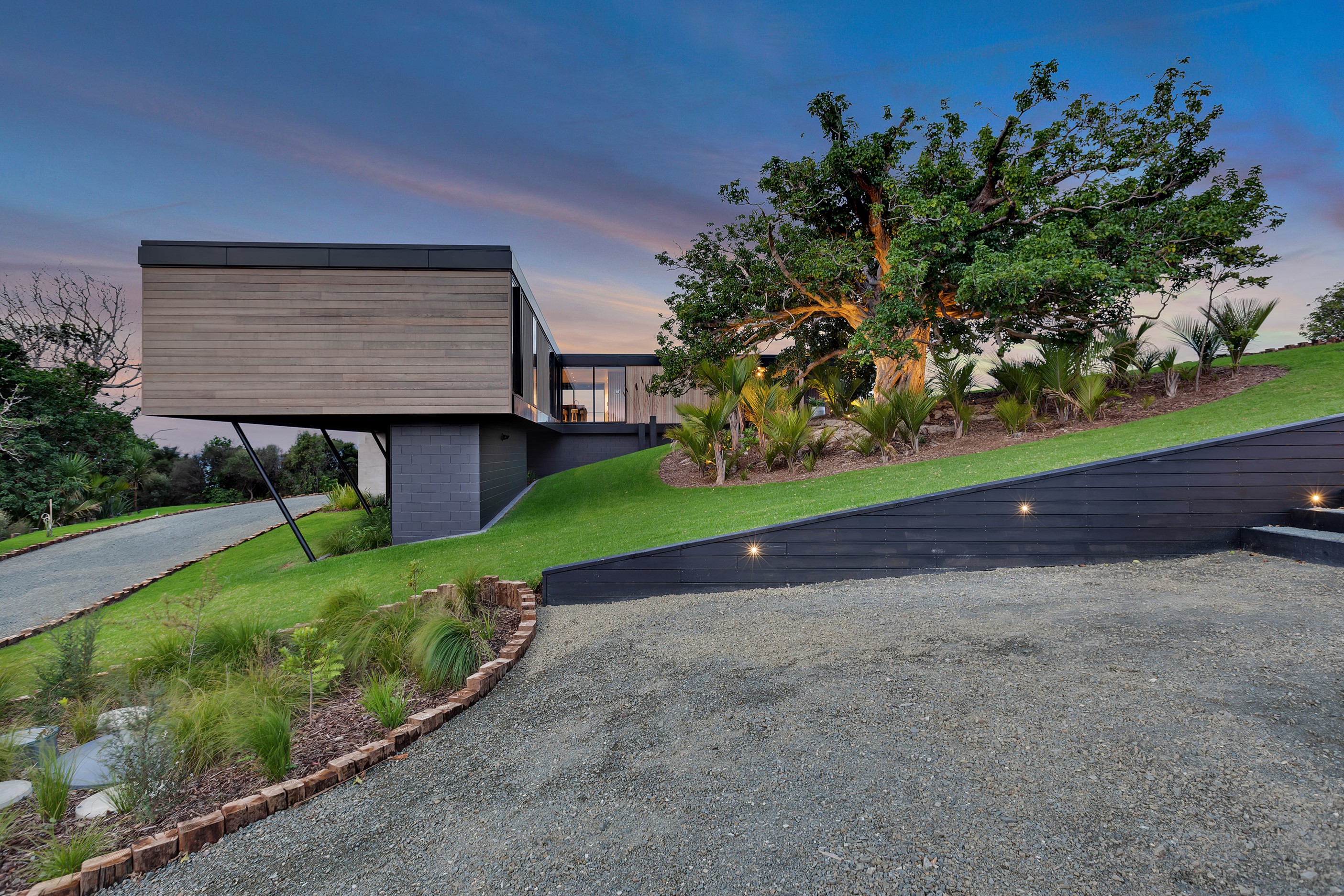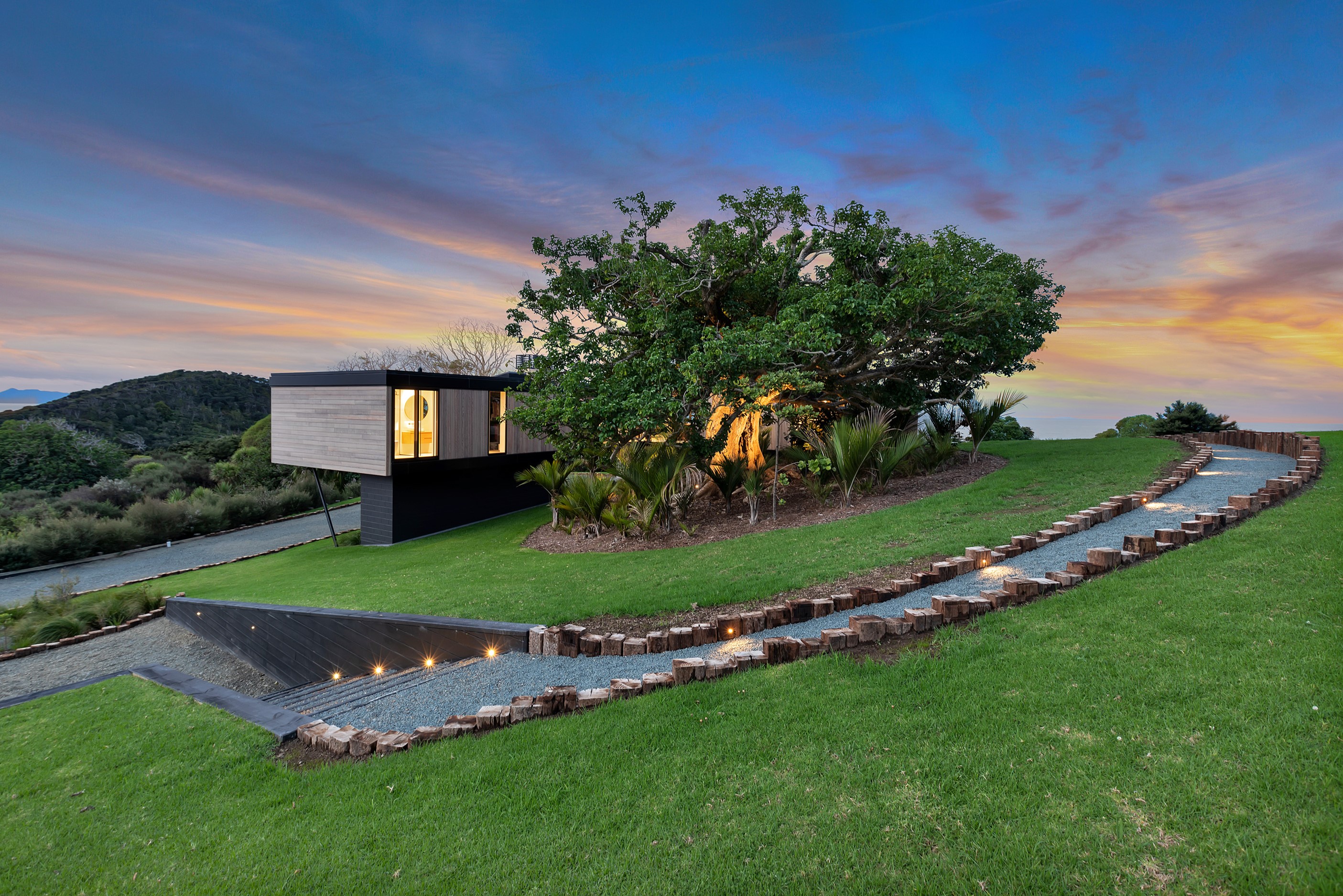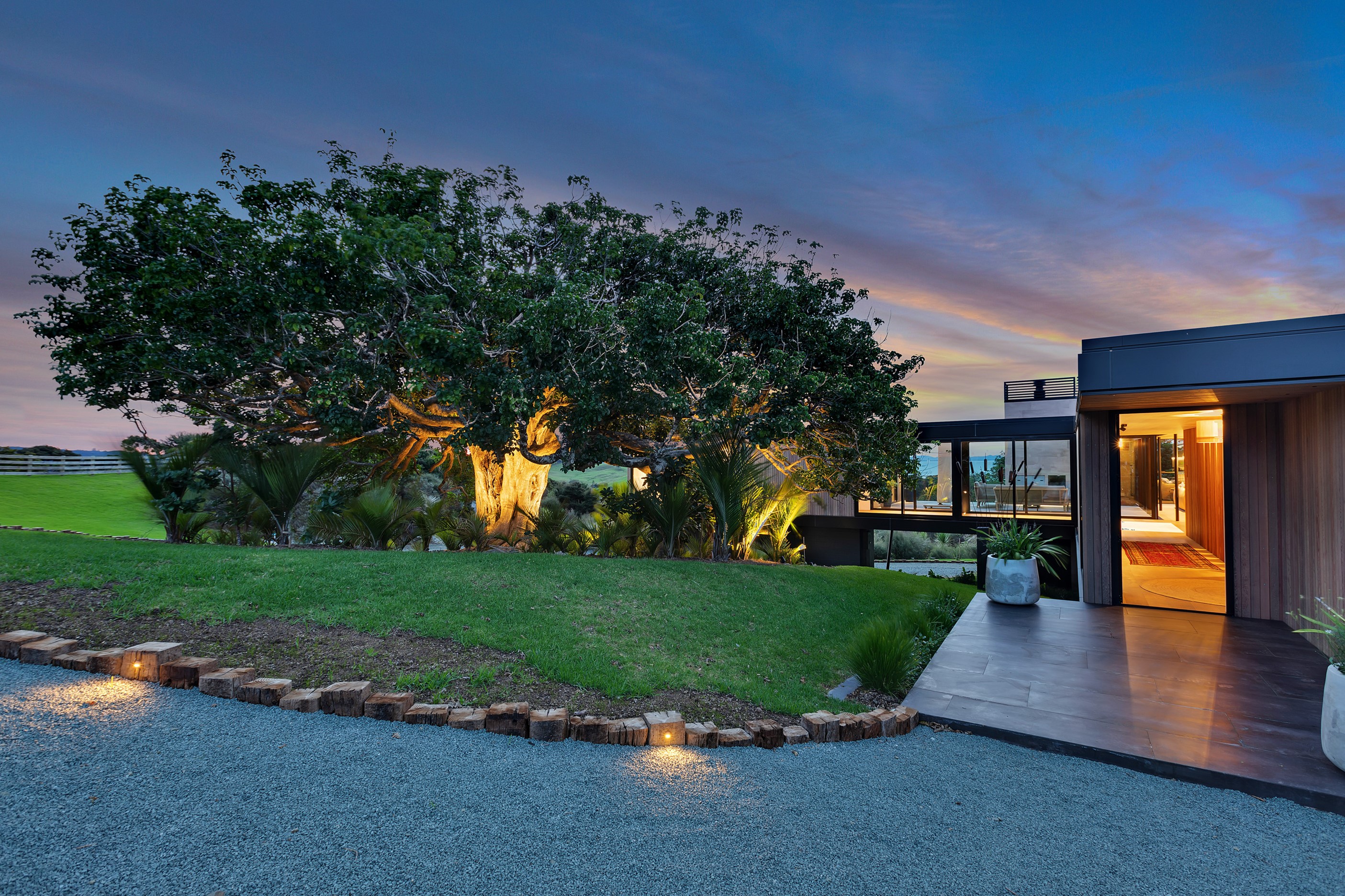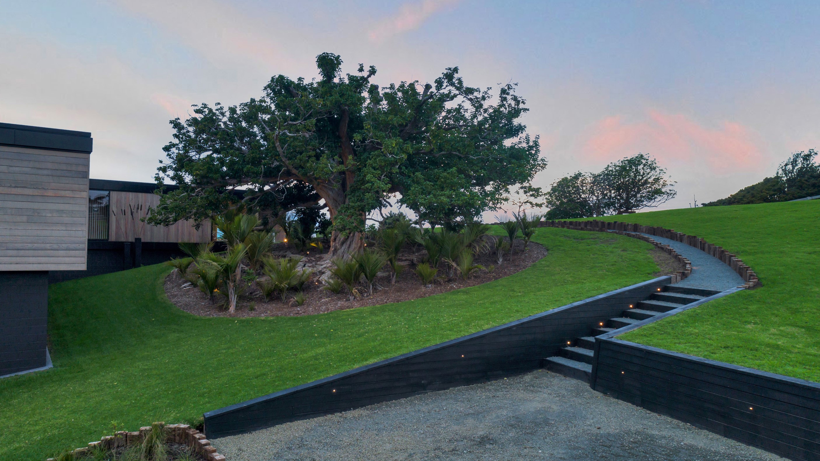 It started with a sprawling puriri and finished with a mid-century-style home honouring the tree with its rangy limbs and prolific red flowers. Yes, the 312sqm coastal home takes in grandstand views of the Pacific, but the owners also wanted it to respect its gnarled companion – a beautiful reminder of what was there first. The owners also wanted a low-profile contemporary home with sharp angles and clean lines, softened by cantilevering and landscaping curves. The two separate wings of the three-bedroom, two-bathroom house evoke a feeling of floating, or of reaching out into surrounding nature. Guests in the east wing are treated to wide ocean vistas, while the main-bedroom wing frames Northland’s rural splendour. A glazed hallway between showcases a spacious outdoor entertaining area with inbuilt fireplace on one side and the puriri and juvenile nīkau palms – magnificent when lit up at night – on the other. Timber ceilings, floors and features ground the interior and connect it with what’s outside. You’ll also find a media room, three bathrooms and a double garage. Special.