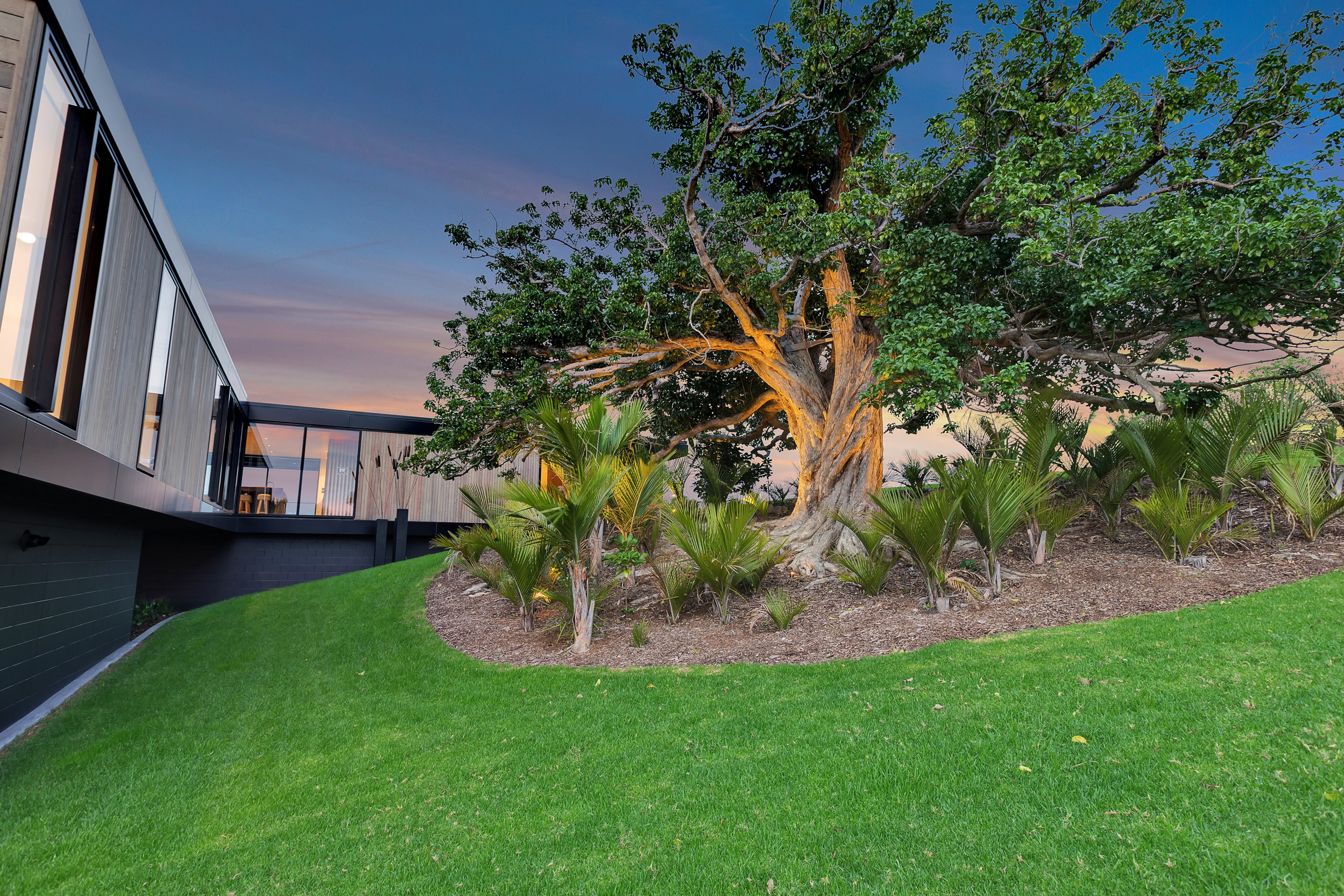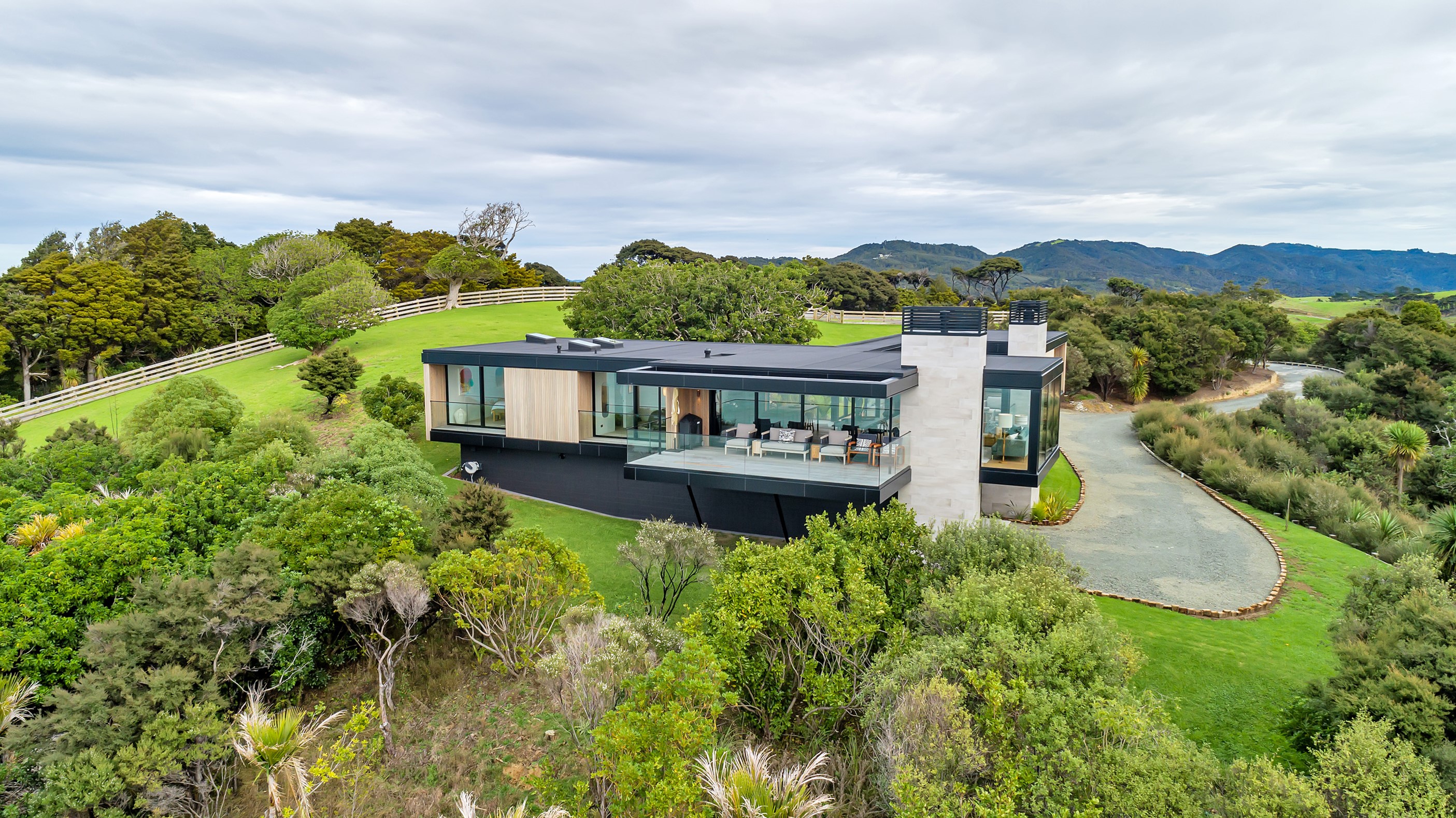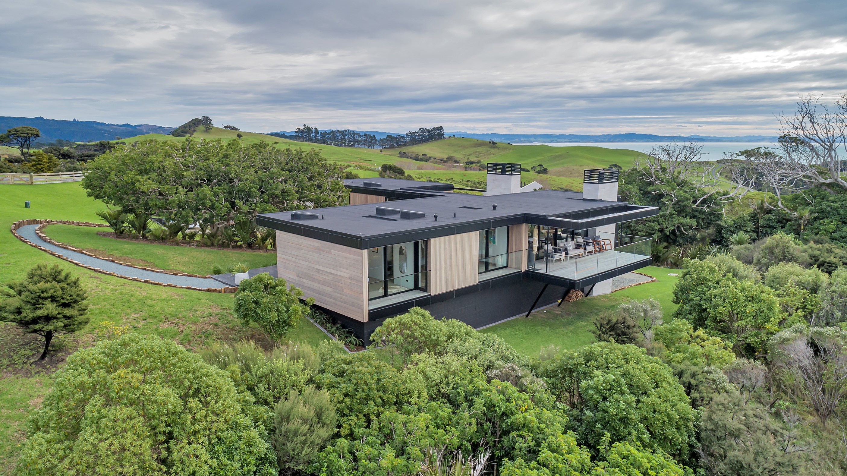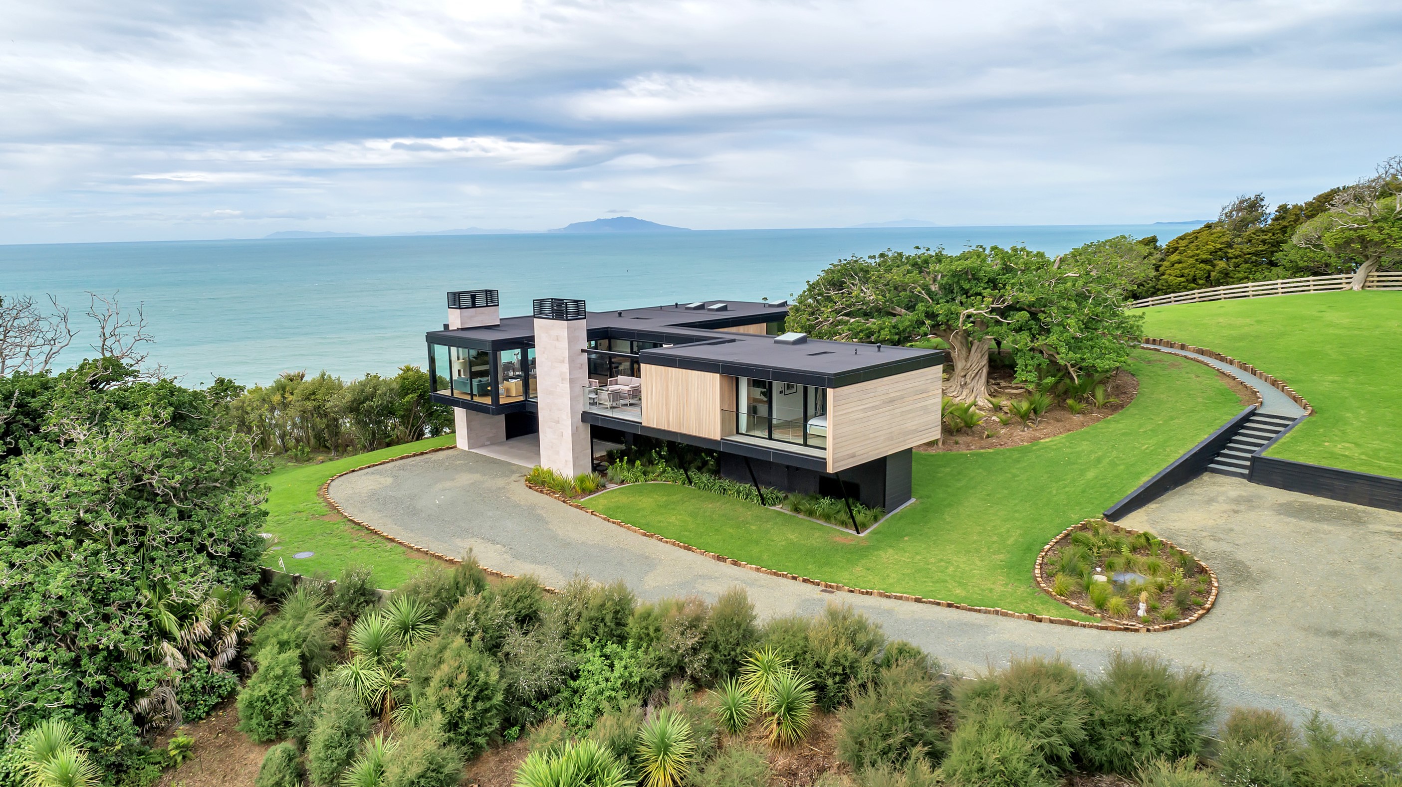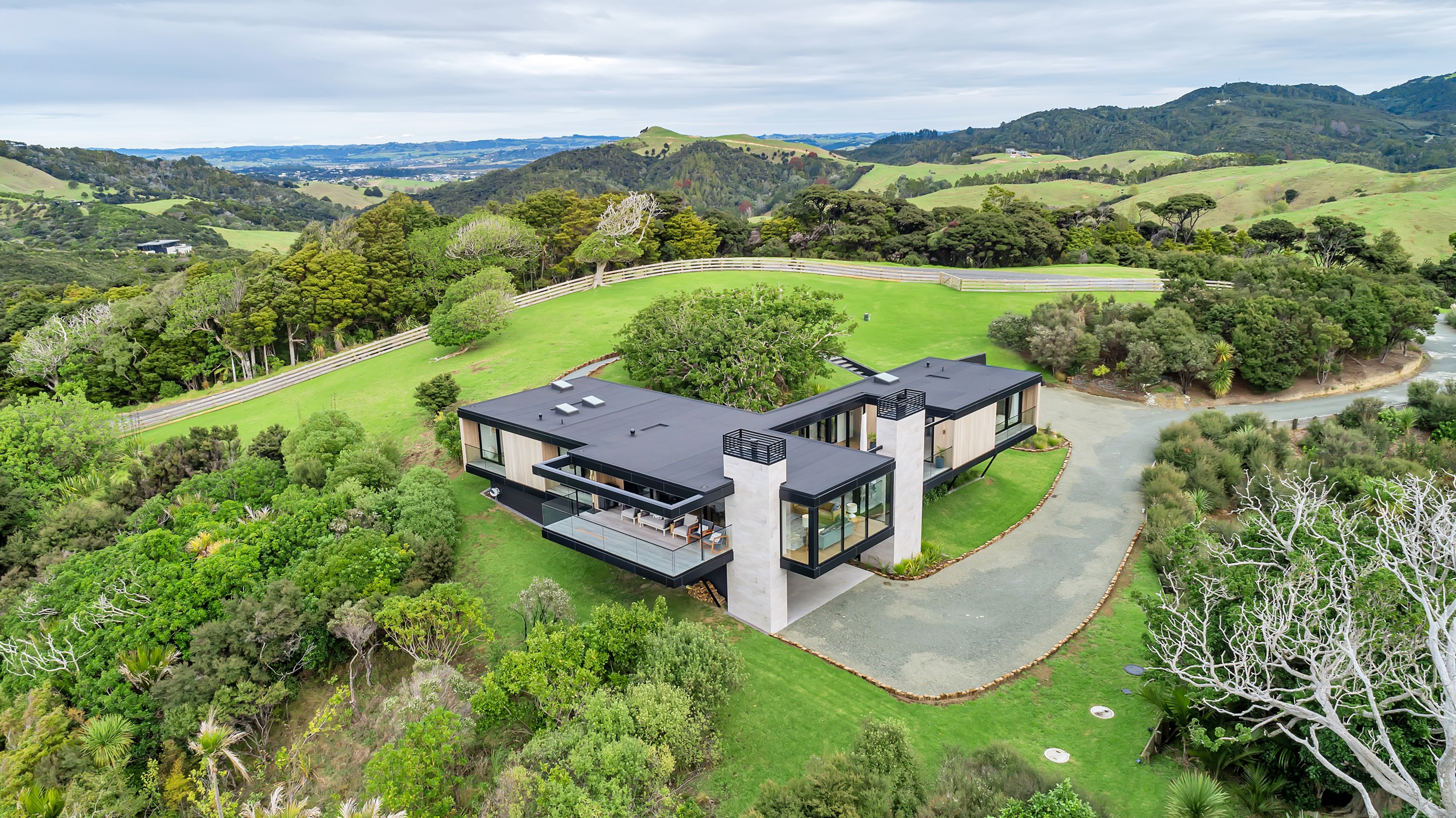 It started with a sprawling puriri and finished with a mid-century-style home honouring the tree with its rangy limbs and prolific red flowers. Yes, the 312sqm coastal home takes in grandstand views of the Pacific, but the owners also wanted it to respect its gnarled companion – a beautiful reminder of what was there first. The owners also wanted a low-profile contemporary home with sharp angles and clean lines, softened by cantilevering and landscaping curves. The two separate wings of the three-bedroom, two-bathroom house evoke a feeling of floating, or of reaching out into surrounding nature. Guests in the east wing are treated to wide ocean vistas, while the main-bedroom wing frames Northland’s rural splendour. A glazed hallway between showcases a spacious outdoor entertaining area with inbuilt fireplace on one side and the puriri and juvenile nīkau palms – magnificent when lit up at night – on the other. Timber ceilings, floors and features ground the interior and connect it with what’s outside. You’ll also find a media room, three bathrooms and a double garage. Special.