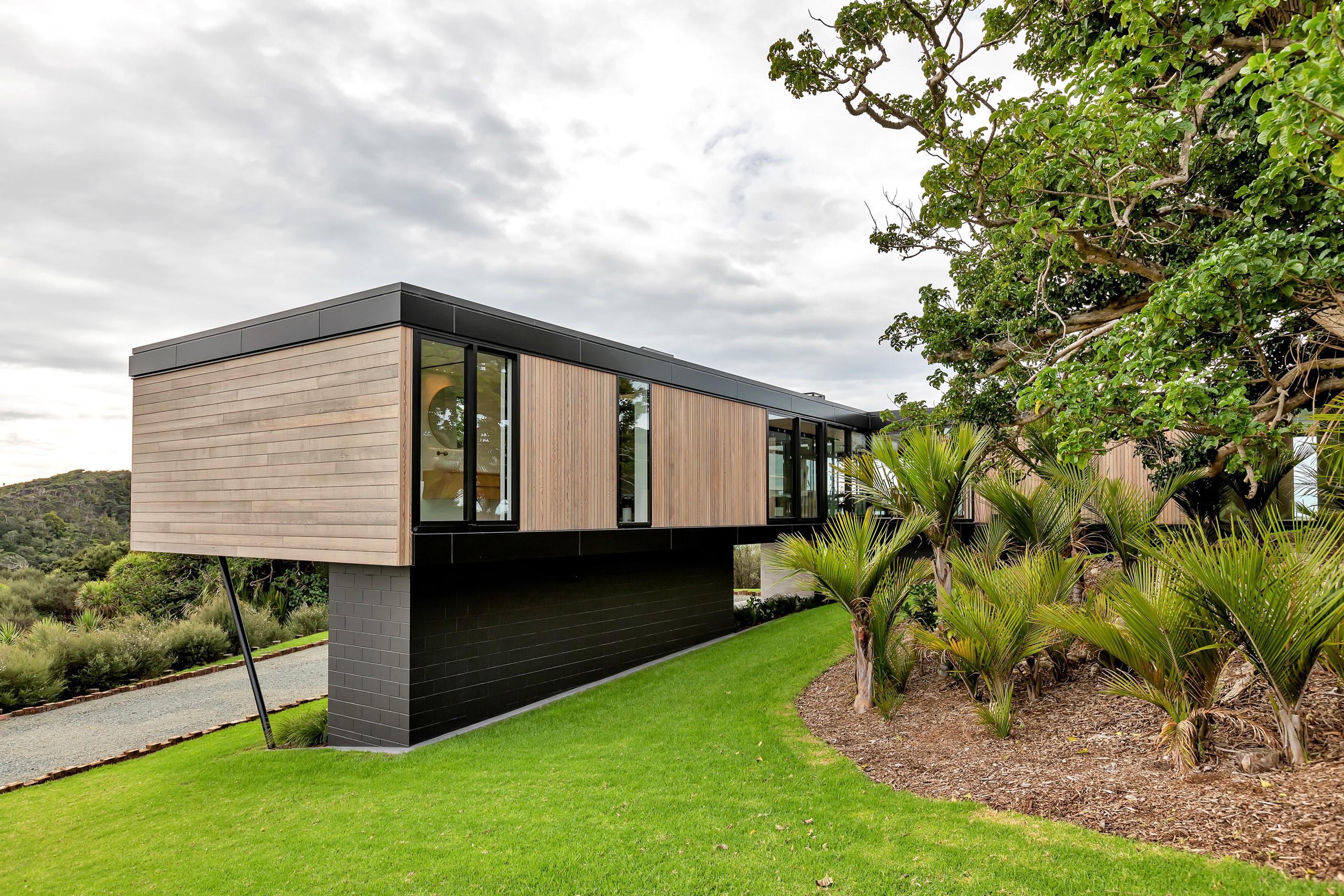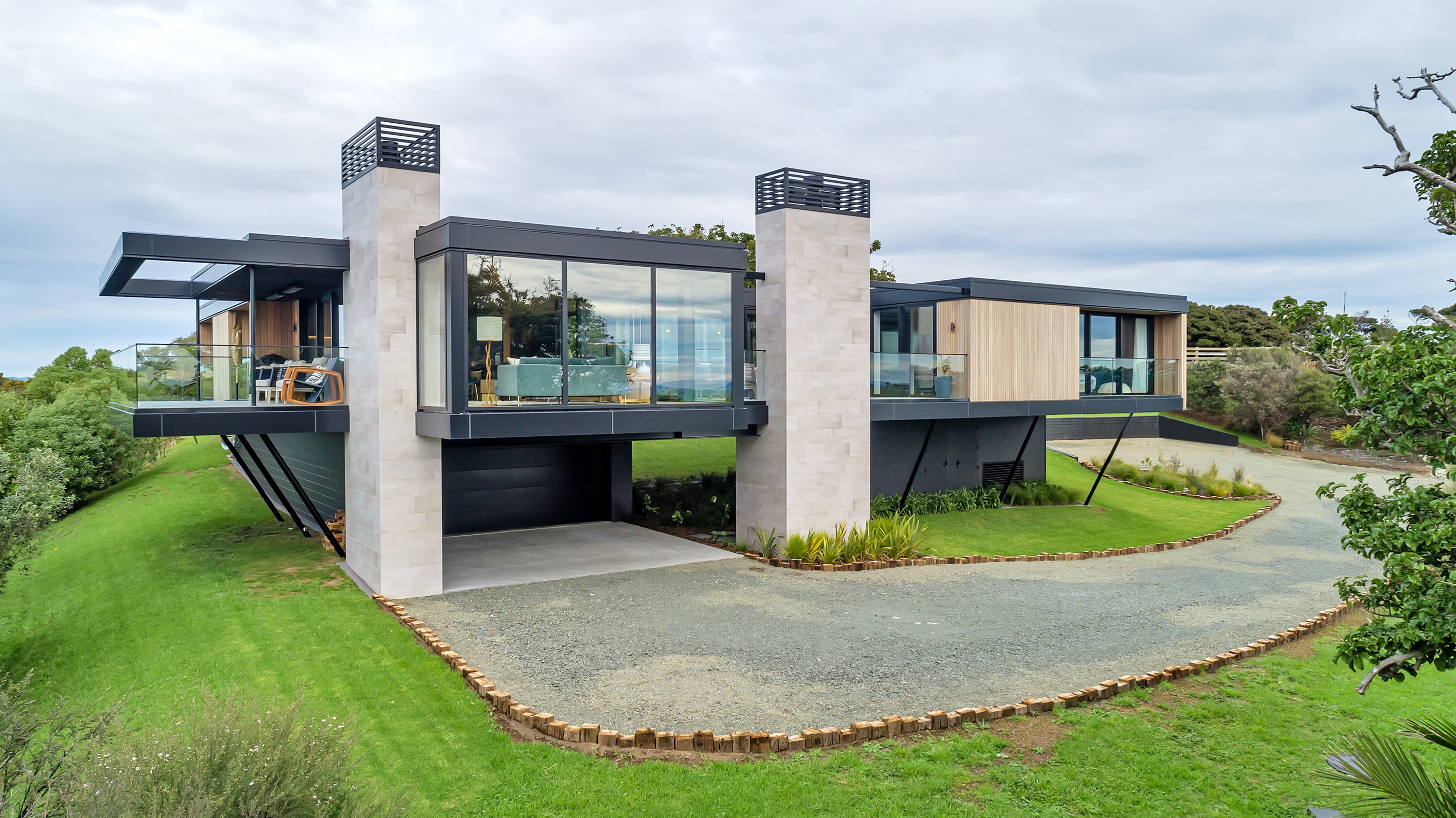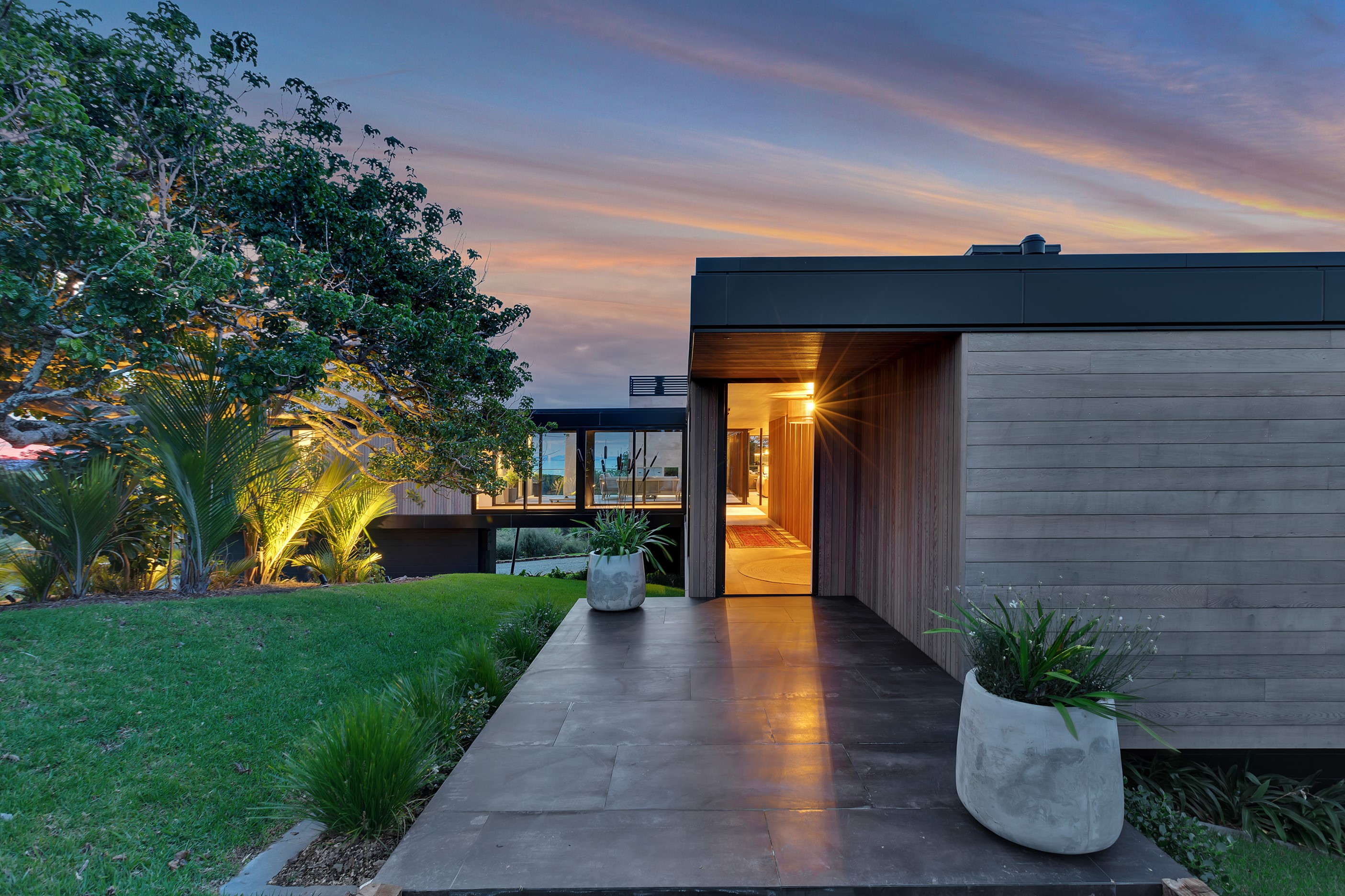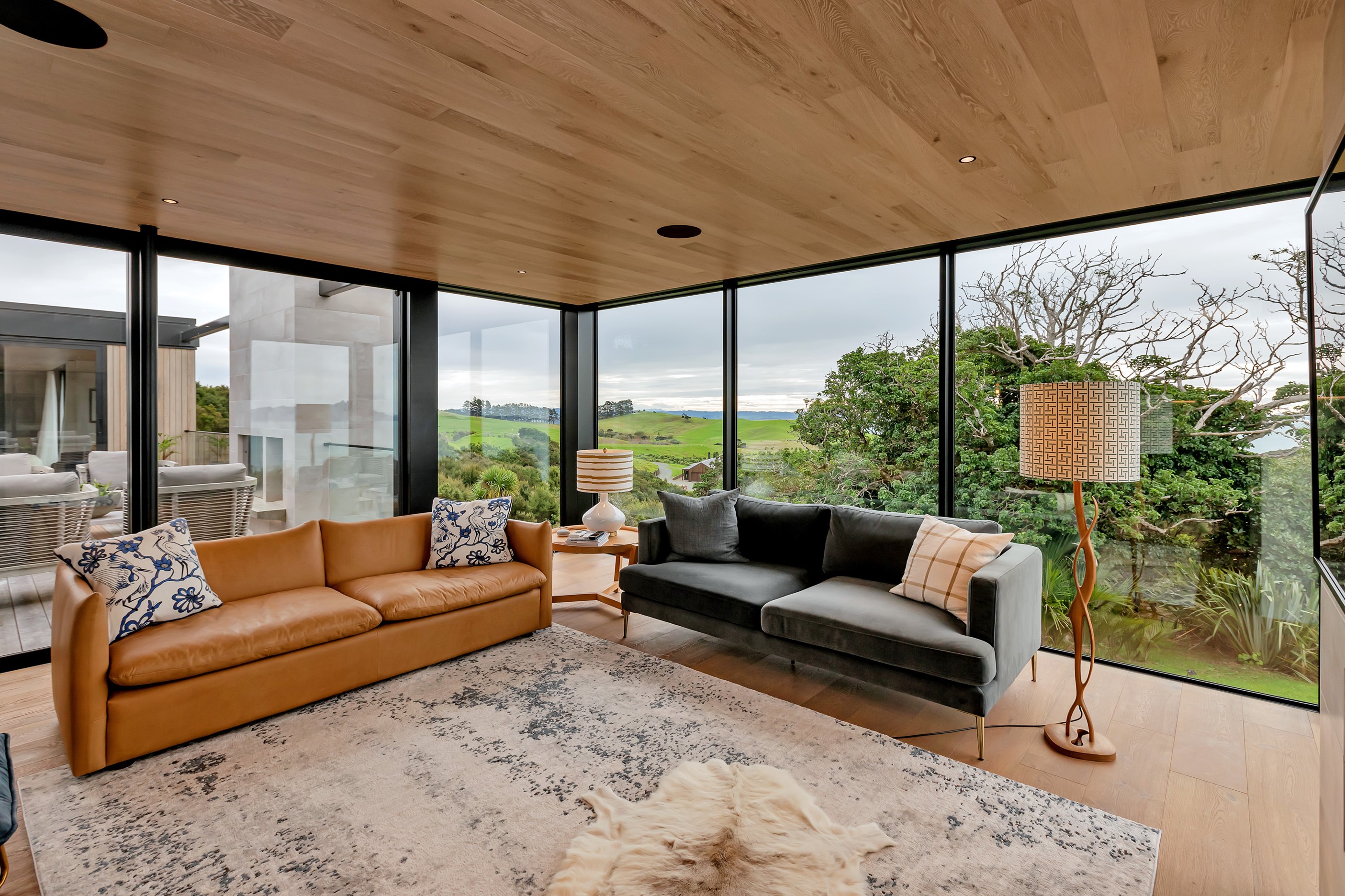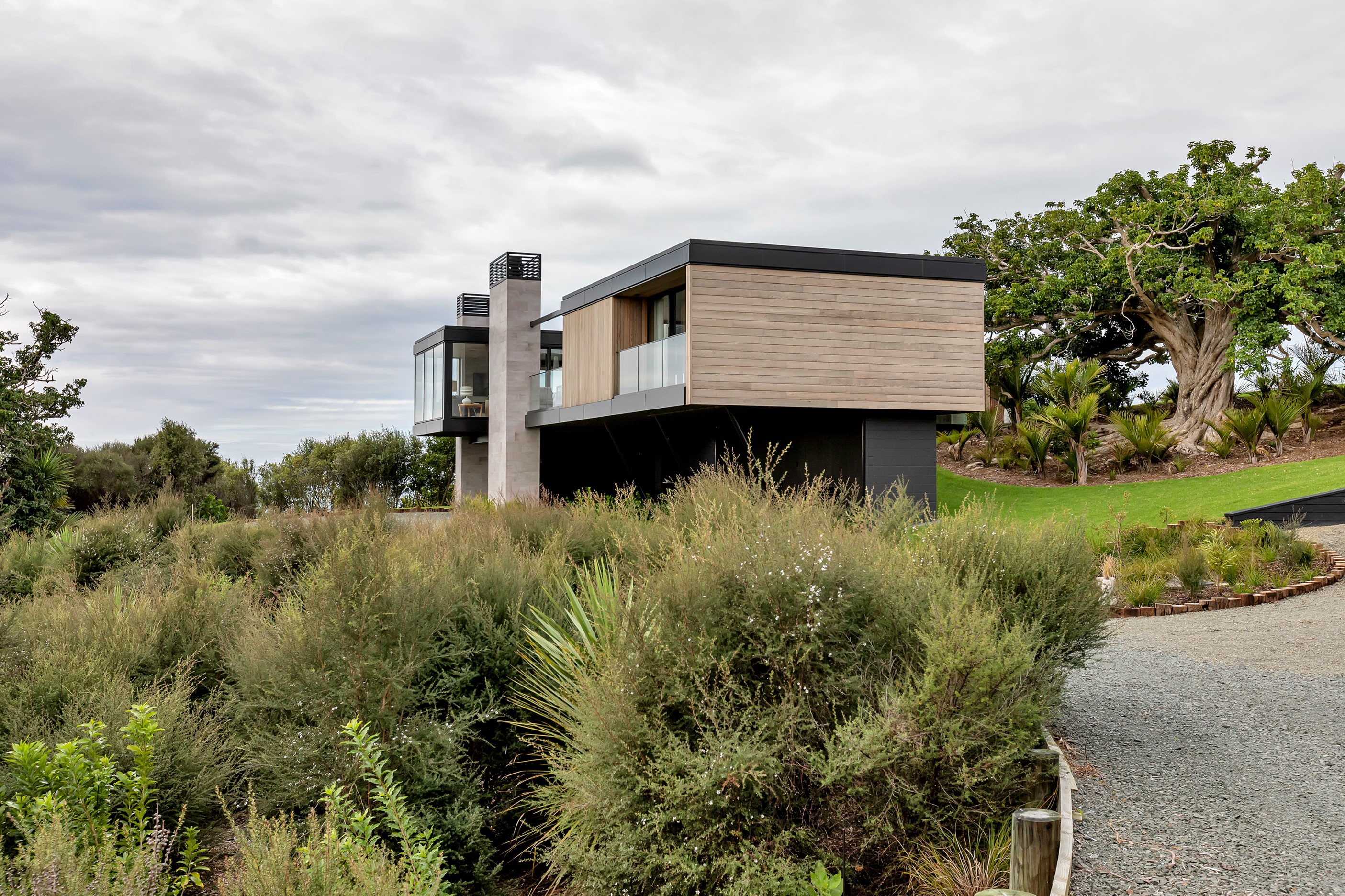 It started with a sprawling puriri and finished with a mid-century-style home honouring the tree with its rangy limbs and prolific red flowers. Yes, the 312sqm coastal home takes in grandstand views of the Pacific, but the owners also wanted it to respect its gnarled companion – a beautiful reminder of what was there first. The owners also wanted a low-profile contemporary home with sharp angles and clean lines, softened by cantilevering and landscaping curves. The two separate wings of the three-bedroom, two-bathroom house evoke a feeling of floating, or of reaching out into surrounding nature. Guests in the east wing are treated to wide ocean vistas, while the main-bedroom wing frames Northland’s rural splendour. A glazed hallway between showcases a spacious outdoor entertaining area with inbuilt fireplace on one side and the puriri and juvenile nīkau palms – magnificent when lit up at night – on the other. Timber ceilings, floors and features ground the interior and connect it with what’s outside. You’ll also find a media room, three bathrooms and a double garage. Special.