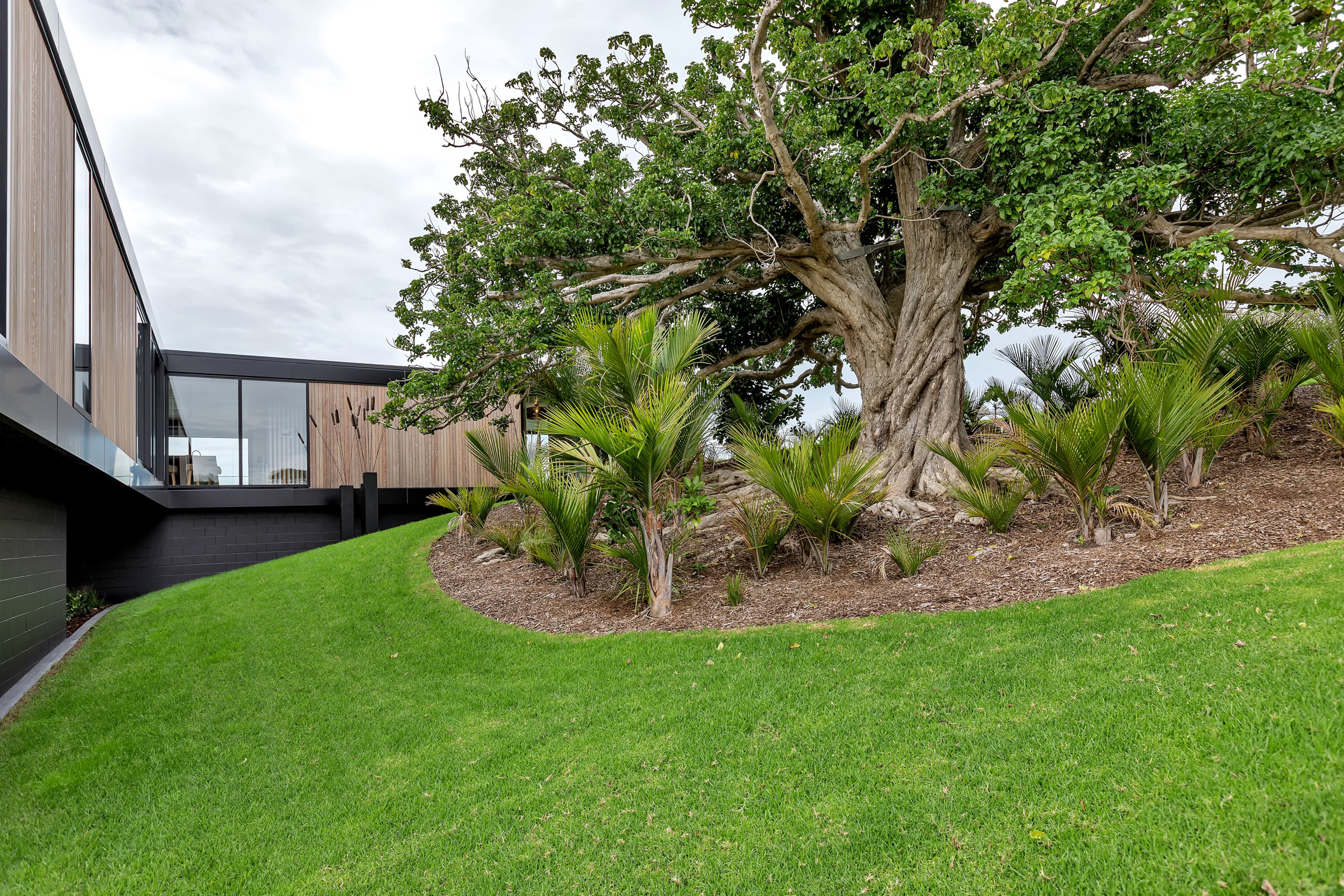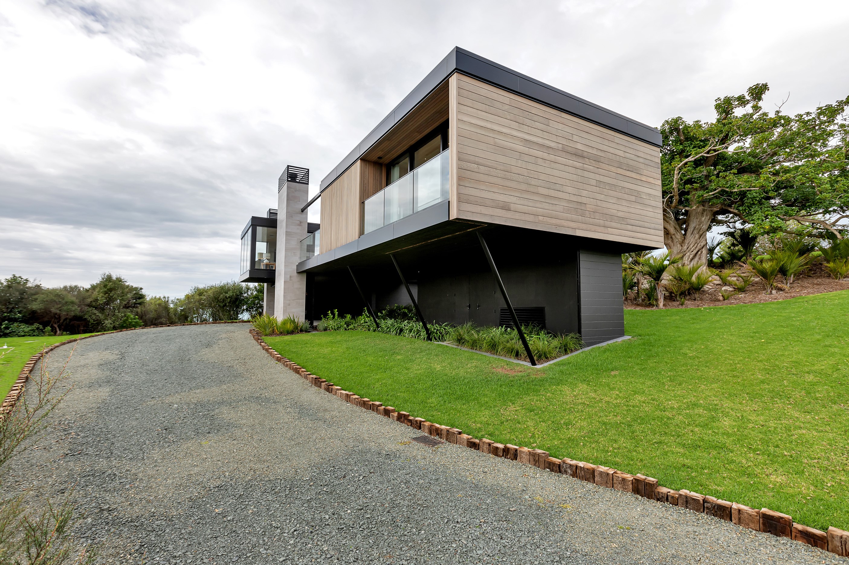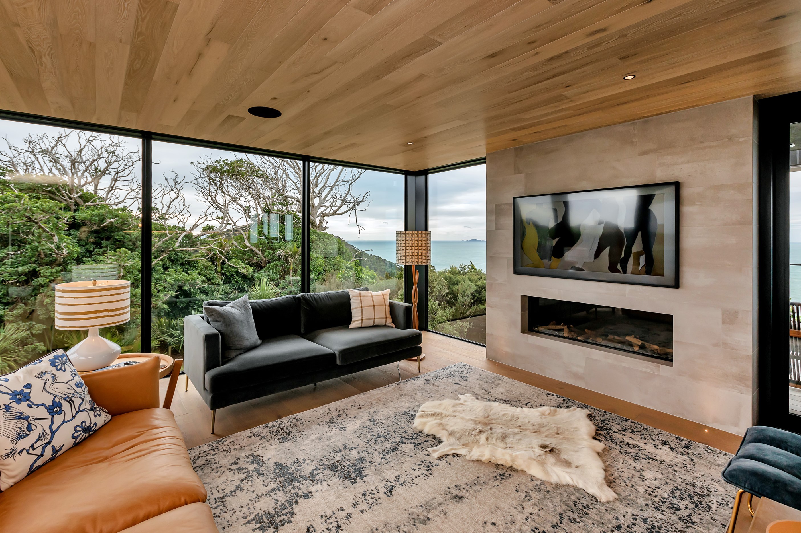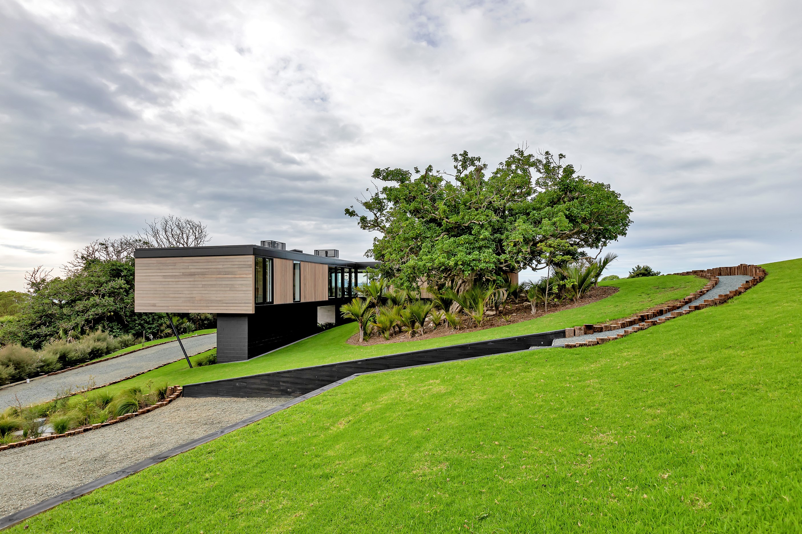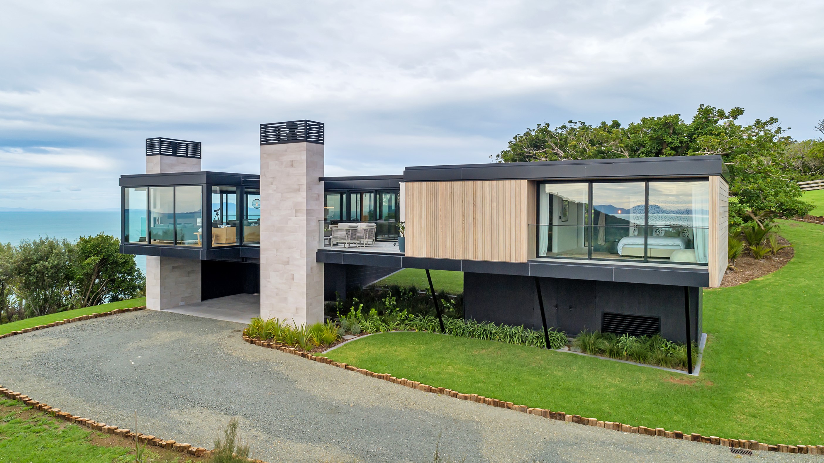 It started with a sprawling puriri and finished with a mid-century-style home honouring the tree with its rangy limbs and prolific red flowers. Yes, the 312sqm coastal home takes in grandstand views of the Pacific, but the owners also wanted it to respect its gnarled companion – a beautiful reminder of what was there first. The owners also wanted a low-profile contemporary home with sharp angles and clean lines, softened by cantilevering and landscaping curves. The two separate wings of the three-bedroom, two-bathroom house evoke a feeling of floating, or of reaching out into surrounding nature. Guests in the east wing are treated to wide ocean vistas, while the main-bedroom wing frames Northland’s rural splendour. A glazed hallway between showcases a spacious outdoor entertaining area with inbuilt fireplace on one side and the puriri and juvenile nīkau palms – magnificent when lit up at night – on the other. Timber ceilings, floors and features ground the interior and connect it with what’s outside. You’ll also find a media room, three bathrooms and a double garage. Special.