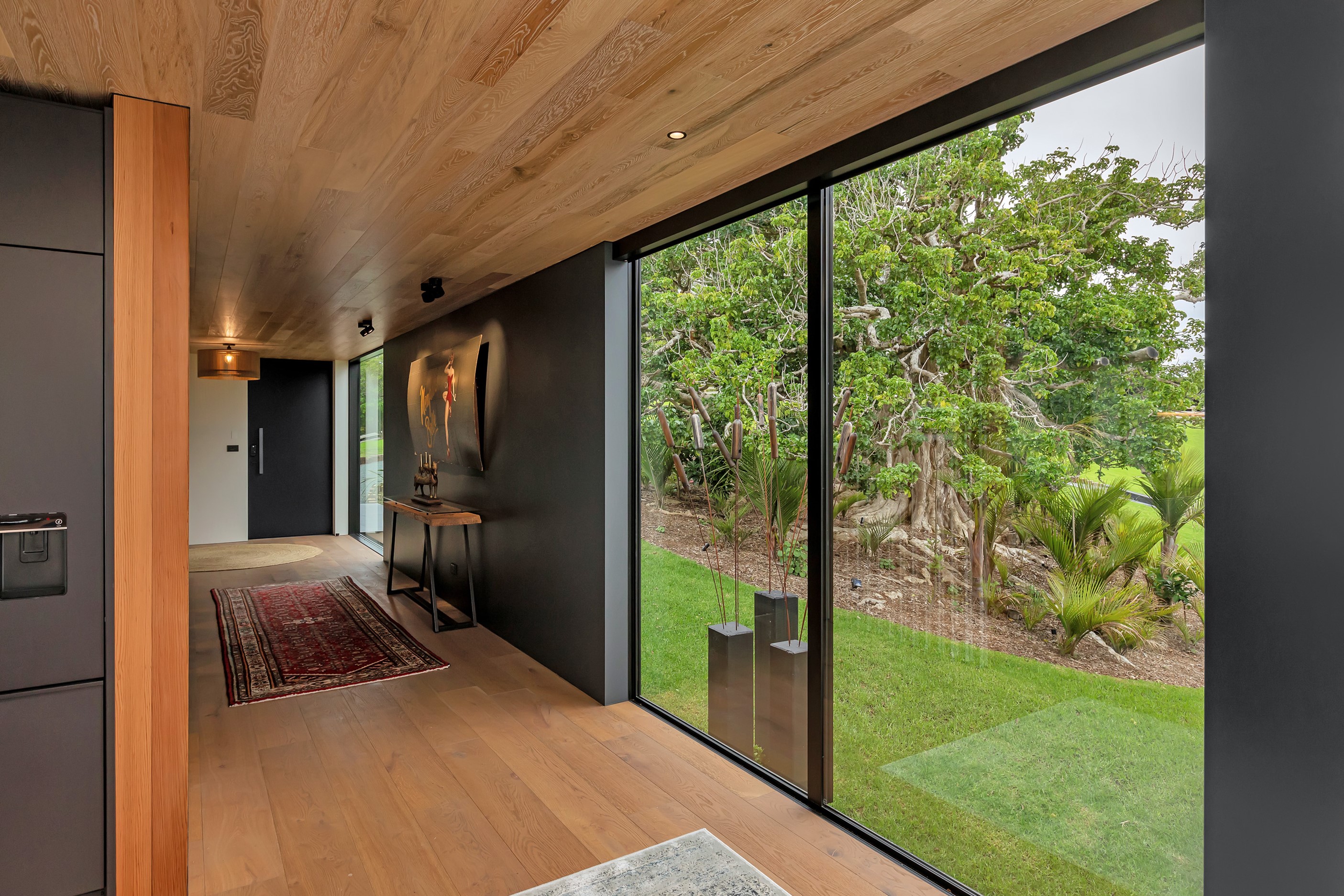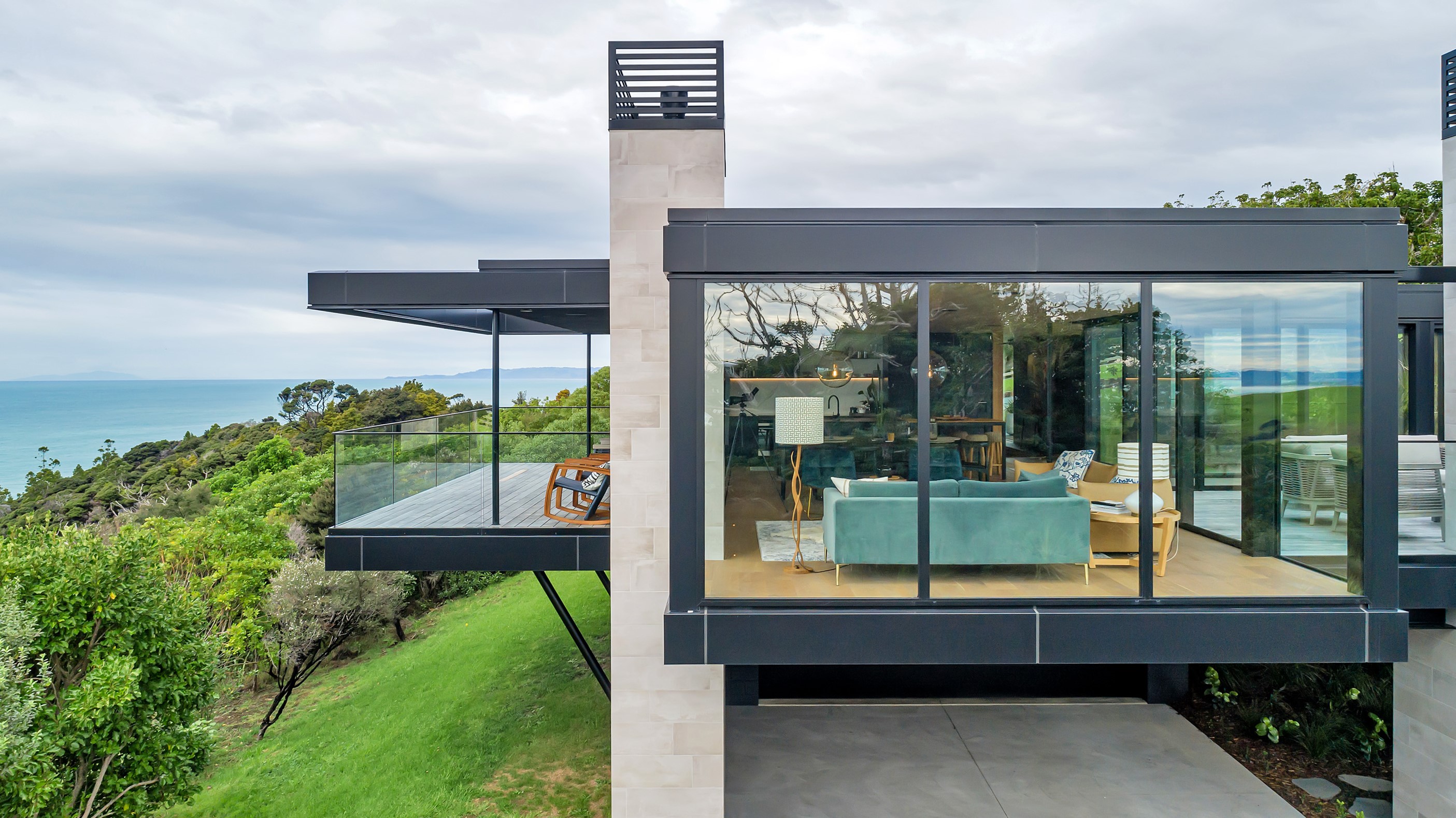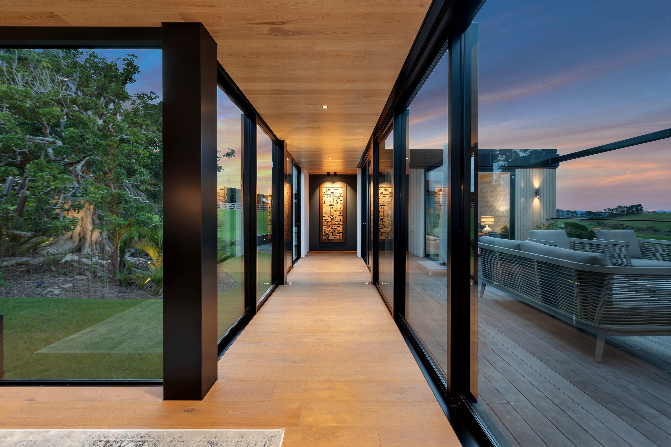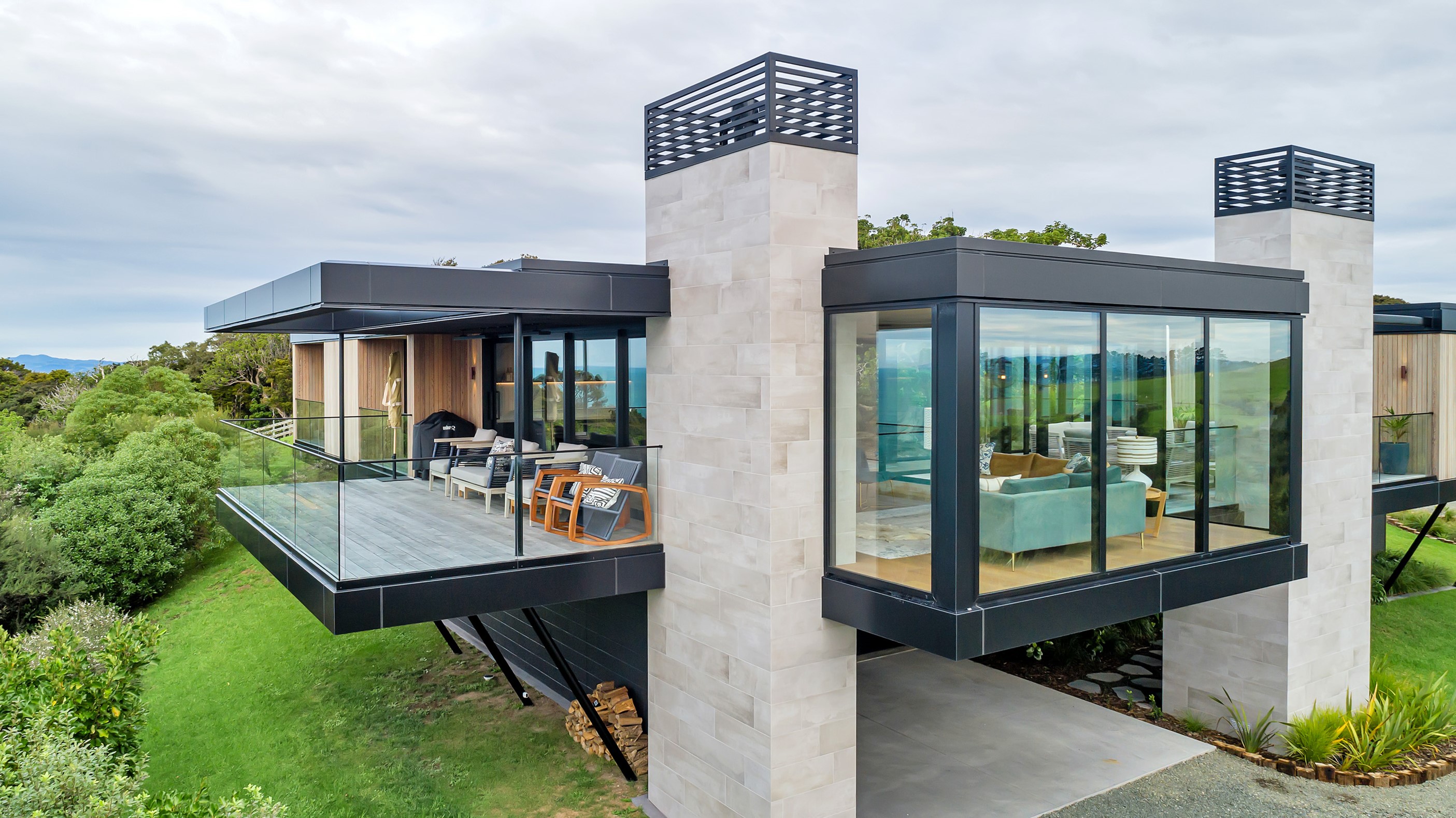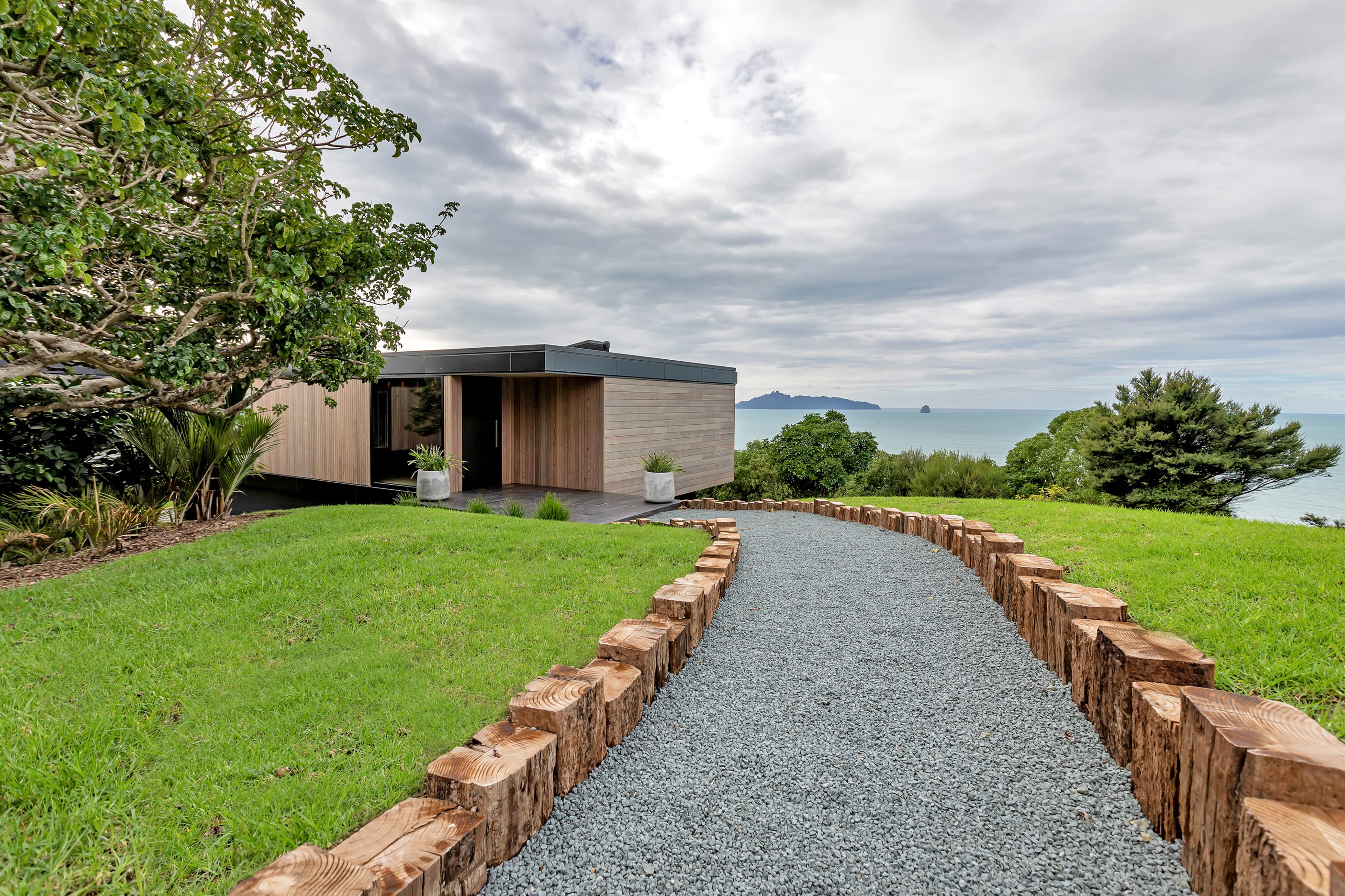 It started with a sprawling puriri and finished with a mid-century-style home honouring the tree with its rangy limbs and prolific red flowers. Yes, the 312sqm coastal home takes in grandstand views of the Pacific, but the owners also wanted it to respect its gnarled companion – a beautiful reminder of what was there first. The owners also wanted a low-profile contemporary home with sharp angles and clean lines, softened by cantilevering and landscaping curves. The two separate wings of the three-bedroom, two-bathroom house evoke a feeling of floating, or of reaching out into surrounding nature. Guests in the east wing are treated to wide ocean vistas, while the main-bedroom wing frames Northland’s rural splendour. A glazed hallway between showcases a spacious outdoor entertaining area with inbuilt fireplace on one side and the puriri and juvenile nīkau palms – magnificent when lit up at night – on the other. Timber ceilings, floors and features ground the interior and connect it with what’s outside. You’ll also find a media room, three bathrooms and a double garage. Special.