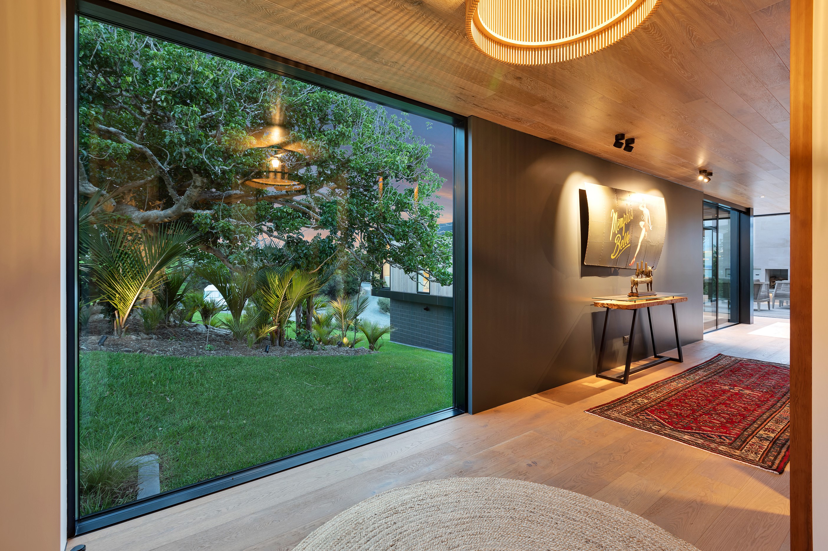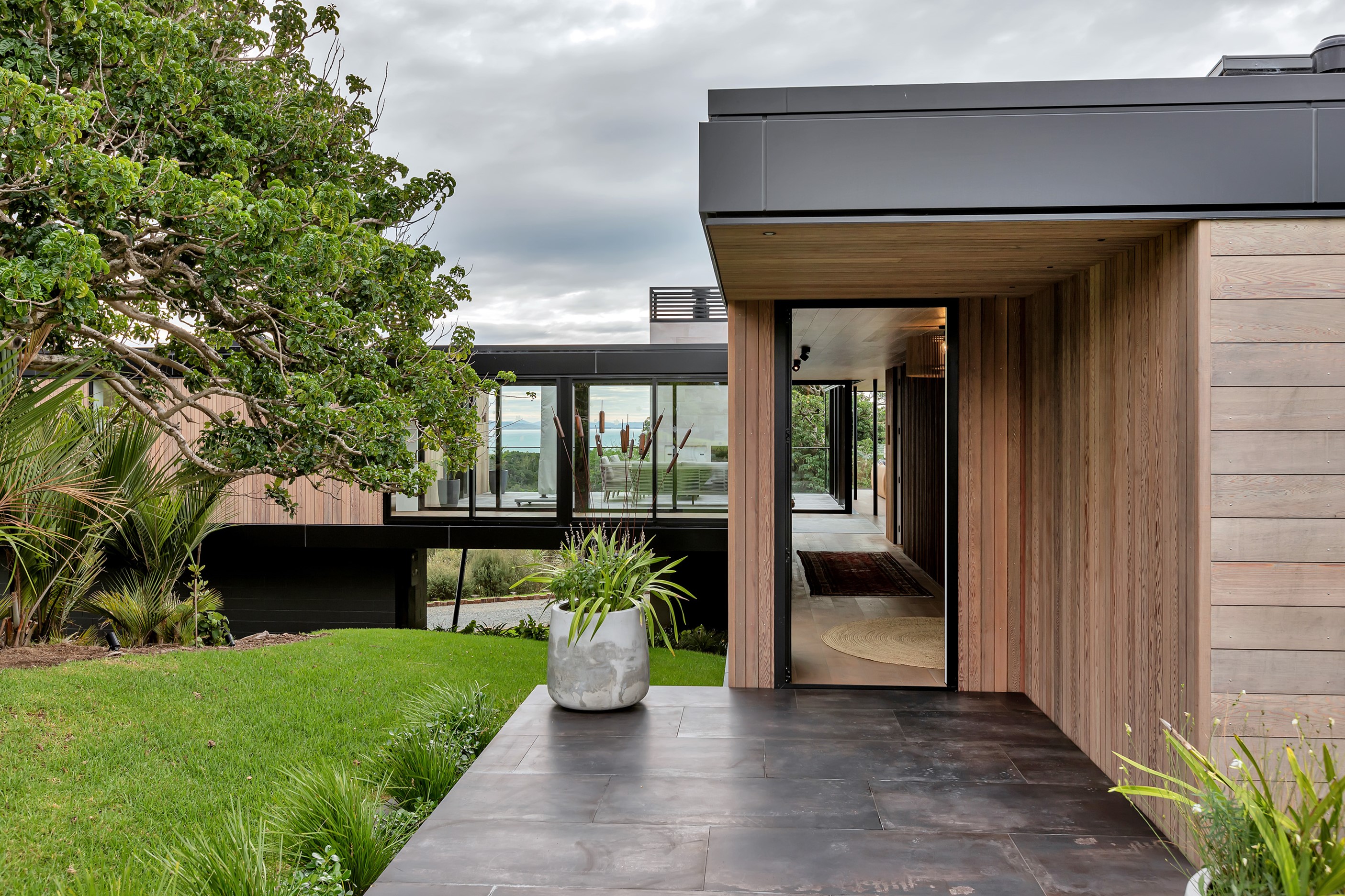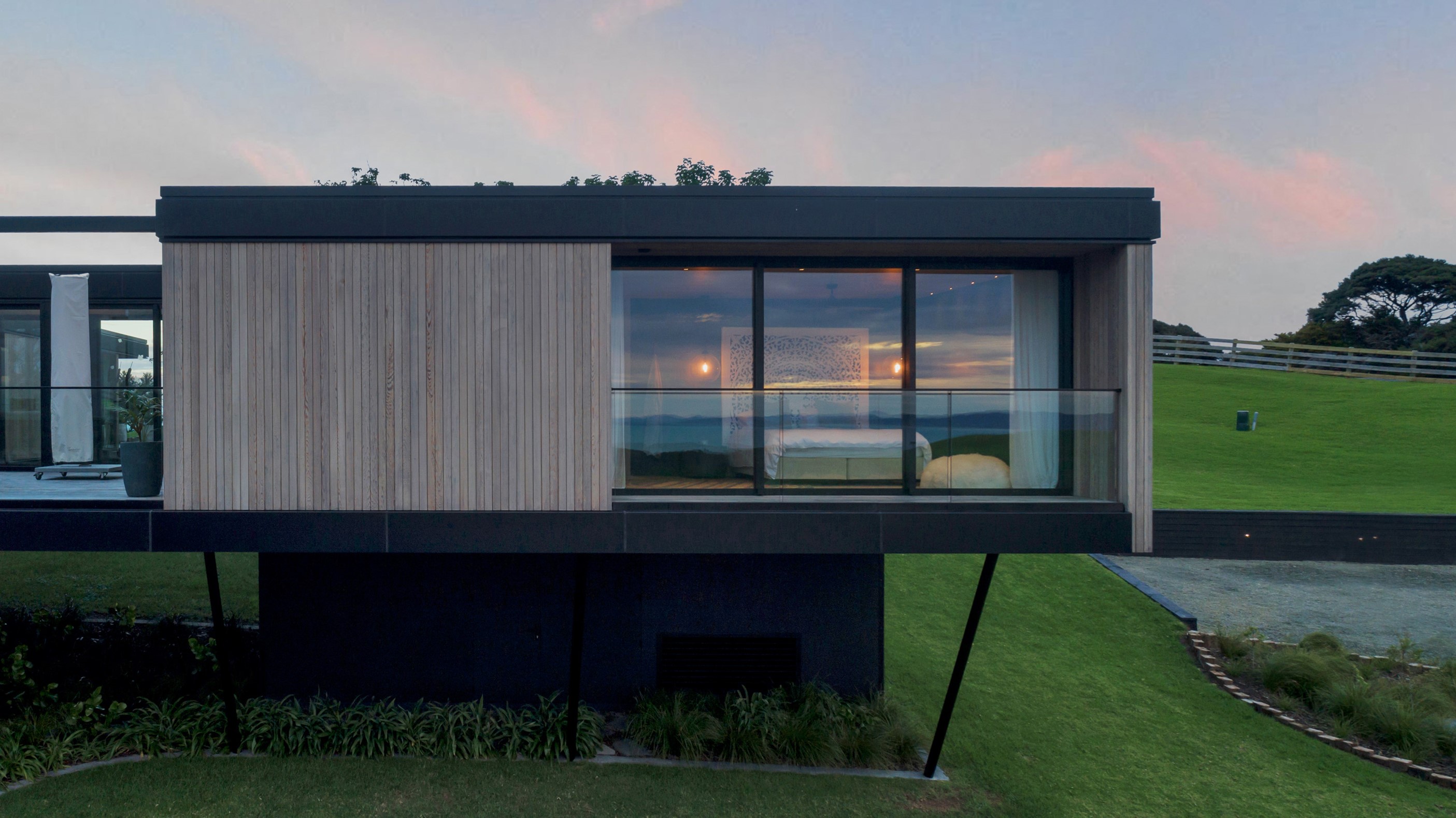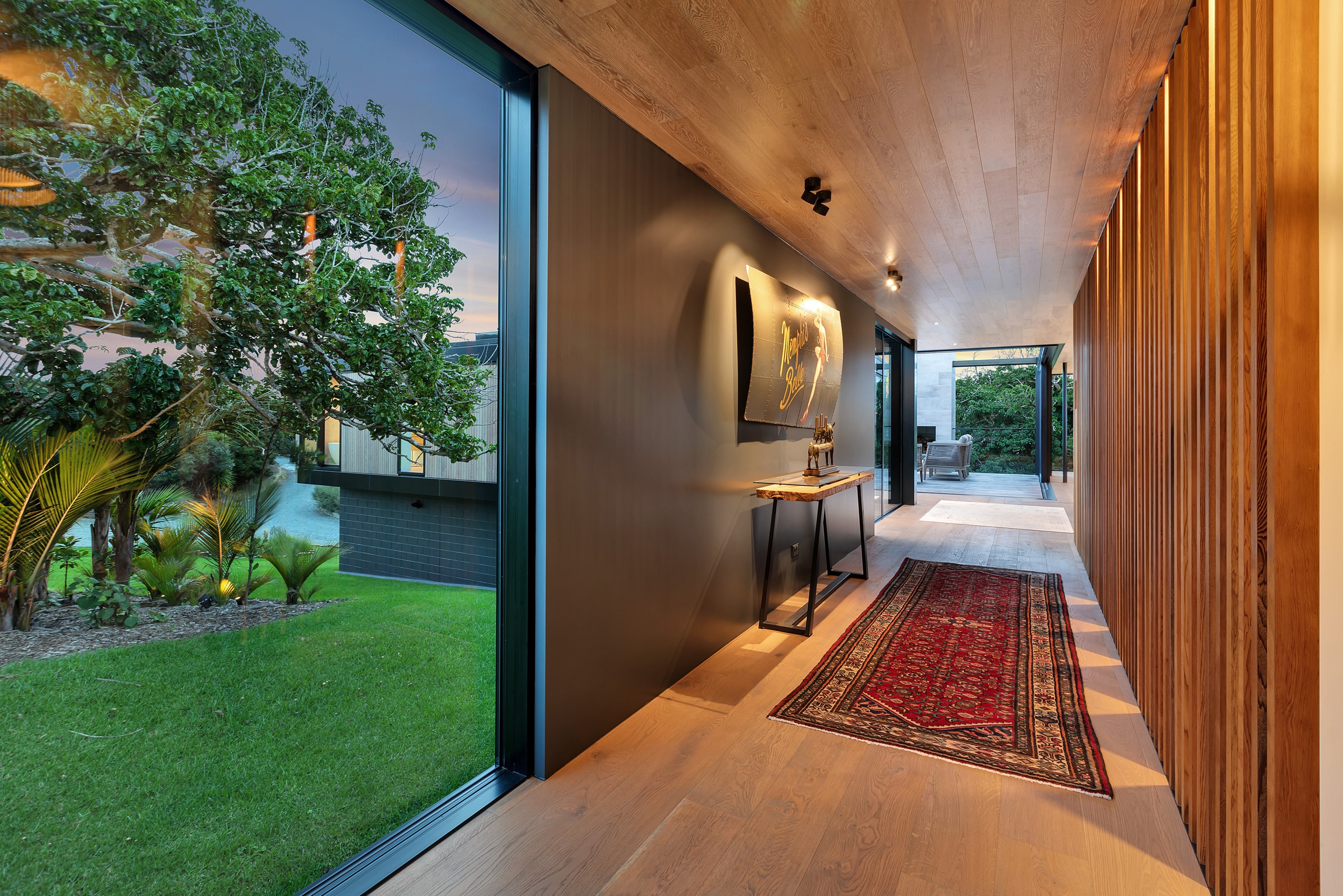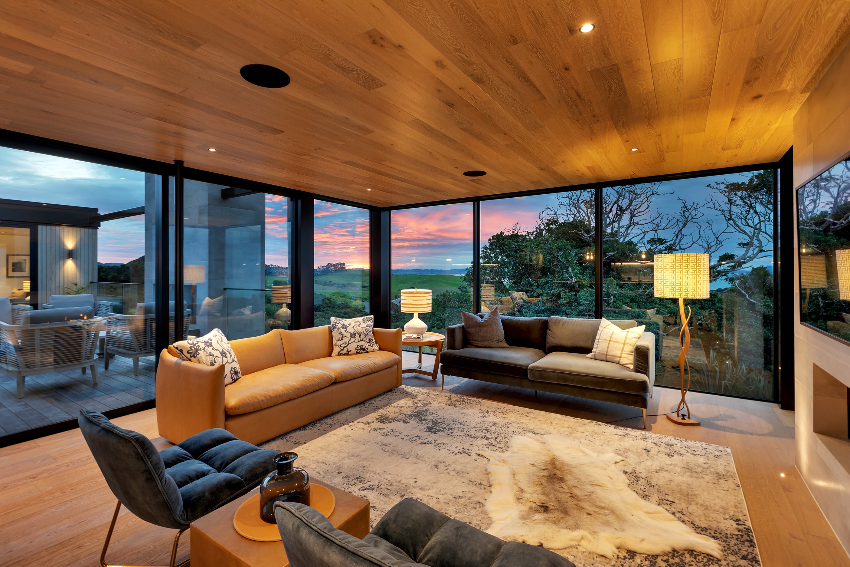 It started with a sprawling puriri and finished with a mid-century-style home honouring the tree with its rangy limbs and prolific red flowers. Yes, the 312sqm coastal home takes in grandstand views of the Pacific, but the owners also wanted it to respect its gnarled companion – a beautiful reminder of what was there first. The owners also wanted a low-profile contemporary home with sharp angles and clean lines, softened by cantilevering and landscaping curves. The two separate wings of the three-bedroom, two-bathroom house evoke a feeling of floating, or of reaching out into surrounding nature. Guests in the east wing are treated to wide ocean vistas, while the main-bedroom wing frames Northland’s rural splendour. A glazed hallway between showcases a spacious outdoor entertaining area with inbuilt fireplace on one side and the puriri and juvenile nīkau palms – magnificent when lit up at night – on the other. Timber ceilings, floors and features ground the interior and connect it with what’s outside. You’ll also find a media room, three bathrooms and a double garage. Special.
