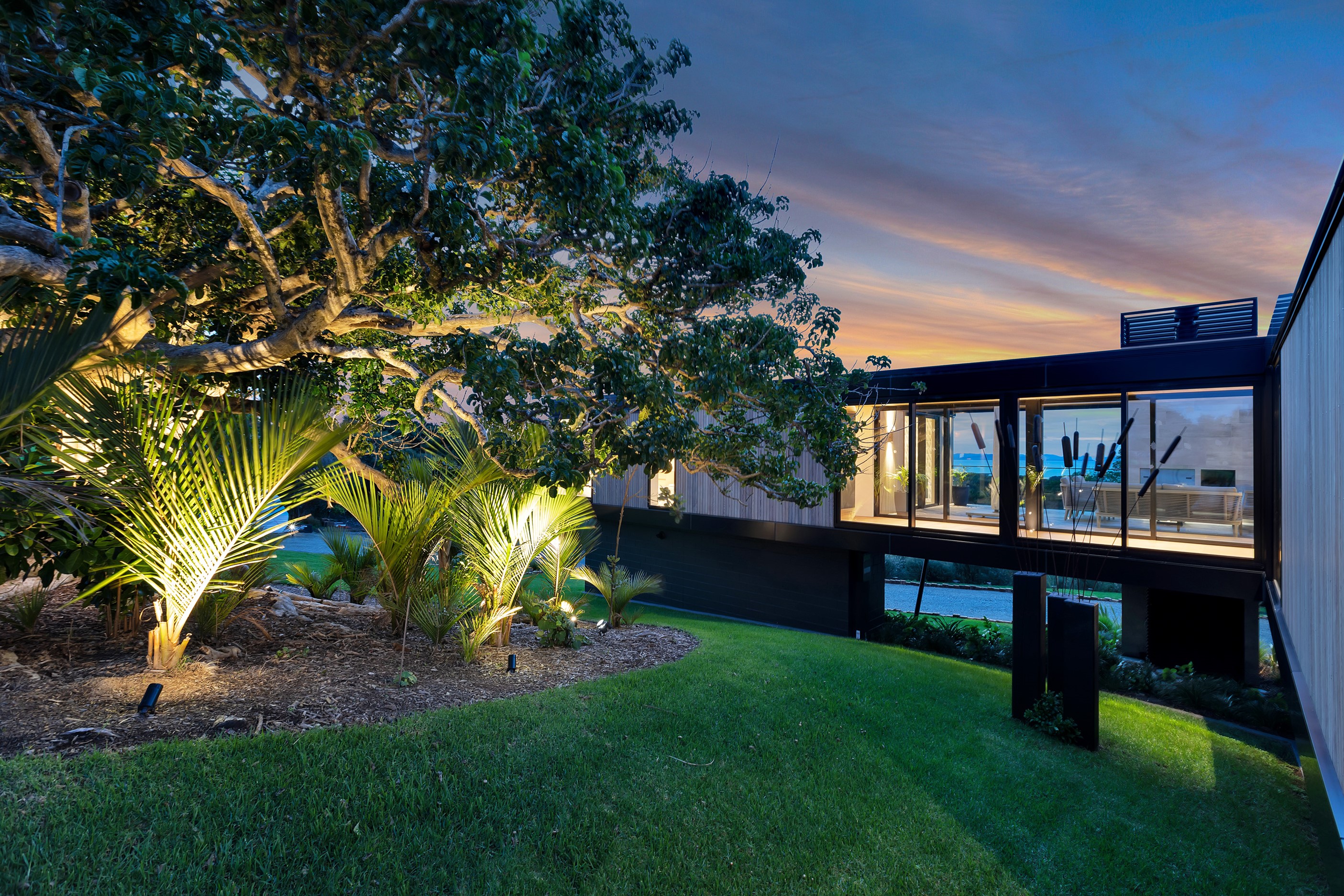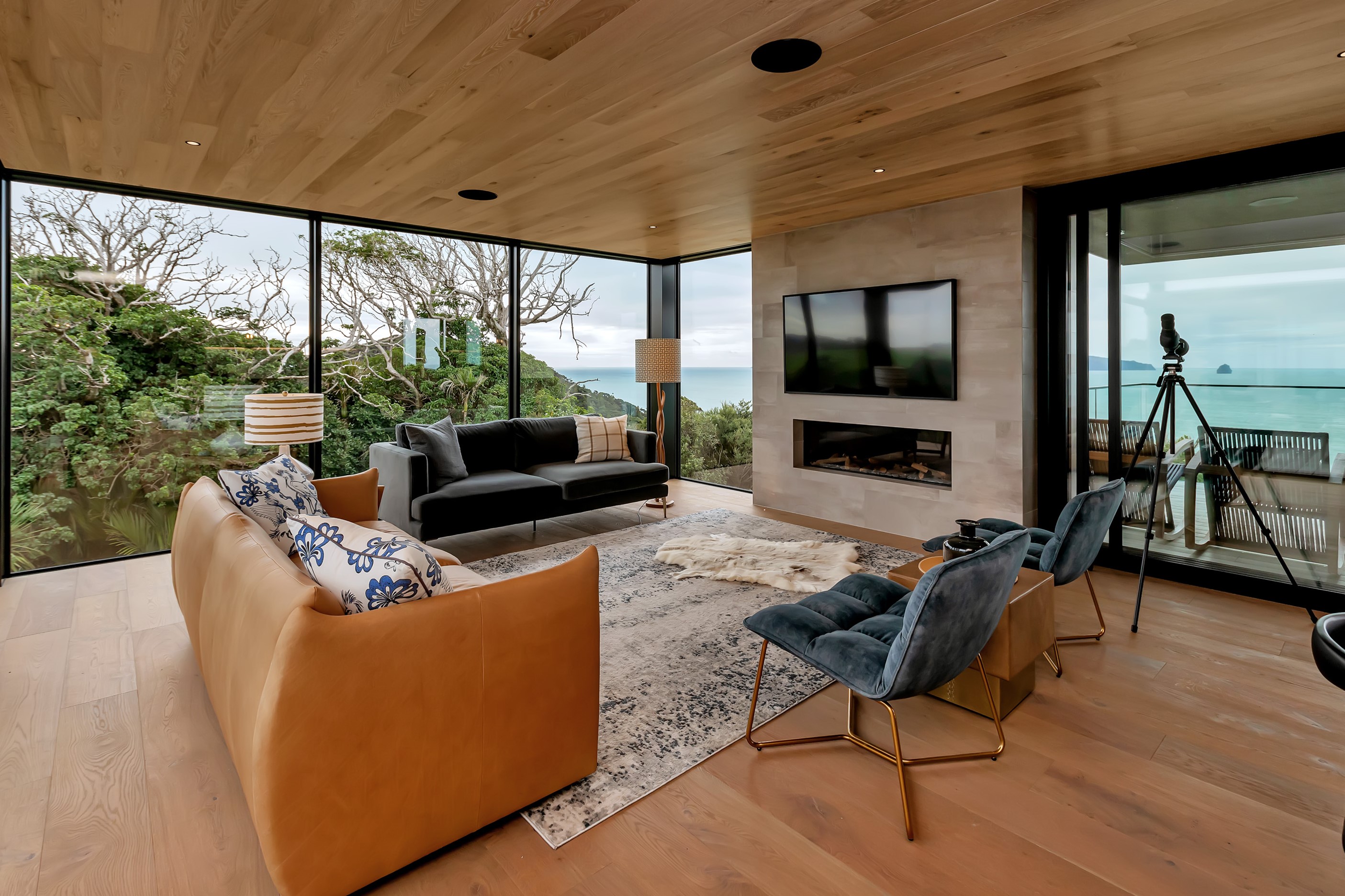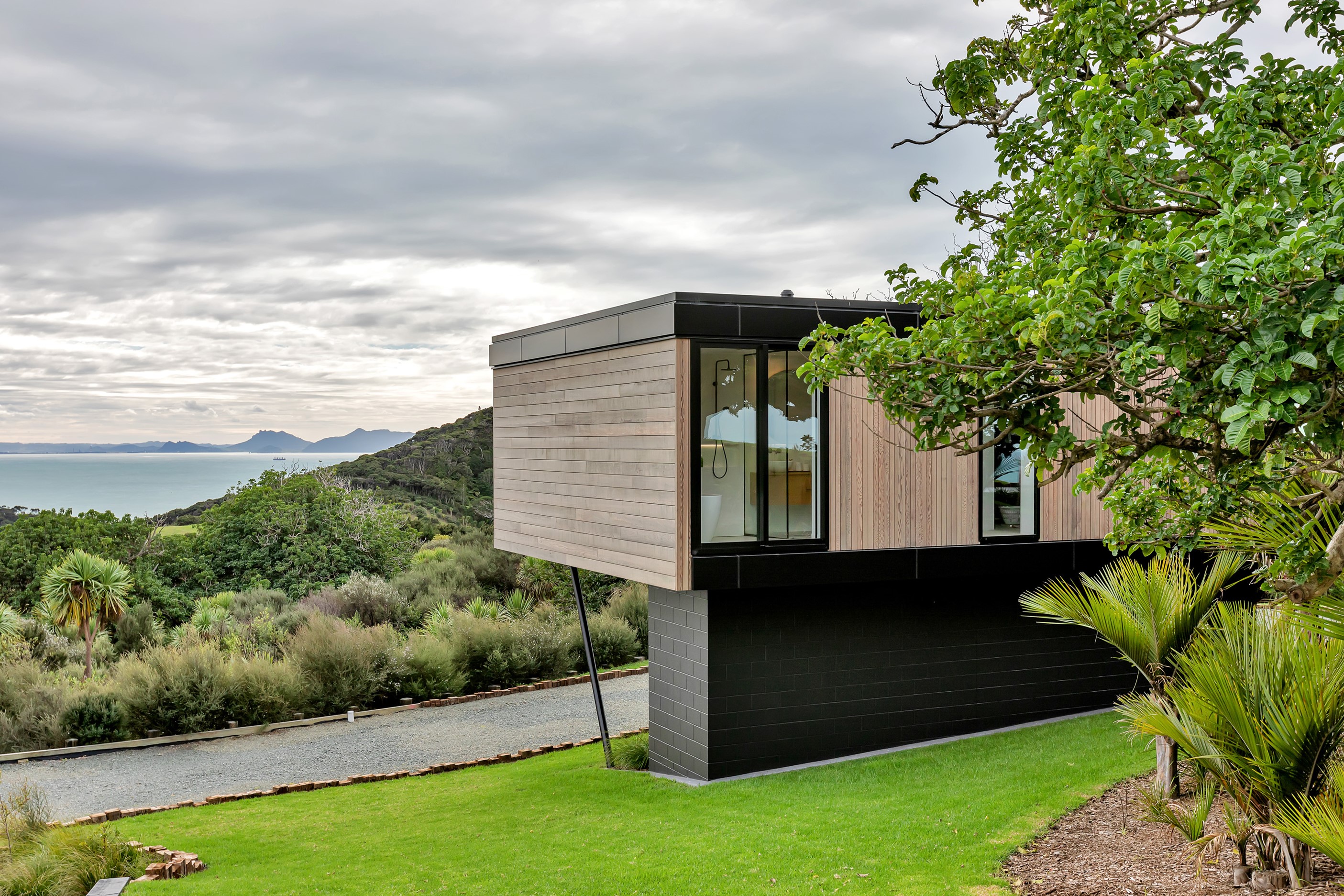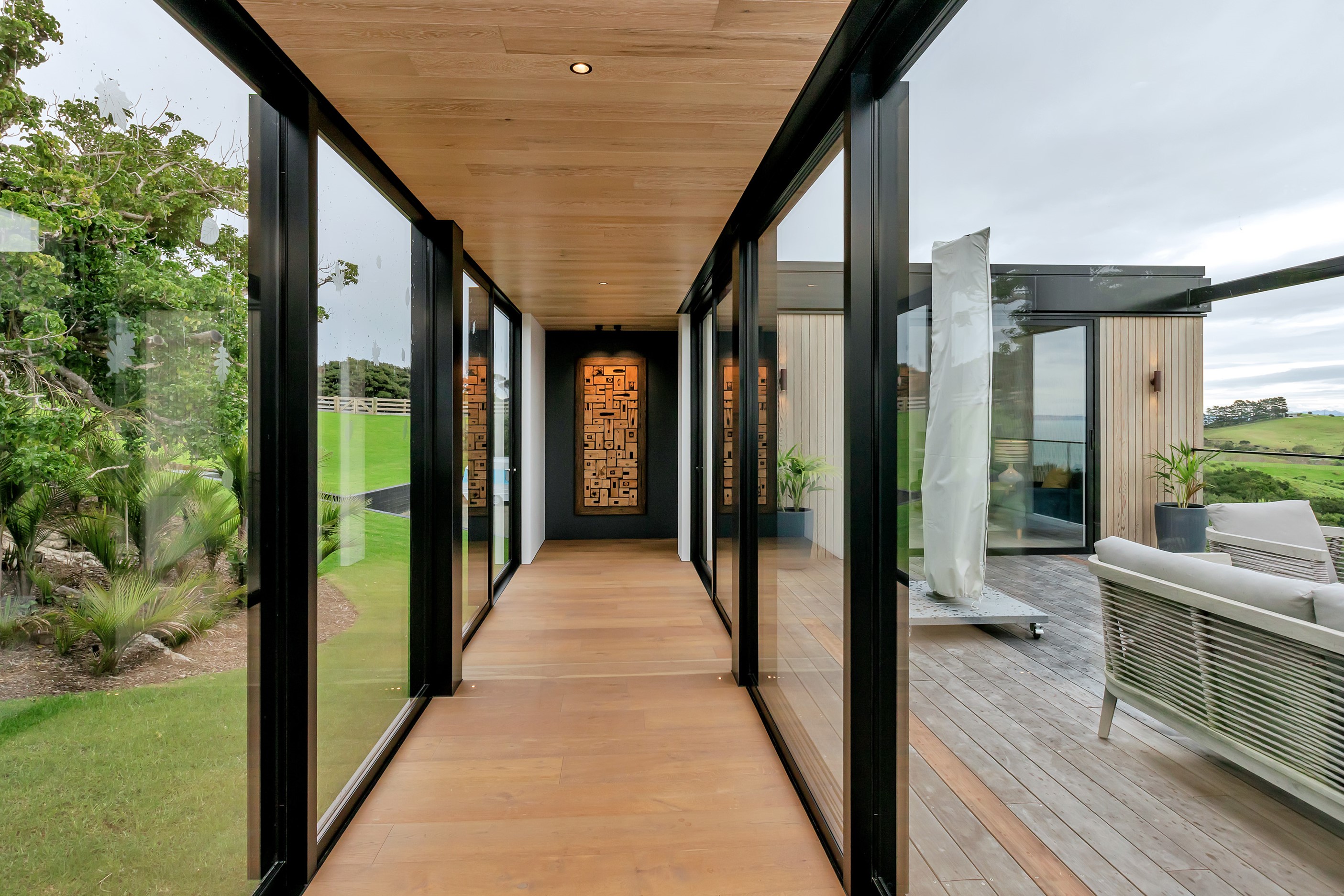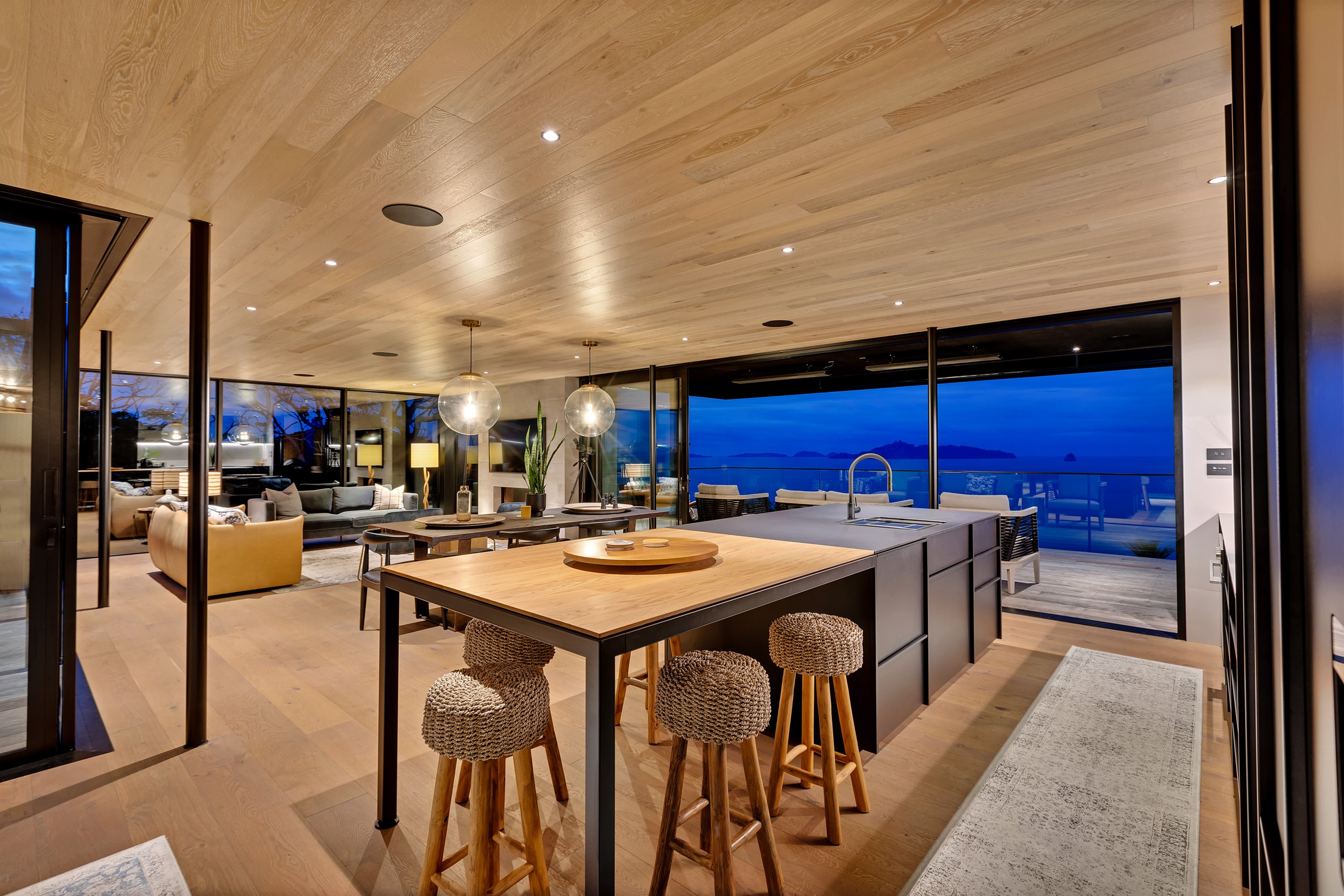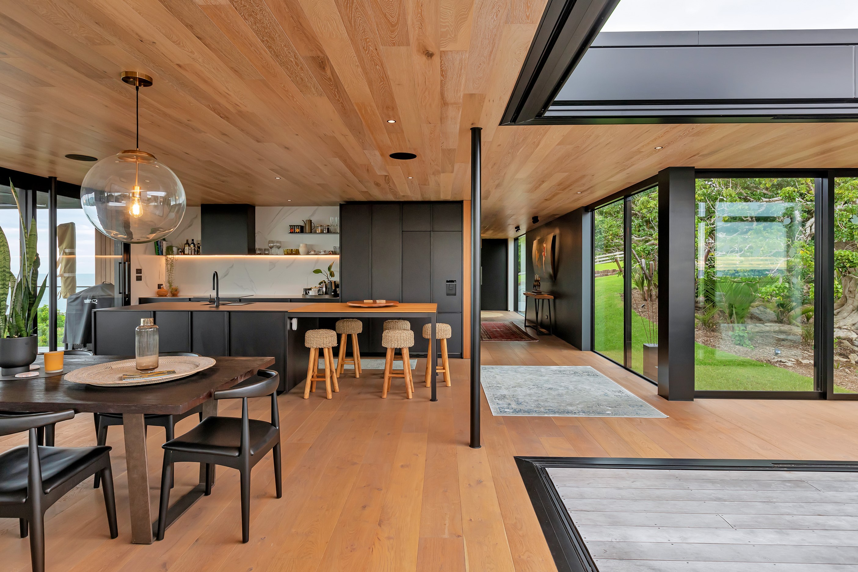 It started with a sprawling puriri and finished with a mid-century-style home honouring the tree with its rangy limbs and prolific red flowers. Yes, the 312sqm coastal home takes in grandstand views of the Pacific, but the owners also wanted it to respect its gnarled companion – a beautiful reminder of what was there first. The owners also wanted a low-profile contemporary home with sharp angles and clean lines, softened by cantilevering and landscaping curves. The two separate wings of the three-bedroom, two-bathroom house evoke a feeling of floating, or of reaching out into surrounding nature. Guests in the east wing are treated to wide ocean vistas, while the main-bedroom wing frames Northland’s rural splendour. A glazed hallway between showcases a spacious outdoor entertaining area with inbuilt fireplace on one side and the puriri and juvenile nīkau palms – magnificent when lit up at night – on the other. Timber ceilings, floors and features ground the interior and connect it with what’s outside. You’ll also find a media room, three bathrooms and a double garage. Special.