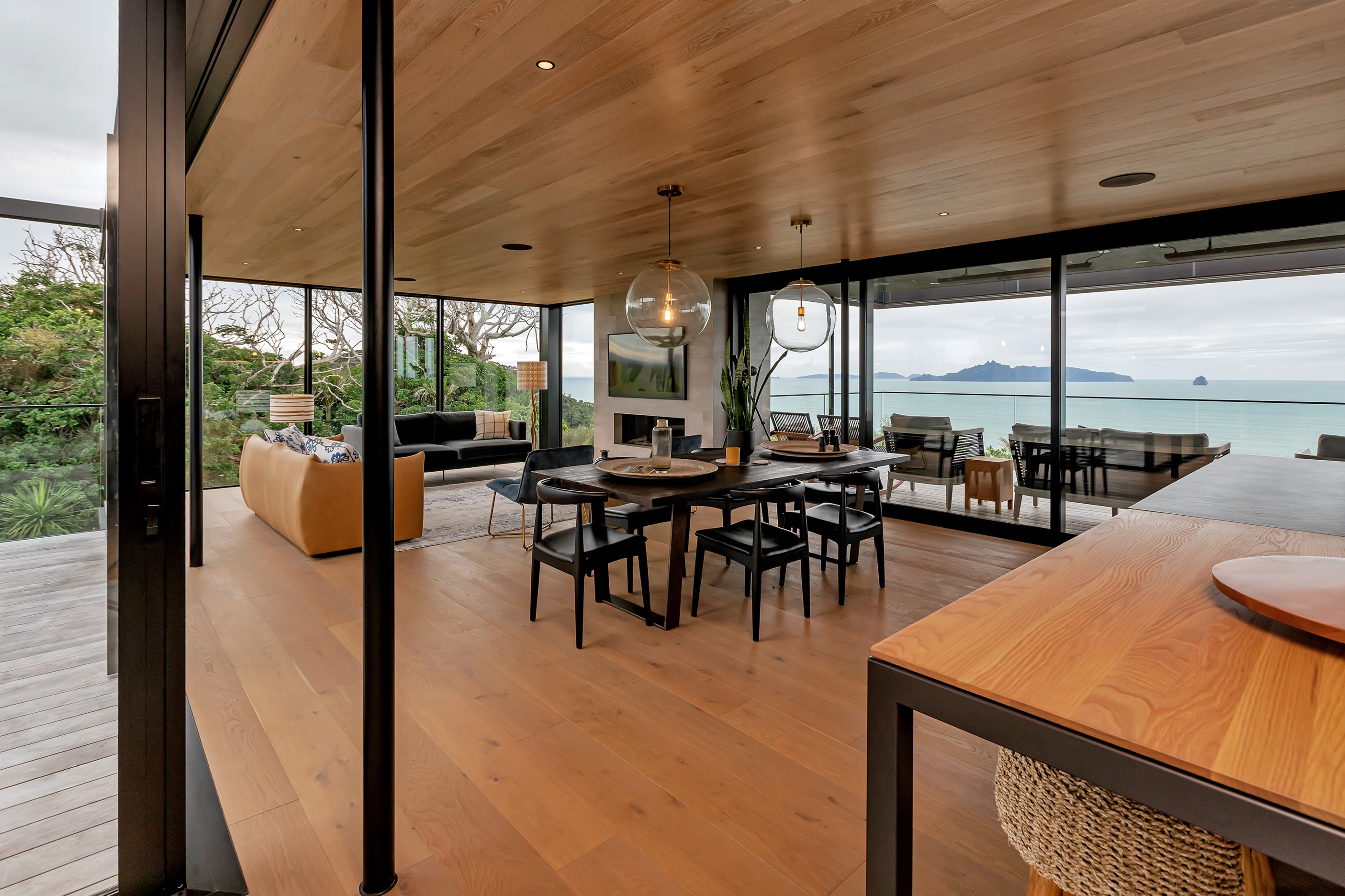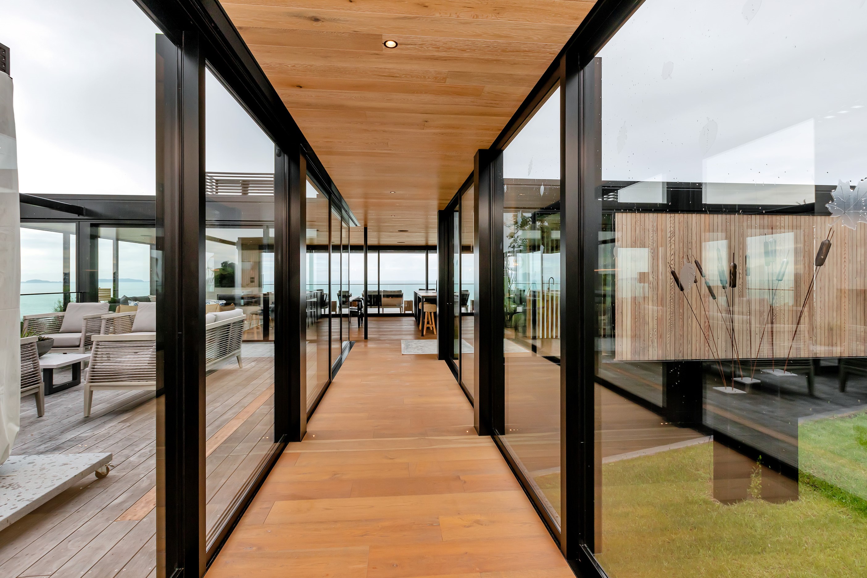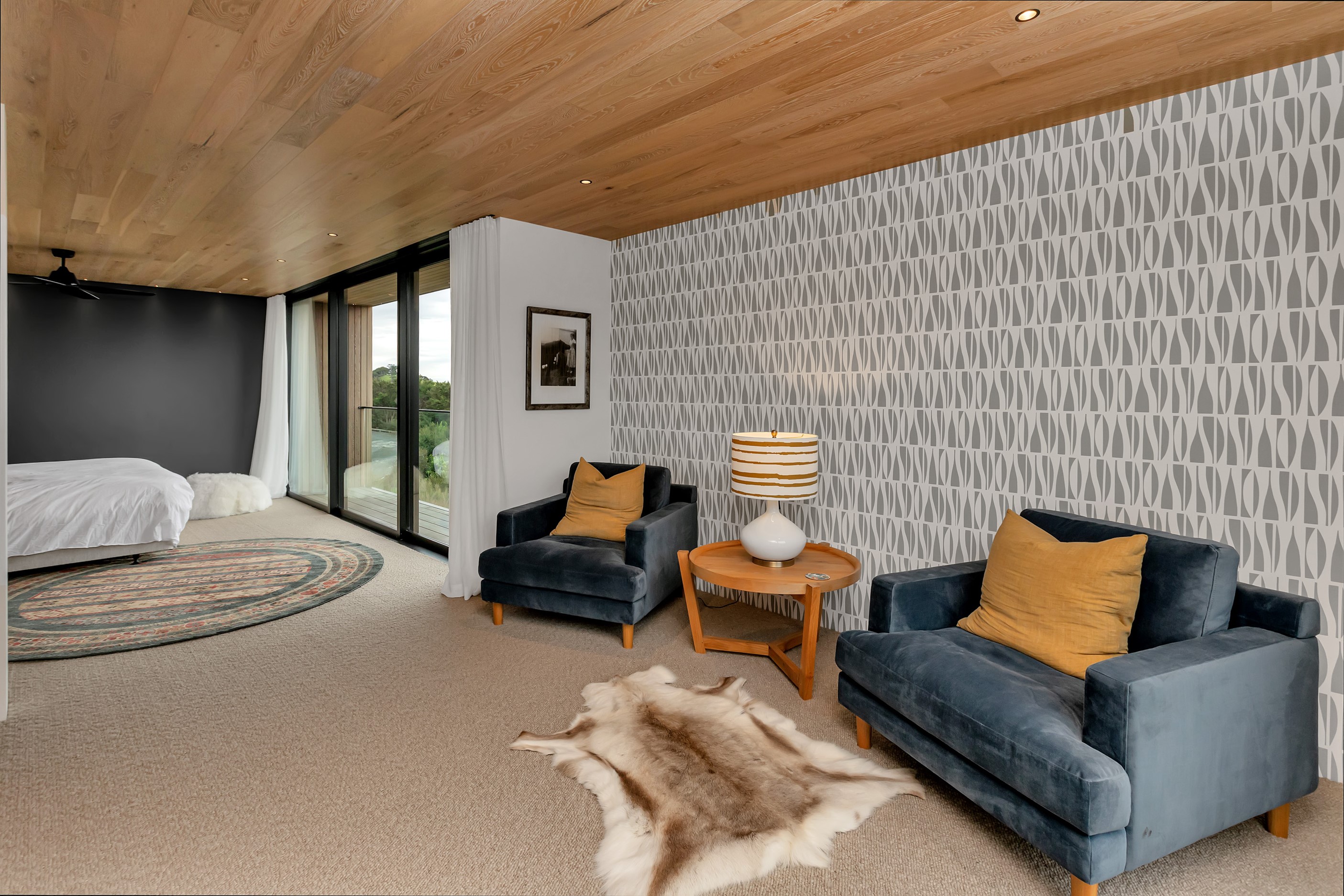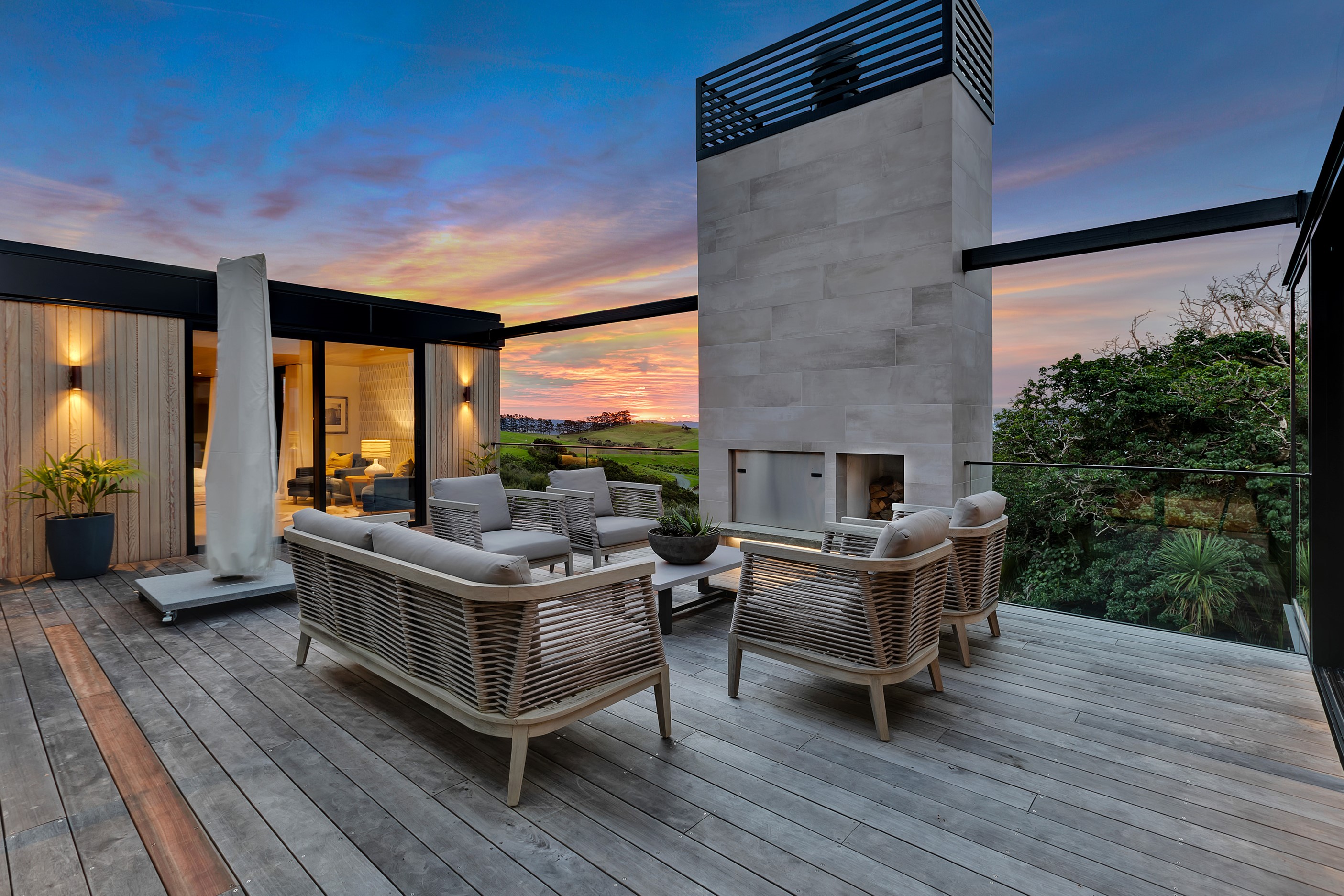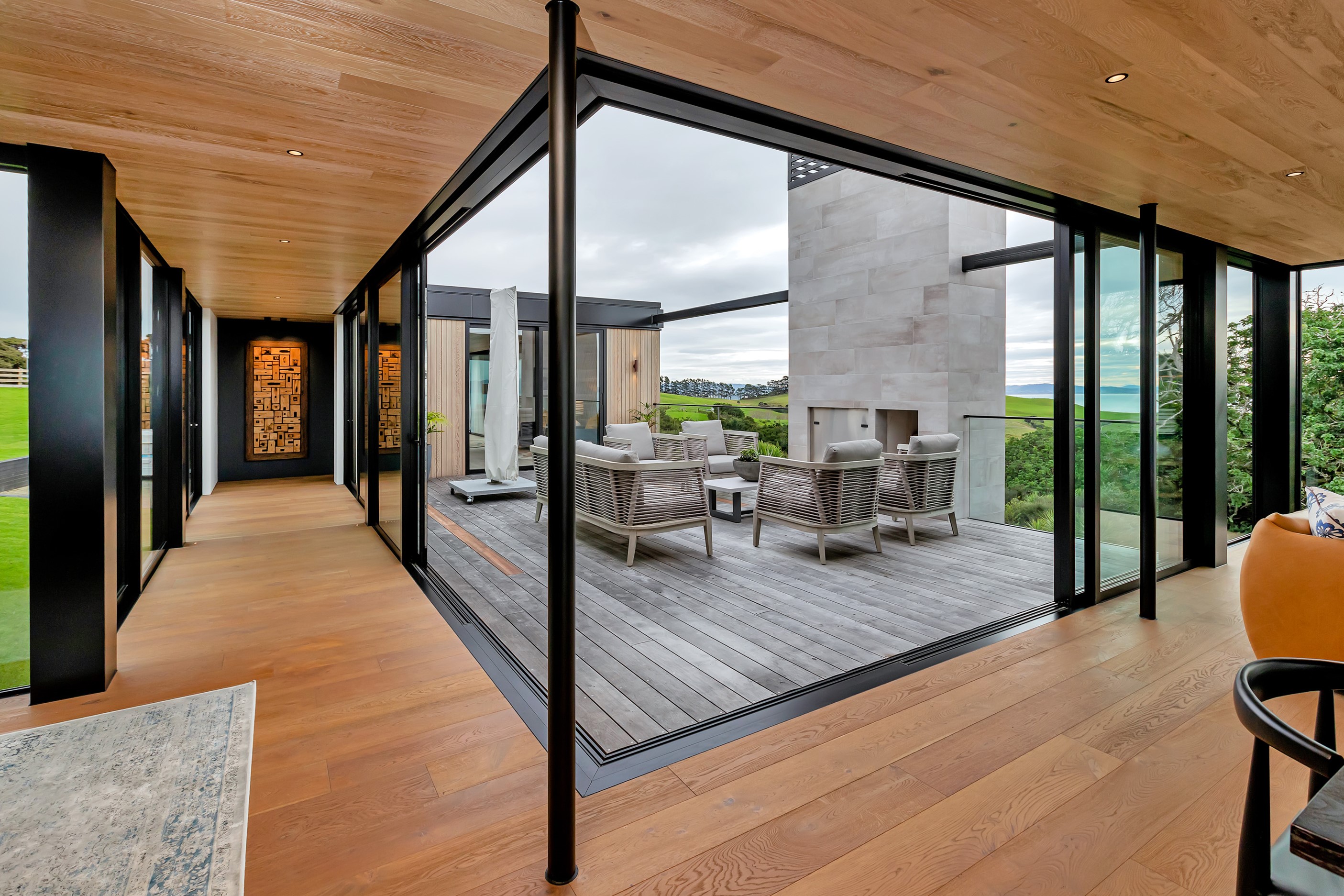 It started with a sprawling puriri and finished with a mid-century-style home honouring the tree with its rangy limbs and prolific red flowers. Yes, the 312sqm coastal home takes in grandstand views of the Pacific, but the owners also wanted it to respect its gnarled companion – a beautiful reminder of what was there first. The owners also wanted a low-profile contemporary home with sharp angles and clean lines, softened by cantilevering and landscaping curves. The two separate wings of the three-bedroom, two-bathroom house evoke a feeling of floating, or of reaching out into surrounding nature. Guests in the east wing are treated to wide ocean vistas, while the main-bedroom wing frames Northland’s rural splendour. A glazed hallway between showcases a spacious outdoor entertaining area with inbuilt fireplace on one side and the puriri and juvenile nīkau palms – magnificent when lit up at night – on the other. Timber ceilings, floors and features ground the interior and connect it with what’s outside. You’ll also find a media room, three bathrooms and a double garage. Special.