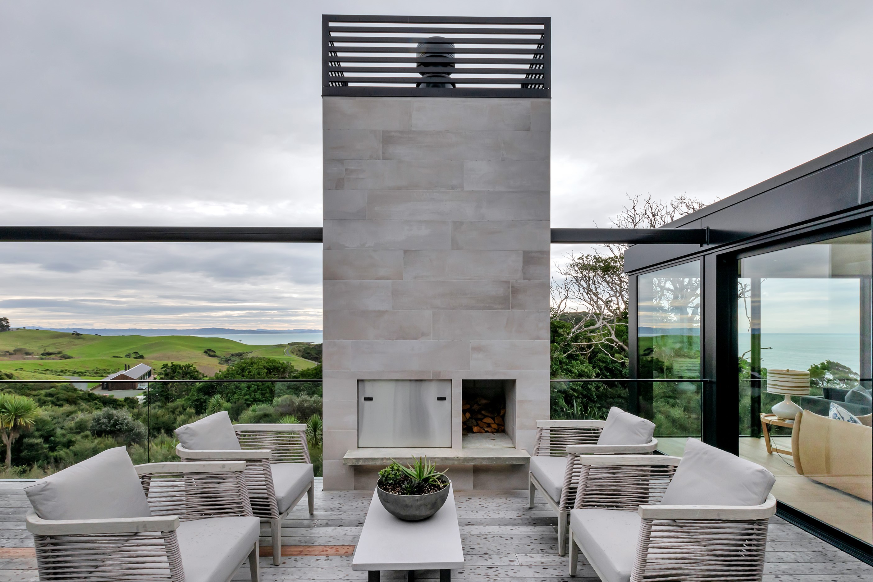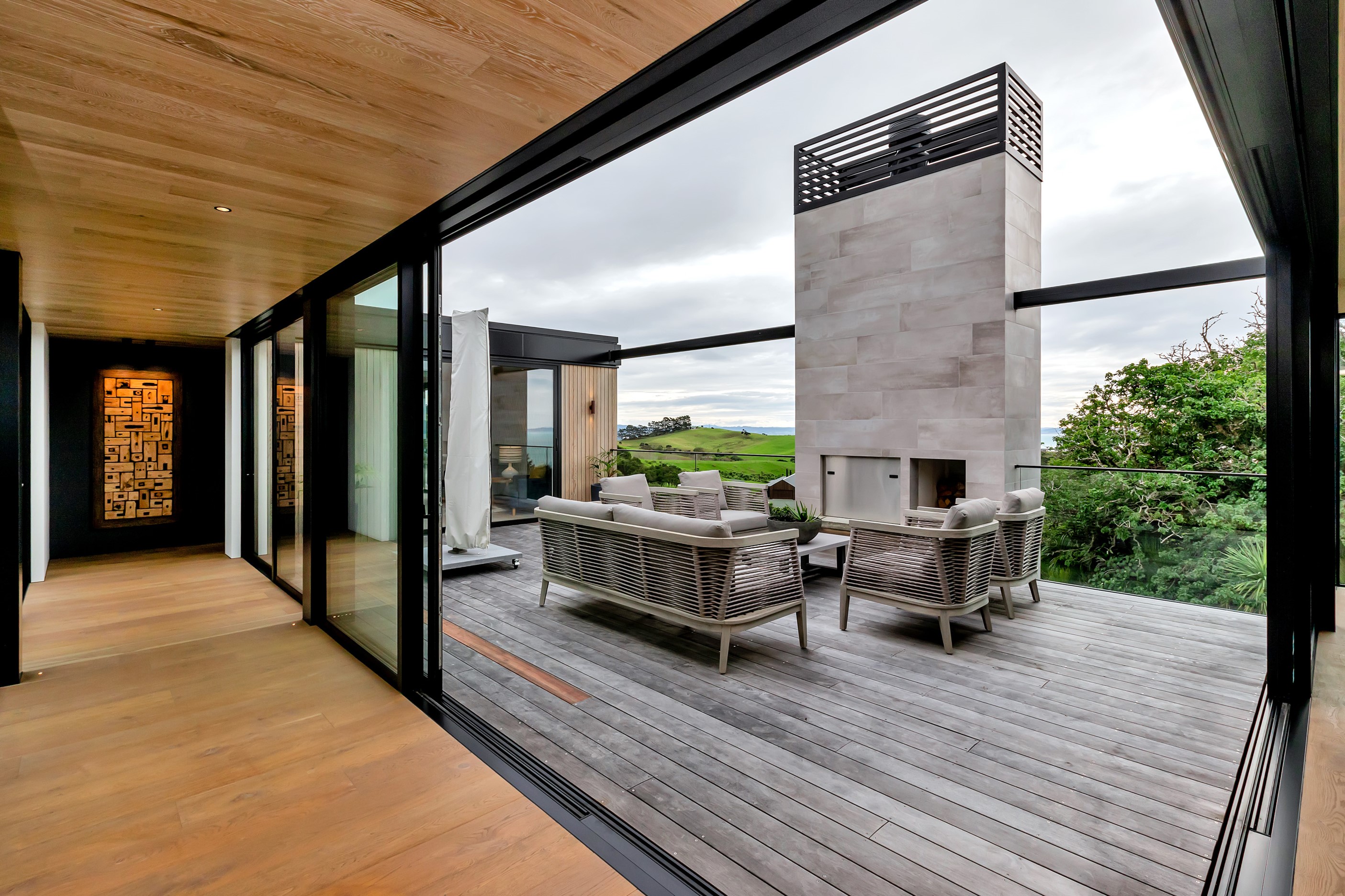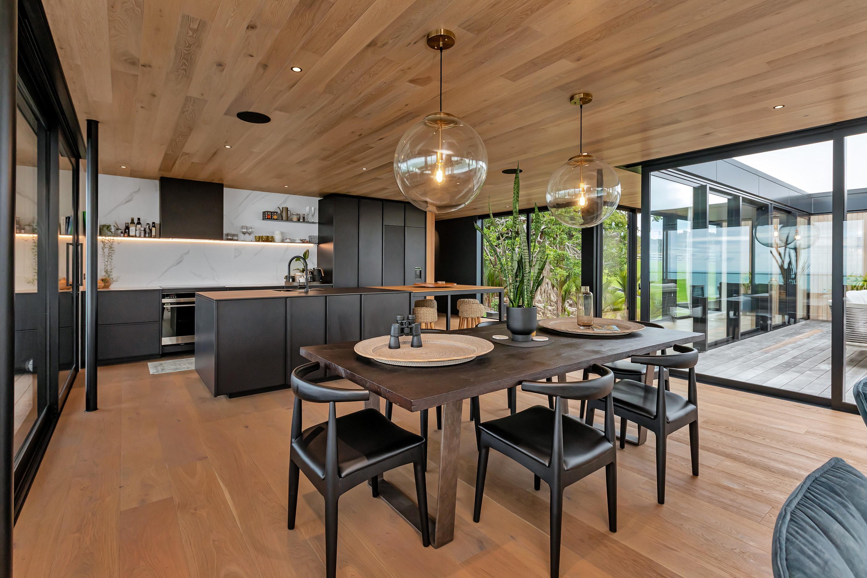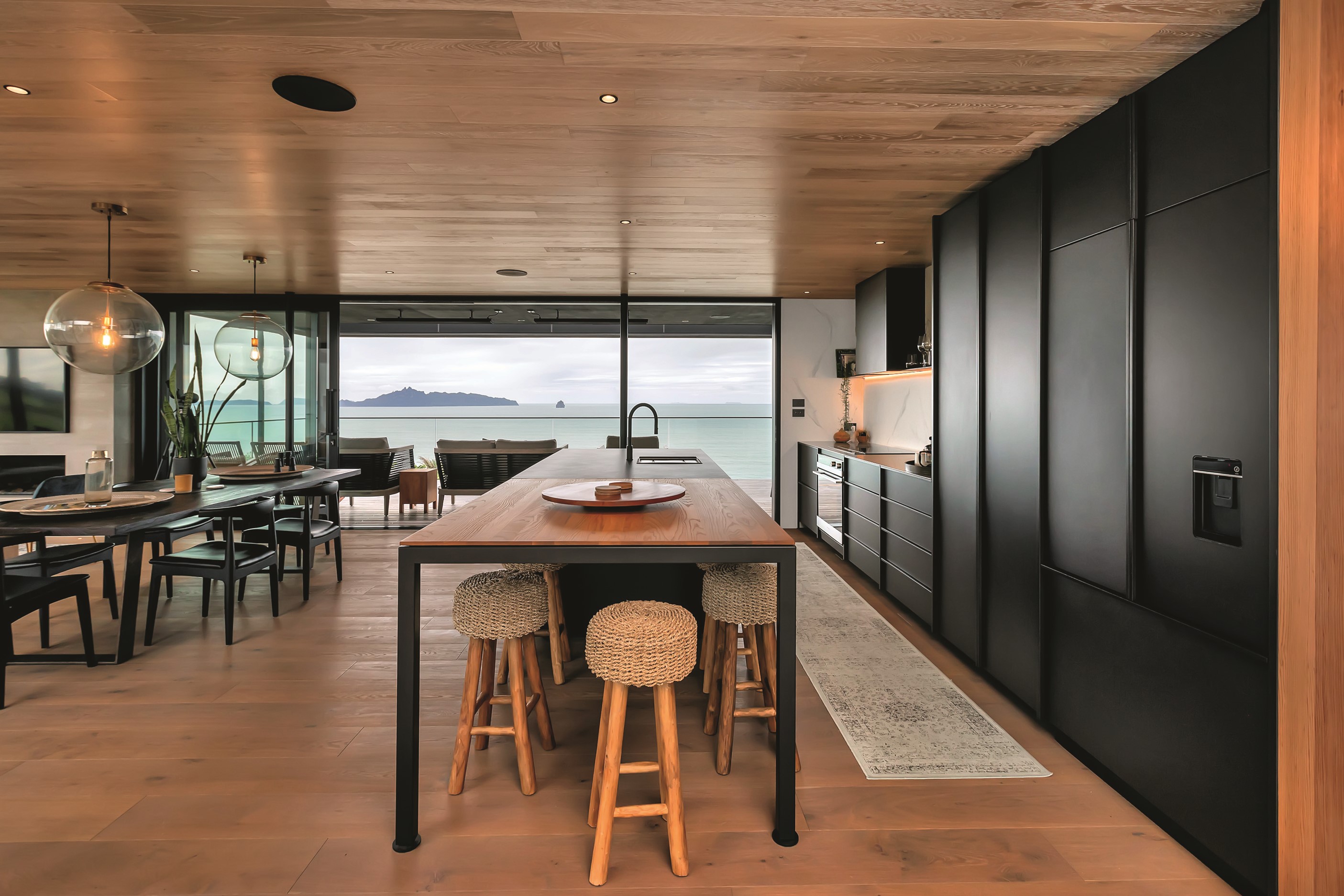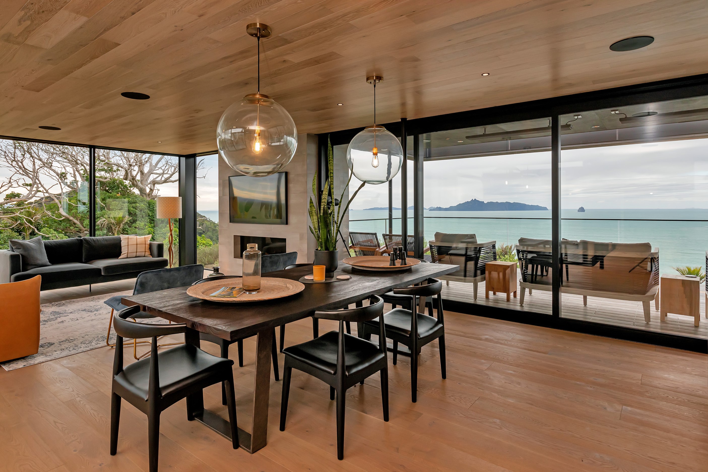 It started with a sprawling puriri and finished with a mid-century-style home honouring the tree with its rangy limbs and prolific red flowers. Yes, the 312sqm coastal home takes in grandstand views of the Pacific, but the owners also wanted it to respect its gnarled companion – a beautiful reminder of what was there first. The owners also wanted a low-profile contemporary home with sharp angles and clean lines, softened by cantilevering and landscaping curves. The two separate wings of the three-bedroom, two-bathroom house evoke a feeling of floating, or of reaching out into surrounding nature. Guests in the east wing are treated to wide ocean vistas, while the main-bedroom wing frames Northland’s rural splendour. A glazed hallway between showcases a spacious outdoor entertaining area with inbuilt fireplace on one side and the puriri and juvenile nīkau palms – magnificent when lit up at night – on the other. Timber ceilings, floors and features ground the interior and connect it with what’s outside. You’ll also find a media room, three bathrooms and a double garage. Special.