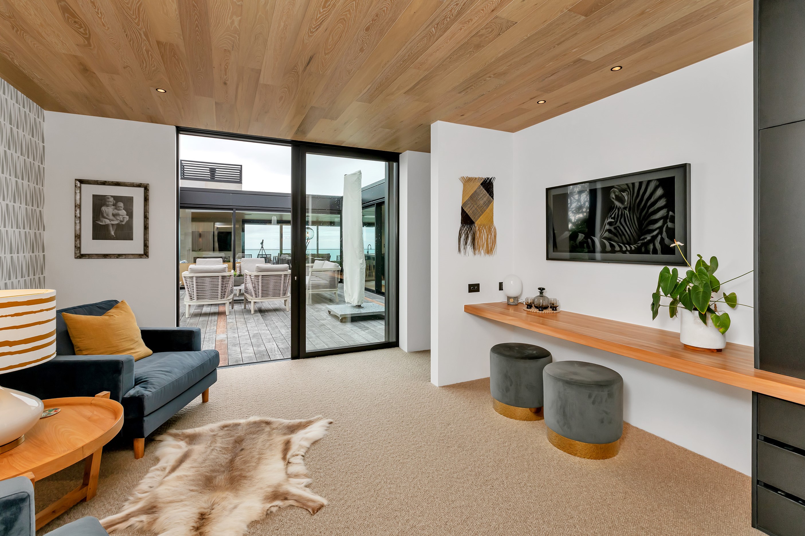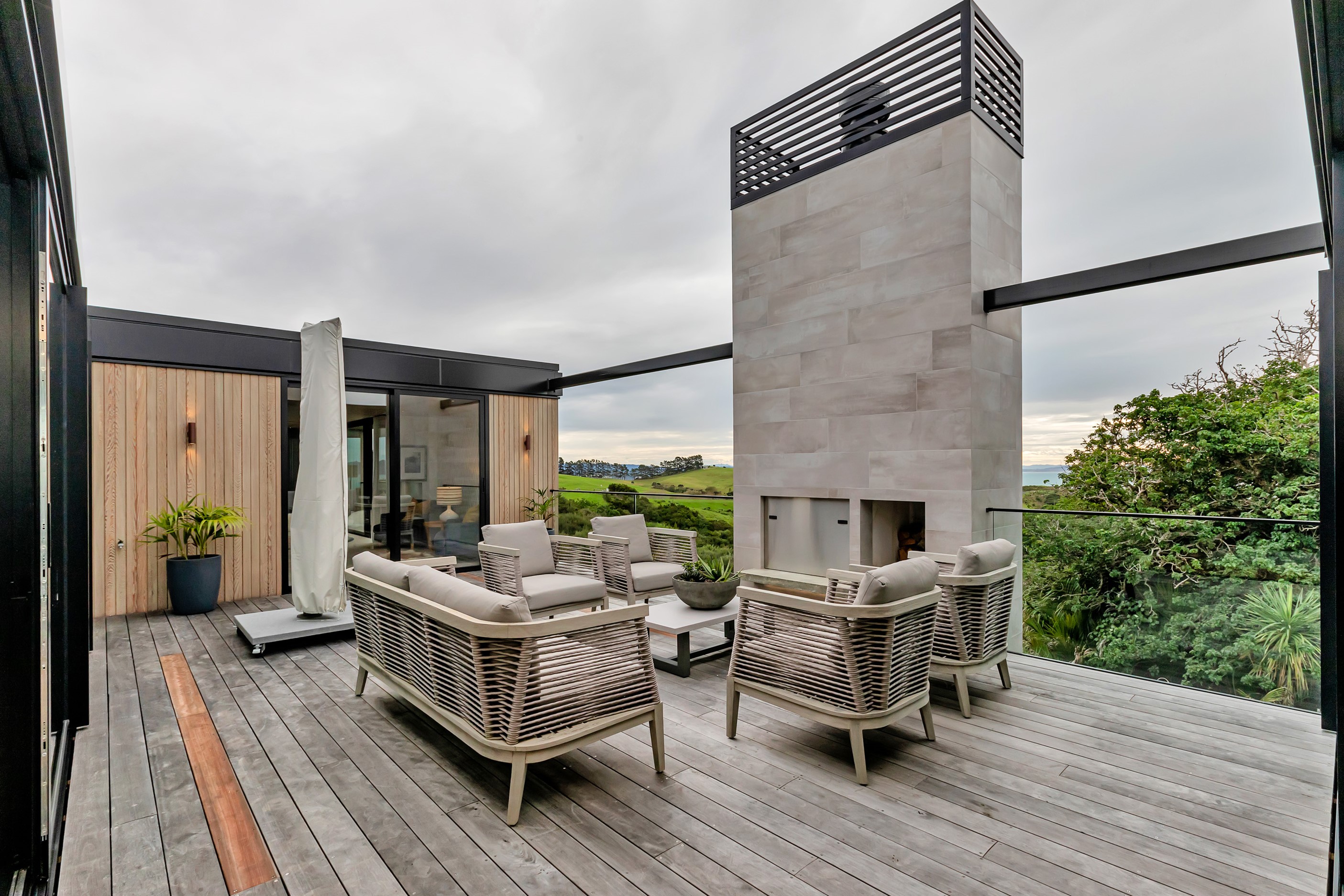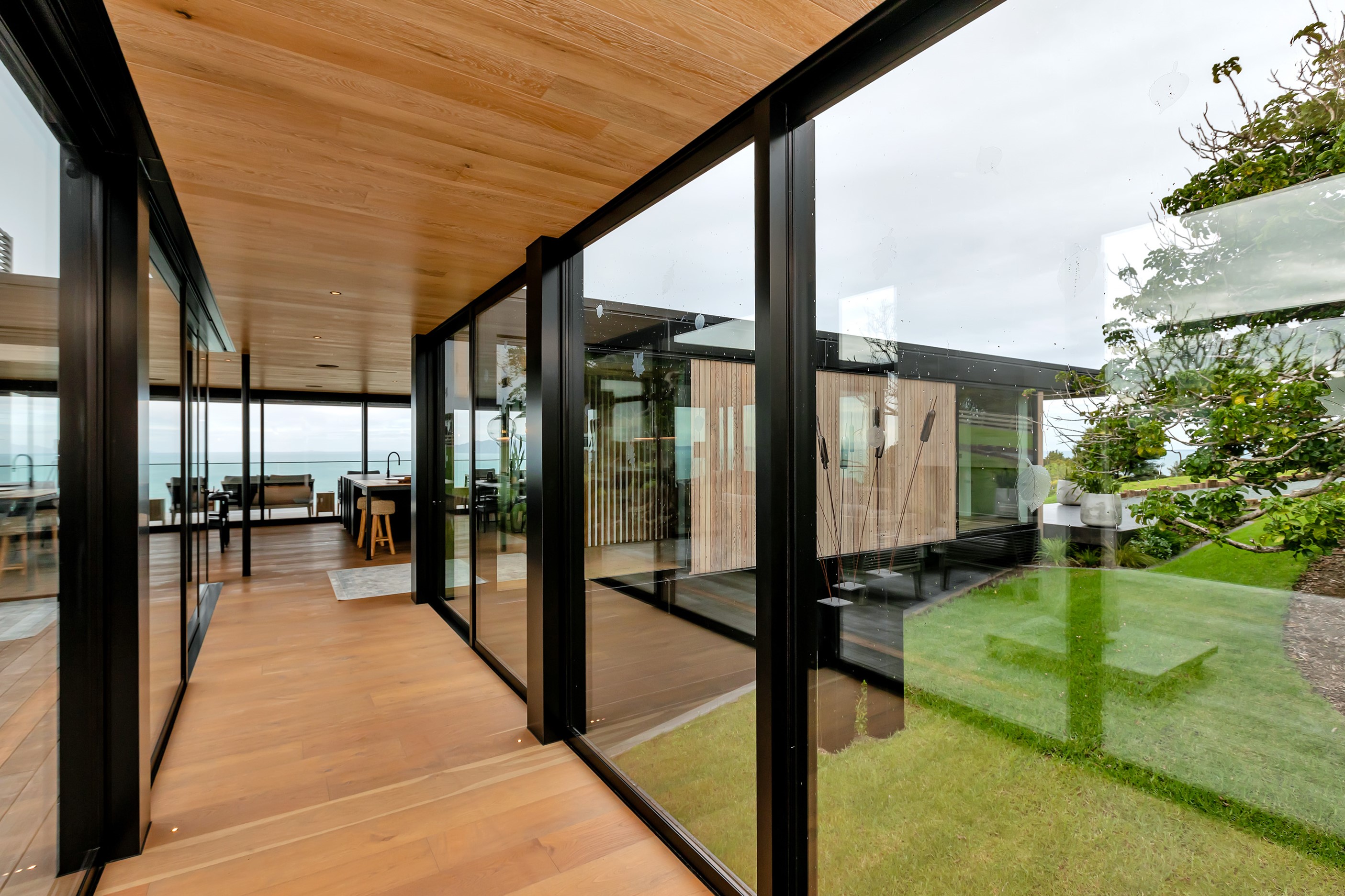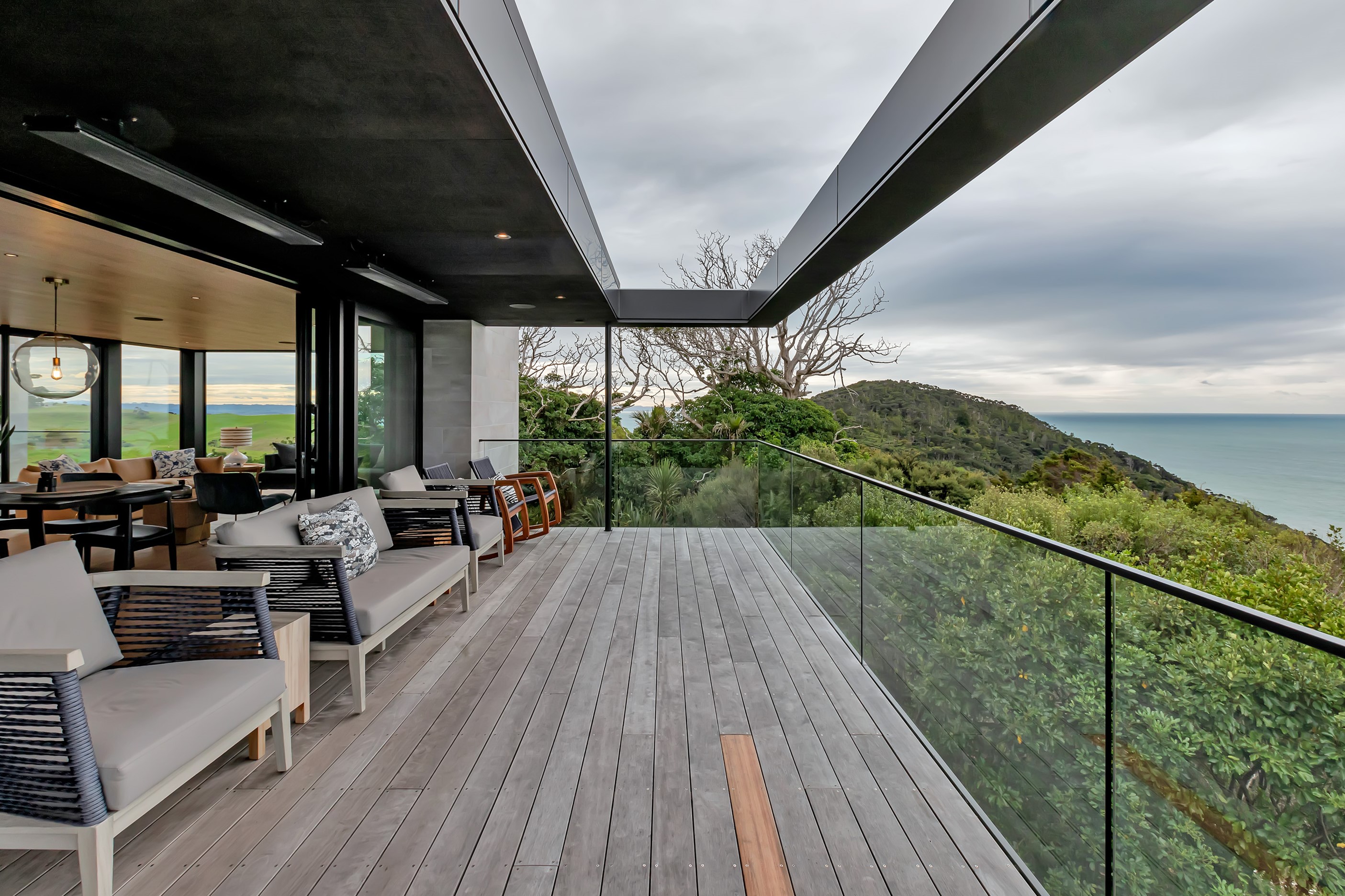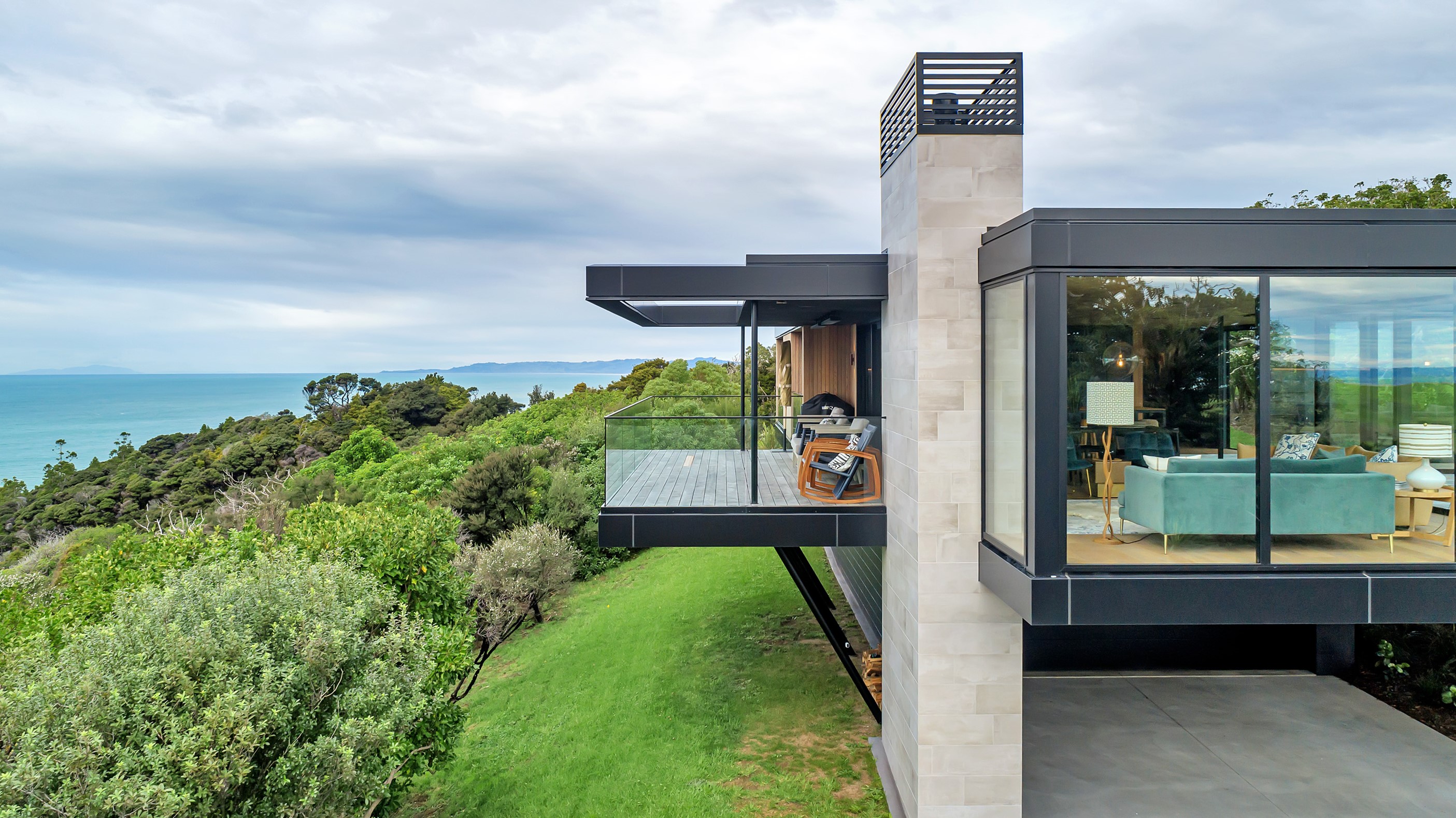 It started with a sprawling puriri and finished with a mid-century-style home honouring the tree with its rangy limbs and prolific red flowers. Yes, the 312sqm coastal home takes in grandstand views of the Pacific, but the owners also wanted it to respect its gnarled companion – a beautiful reminder of what was there first. The owners also wanted a low-profile contemporary home with sharp angles and clean lines, softened by cantilevering and landscaping curves. The two separate wings of the three-bedroom, two-bathroom house evoke a feeling of floating, or of reaching out into surrounding nature. Guests in the east wing are treated to wide ocean vistas, while the main-bedroom wing frames Northland’s rural splendour. A glazed hallway between showcases a spacious outdoor entertaining area with inbuilt fireplace on one side and the puriri and juvenile nīkau palms – magnificent when lit up at night – on the other. Timber ceilings, floors and features ground the interior and connect it with what’s outside. You’ll also find a media room, three bathrooms and a double garage. Special.
