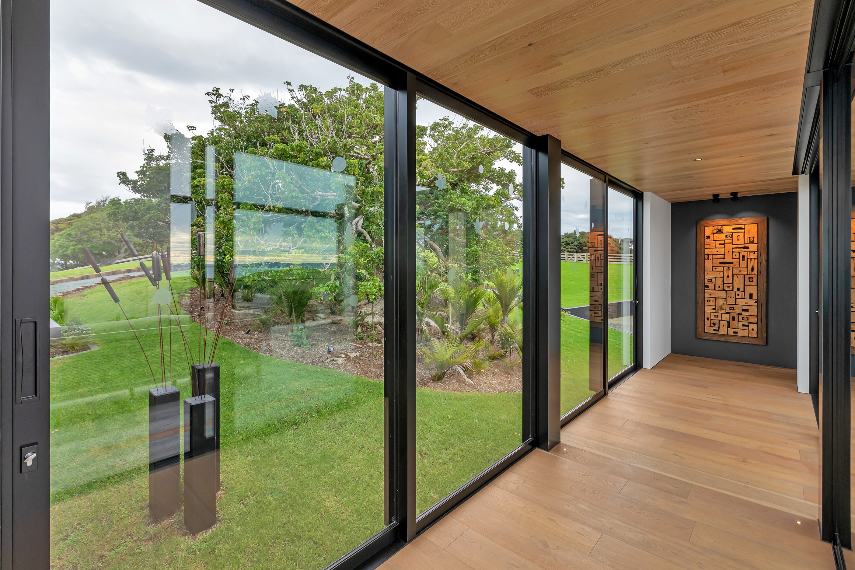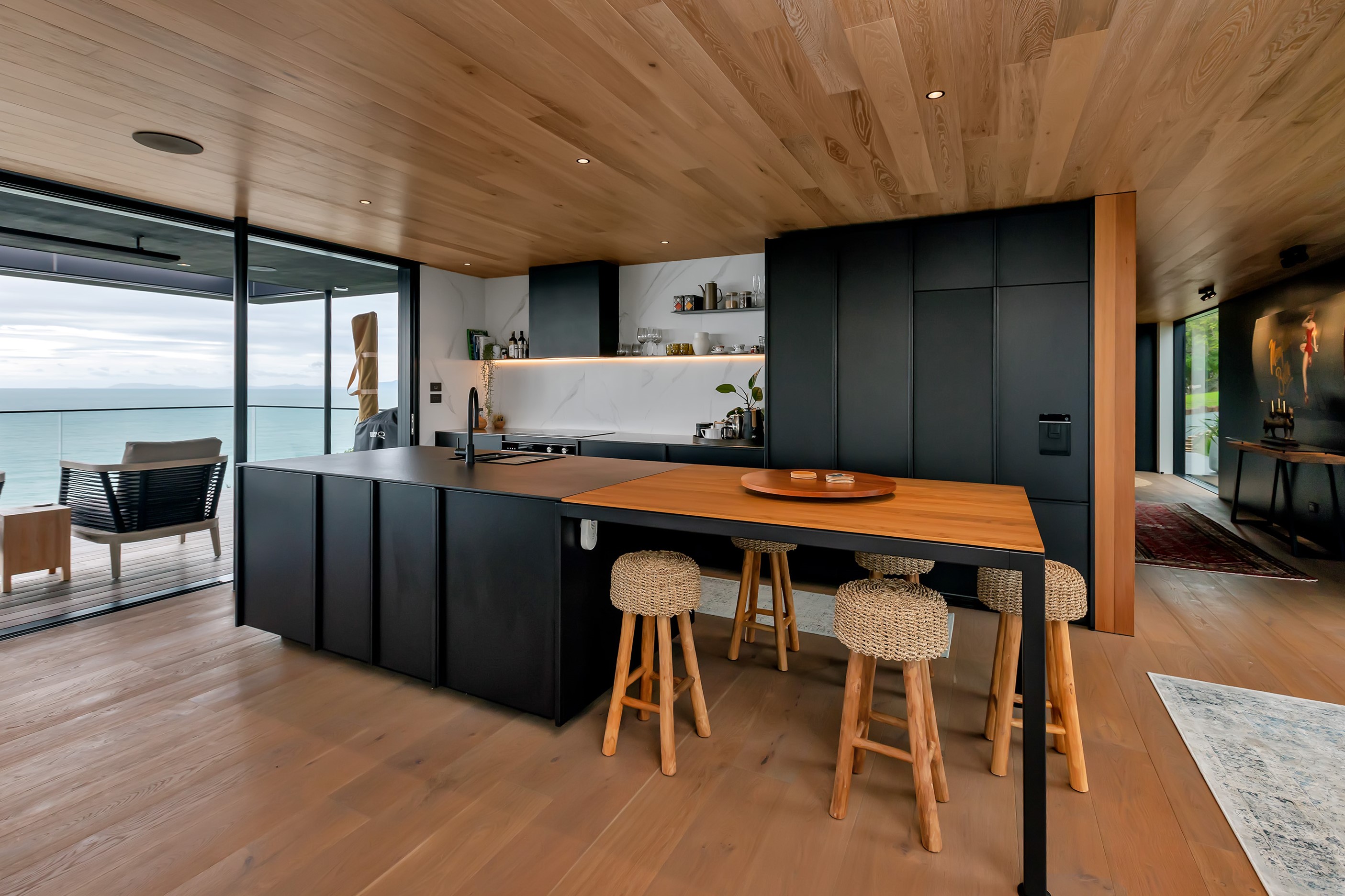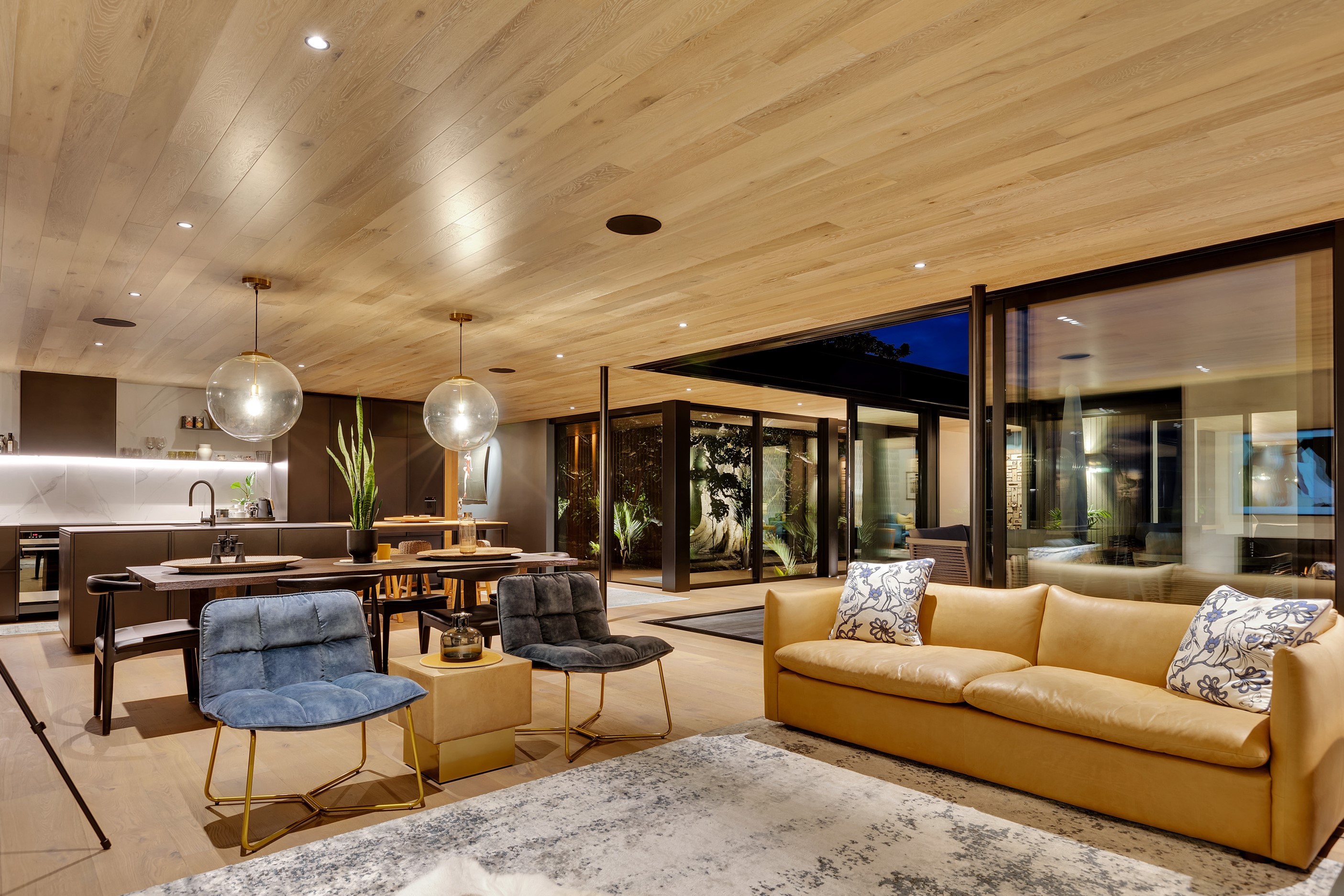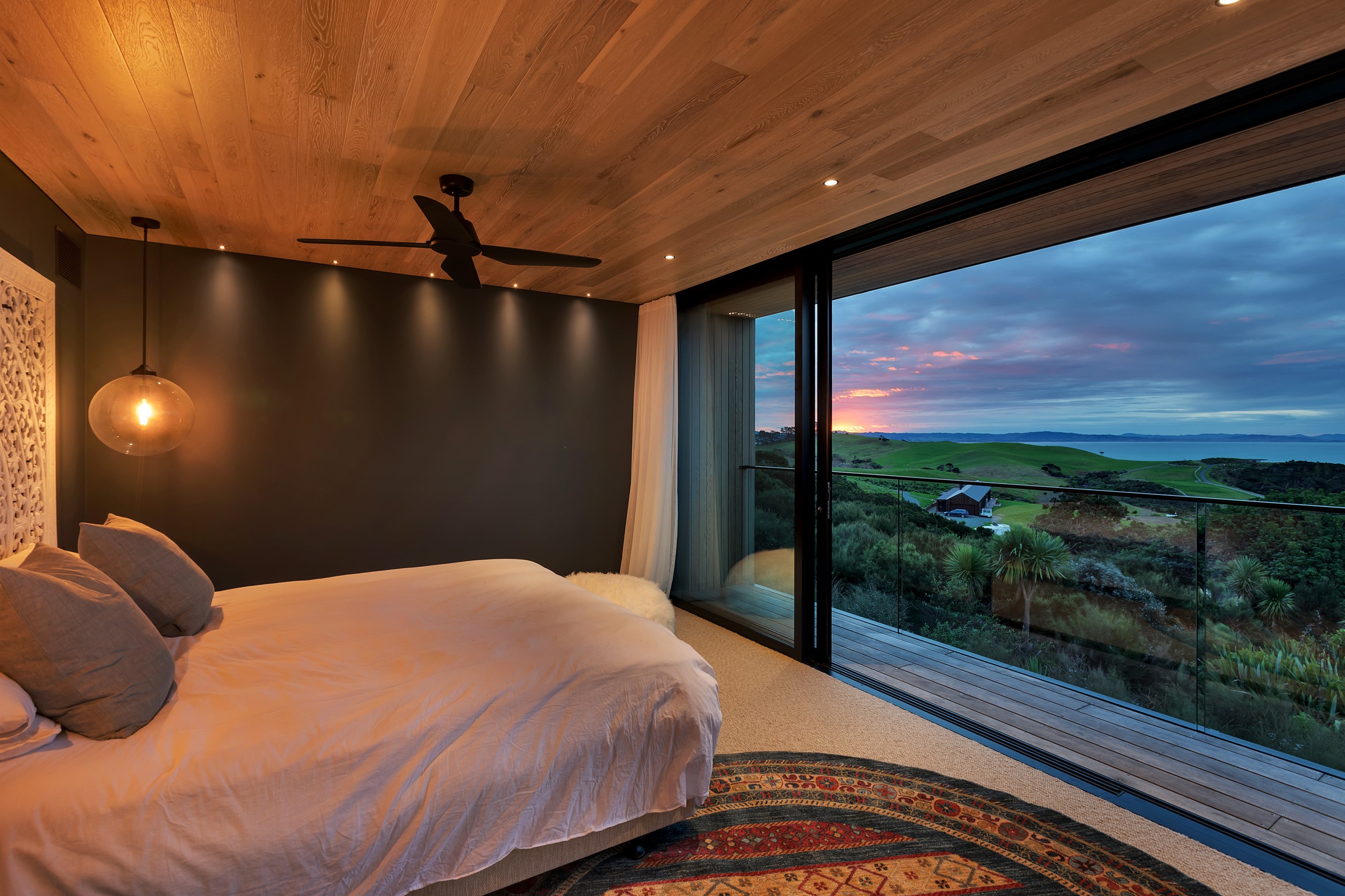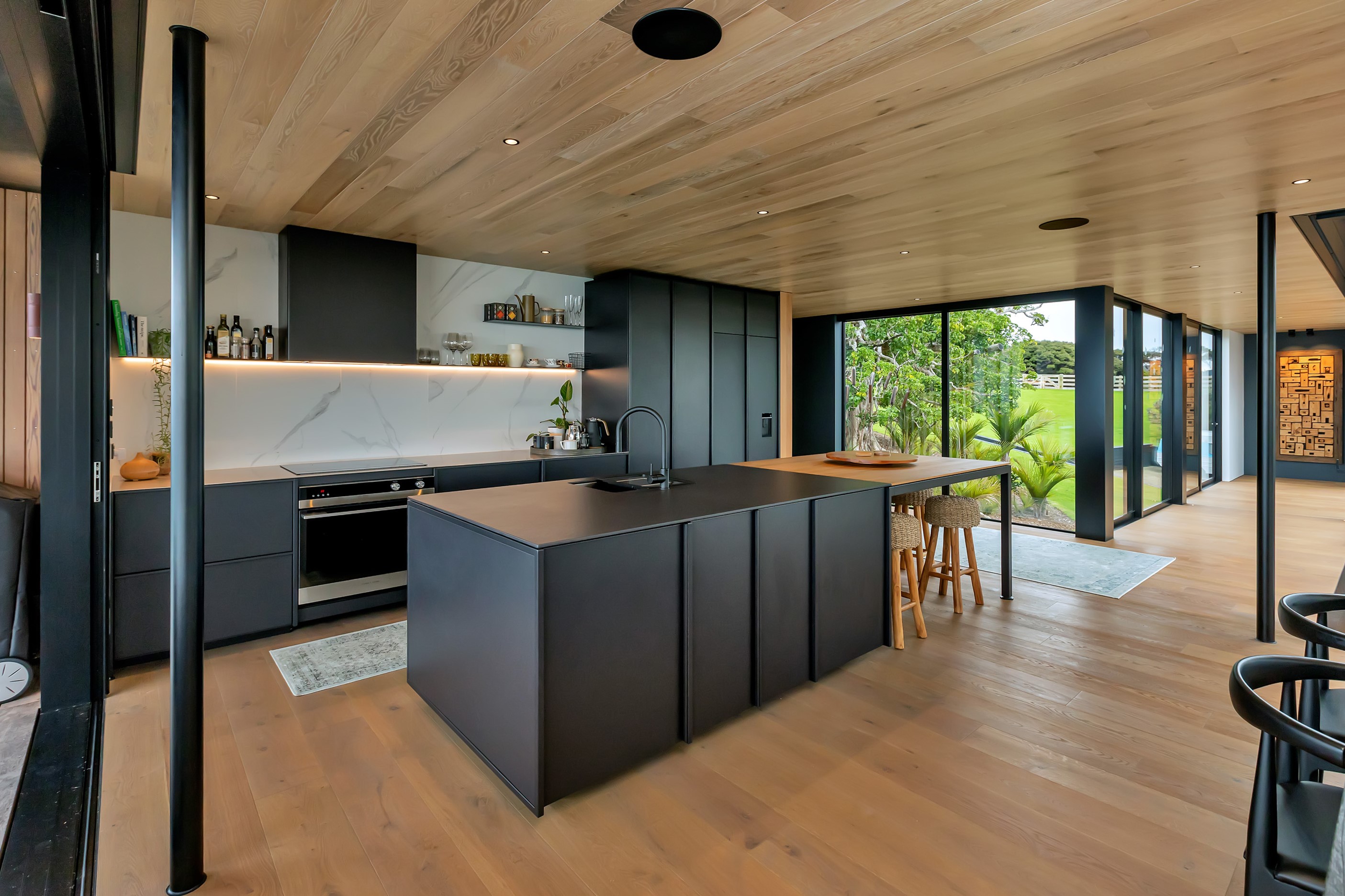 It started with a sprawling puriri and finished with a mid-century-style home honouring the tree with its rangy limbs and prolific red flowers. Yes, the 312sqm coastal home takes in grandstand views of the Pacific, but the owners also wanted it to respect its gnarled companion – a beautiful reminder of what was there first. The owners also wanted a low-profile contemporary home with sharp angles and clean lines, softened by cantilevering and landscaping curves. The two separate wings of the three-bedroom, two-bathroom house evoke a feeling of floating, or of reaching out into surrounding nature. Guests in the east wing are treated to wide ocean vistas, while the main-bedroom wing frames Northland’s rural splendour. A glazed hallway between showcases a spacious outdoor entertaining area with inbuilt fireplace on one side and the puriri and juvenile nīkau palms – magnificent when lit up at night – on the other. Timber ceilings, floors and features ground the interior and connect it with what’s outside. You’ll also find a media room, three bathrooms and a double garage. Special.
