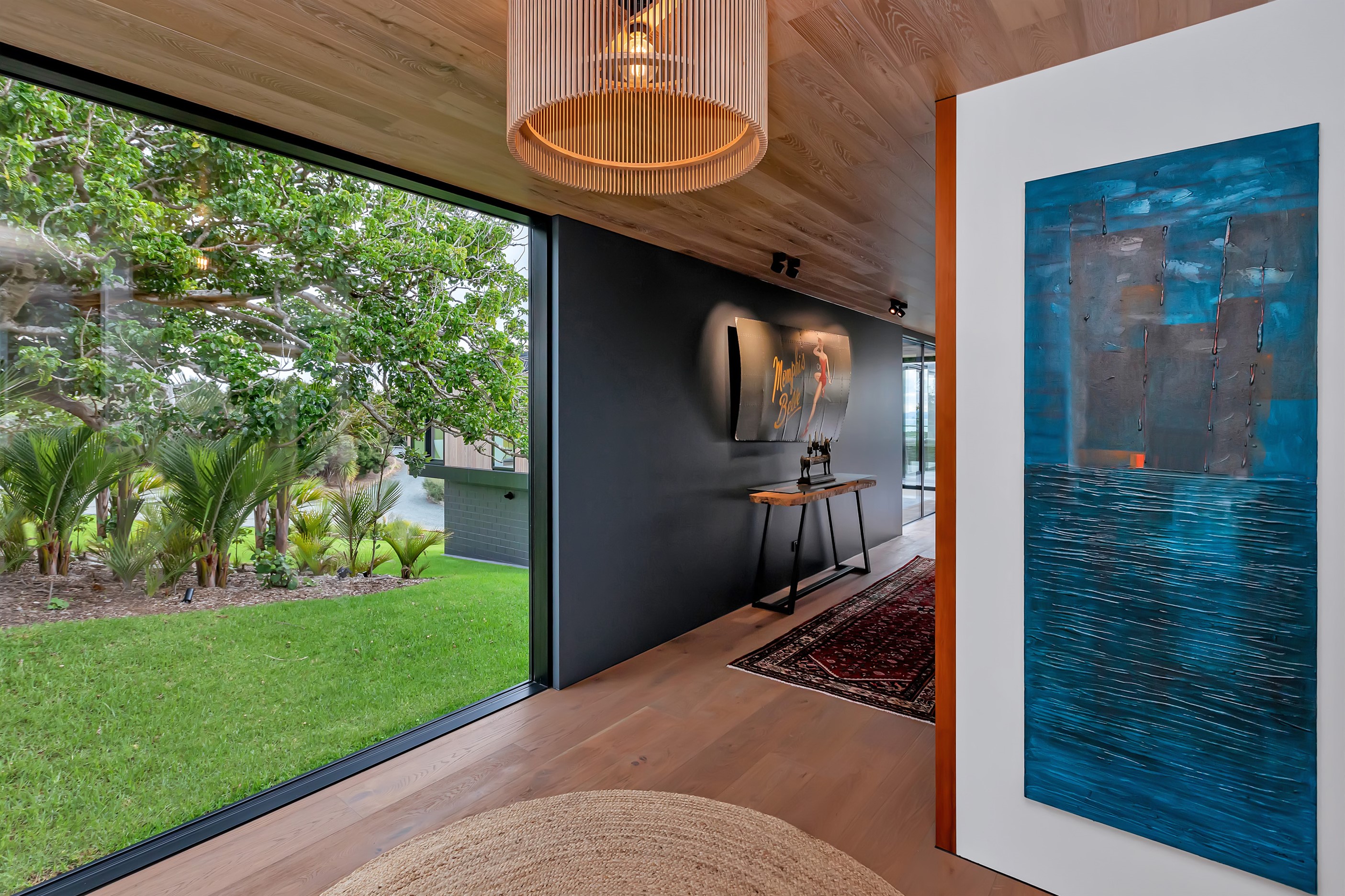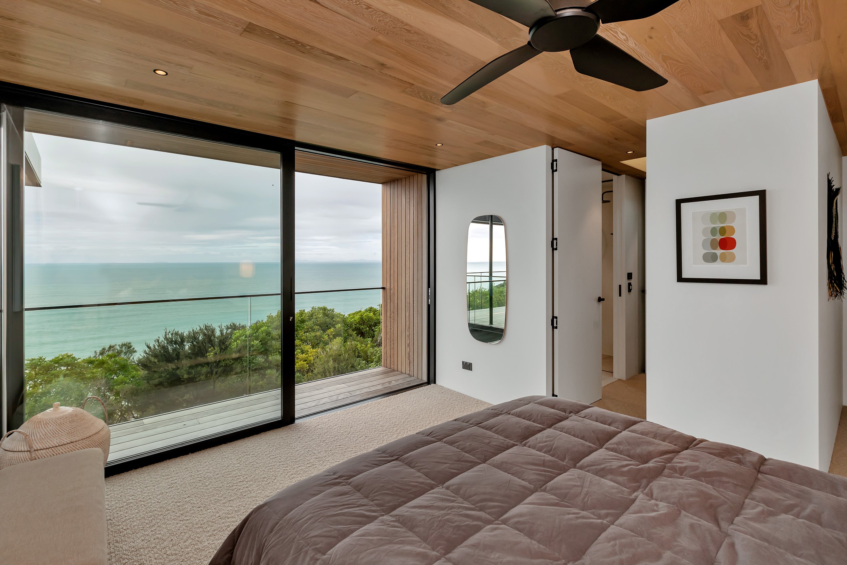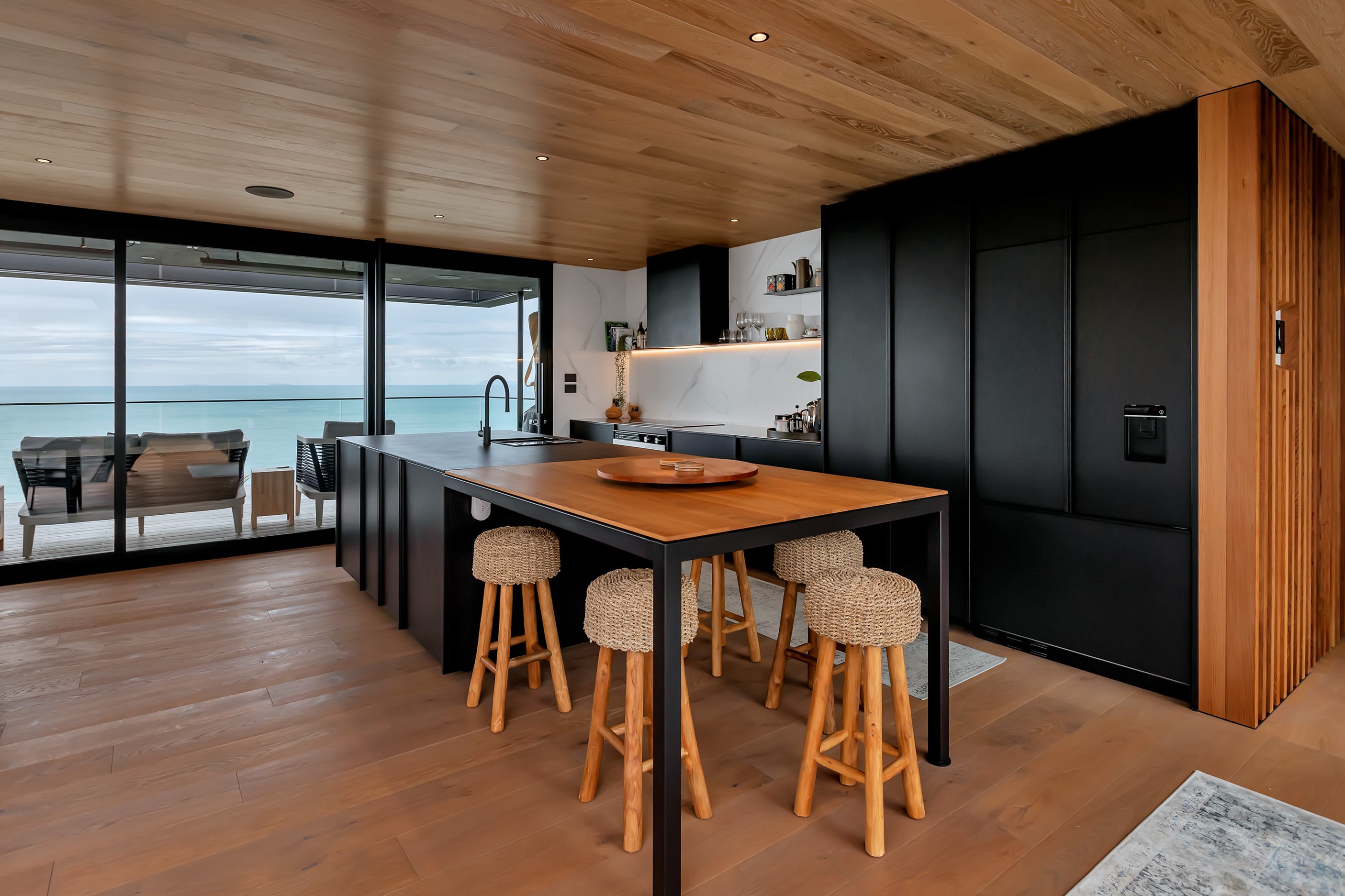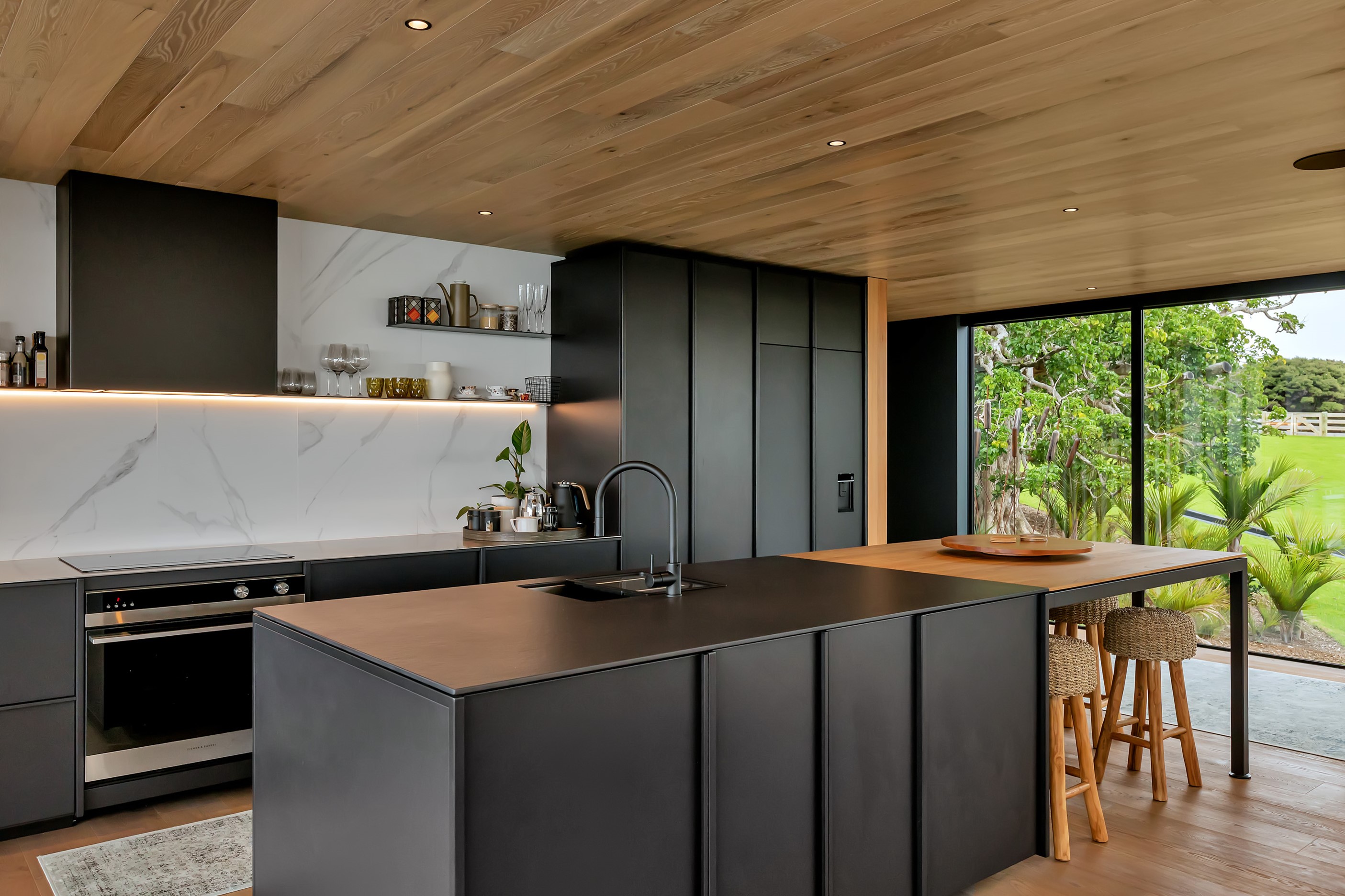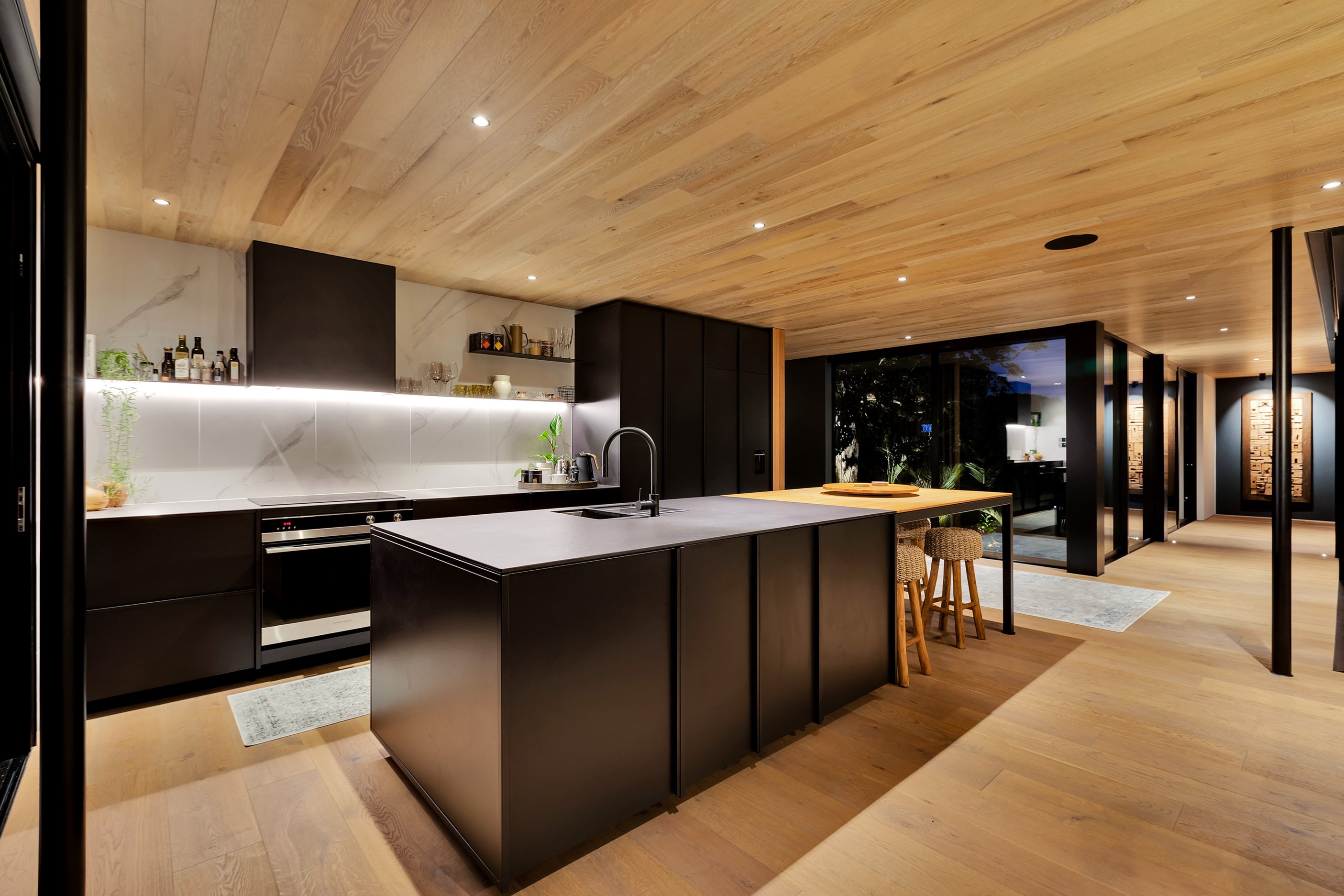 It started with a sprawling puriri and finished with a mid-century-style home honouring the tree with its rangy limbs and prolific red flowers. Yes, the 312sqm coastal home takes in grandstand views of the Pacific, but the owners also wanted it to respect its gnarled companion – a beautiful reminder of what was there first. The owners also wanted a low-profile contemporary home with sharp angles and clean lines, softened by cantilevering and landscaping curves. The two separate wings of the three-bedroom, two-bathroom house evoke a feeling of floating, or of reaching out into surrounding nature. Guests in the east wing are treated to wide ocean vistas, while the main-bedroom wing frames Northland’s rural splendour. A glazed hallway between showcases a spacious outdoor entertaining area with inbuilt fireplace on one side and the puriri and juvenile nīkau palms – magnificent when lit up at night – on the other. Timber ceilings, floors and features ground the interior and connect it with what’s outside. You’ll also find a media room, three bathrooms and a double garage. Special.