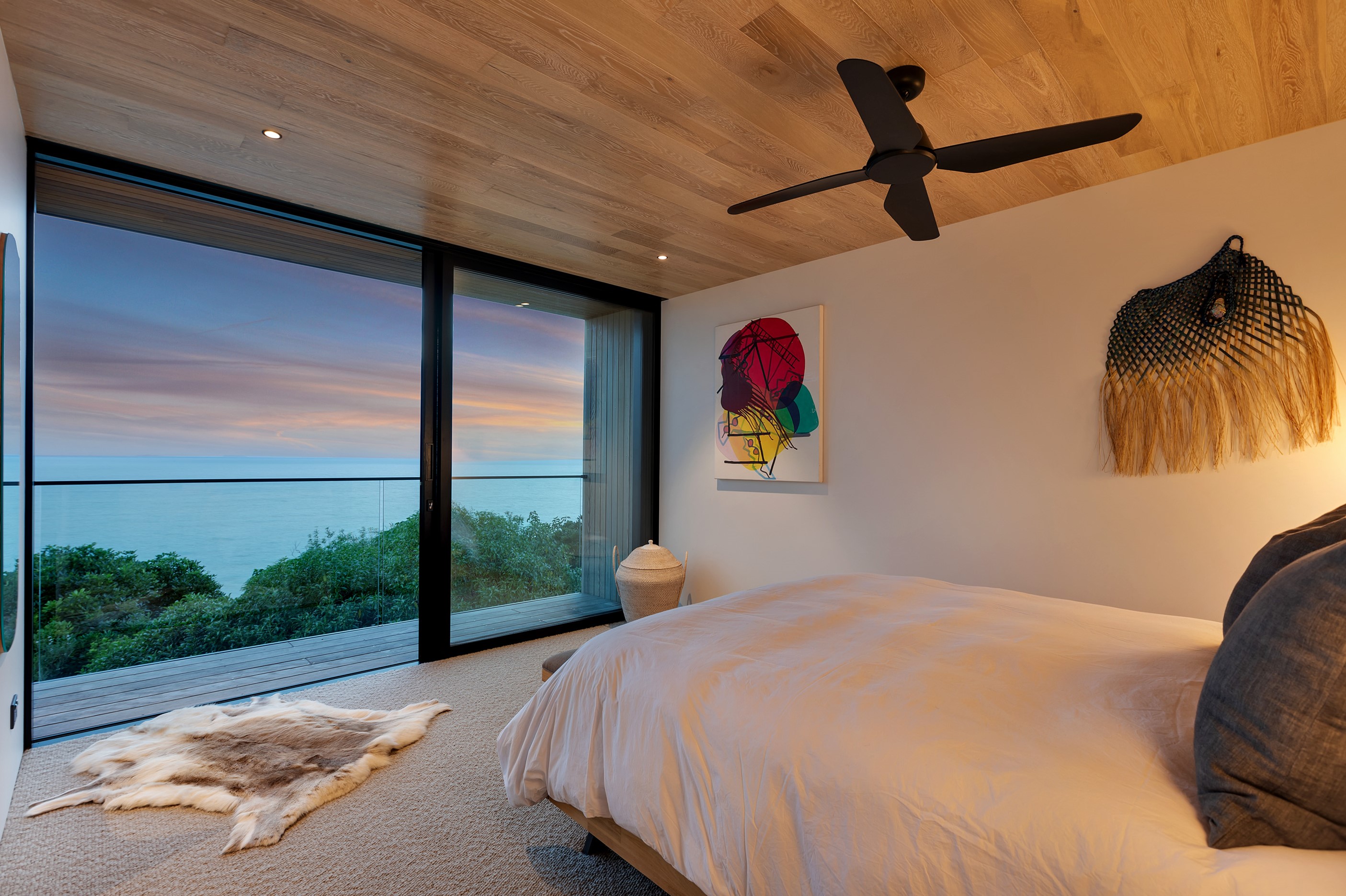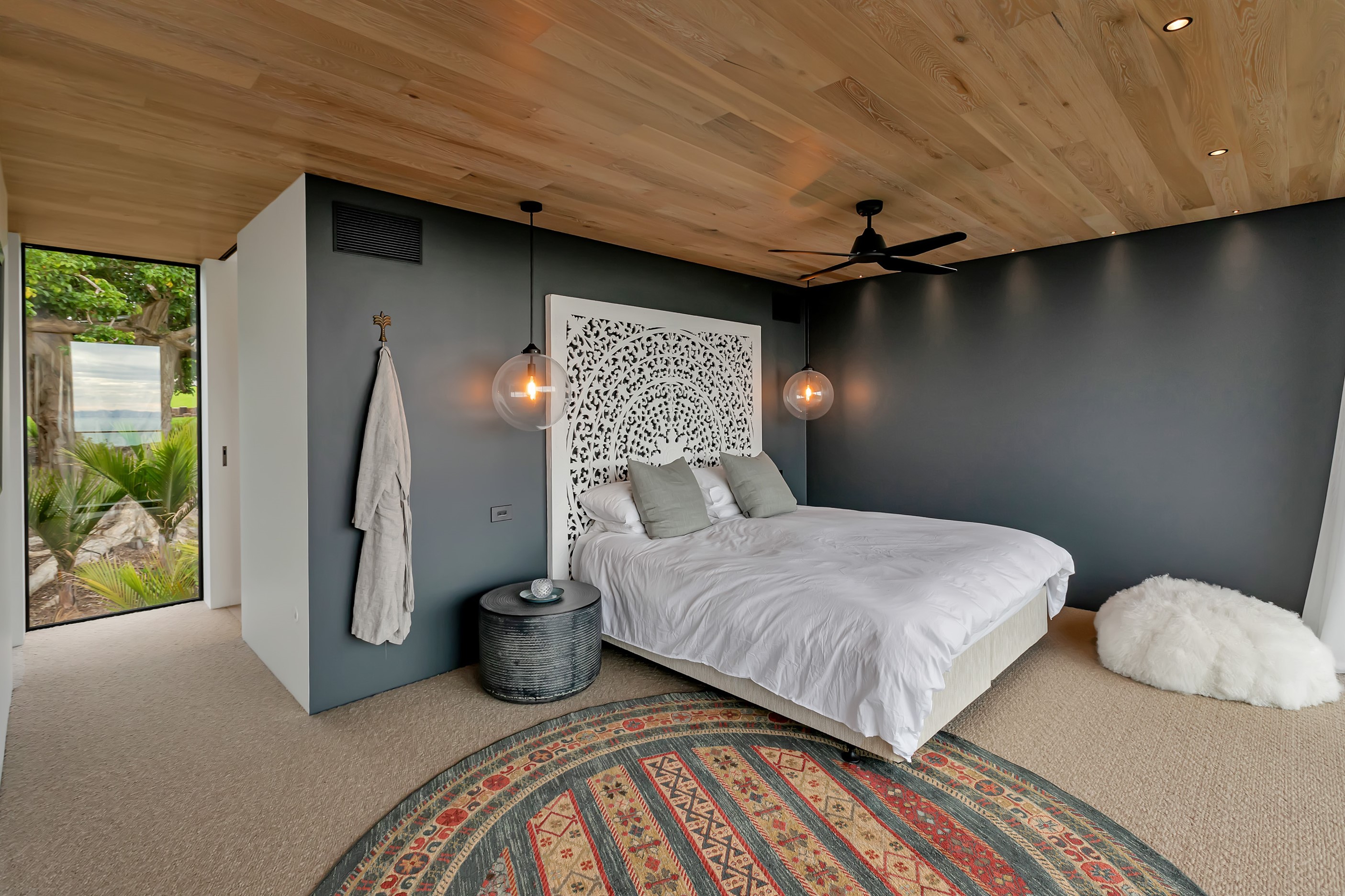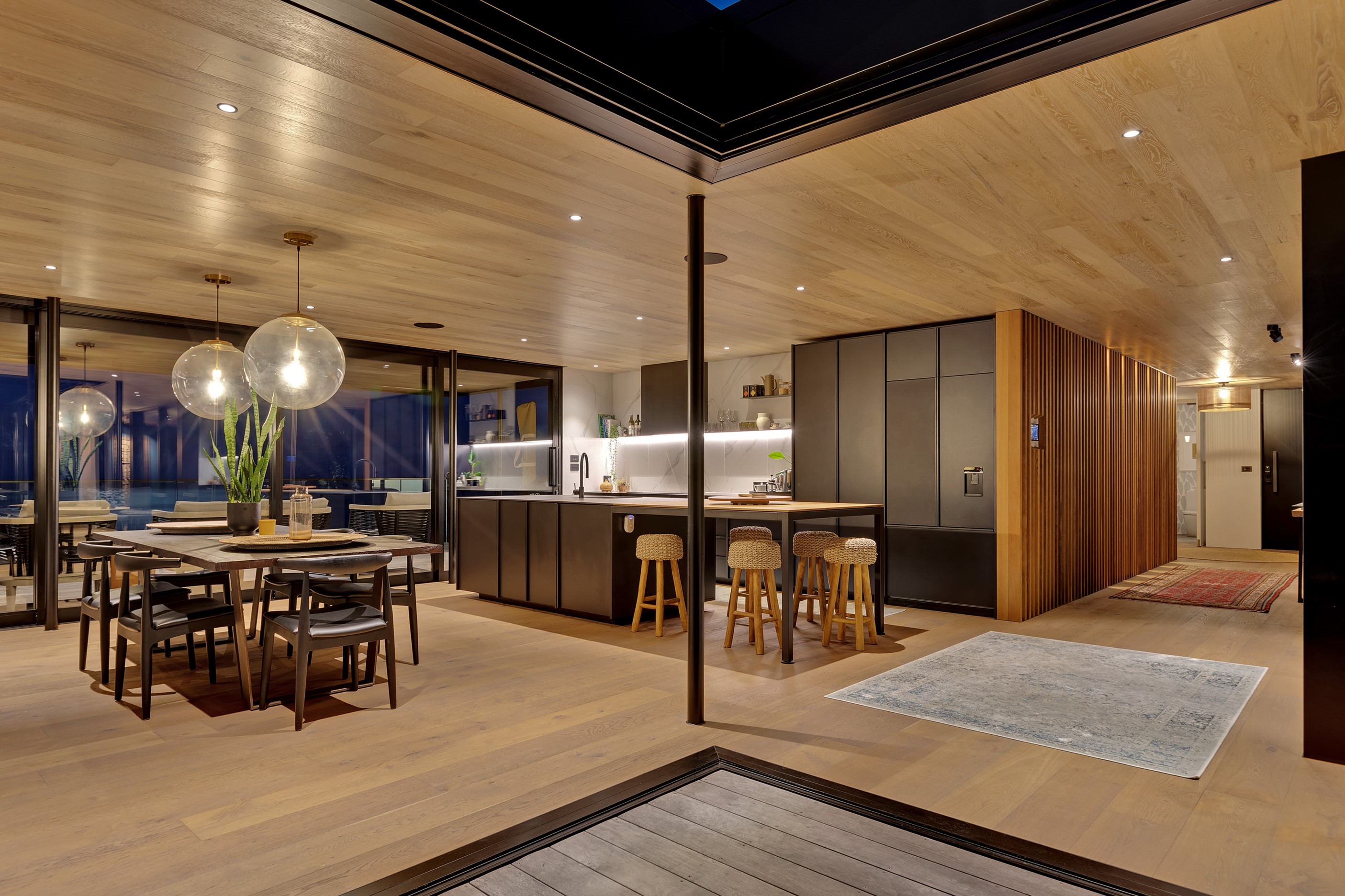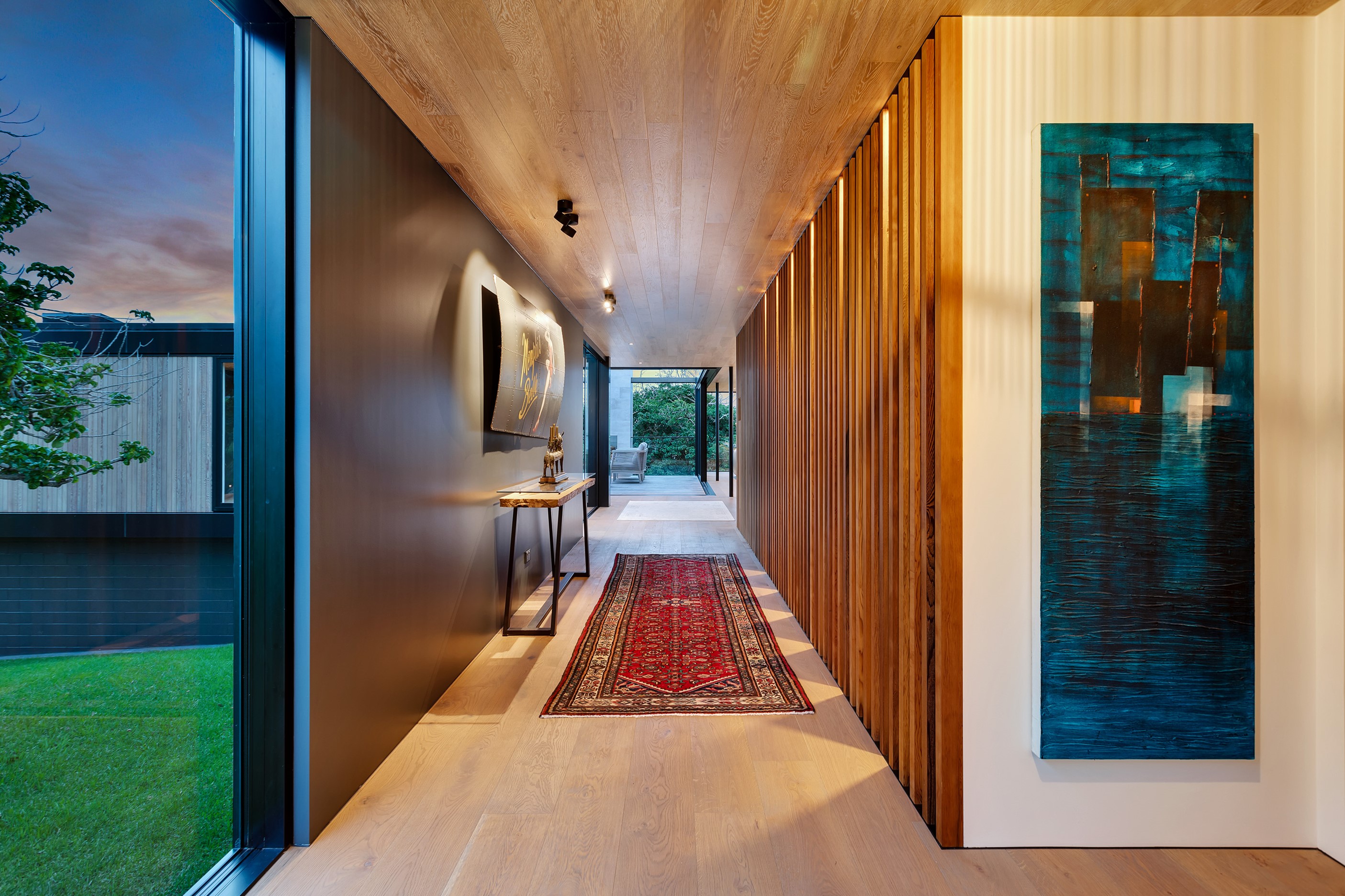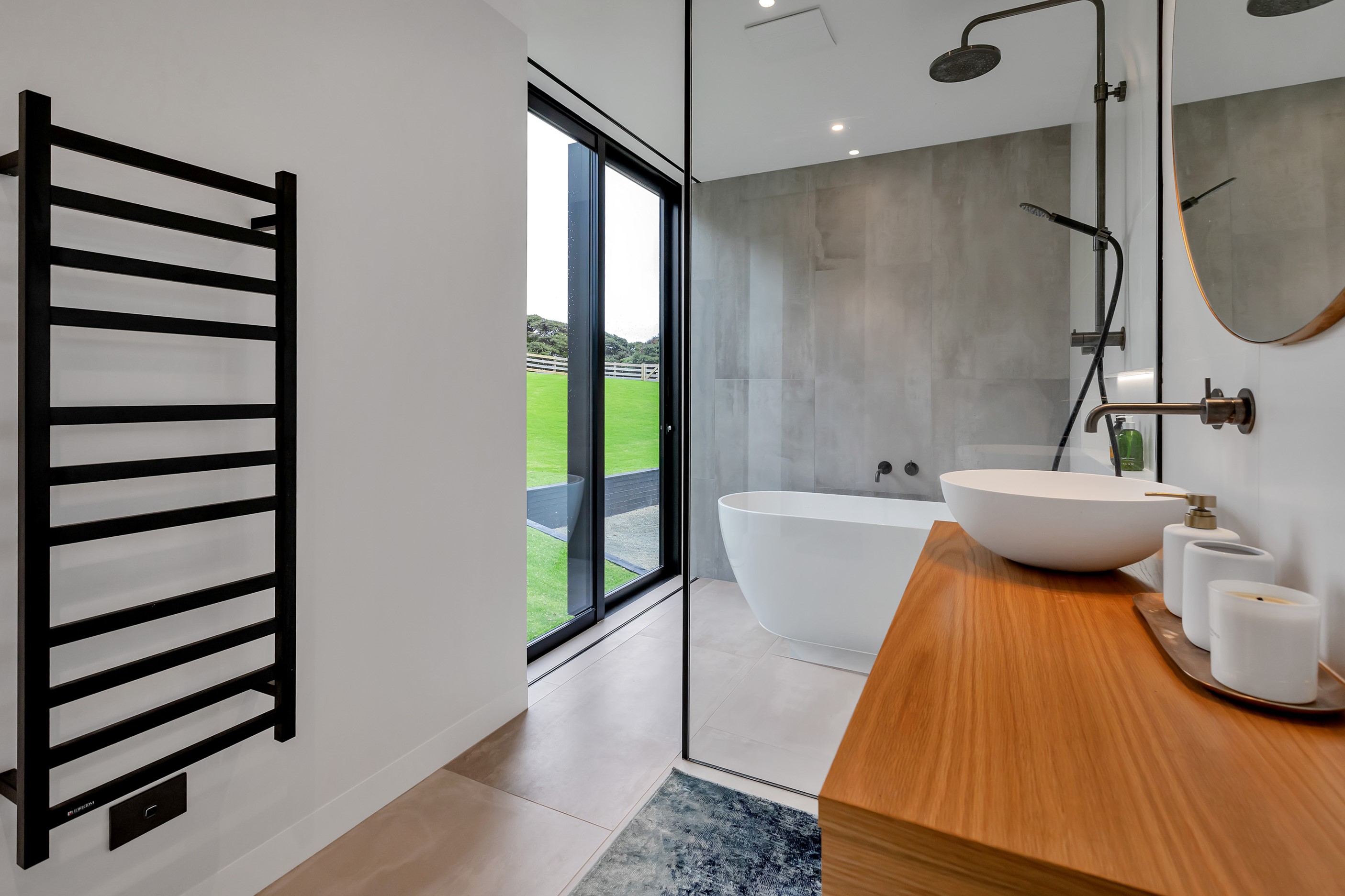 It started with a sprawling puriri and finished with a mid-century-style home honouring the tree with its rangy limbs and prolific red flowers. Yes, the 312sqm coastal home takes in grandstand views of the Pacific, but the owners also wanted it to respect its gnarled companion – a beautiful reminder of what was there first. The owners also wanted a low-profile contemporary home with sharp angles and clean lines, softened by cantilevering and landscaping curves. The two separate wings of the three-bedroom, two-bathroom house evoke a feeling of floating, or of reaching out into surrounding nature. Guests in the east wing are treated to wide ocean vistas, while the main-bedroom wing frames Northland’s rural splendour. A glazed hallway between showcases a spacious outdoor entertaining area with inbuilt fireplace on one side and the puriri and juvenile nīkau palms – magnificent when lit up at night – on the other. Timber ceilings, floors and features ground the interior and connect it with what’s outside. You’ll also find a media room, three bathrooms and a double garage. Special.