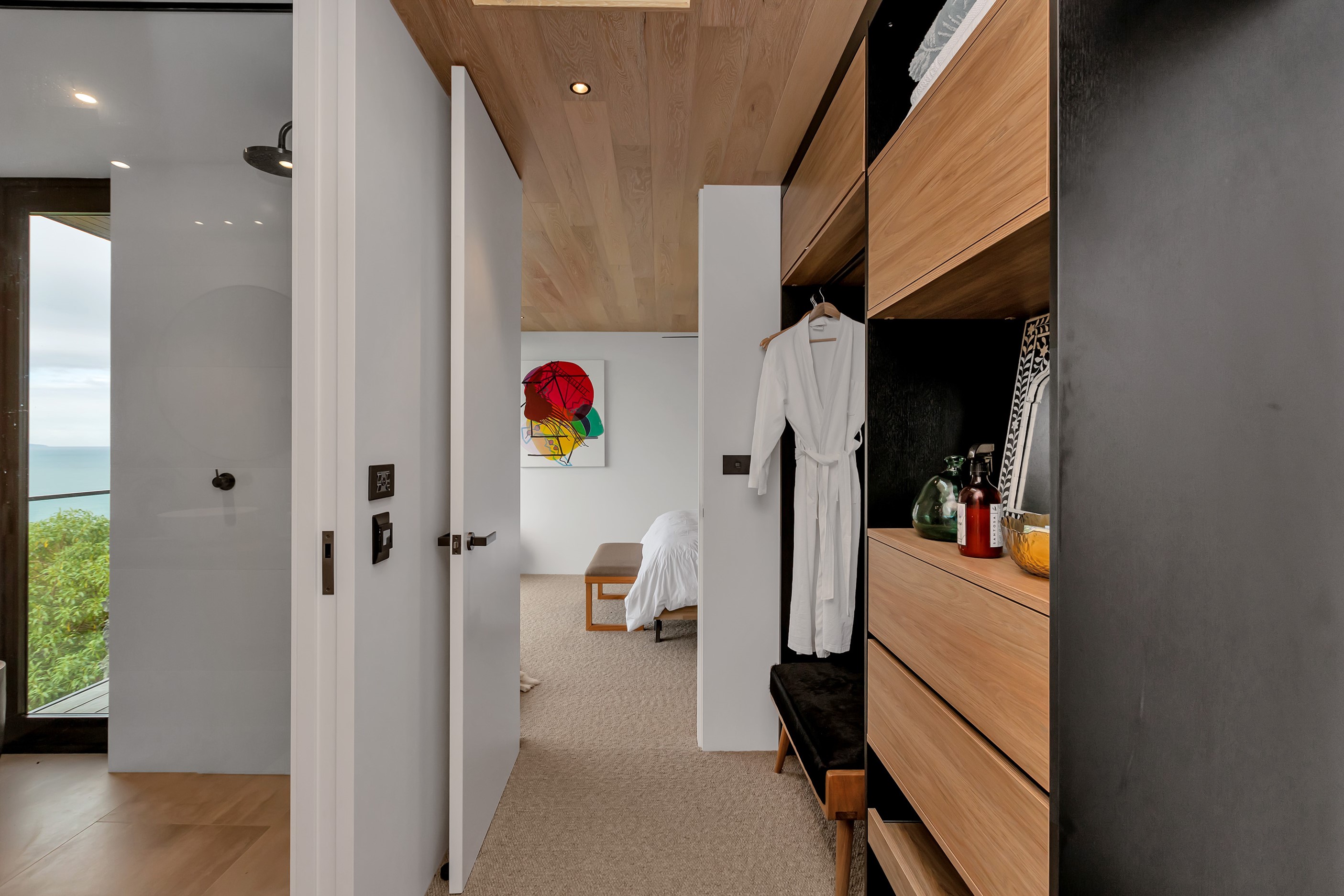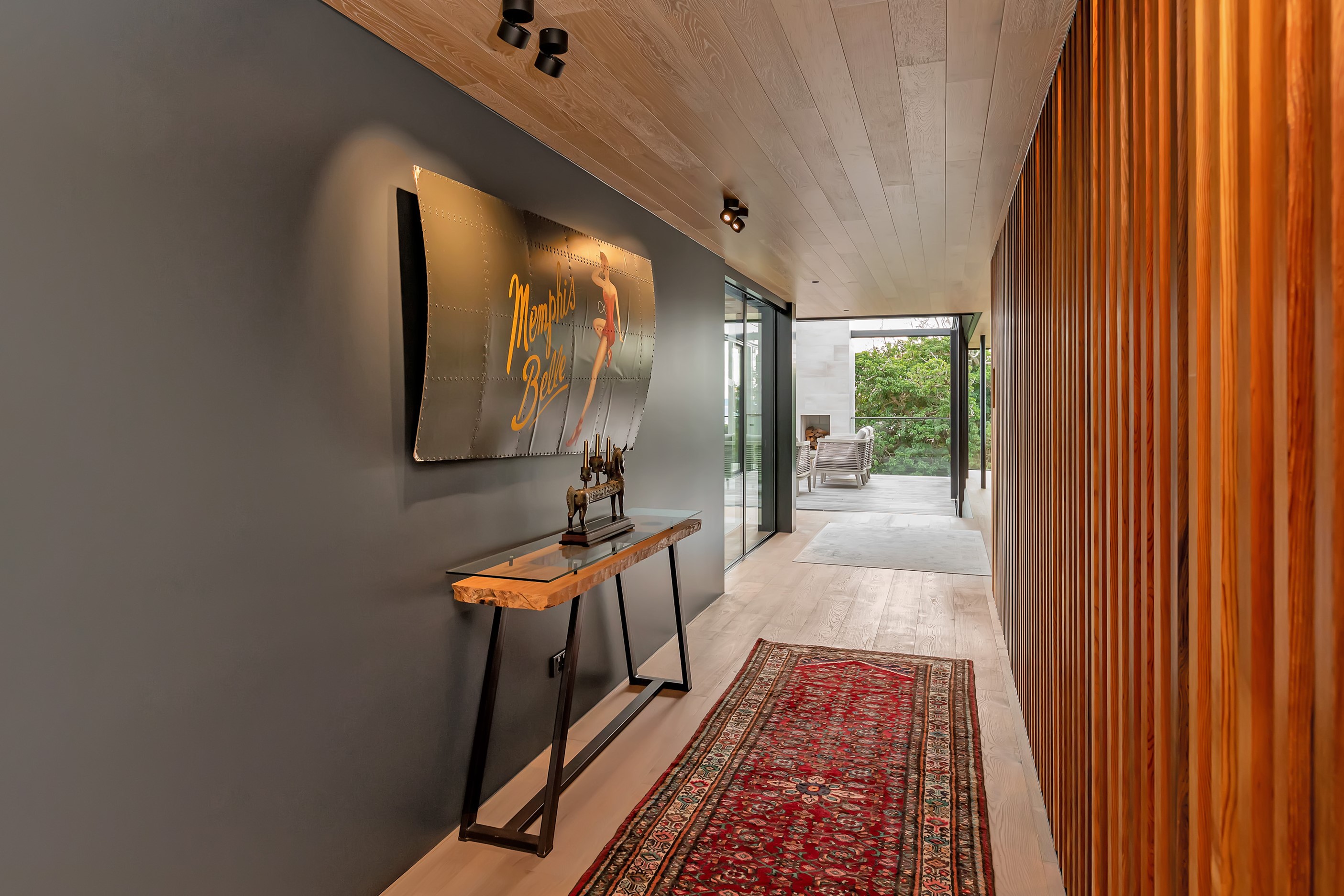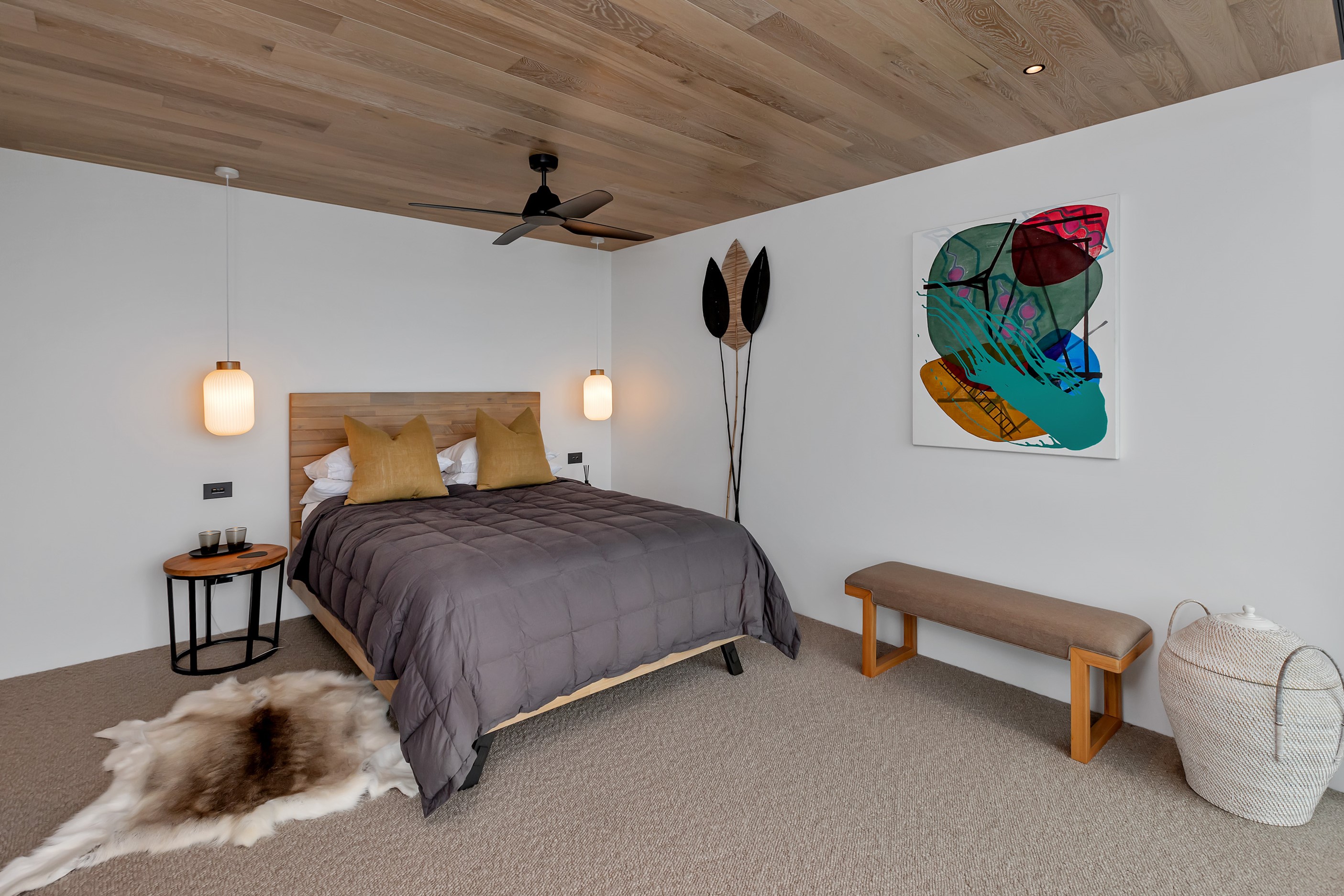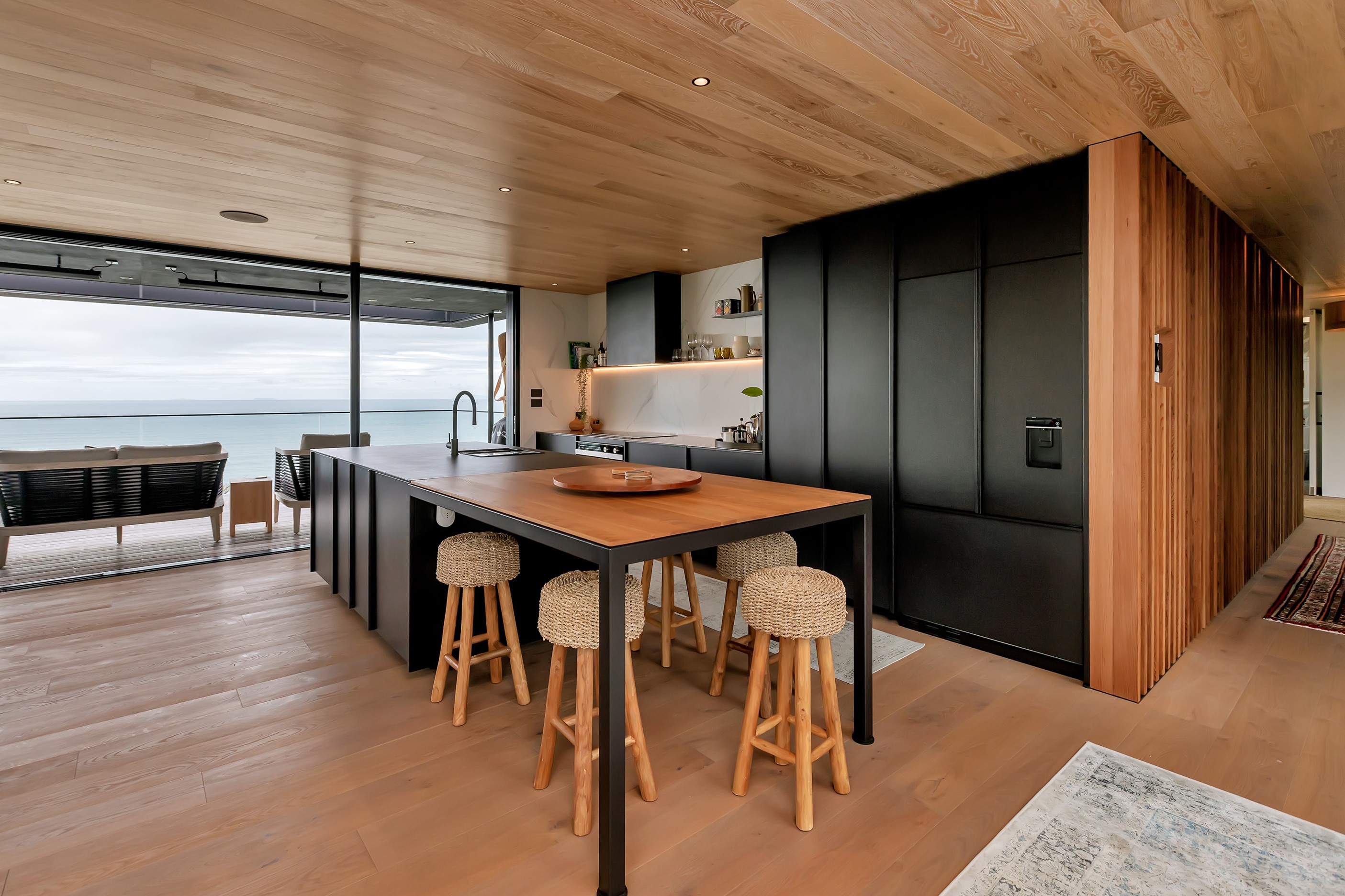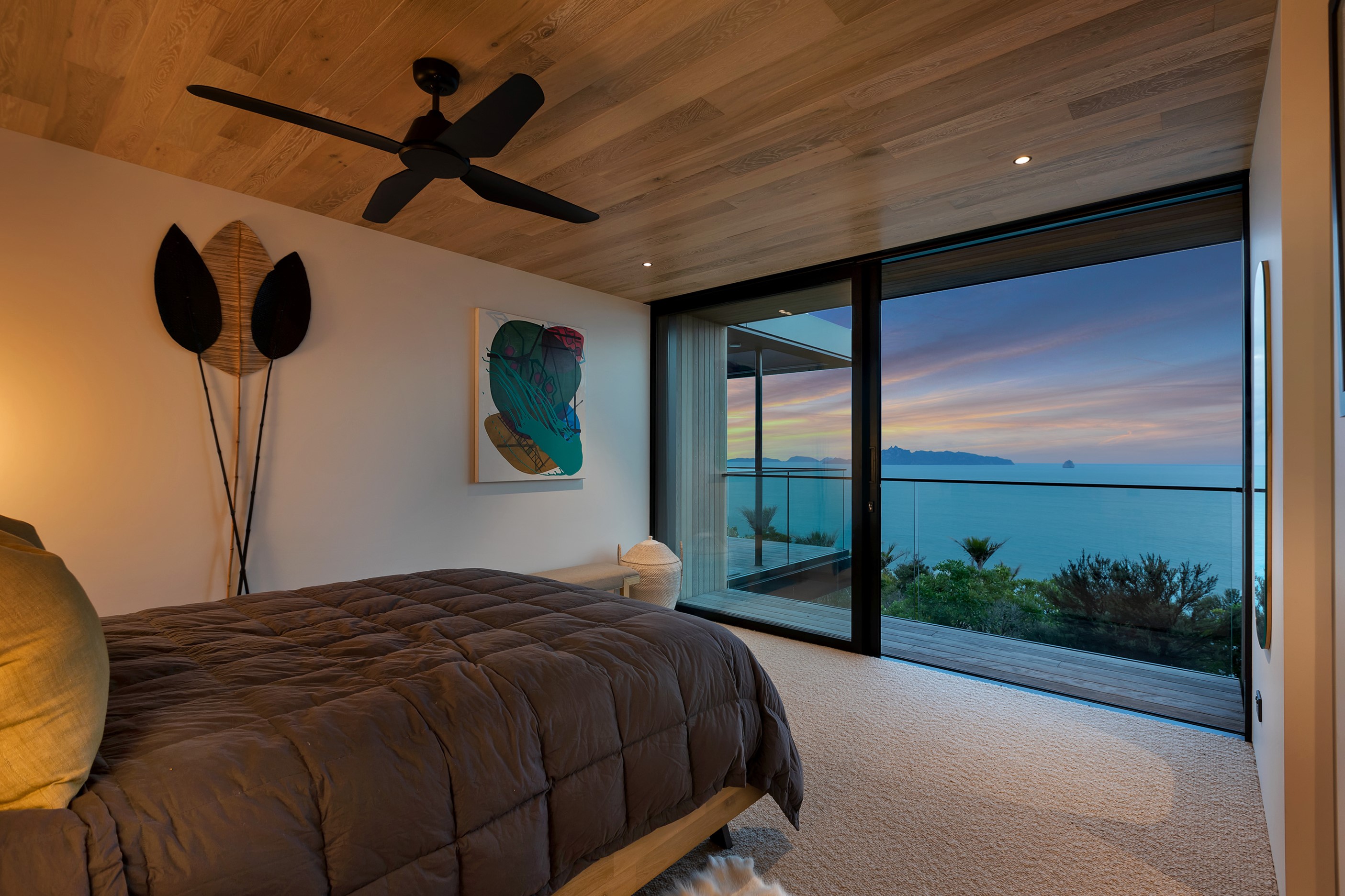 It started with a sprawling puriri and finished with a mid-century-style home honouring the tree with its rangy limbs and prolific red flowers. Yes, the 312sqm coastal home takes in grandstand views of the Pacific, but the owners also wanted it to respect its gnarled companion – a beautiful reminder of what was there first. The owners also wanted a low-profile contemporary home with sharp angles and clean lines, softened by cantilevering and landscaping curves. The two separate wings of the three-bedroom, two-bathroom house evoke a feeling of floating, or of reaching out into surrounding nature. Guests in the east wing are treated to wide ocean vistas, while the main-bedroom wing frames Northland’s rural splendour. A glazed hallway between showcases a spacious outdoor entertaining area with inbuilt fireplace on one side and the puriri and juvenile nīkau palms – magnificent when lit up at night – on the other. Timber ceilings, floors and features ground the interior and connect it with what’s outside. You’ll also find a media room, three bathrooms and a double garage. Special.