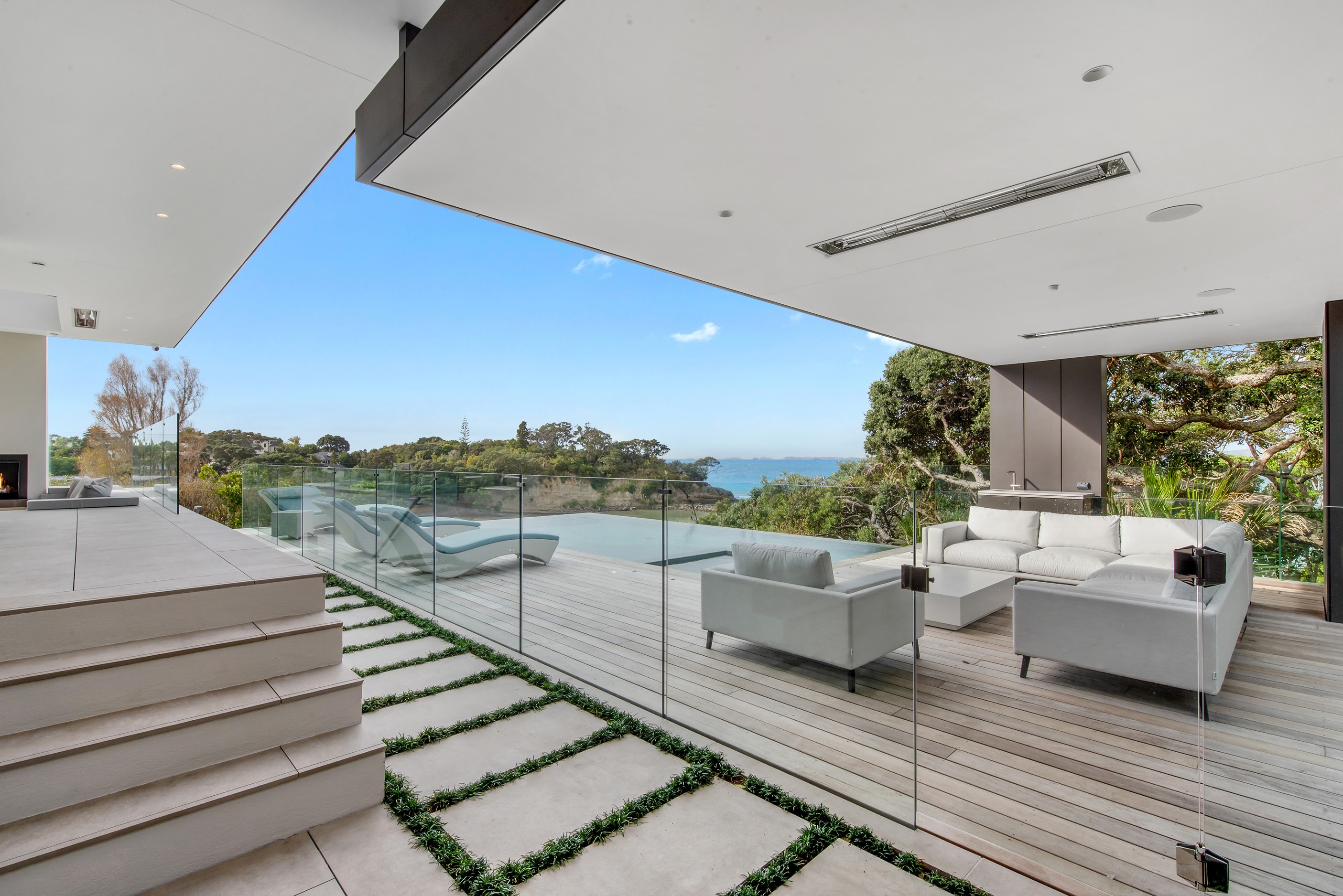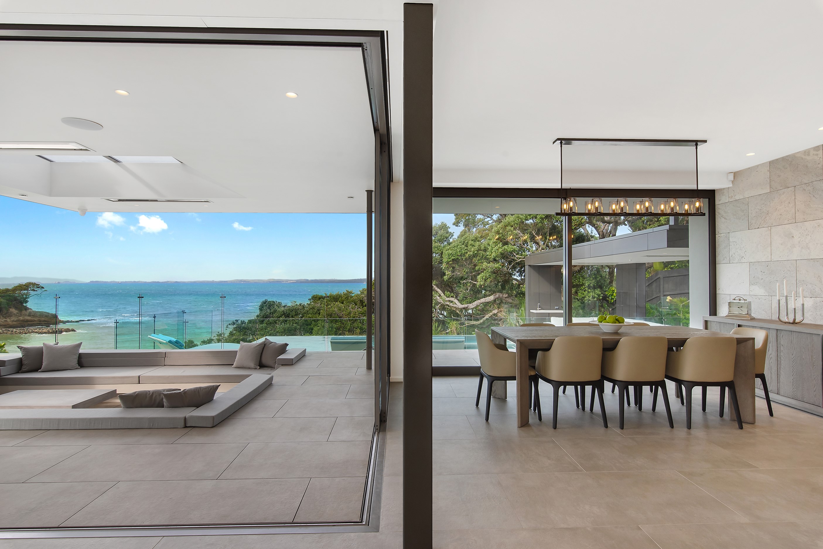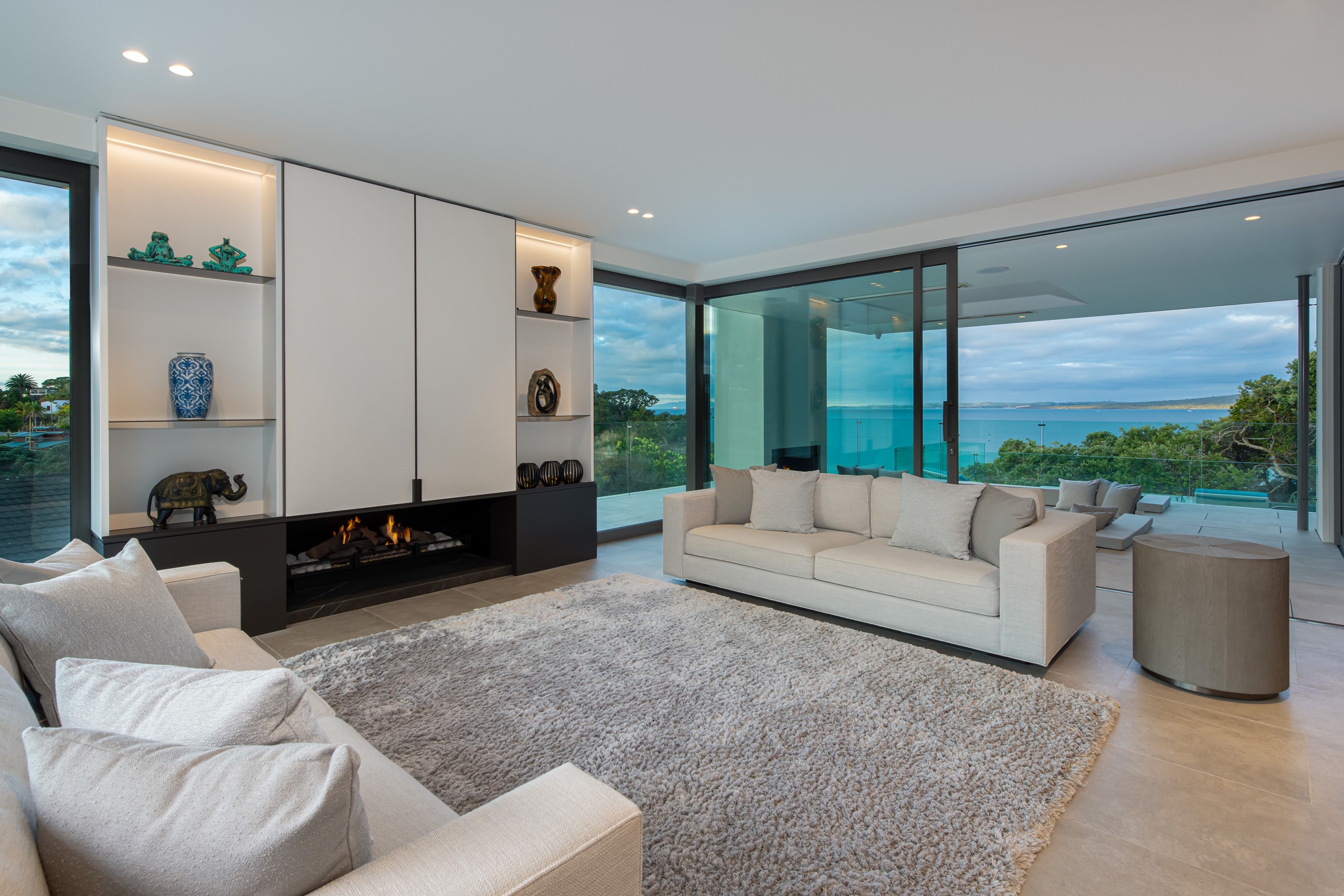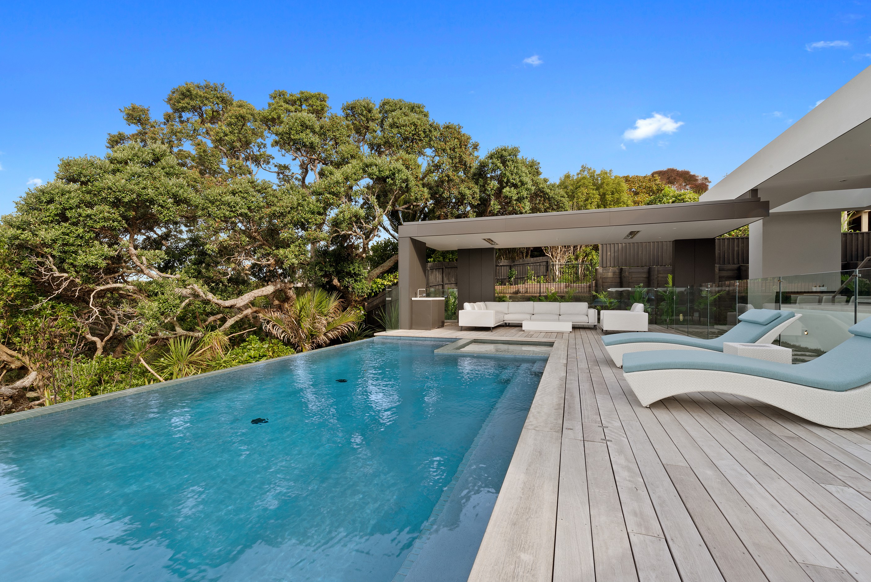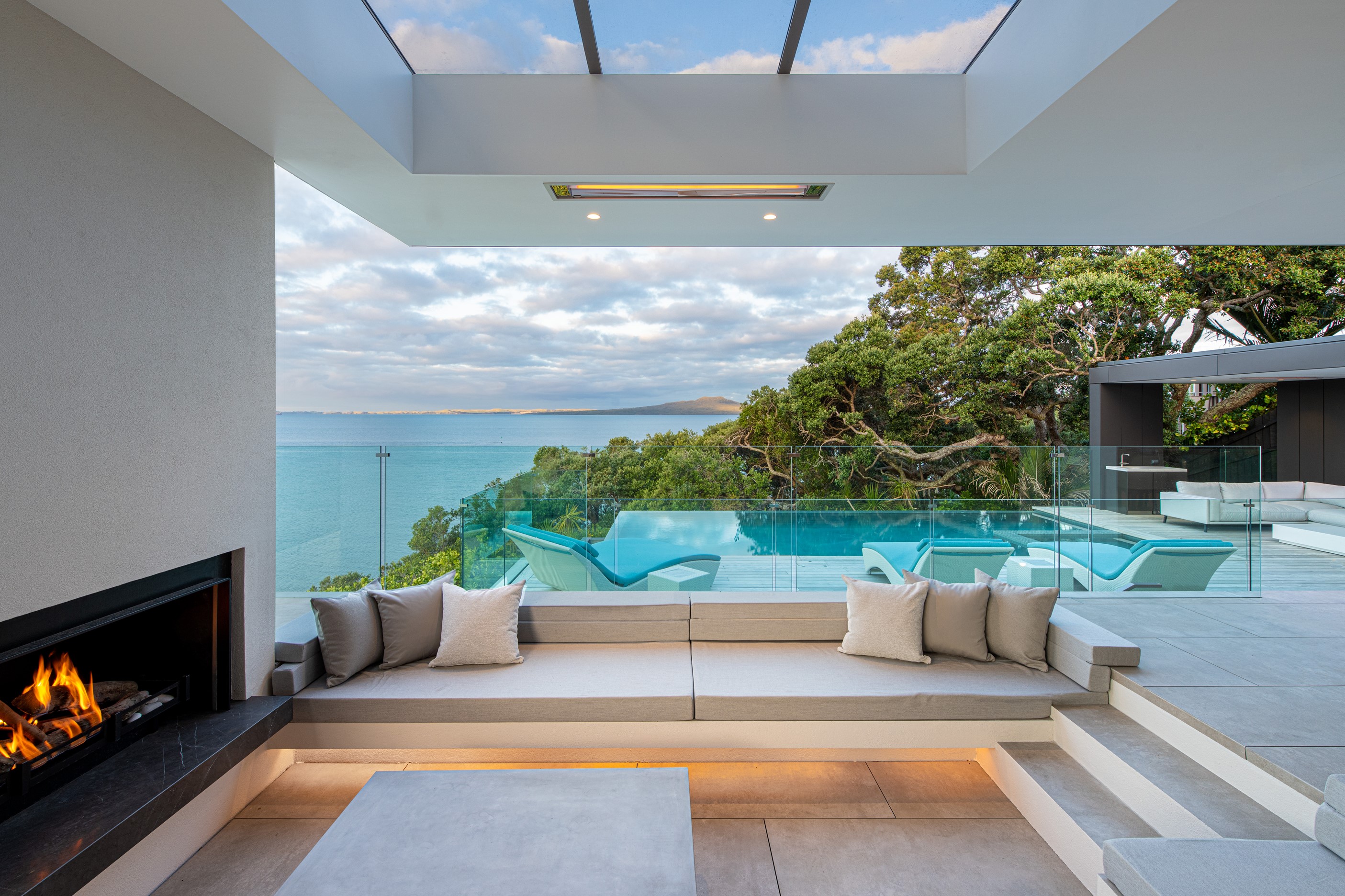 Designed and built for a returning Kiwi couple and their young family, this complex build required precision planning. The site was excavated at the clifftop and extensive drilling and ground anchors help support the weight of this substantial new home and pool. There are multiple different levels to this magnificent build, all formed in concrete – excluding the top floor, which is timber. A sunken outdoor seating area with a built-in fireplace and recessed heating to the soffits has prime position overlooking the pool and Castor Bay Beach below. The home is designed for large-family living with five bedrooms and bathrooms. Three more bedrooms and four bathrooms are located in a separate luxury guest wing. For entertaining, relaxing and just plain fun, there’s a cantilevered infinity pool with a built-in spa. And there’s an expansive covered deck with a barbecue area boasting 180-degree views of the Hauraki Gulf. The cladding combines plastered concrete, stained-cedar vertical weatherboards, stone and metal. A comprehensive automation system allows almost everything in the home to be operated from a device.