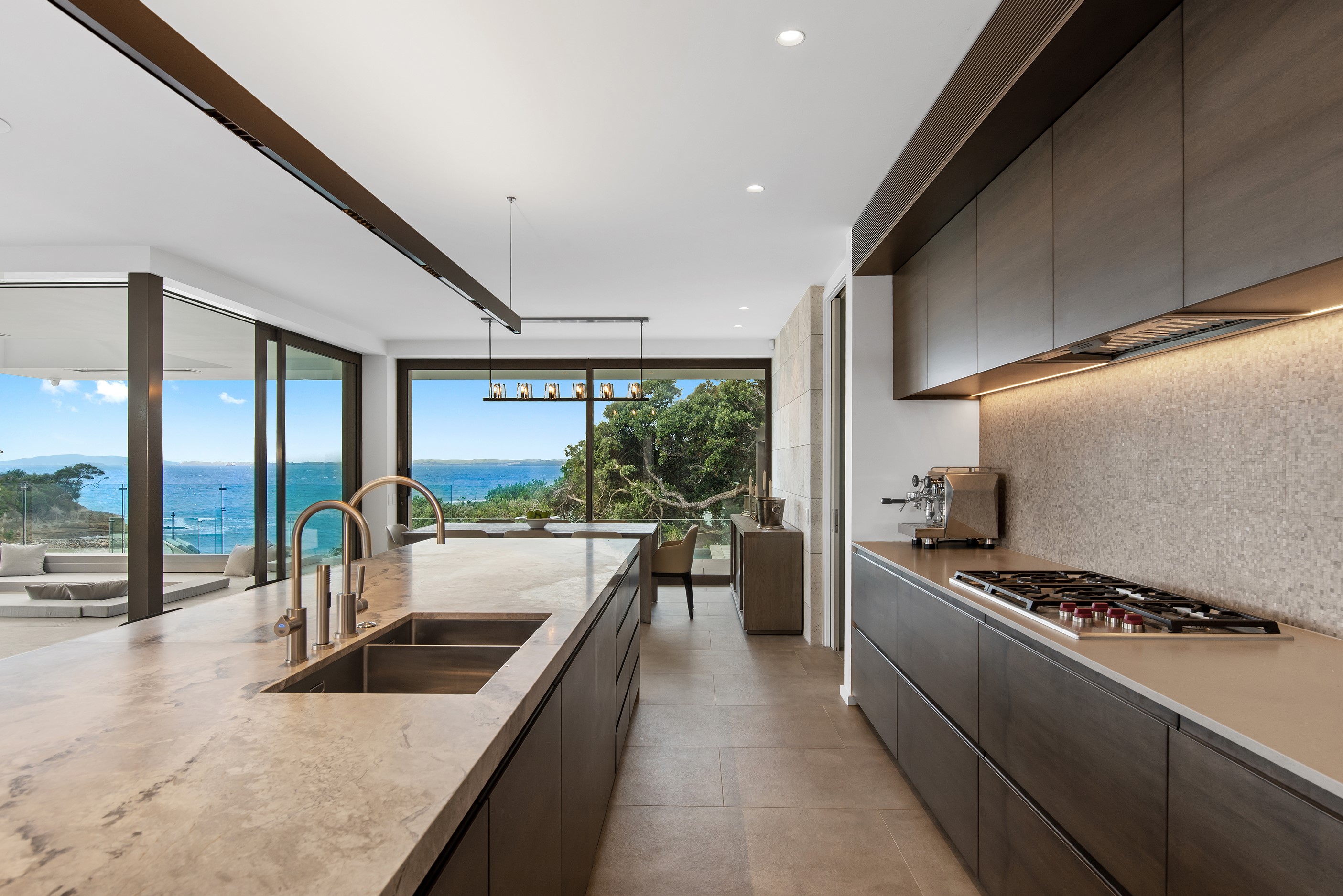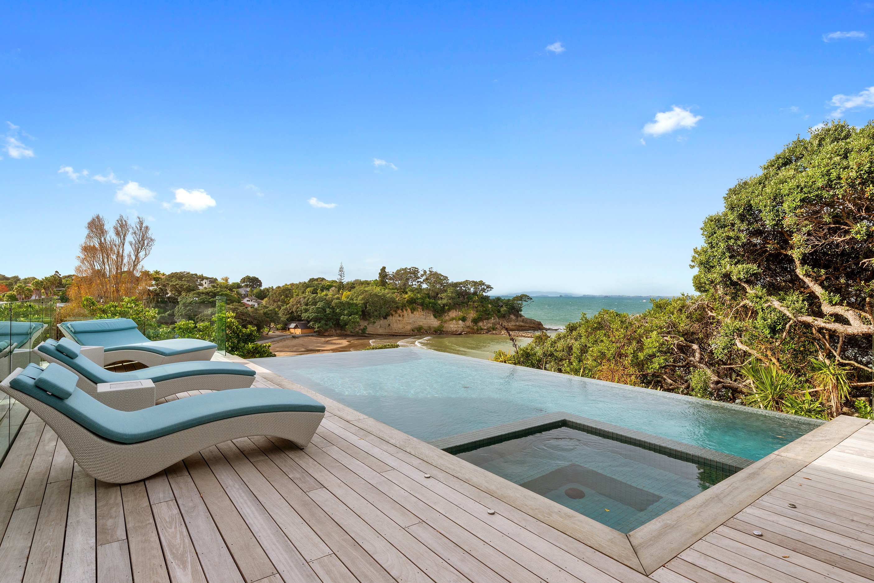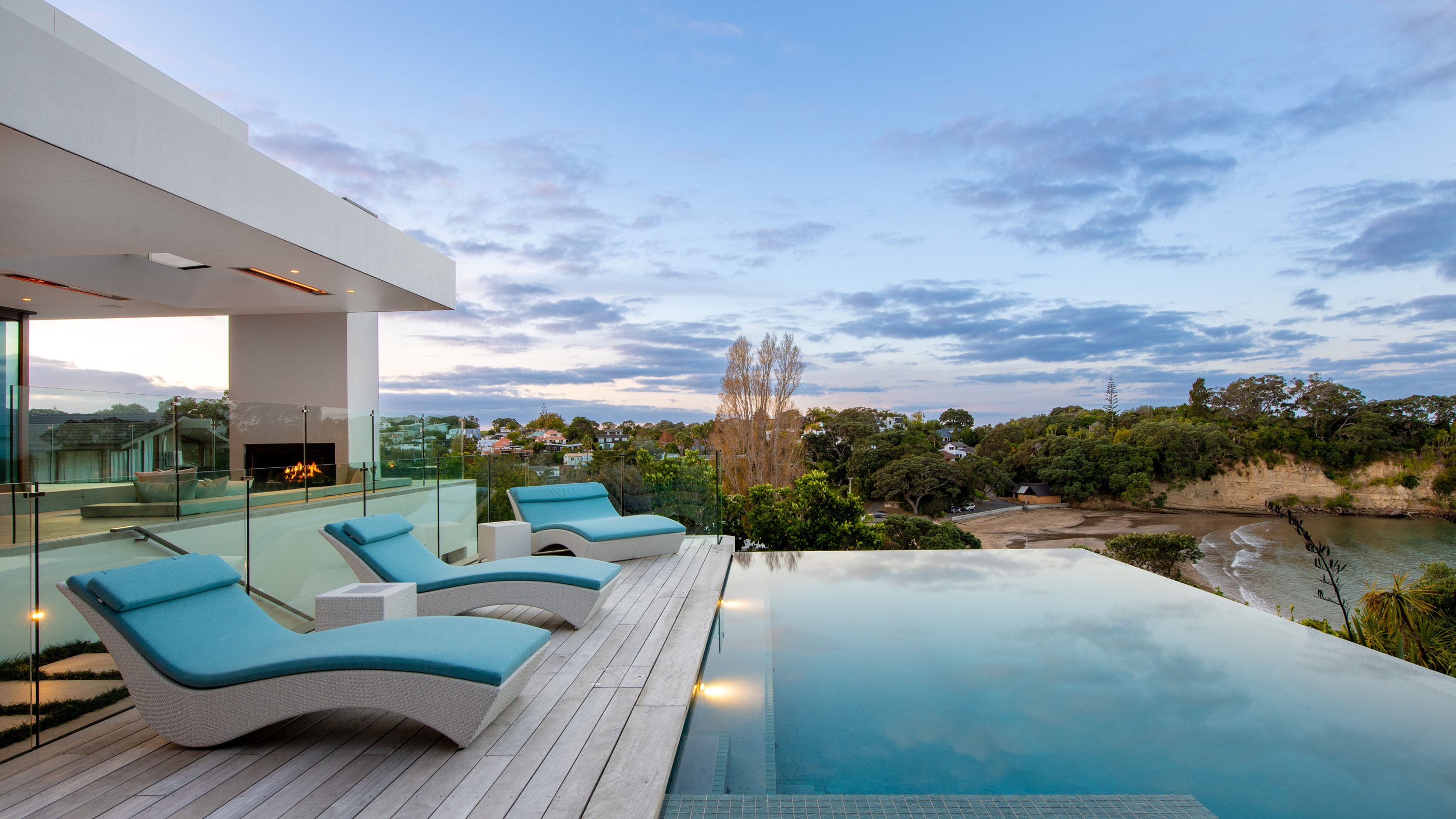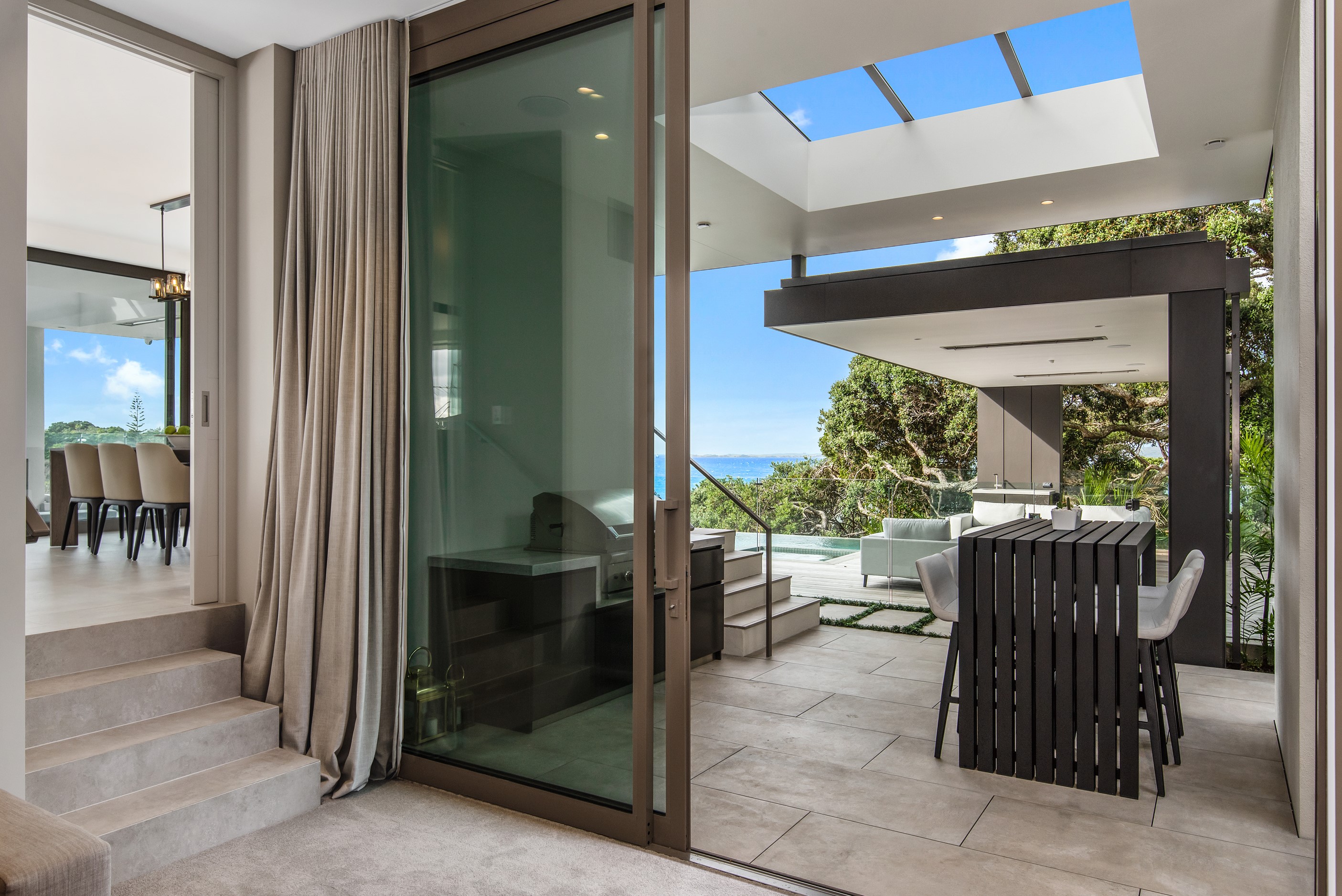 Designed and built for a returning Kiwi couple and their young family, this complex build required precision planning. The site was excavated at the clifftop and extensive drilling and ground anchors help support the weight of this substantial new home and pool. There are multiple different levels to this magnificent build, all formed in concrete – excluding the top floor, which is timber. A sunken outdoor seating area with a built-in fireplace and recessed heating to the soffits has prime position overlooking the pool and Castor Bay Beach below. The home is designed for large-family living with five bedrooms and bathrooms. Three more bedrooms and four bathrooms are located in a separate luxury guest wing. For entertaining, relaxing and just plain fun, there’s a cantilevered infinity pool with a built-in spa. And there’s an expansive covered deck with a barbecue area boasting 180-degree views of the Hauraki Gulf. The cladding combines plastered concrete, stained-cedar vertical weatherboards, stone and metal. A comprehensive automation system allows almost everything in the home to be operated from a device.