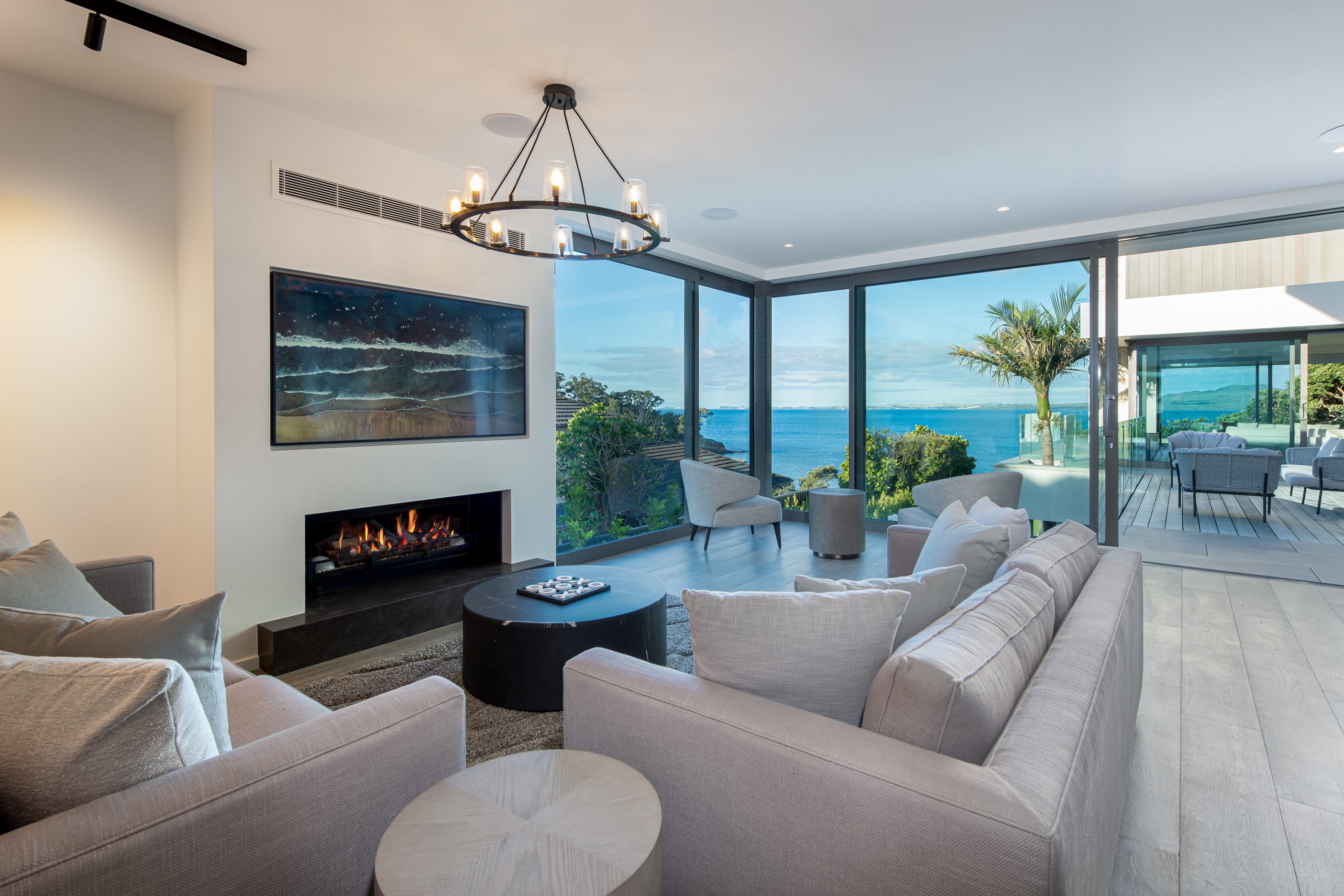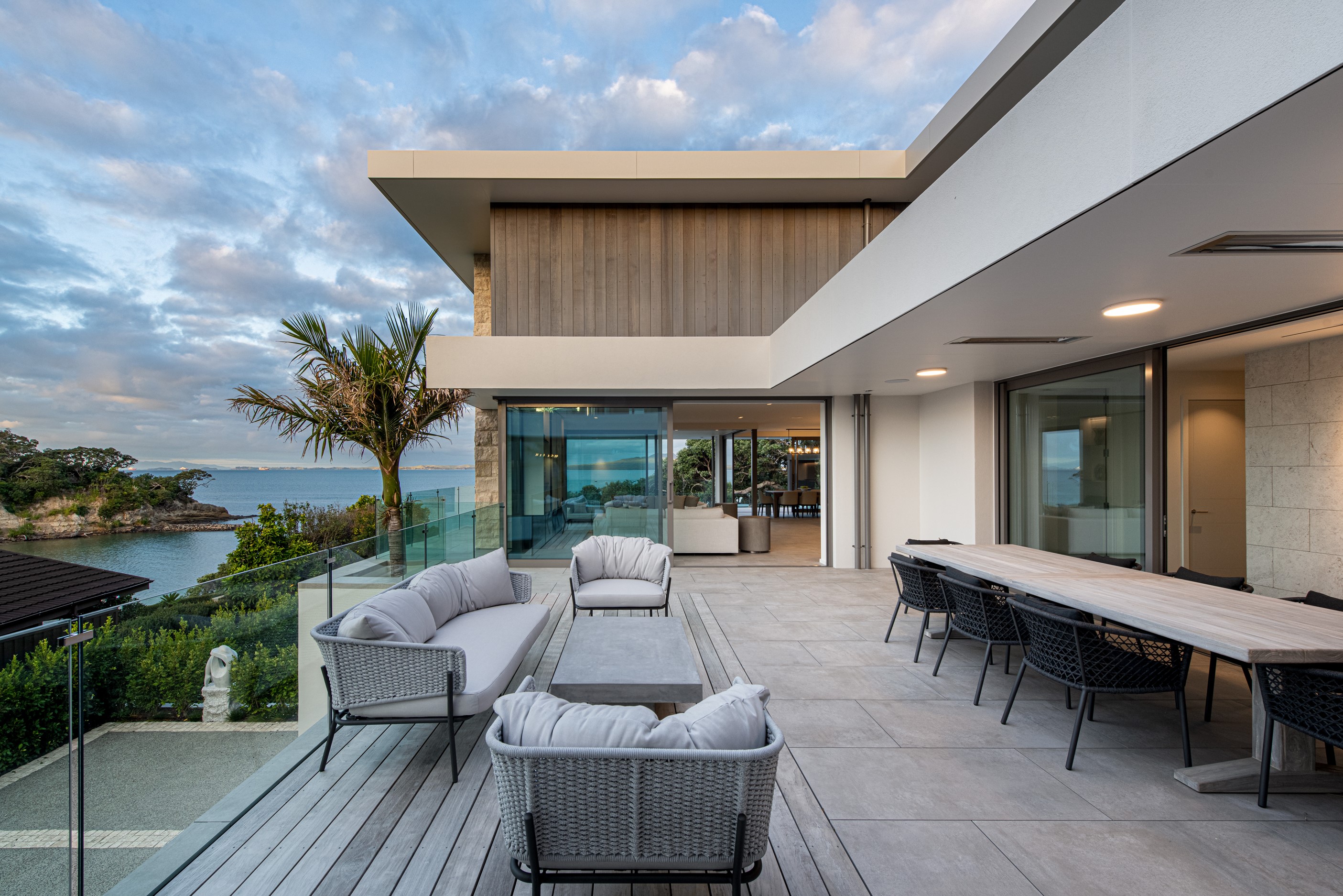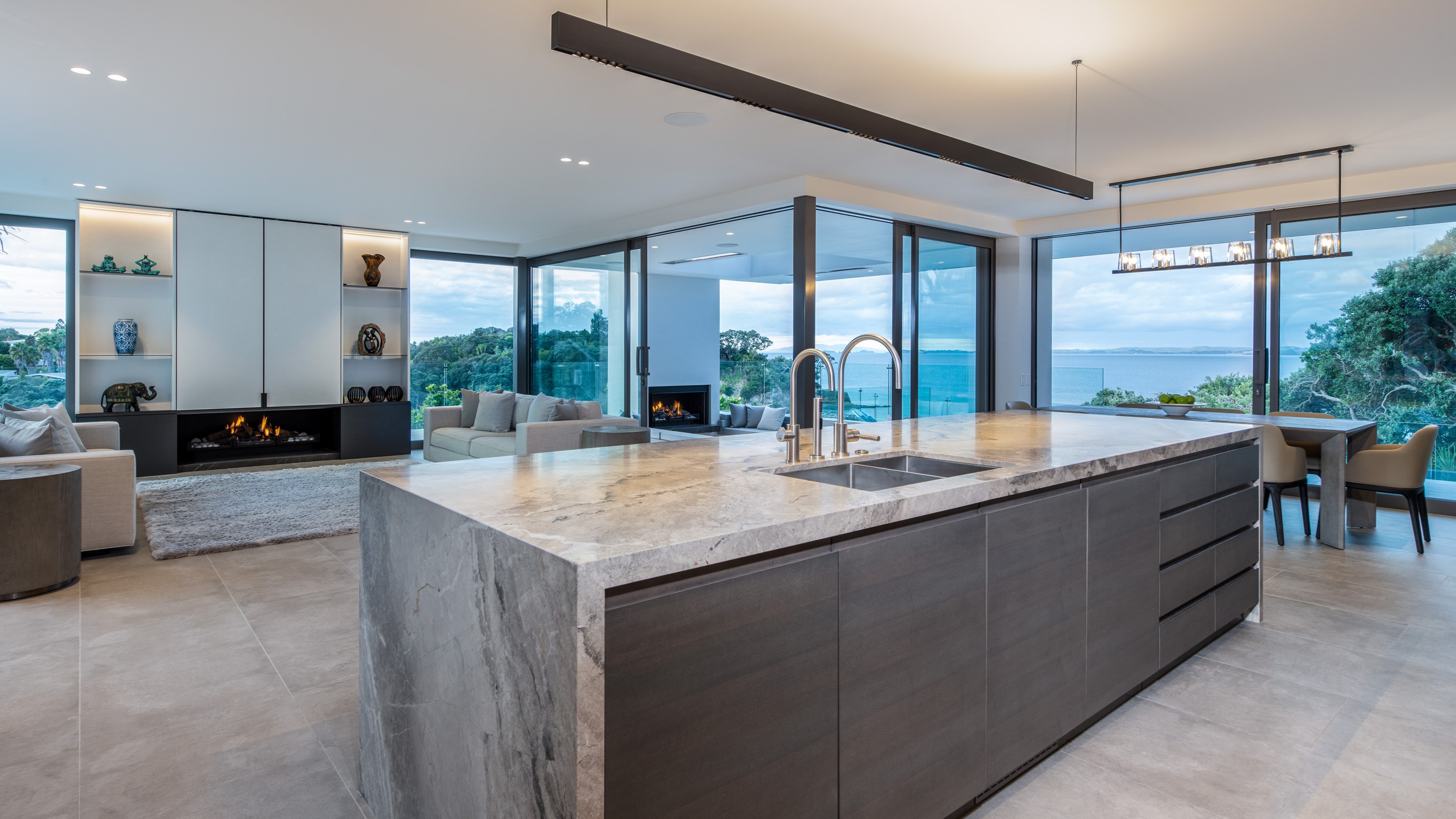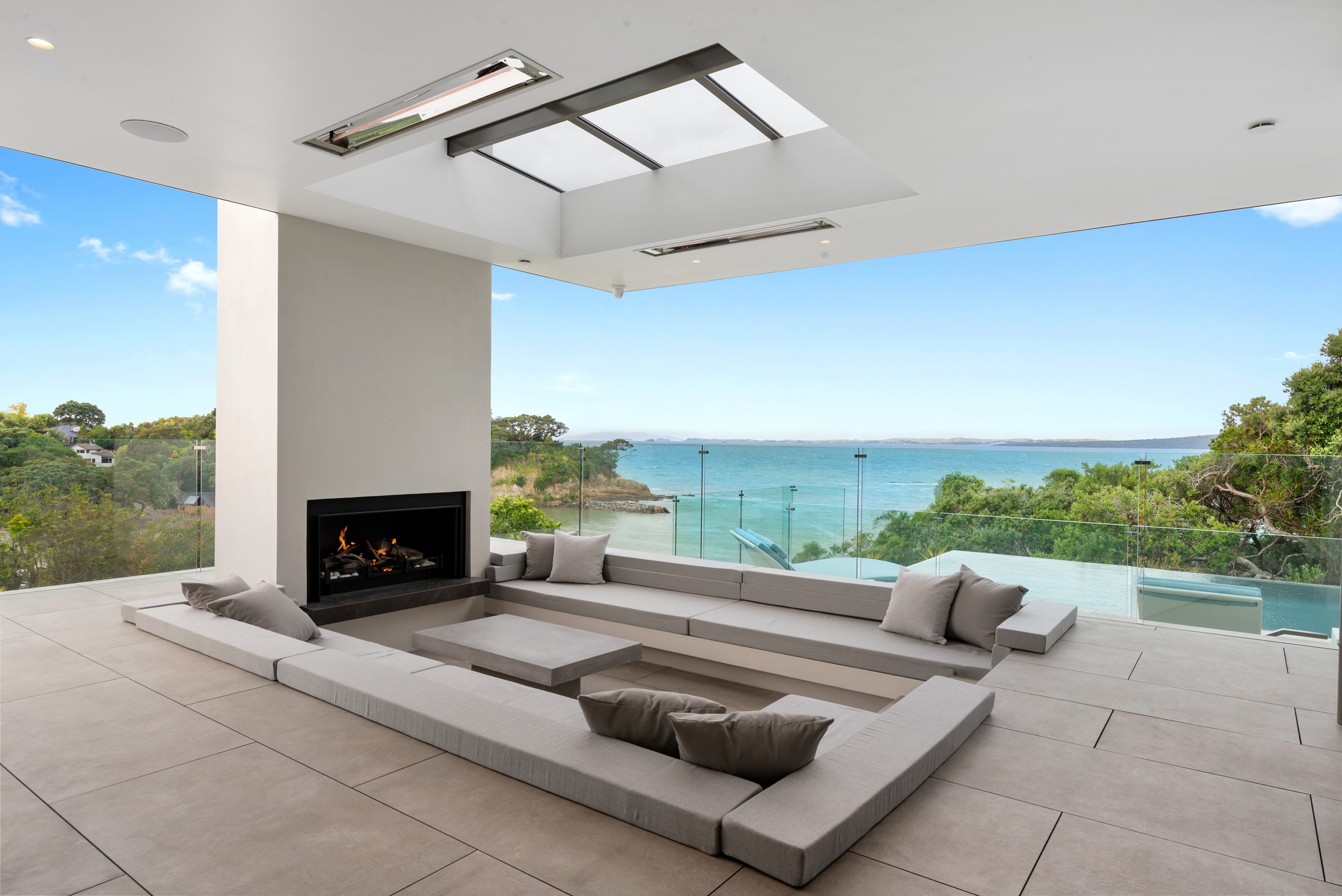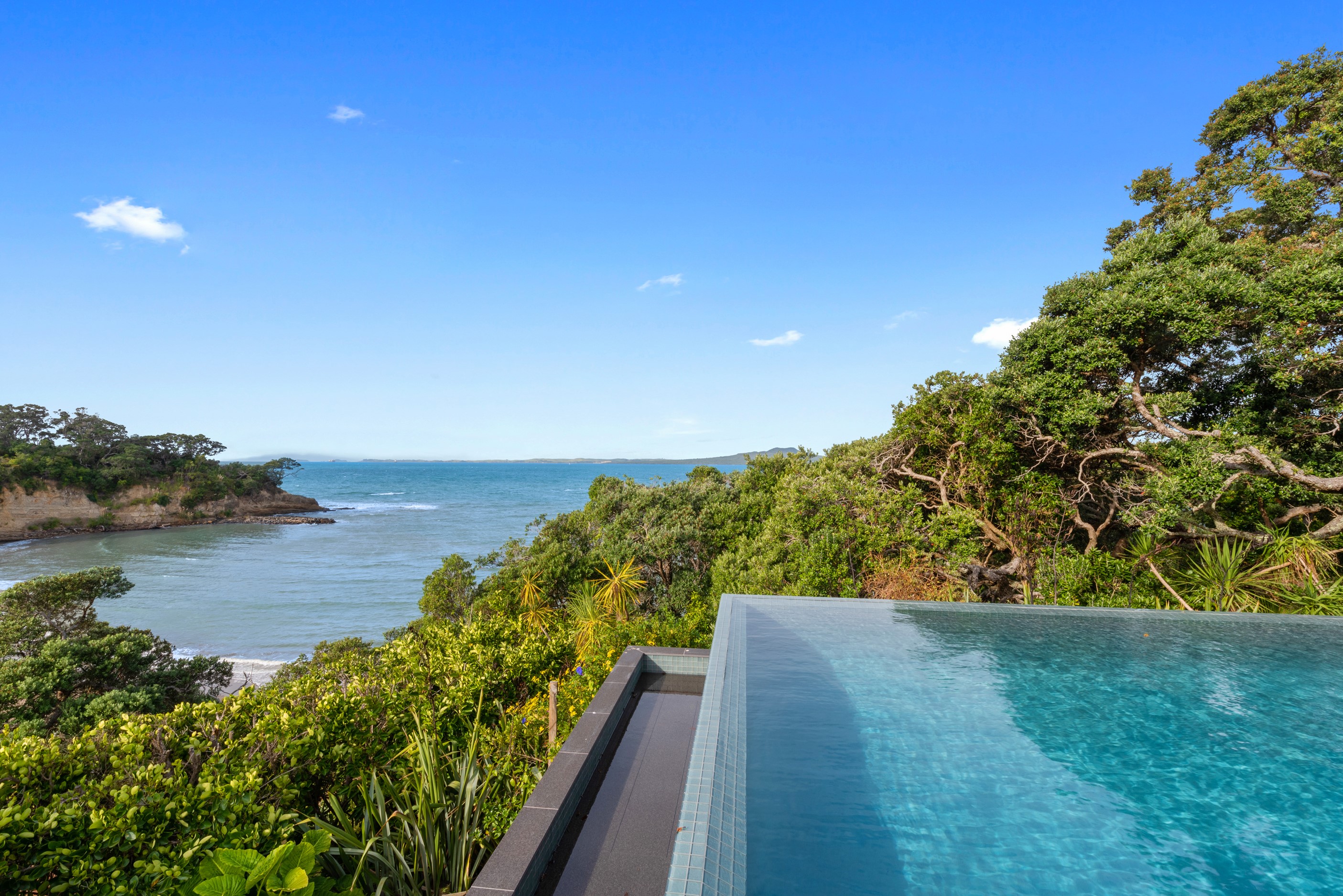 Designed and built for a returning Kiwi couple and their young family, this complex build required precision planning. The site was excavated at the clifftop and extensive drilling and ground anchors help support the weight of this substantial new home and pool. There are multiple different levels to this magnificent build, all formed in concrete – excluding the top floor, which is timber. A sunken outdoor seating area with a built-in fireplace and recessed heating to the soffits has prime position overlooking the pool and Castor Bay Beach below. The home is designed for large-family living with five bedrooms and bathrooms. Three more bedrooms and four bathrooms are located in a separate luxury guest wing. For entertaining, relaxing and just plain fun, there’s a cantilevered infinity pool with a built-in spa. And there’s an expansive covered deck with a barbecue area boasting 180-degree views of the Hauraki Gulf. The cladding combines plastered concrete, stained-cedar vertical weatherboards, stone and metal. A comprehensive automation system allows almost everything in the home to be operated from a device.