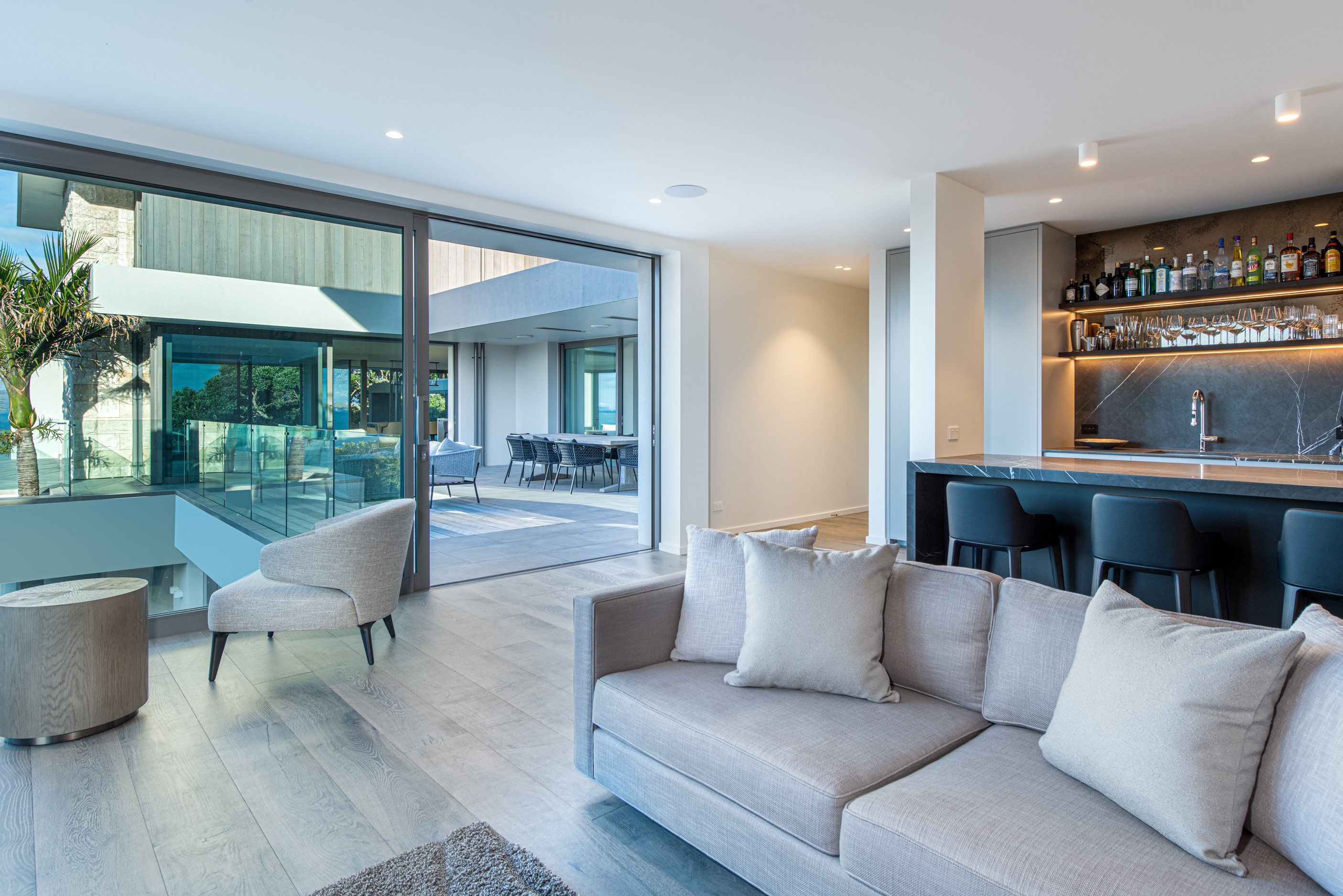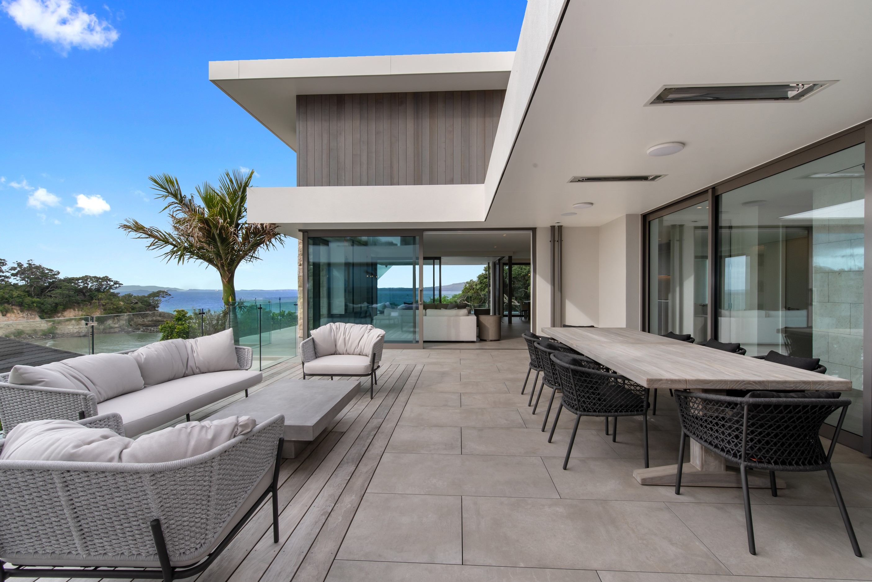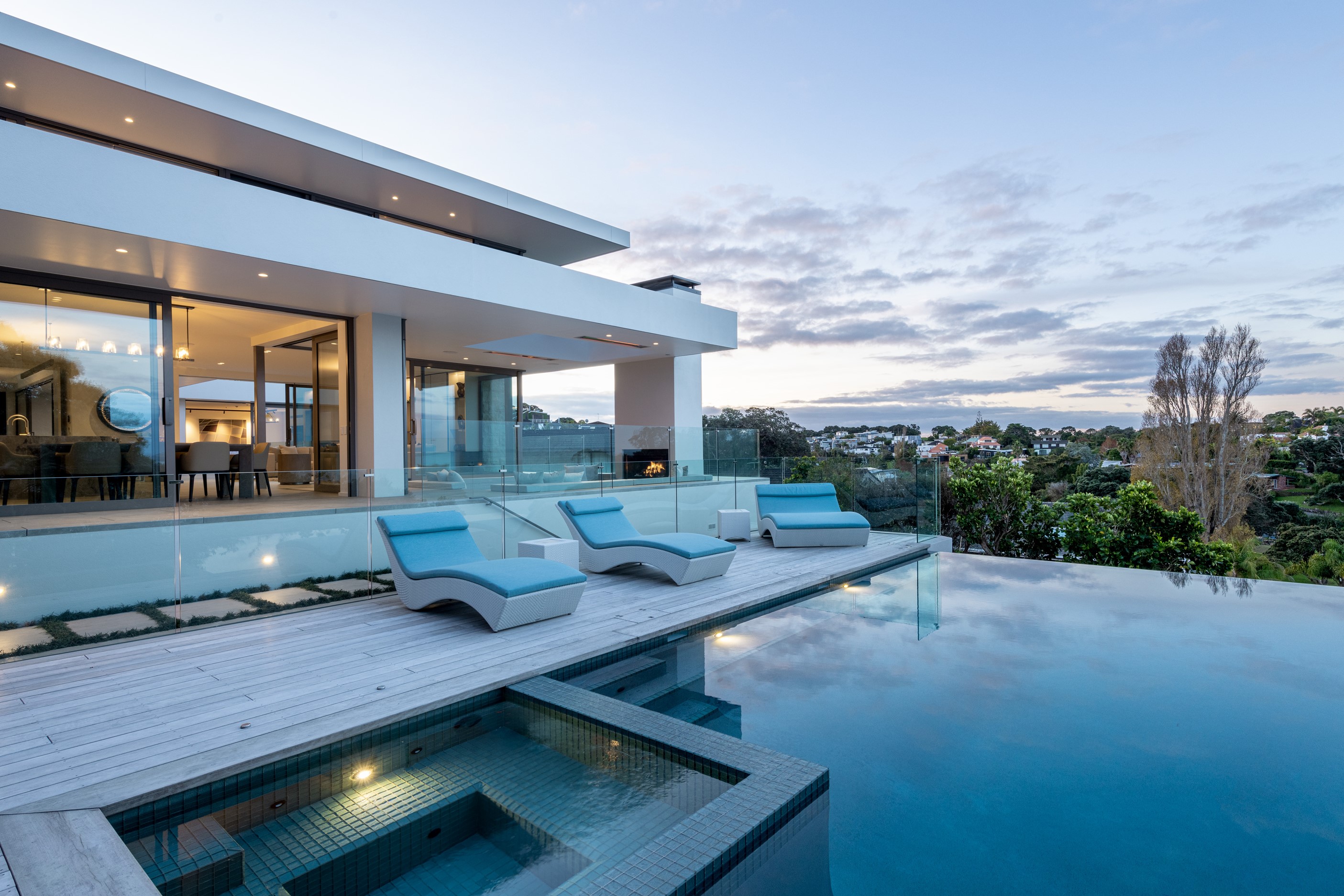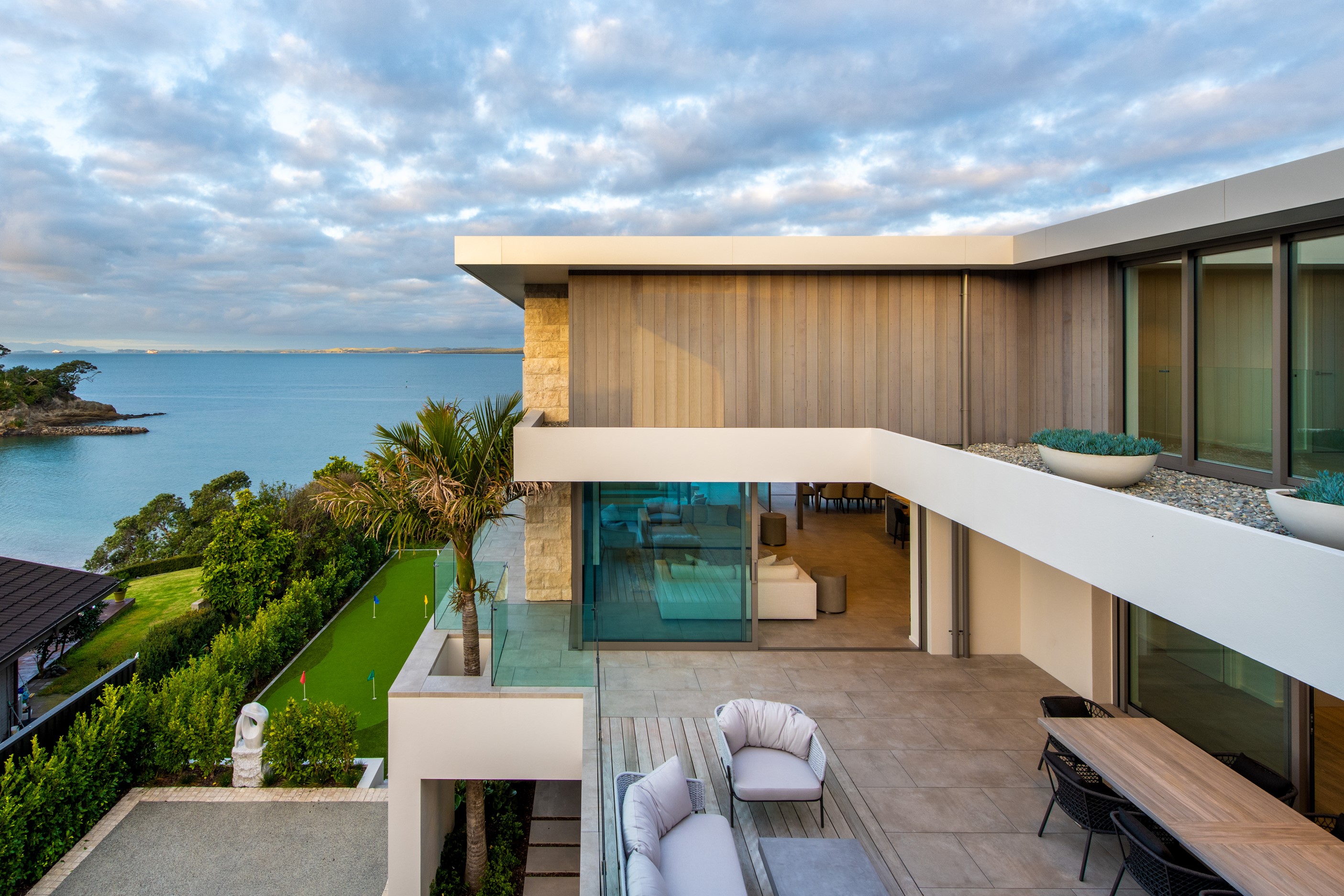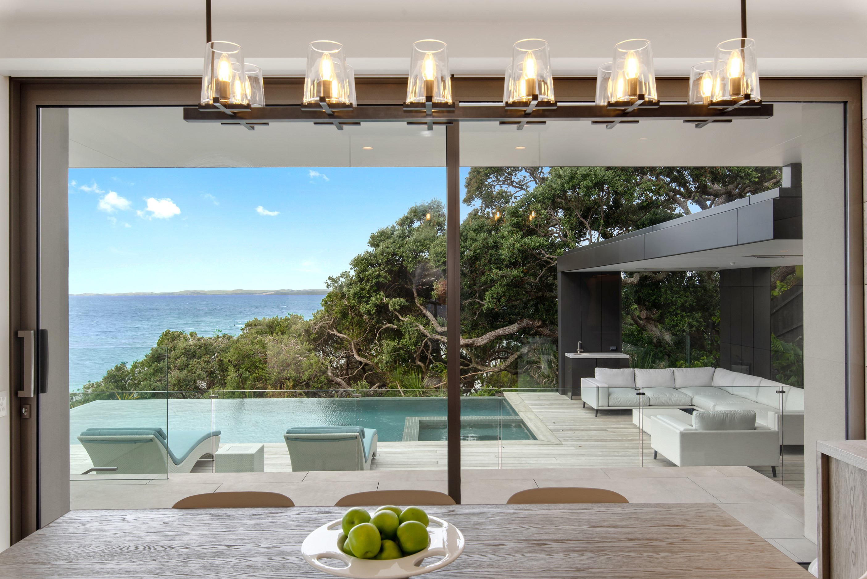 Designed and built for a returning Kiwi couple and their young family, this complex build required precision planning. The site was excavated at the clifftop and extensive drilling and ground anchors help support the weight of this substantial new home and pool. There are multiple different levels to this magnificent build, all formed in concrete – excluding the top floor, which is timber. A sunken outdoor seating area with a built-in fireplace and recessed heating to the soffits has prime position overlooking the pool and Castor Bay Beach below. The home is designed for large-family living with five bedrooms and bathrooms. Three more bedrooms and four bathrooms are located in a separate luxury guest wing. For entertaining, relaxing and just plain fun, there’s a cantilevered infinity pool with a built-in spa. And there’s an expansive covered deck with a barbecue area boasting 180-degree views of the Hauraki Gulf. The cladding combines plastered concrete, stained-cedar vertical weatherboards, stone and metal. A comprehensive automation system allows almost everything in the home to be operated from a device.