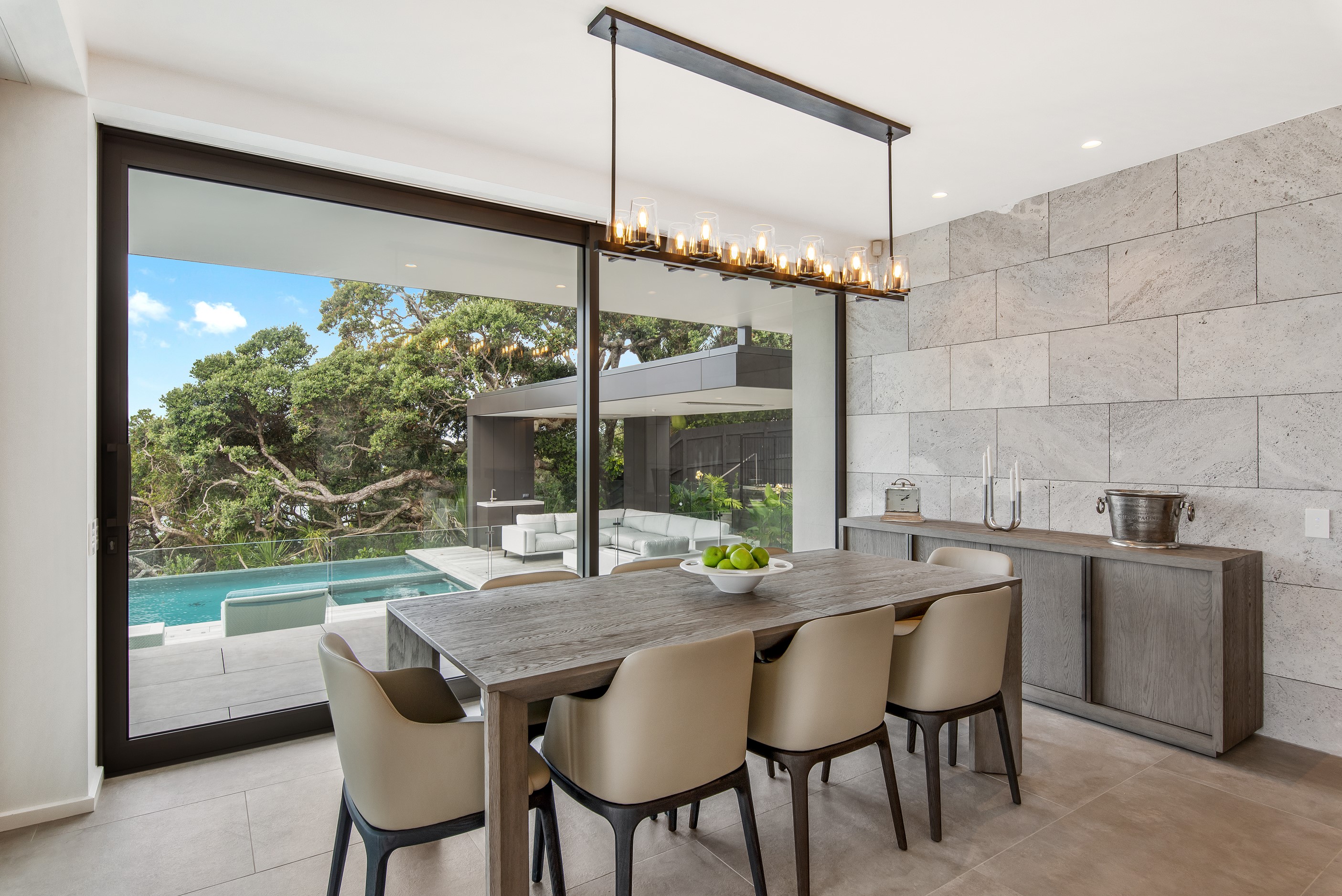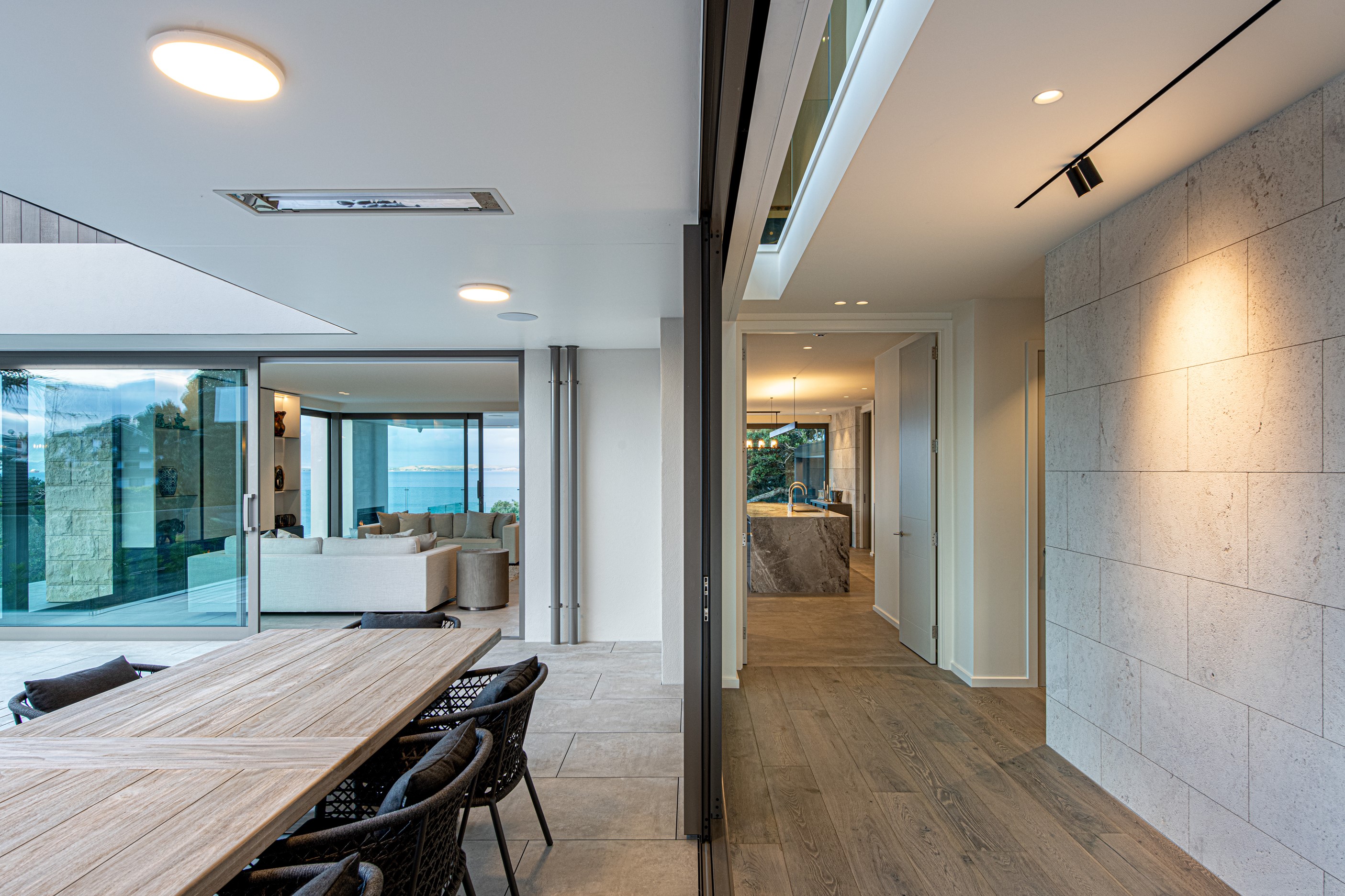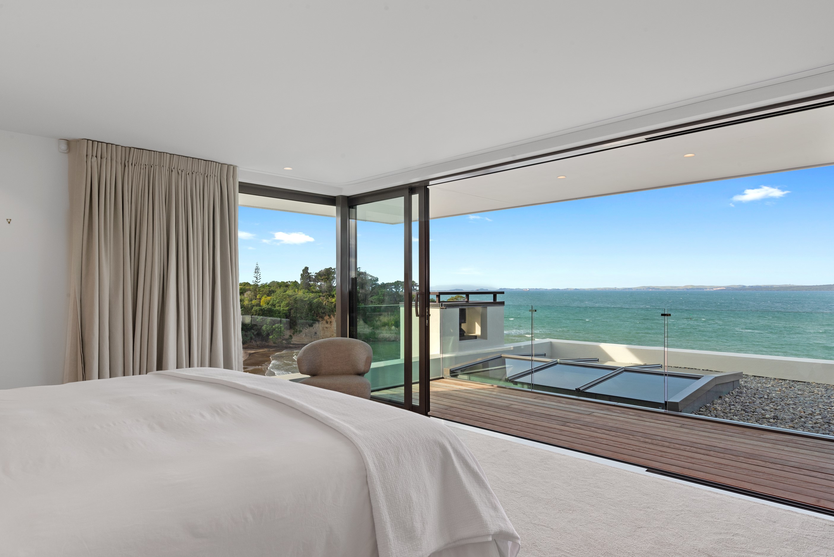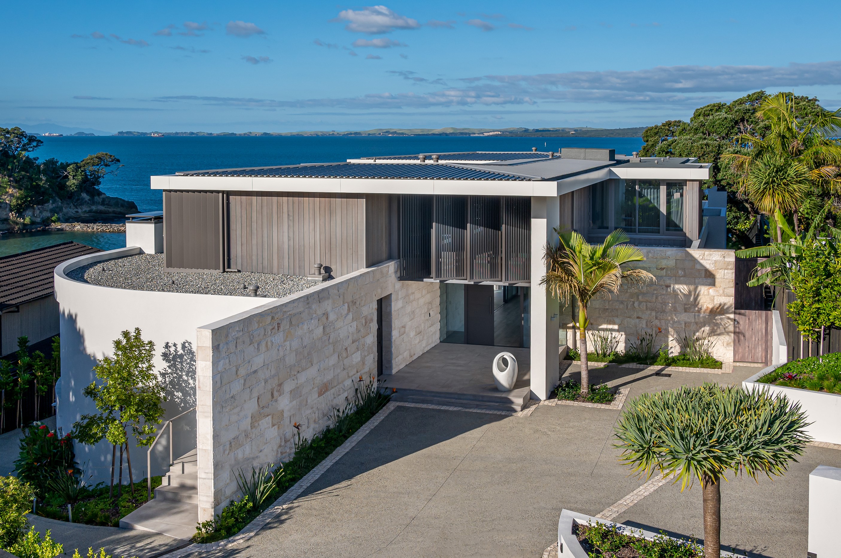 Designed and built for a returning Kiwi couple and their young family, this complex build required precision planning. The site was excavated at the clifftop and extensive drilling and ground anchors help support the weight of this substantial new home and pool. There are multiple different levels to this magnificent build, all formed in concrete – excluding the top floor, which is timber. A sunken outdoor seating area with a built-in fireplace and recessed heating to the soffits has prime position overlooking the pool and Castor Bay Beach below. The home is designed for large-family living with five bedrooms and bathrooms. Three more bedrooms and four bathrooms are located in a separate luxury guest wing. For entertaining, relaxing and just plain fun, there’s a cantilevered infinity pool with a built-in spa. And there’s an expansive covered deck with a barbecue area boasting 180-degree views of the Hauraki Gulf. The cladding combines plastered concrete, stained-cedar vertical weatherboards, stone and metal. A comprehensive automation system allows almost everything in the home to be operated from a device.