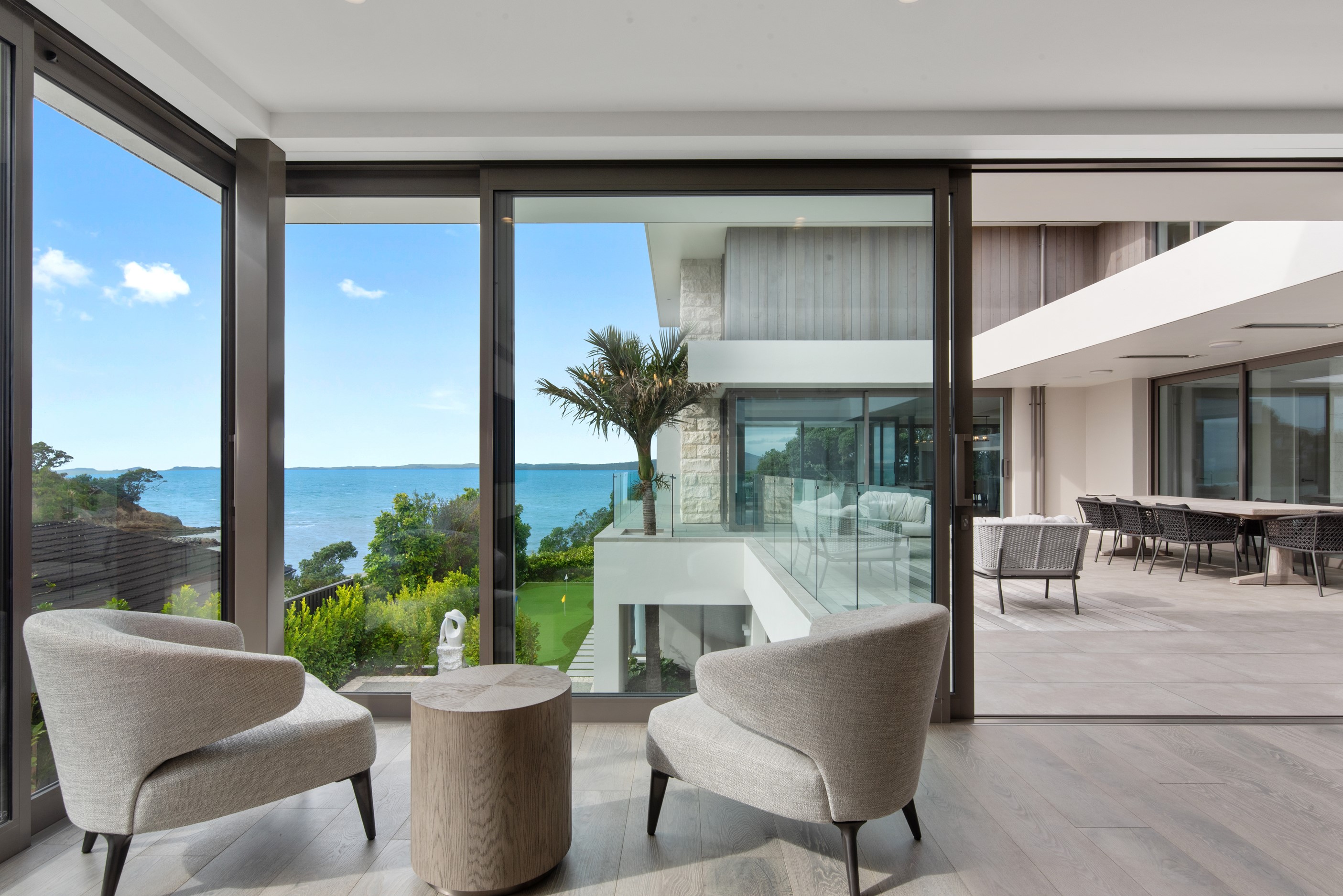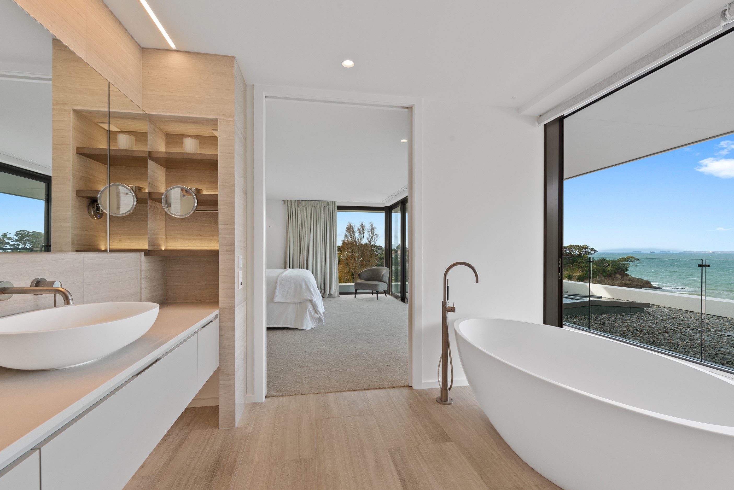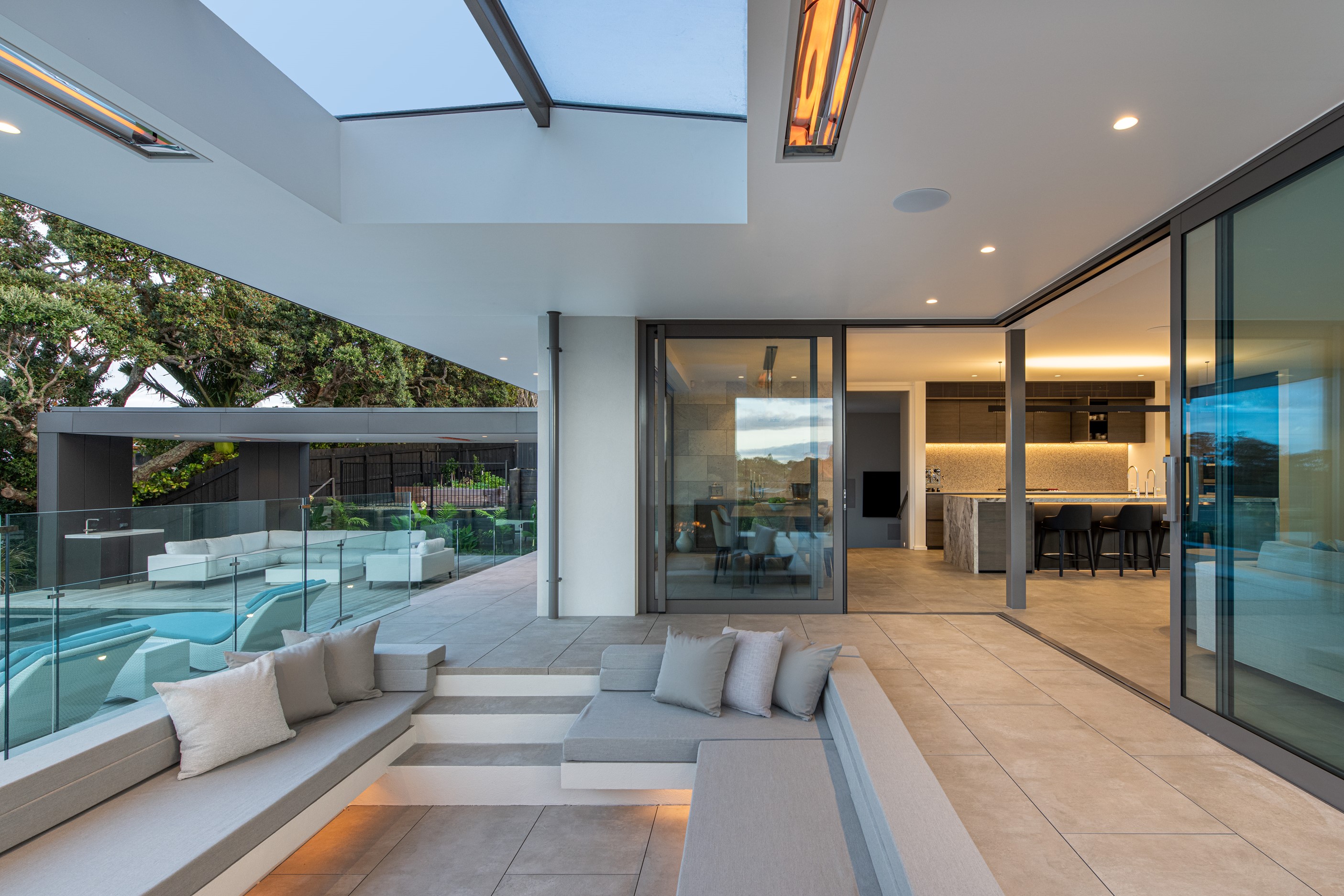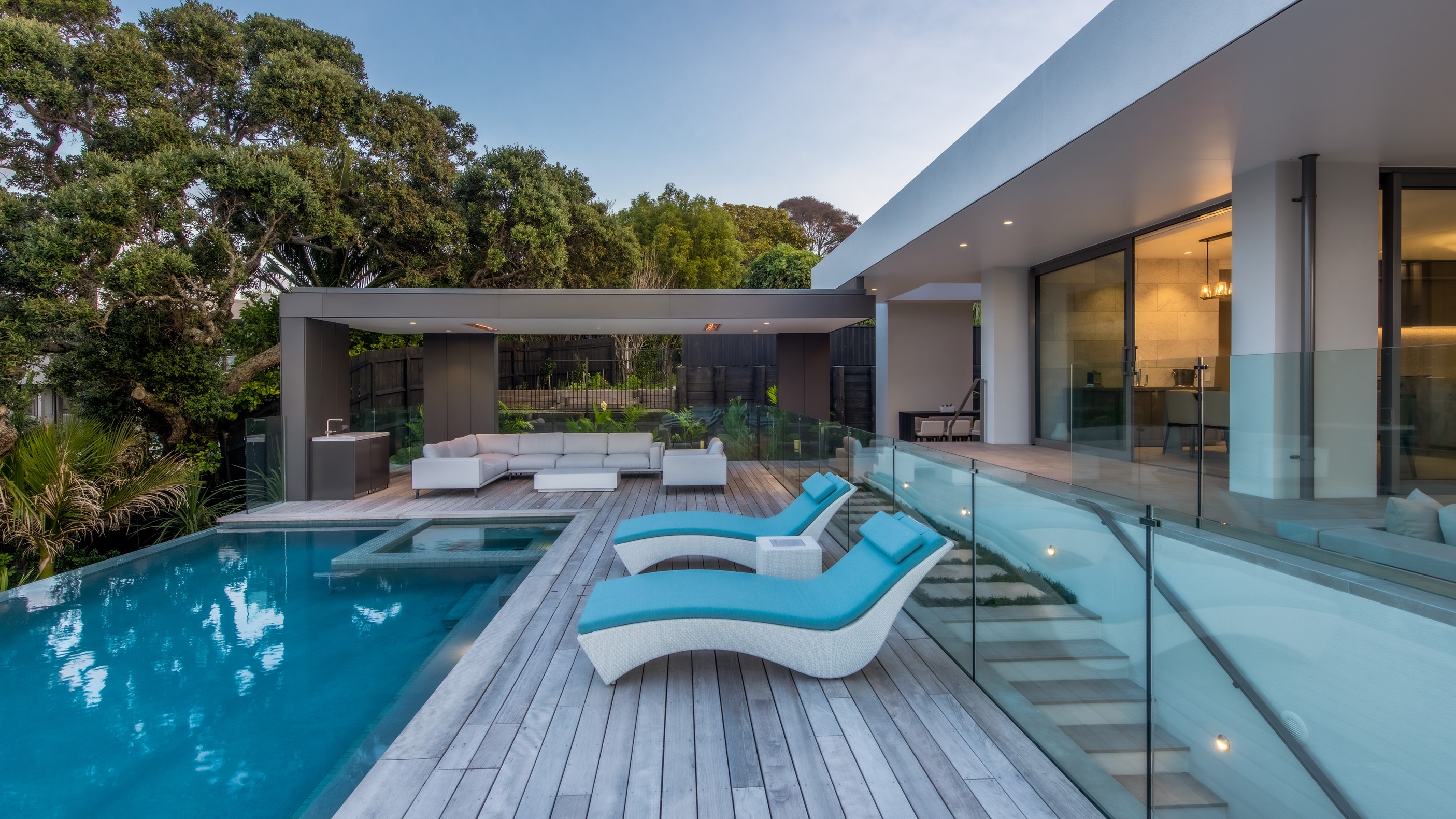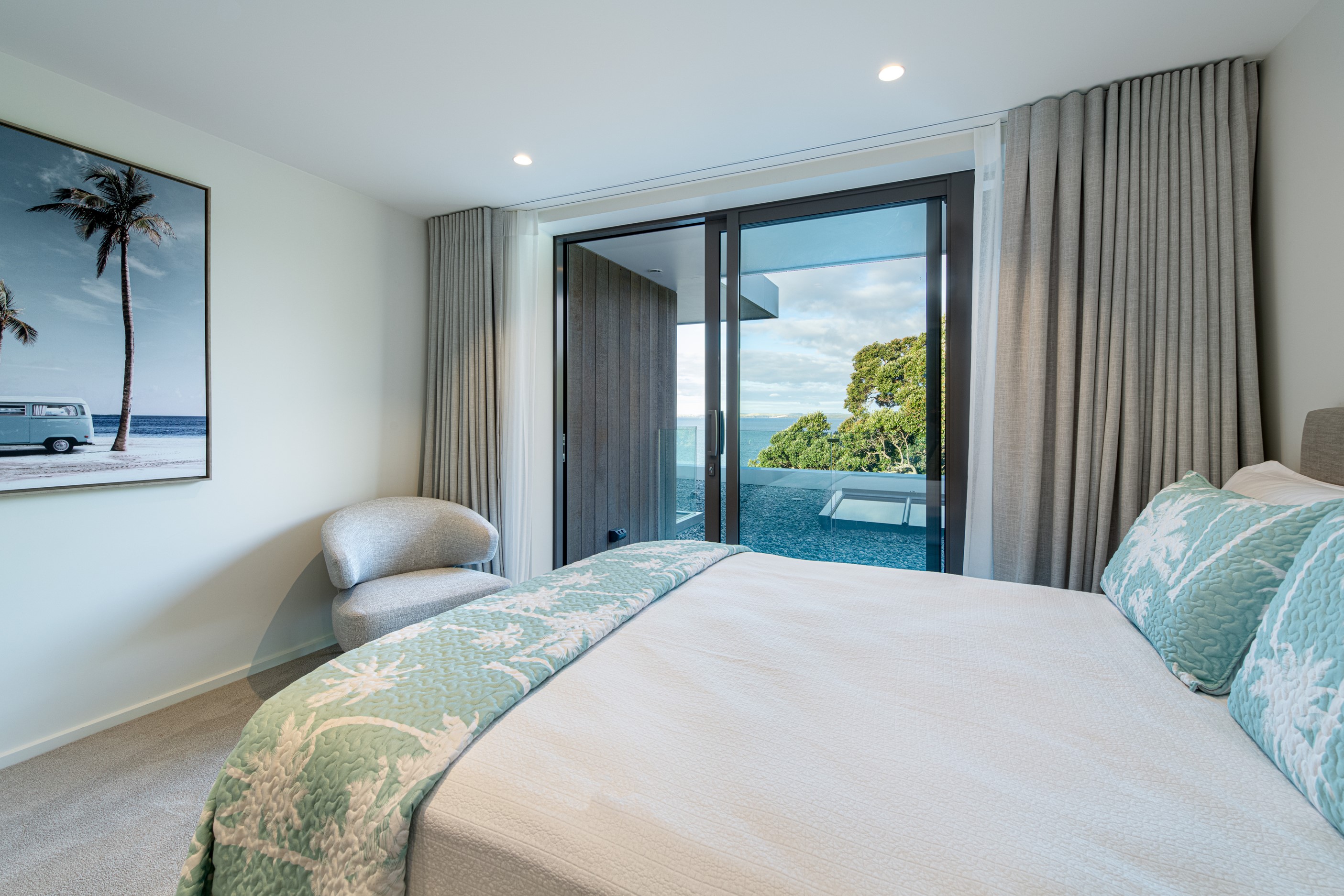 Designed and built for a returning Kiwi couple and their young family, this complex build required precision planning. The site was excavated at the clifftop and extensive drilling and ground anchors help support the weight of this substantial new home and pool. There are multiple different levels to this magnificent build, all formed in concrete – excluding the top floor, which is timber. A sunken outdoor seating area with a built-in fireplace and recessed heating to the soffits has prime position overlooking the pool and Castor Bay Beach below. The home is designed for large-family living with five bedrooms and bathrooms. Three more bedrooms and four bathrooms are located in a separate luxury guest wing. For entertaining, relaxing and just plain fun, there’s a cantilevered infinity pool with a built-in spa. And there’s an expansive covered deck with a barbecue area boasting 180-degree views of the Hauraki Gulf. The cladding combines plastered concrete, stained-cedar vertical weatherboards, stone and metal. A comprehensive automation system allows almost everything in the home to be operated from a device.