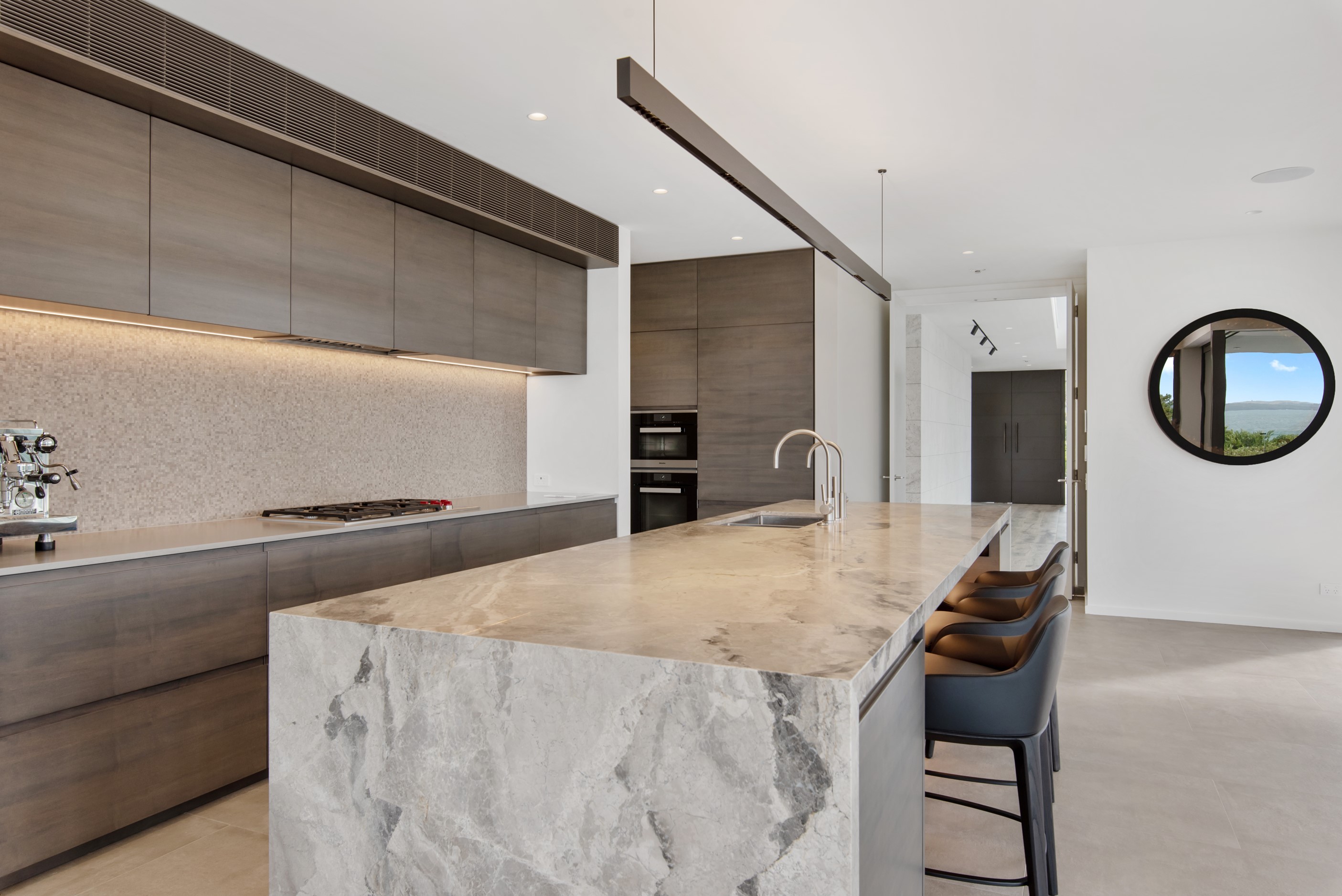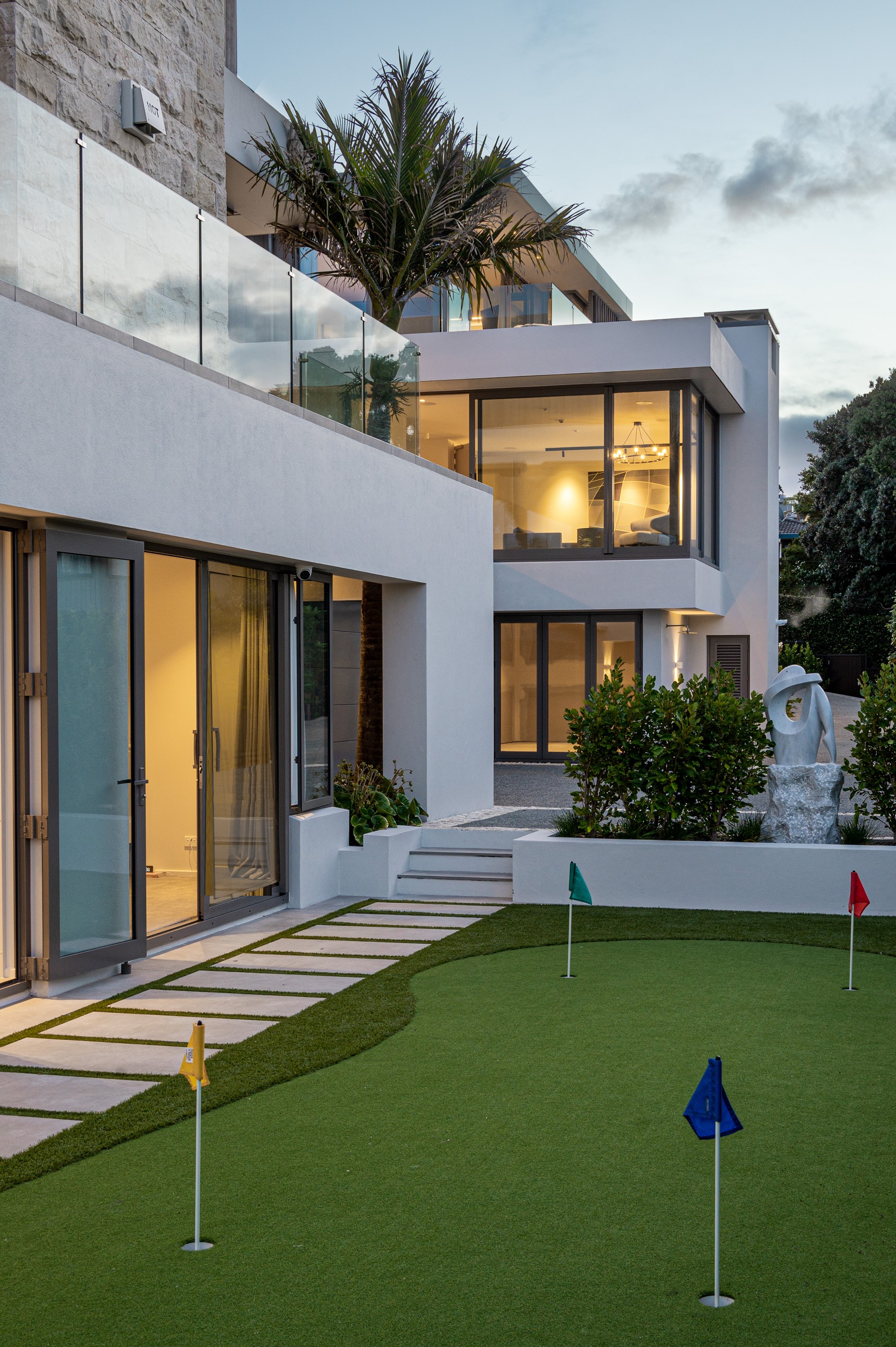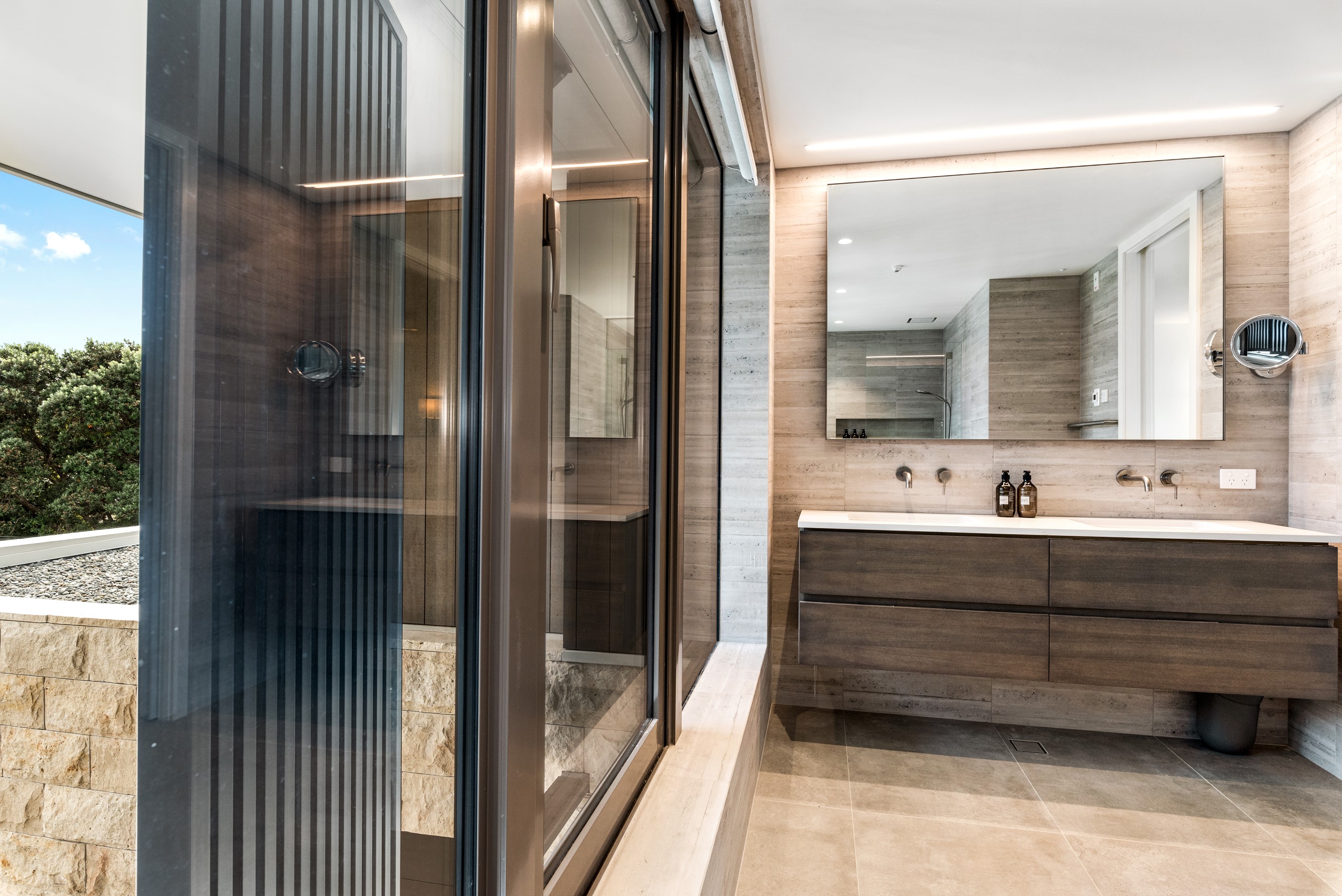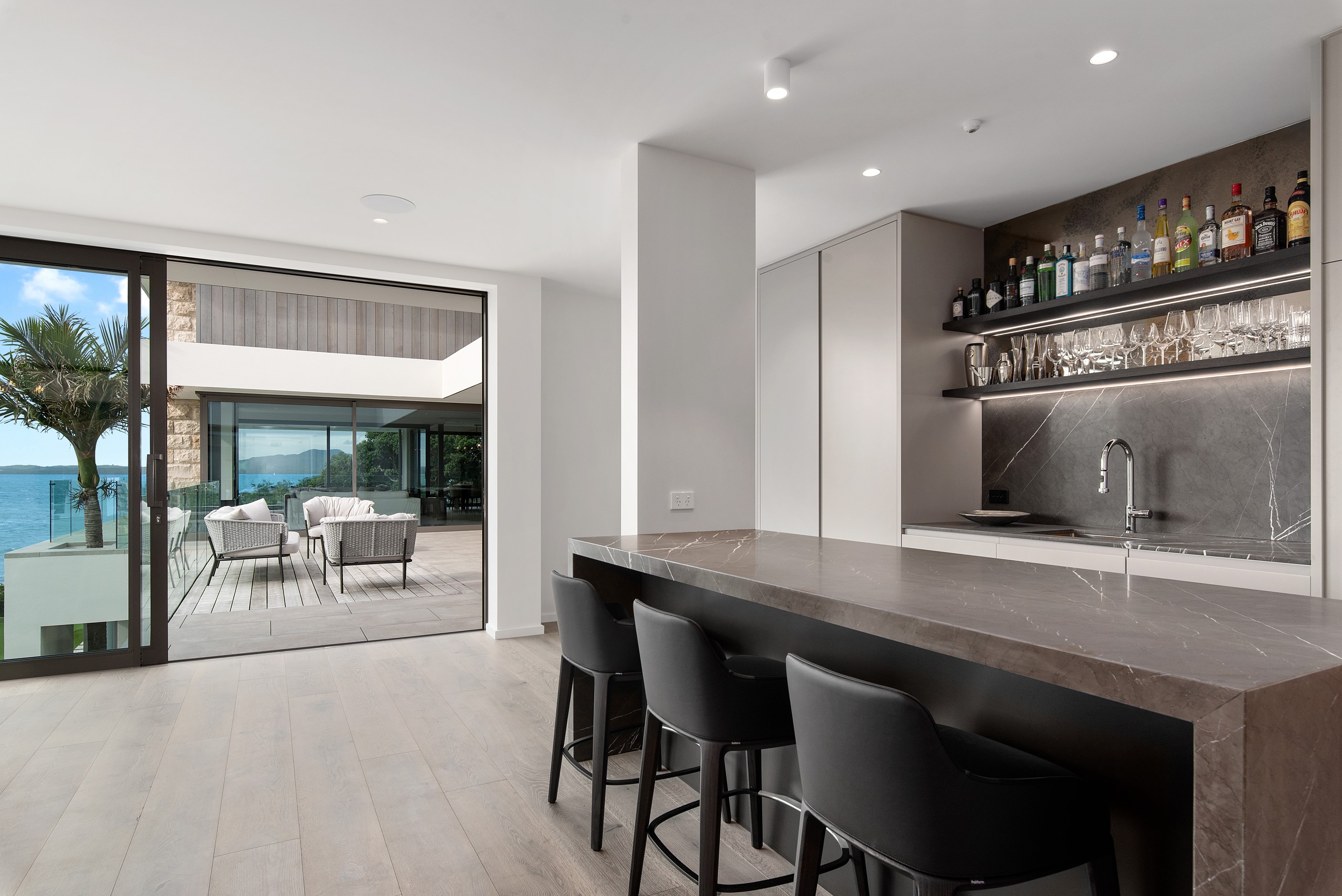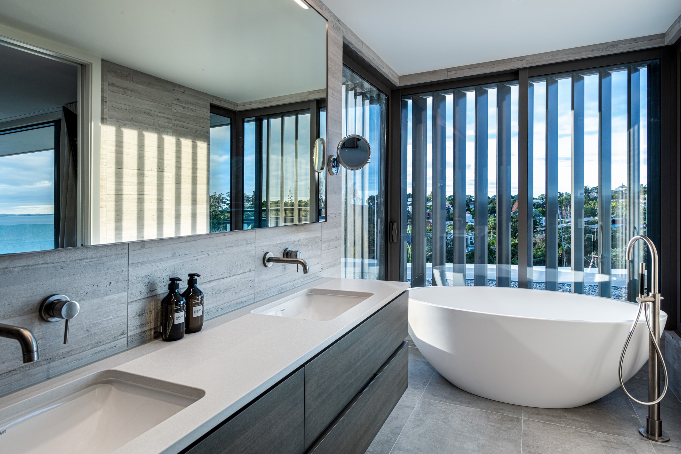 Designed and built for a returning Kiwi couple and their young family, this complex build required precision planning. The site was excavated at the clifftop and extensive drilling and ground anchors help support the weight of this substantial new home and pool. There are multiple different levels to this magnificent build, all formed in concrete – excluding the top floor, which is timber. A sunken outdoor seating area with a built-in fireplace and recessed heating to the soffits has prime position overlooking the pool and Castor Bay Beach below. The home is designed for large-family living with five bedrooms and bathrooms. Three more bedrooms and four bathrooms are located in a separate luxury guest wing. For entertaining, relaxing and just plain fun, there’s a cantilevered infinity pool with a built-in spa. And there’s an expansive covered deck with a barbecue area boasting 180-degree views of the Hauraki Gulf. The cladding combines plastered concrete, stained-cedar vertical weatherboards, stone and metal. A comprehensive automation system allows almost everything in the home to be operated from a device.