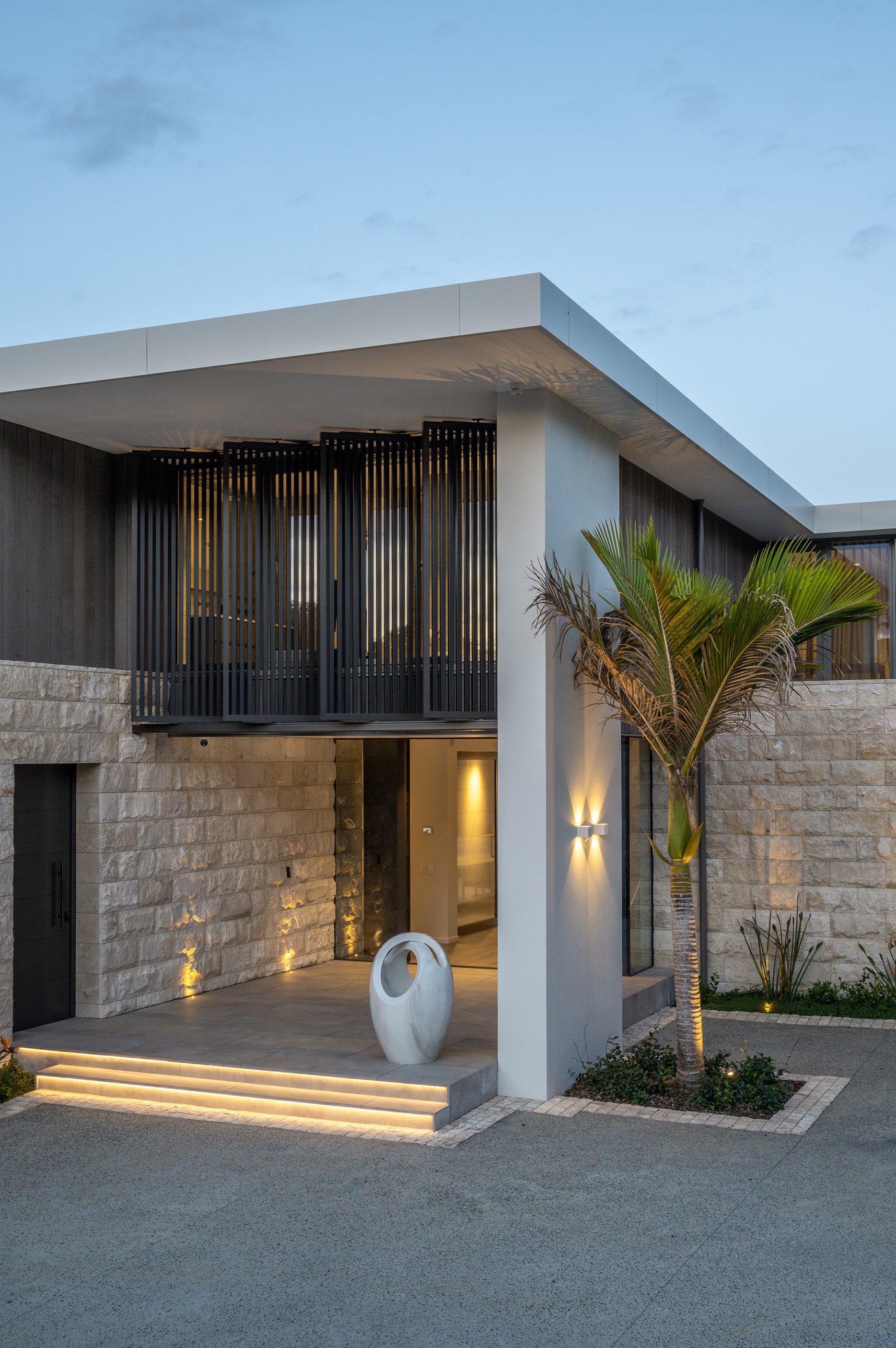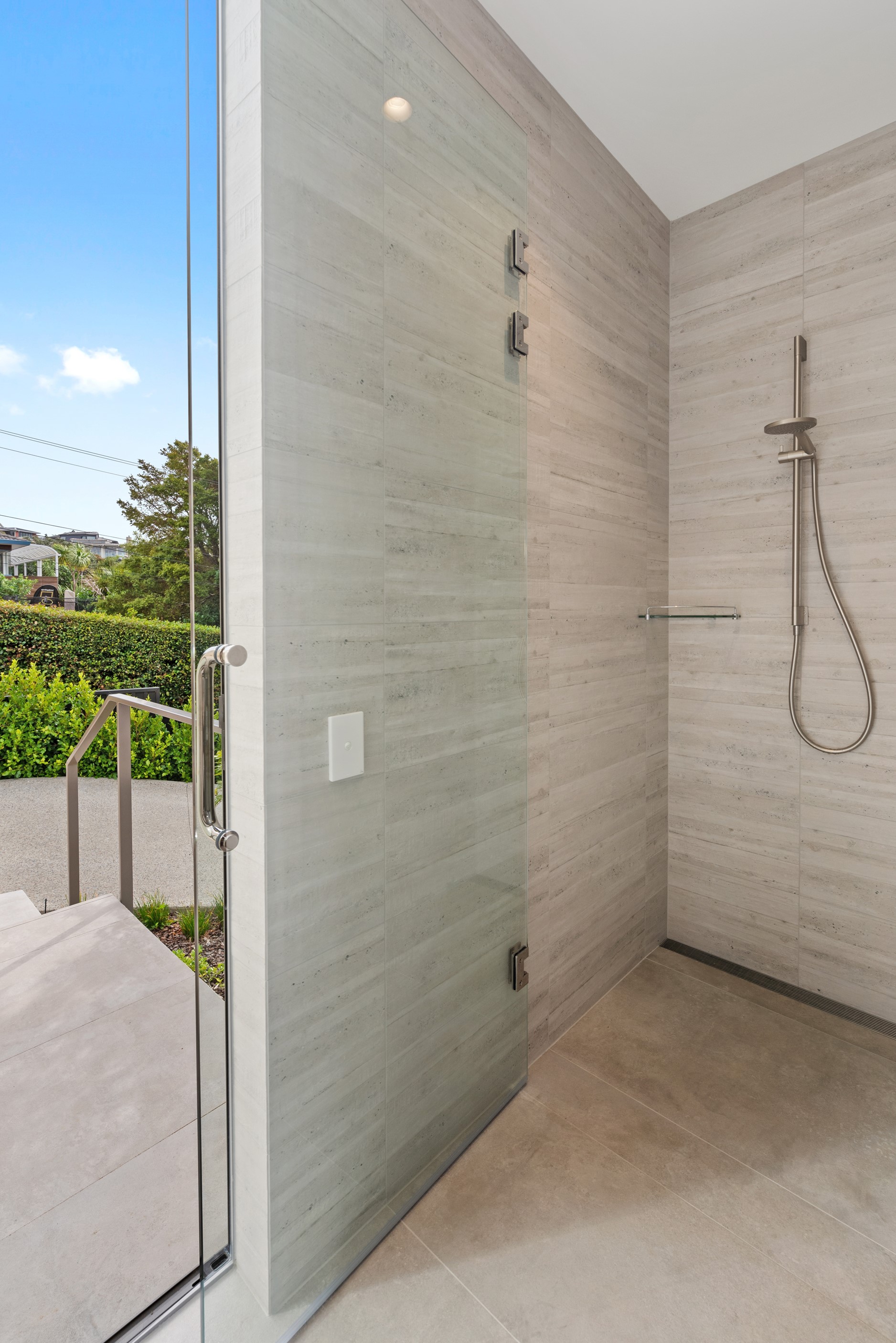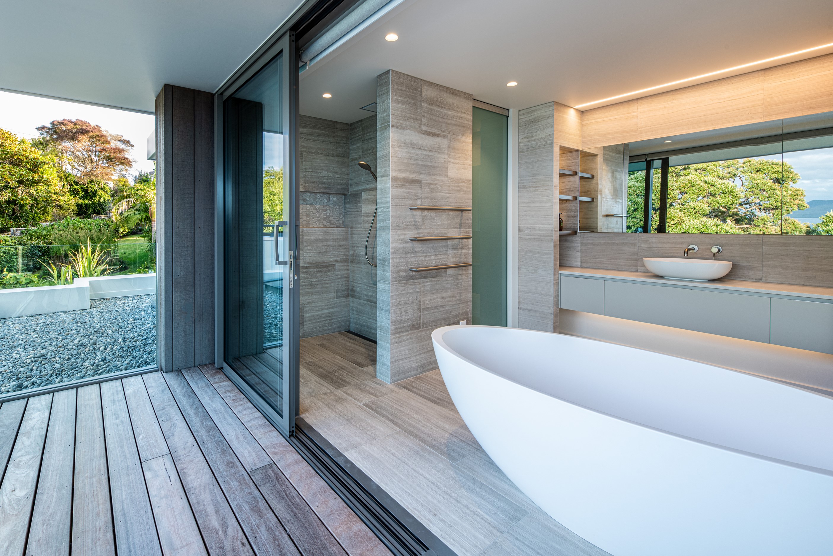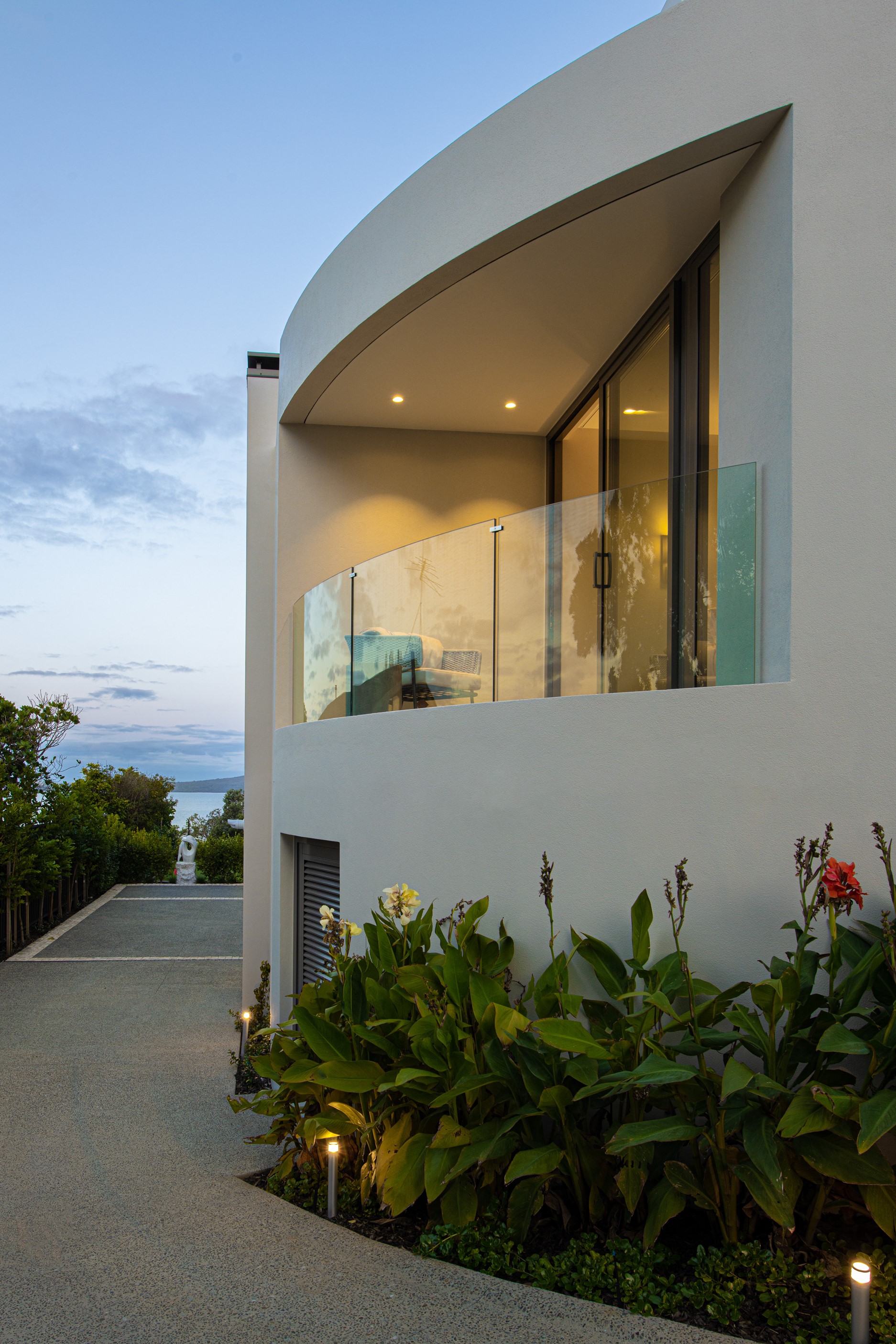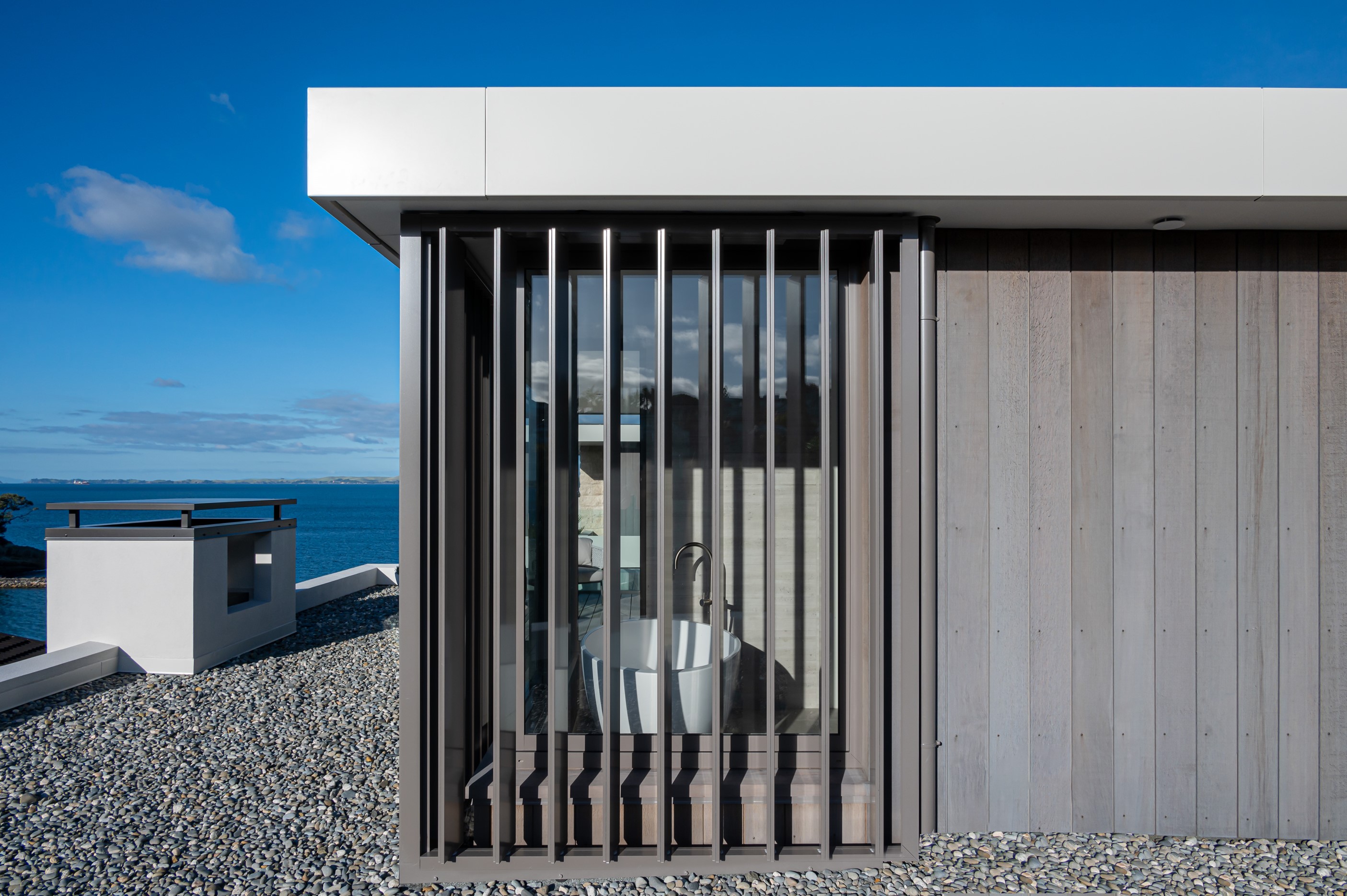 Designed and built for a returning Kiwi couple and their young family, this complex build required precision planning. The site was excavated at the clifftop and extensive drilling and ground anchors help support the weight of this substantial new home and pool. There are multiple different levels to this magnificent build, all formed in concrete – excluding the top floor, which is timber. A sunken outdoor seating area with a built-in fireplace and recessed heating to the soffits has prime position overlooking the pool and Castor Bay Beach below. The home is designed for large-family living with five bedrooms and bathrooms. Three more bedrooms and four bathrooms are located in a separate luxury guest wing. For entertaining, relaxing and just plain fun, there’s a cantilevered infinity pool with a built-in spa. And there’s an expansive covered deck with a barbecue area boasting 180-degree views of the Hauraki Gulf. The cladding combines plastered concrete, stained-cedar vertical weatherboards, stone and metal. A comprehensive automation system allows almost everything in the home to be operated from a device.