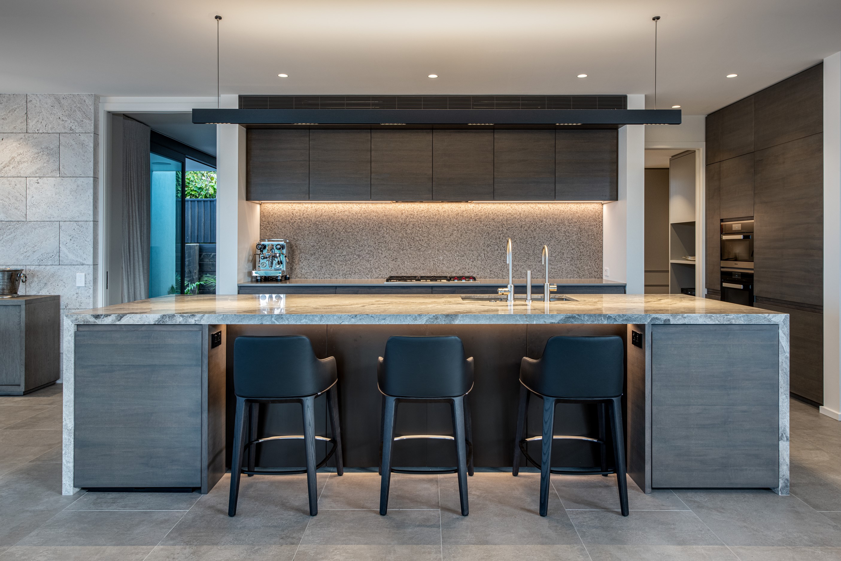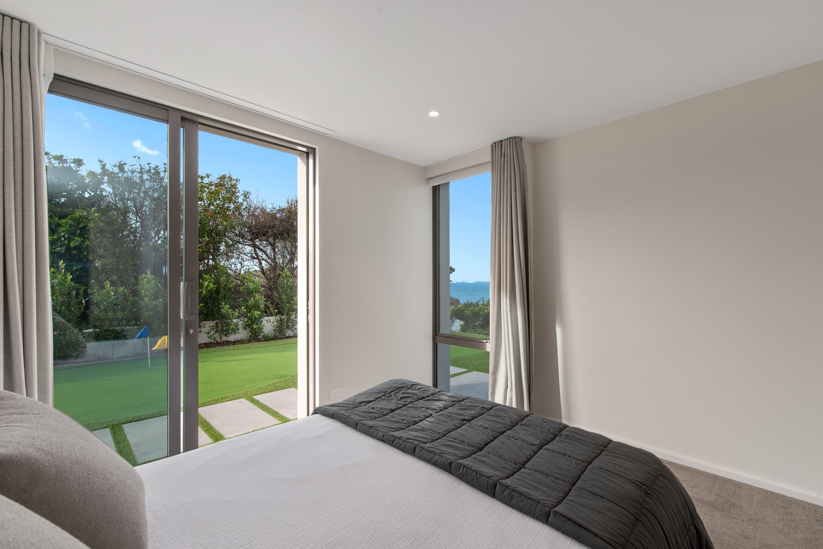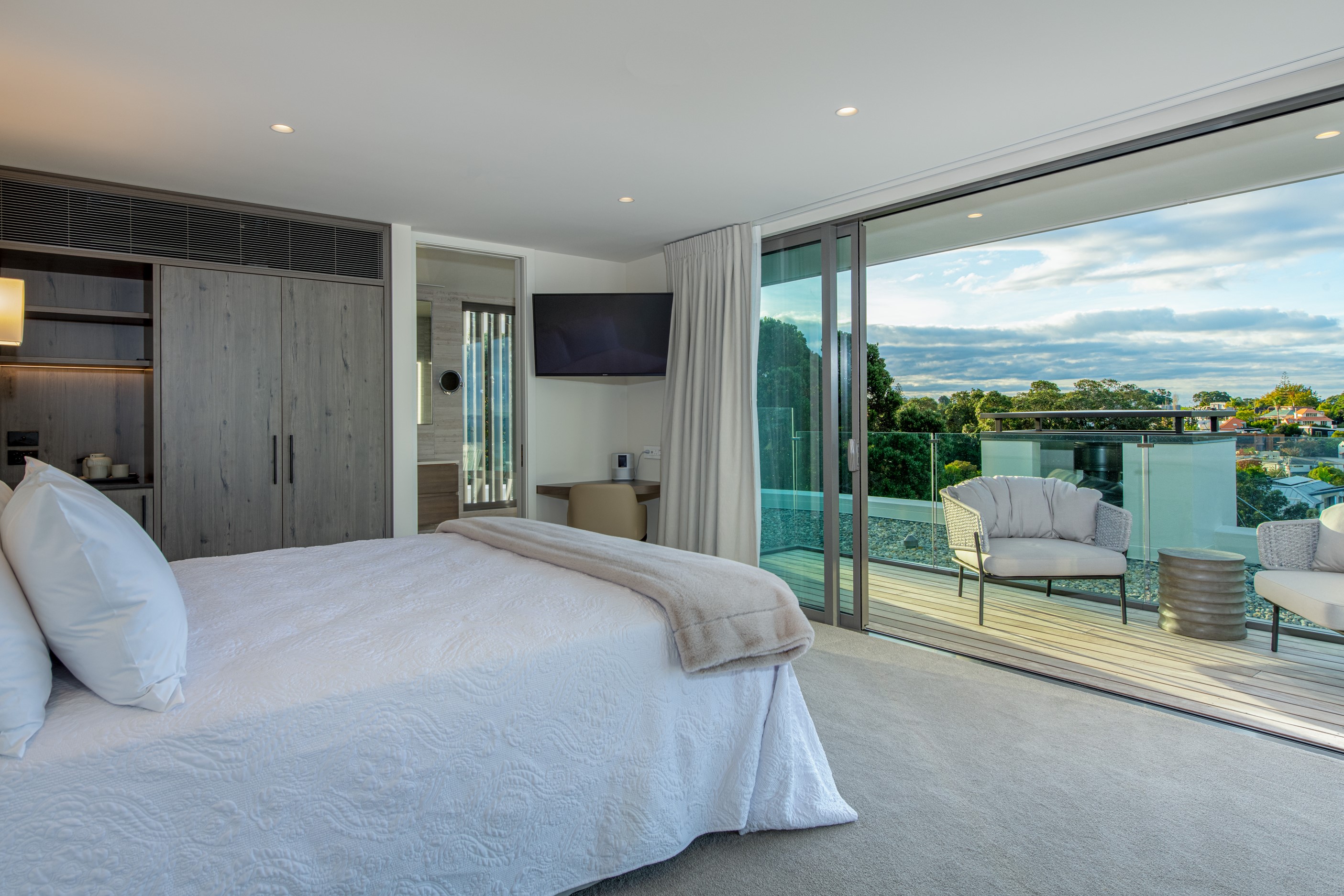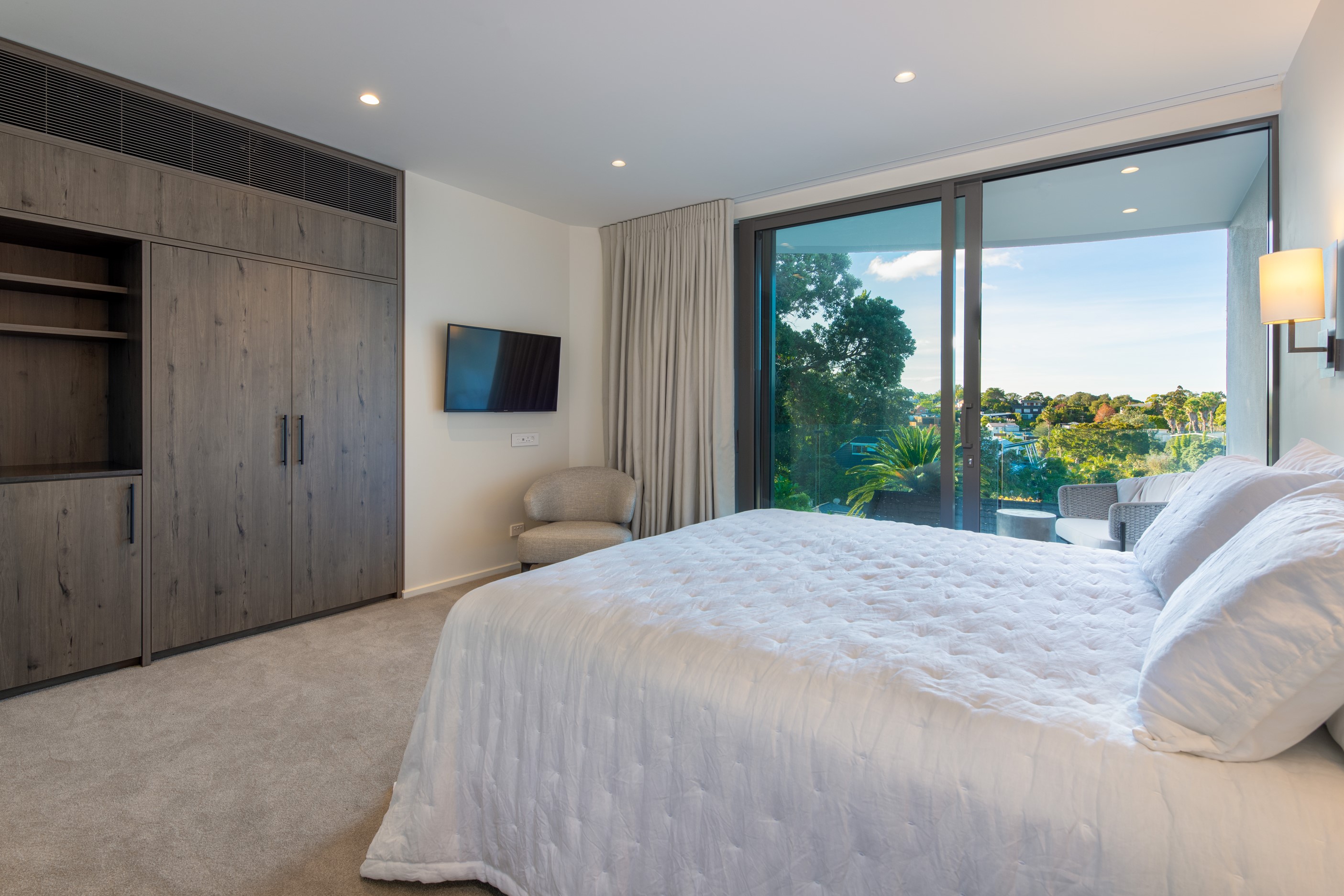 Designed and built for a returning Kiwi couple and their young family, this complex build required precision planning. The site was excavated at the clifftop and extensive drilling and ground anchors help support the weight of this substantial new home and pool. There are multiple different levels to this magnificent build, all formed in concrete – excluding the top floor, which is timber. A sunken outdoor seating area with a built-in fireplace and recessed heating to the soffits has prime position overlooking the pool and Castor Bay Beach below. The home is designed for large-family living with five bedrooms and bathrooms. Three more bedrooms and four bathrooms are located in a separate luxury guest wing. For entertaining, relaxing and just plain fun, there’s a cantilevered infinity pool with a built-in spa. And there’s an expansive covered deck with a barbecue area boasting 180-degree views of the Hauraki Gulf. The cladding combines plastered concrete, stained-cedar vertical weatherboards, stone and metal. A comprehensive automation system allows almost everything in the home to be operated from a device.