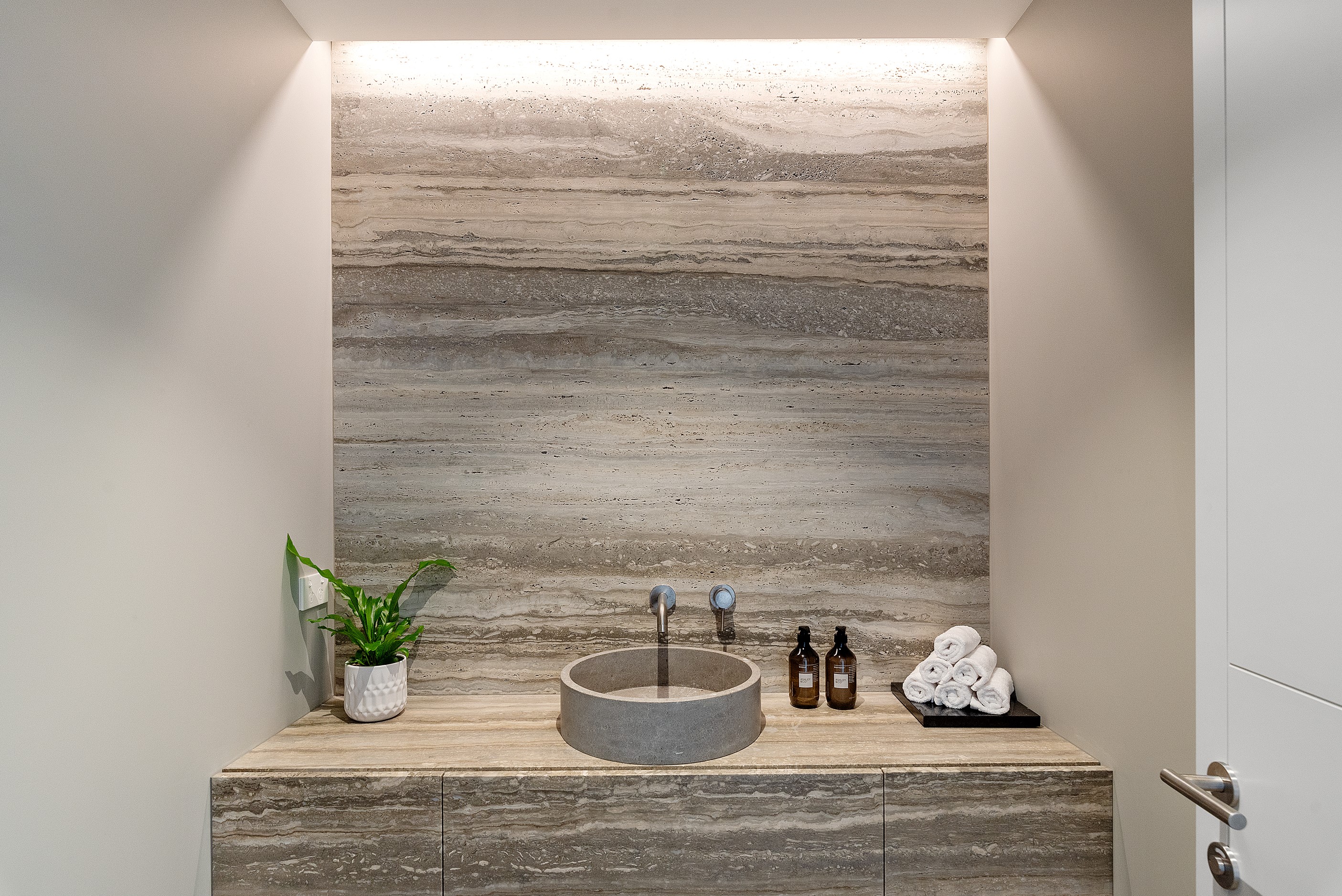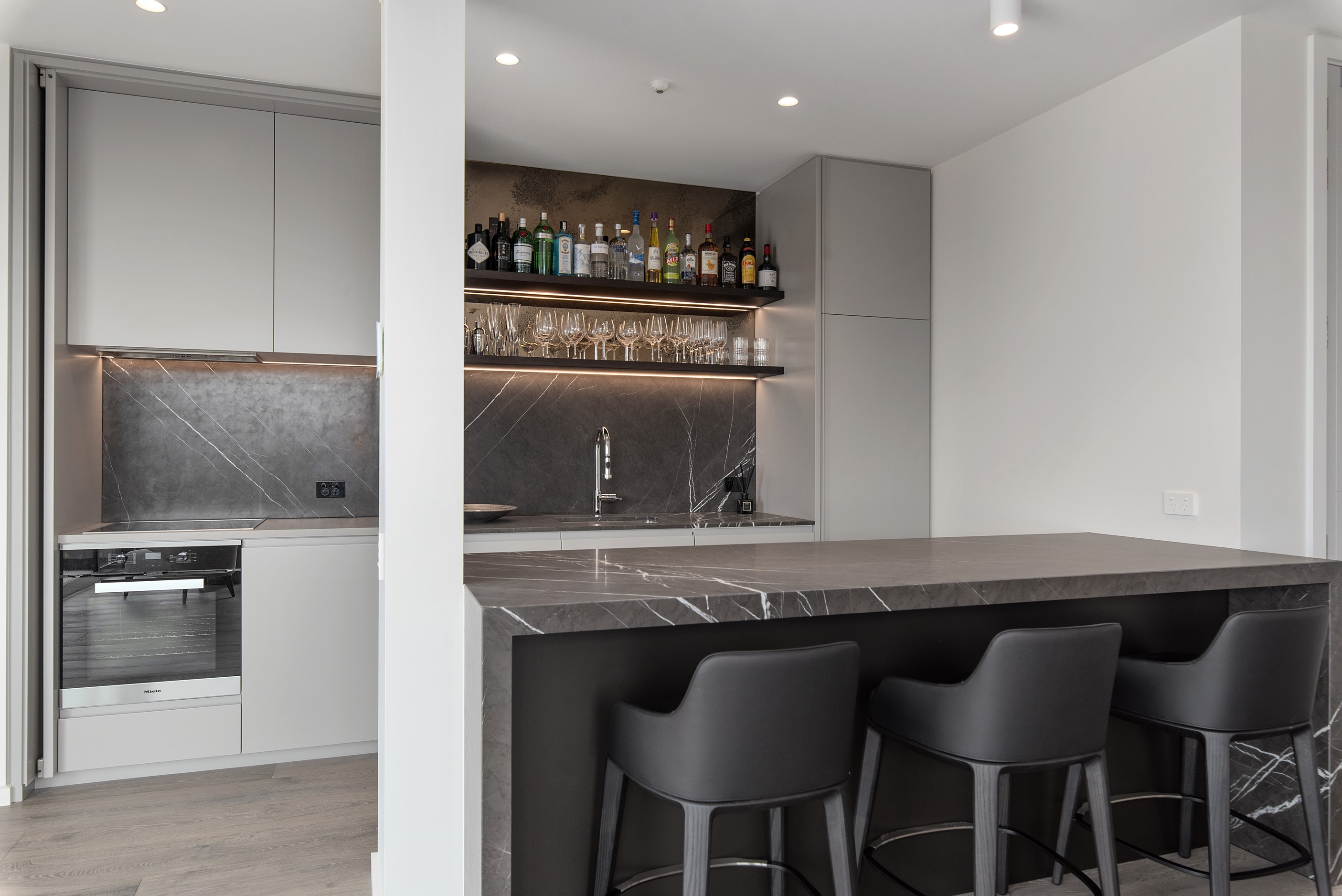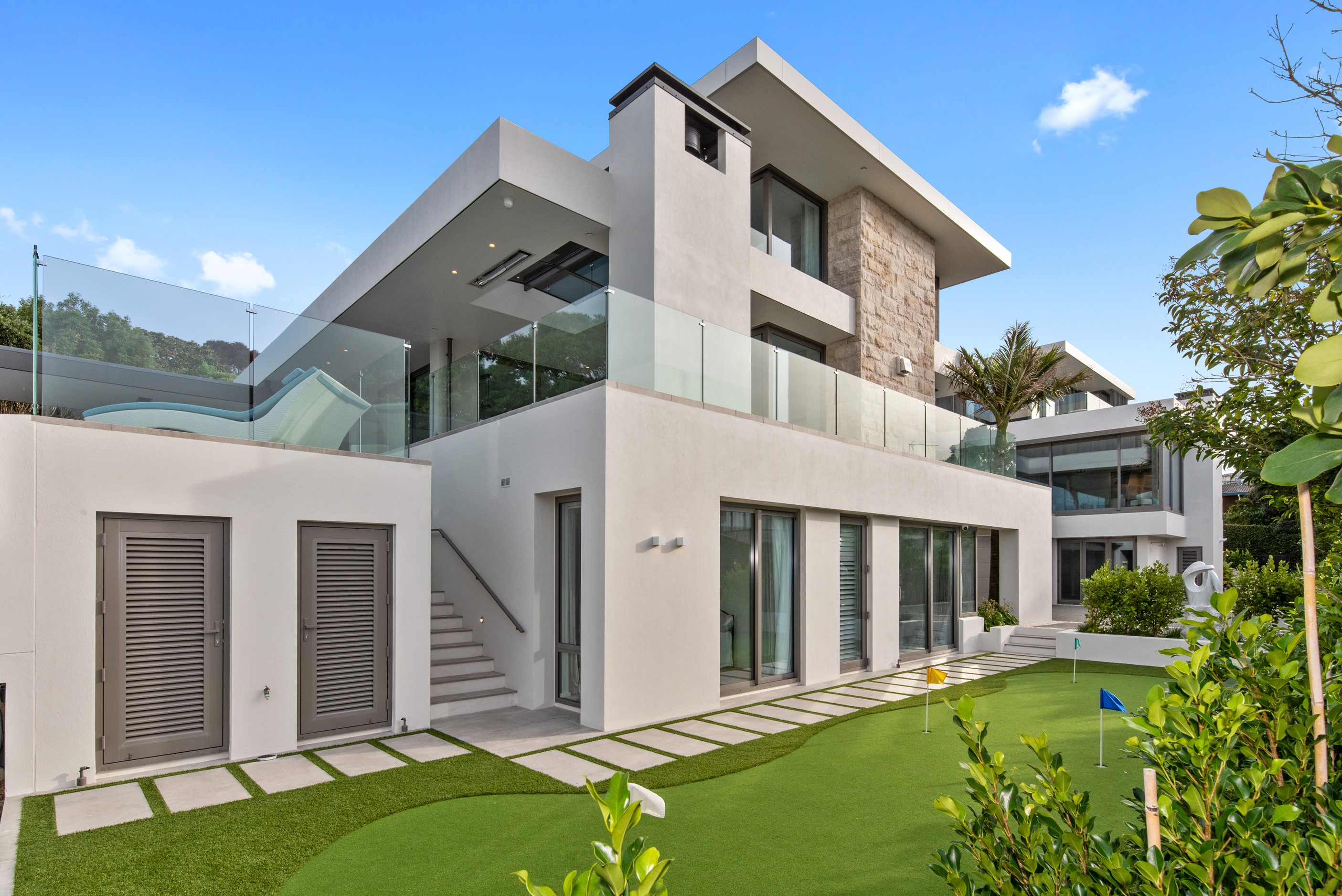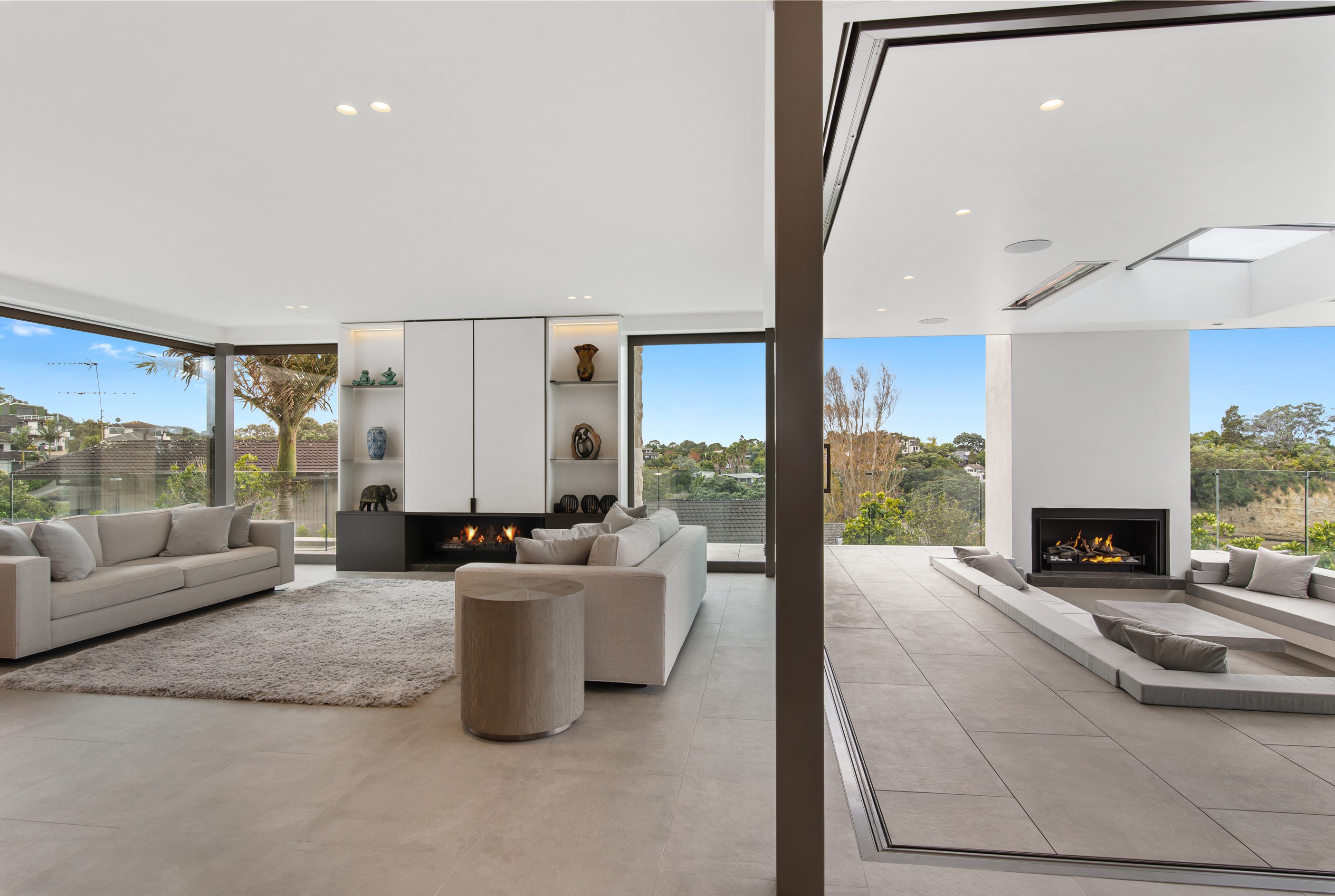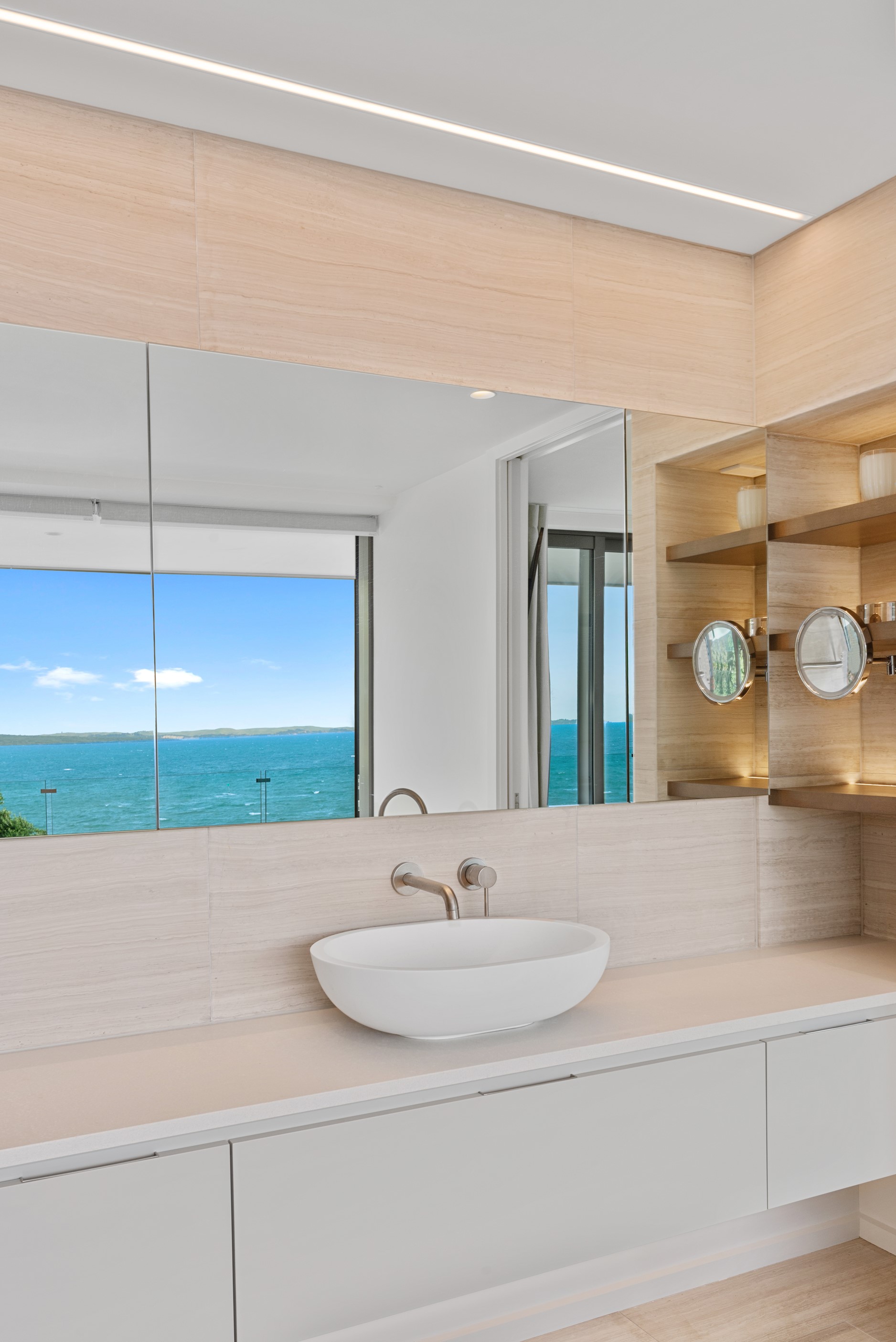 Designed and built for a returning Kiwi couple and their young family, this complex build required precision planning. The site was excavated at the clifftop and extensive drilling and ground anchors help support the weight of this substantial new home and pool. There are multiple different levels to this magnificent build, all formed in concrete – excluding the top floor, which is timber. A sunken outdoor seating area with a built-in fireplace and recessed heating to the soffits has prime position overlooking the pool and Castor Bay Beach below. The home is designed for large-family living with five bedrooms and bathrooms. Three more bedrooms and four bathrooms are located in a separate luxury guest wing. For entertaining, relaxing and just plain fun, there’s a cantilevered infinity pool with a built-in spa. And there’s an expansive covered deck with a barbecue area boasting 180-degree views of the Hauraki Gulf. The cladding combines plastered concrete, stained-cedar vertical weatherboards, stone and metal. A comprehensive automation system allows almost everything in the home to be operated from a device.