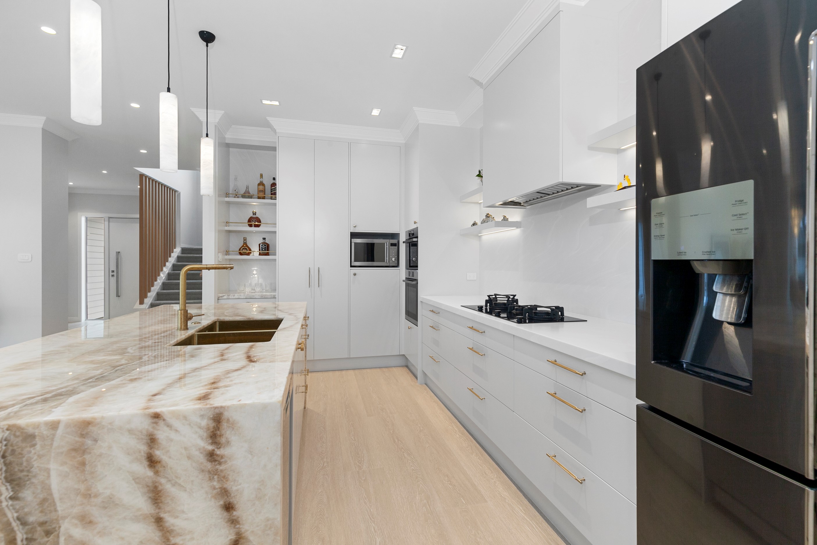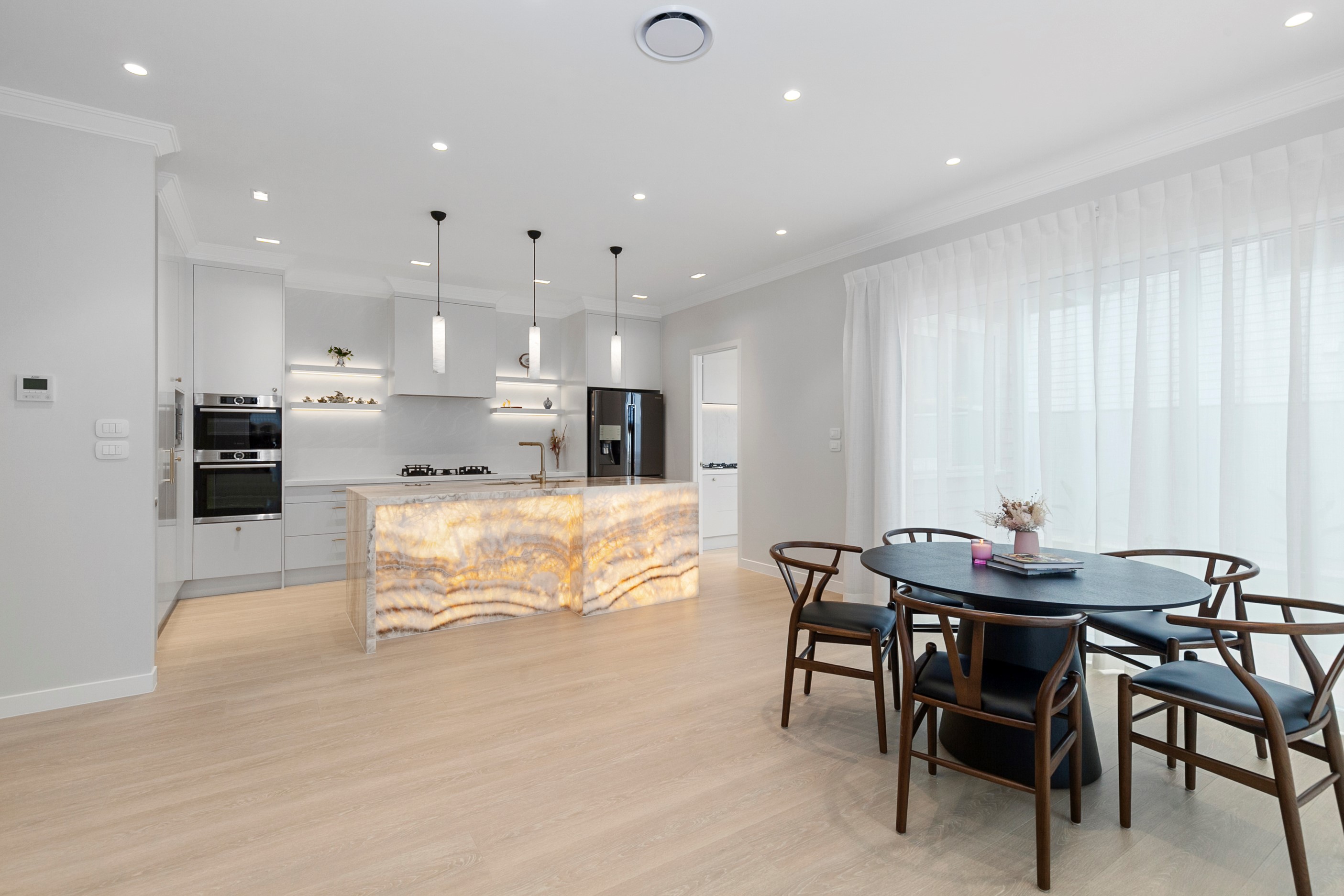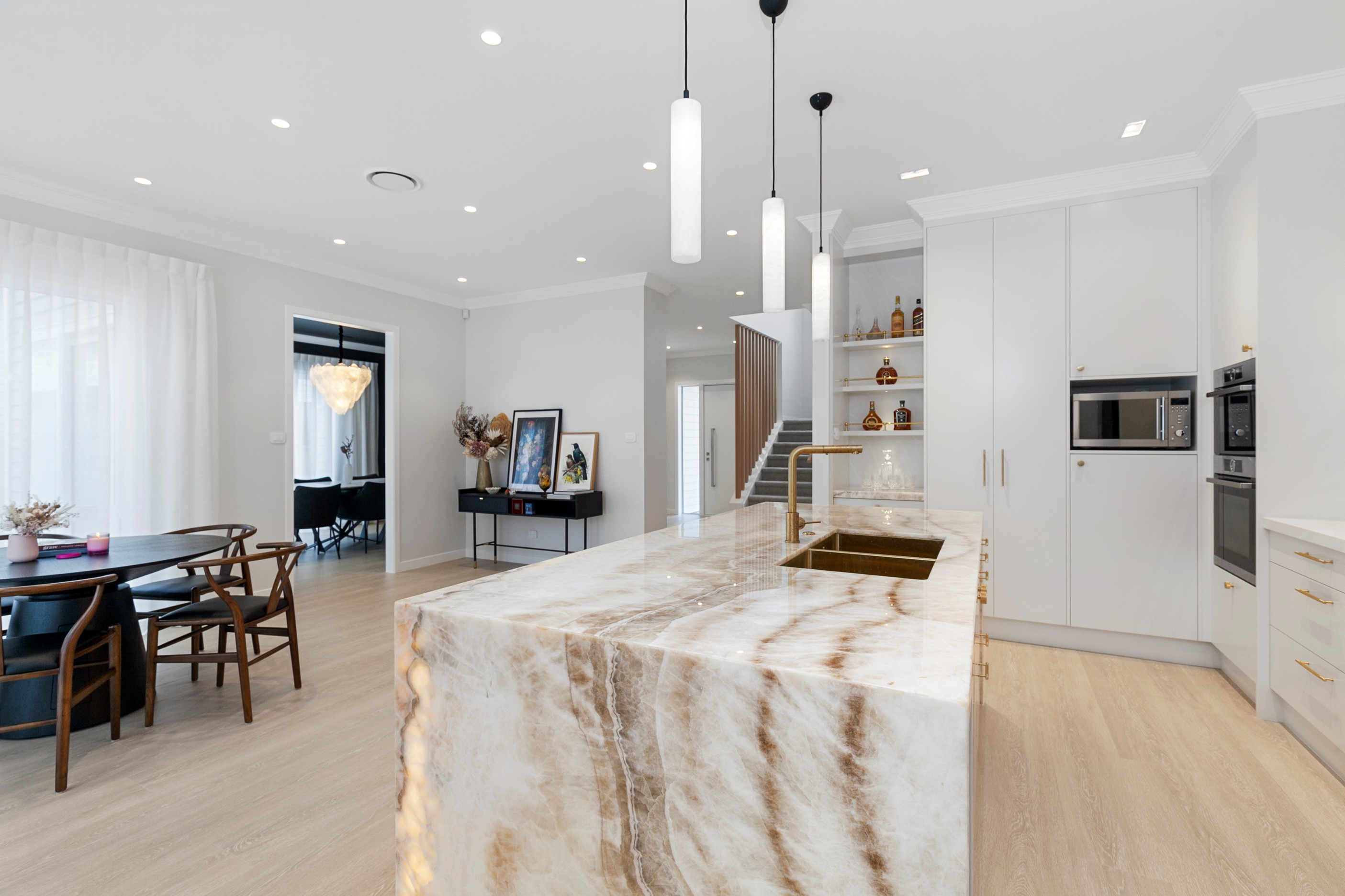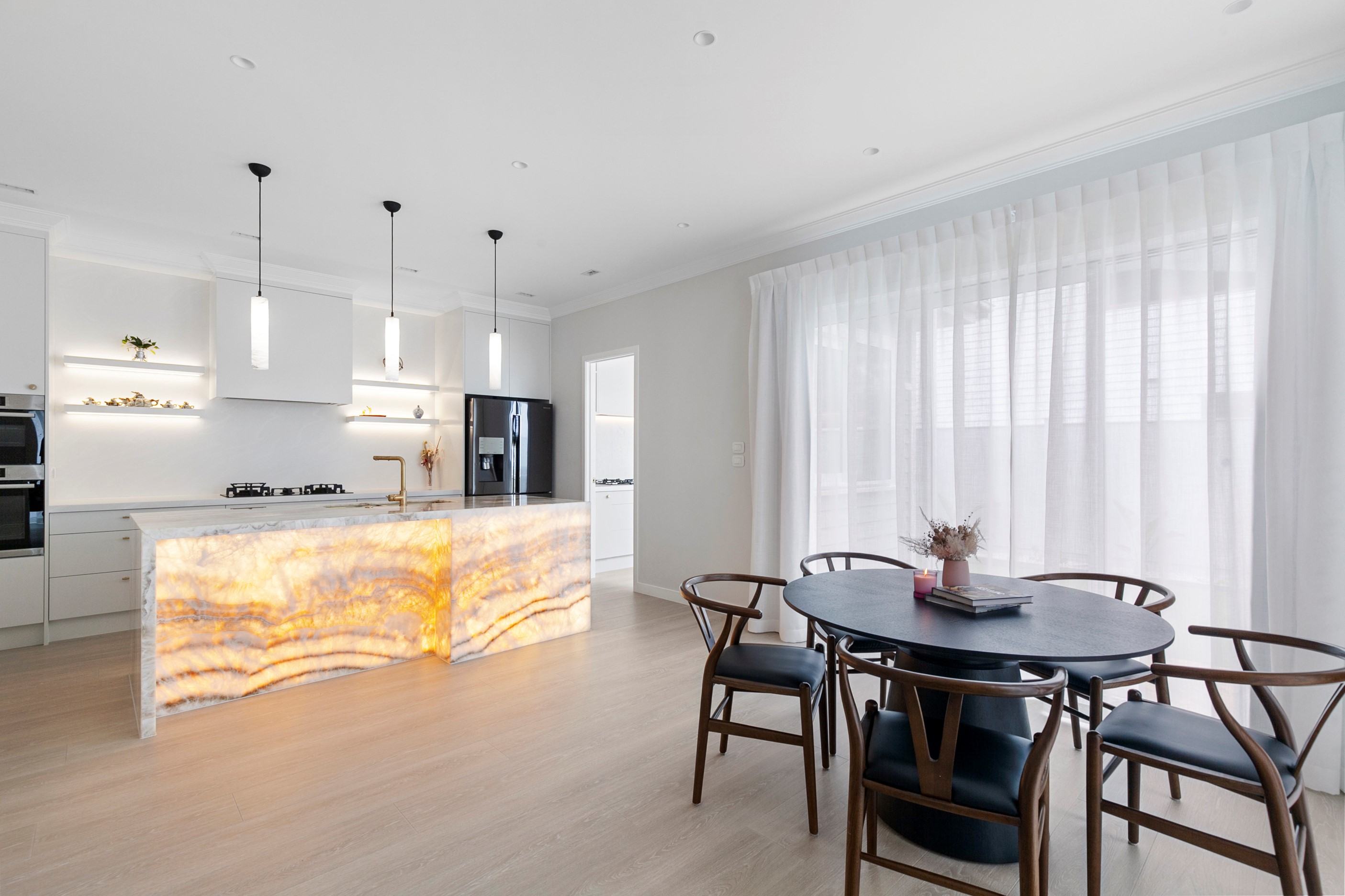 From the outside, this show-stopping property impresses with its effortless Hamptons-style exterior, but step inside and a modern twist awaits. Space, light and a clean, contemporary aesthetic fills each of the two separate living areas, two kitchens, five bedrooms, and three-and-a-half bathrooms. In the heart of the home, the kitchen is bright and beautifully appointed. Without doubt, the main attraction is the back-lit onyx island bench that softly illuminates the room with a warming glow. The tapware and fittings complement the bronze tones within the stone, offsetting the crisp white decor. Equally as impressive, the large bathrooms are impeccably finished with floor-to-ceiling tiling and quality fittings in keeping with the modern yet luxurious aesthetic. Spanning two expansive levels, this 329sqm family home represents meticulous design processes and sophisticated craftsmanship. And just as importantly for its owners, it has an abundance of character and soul – something that transforms this quality build into a comforting home.