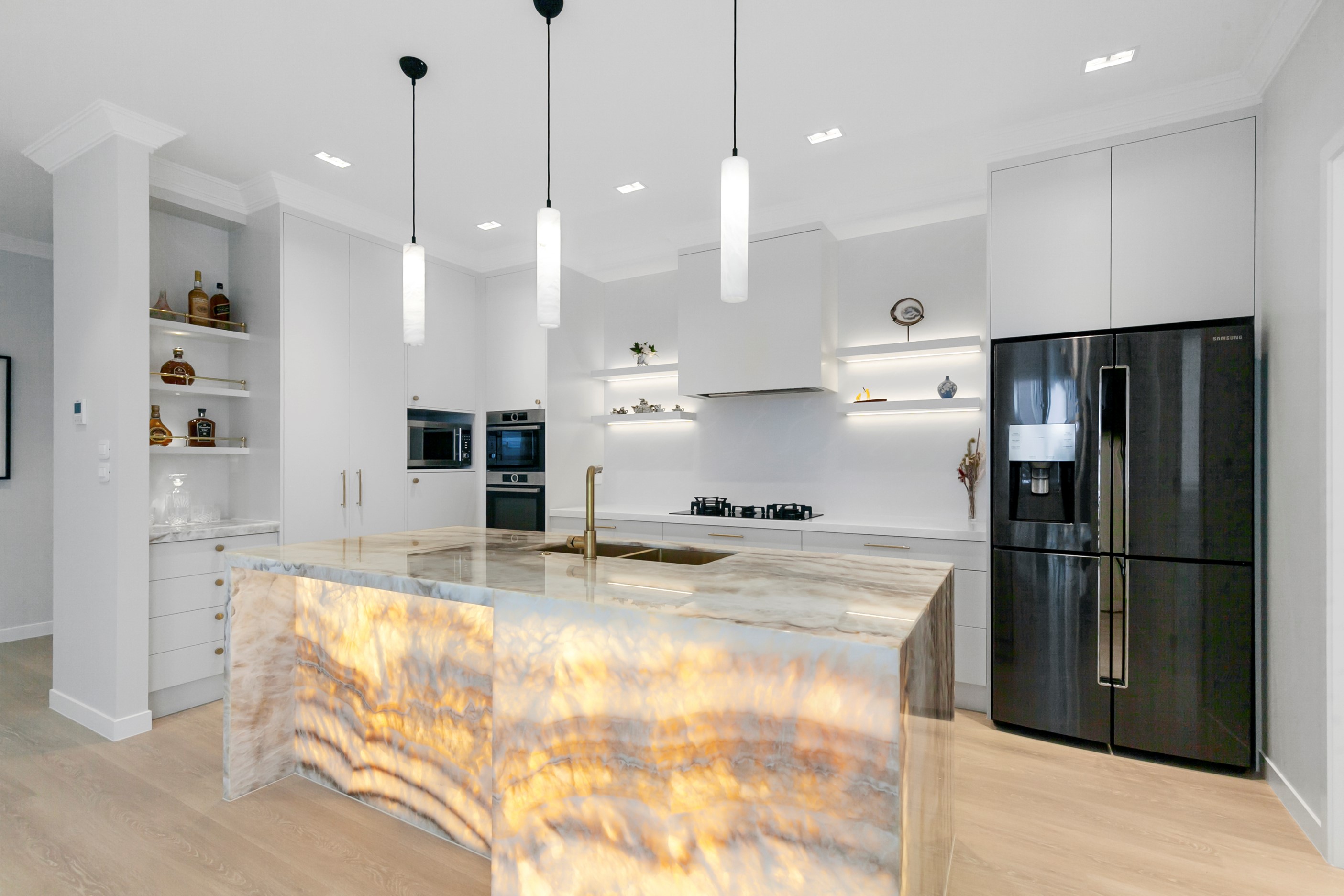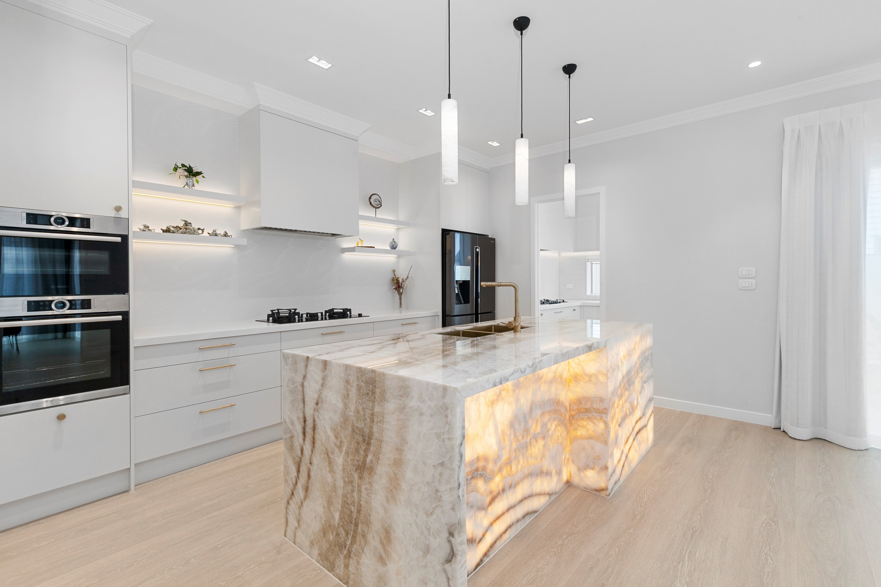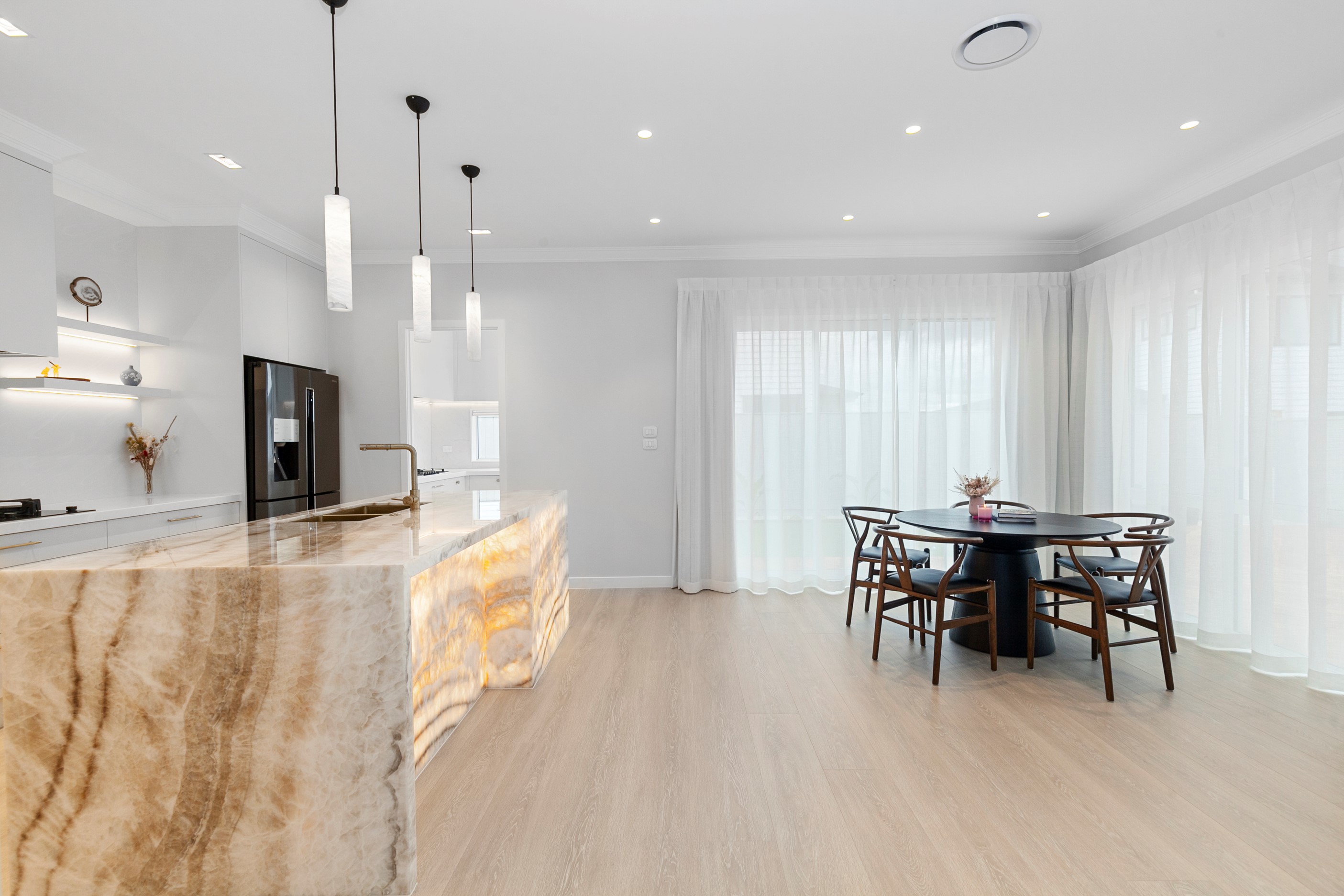 From the outside, this show-stopping property impresses with its effortless Hamptons-style exterior, but step inside and a modern twist awaits. Space, light and a clean, contemporary aesthetic fills each of the two separate living areas, two kitchens, five bedrooms, and three-and-a-half bathrooms. In the heart of the home, the kitchen is bright and beautifully appointed. Without doubt, the main attraction is the back-lit onyx island bench that softly illuminates the room with a warming glow. The tapware and fittings complement the bronze tones within the stone, offsetting the crisp white decor. Equally as impressive, the large bathrooms are impeccably finished with floor-to-ceiling tiling and quality fittings in keeping with the modern yet luxurious aesthetic. Spanning two expansive levels, this 329sqm family home represents meticulous design processes and sophisticated craftsmanship. And just as importantly for its owners, it has an abundance of character and soul – something that transforms this quality build into a comforting home.