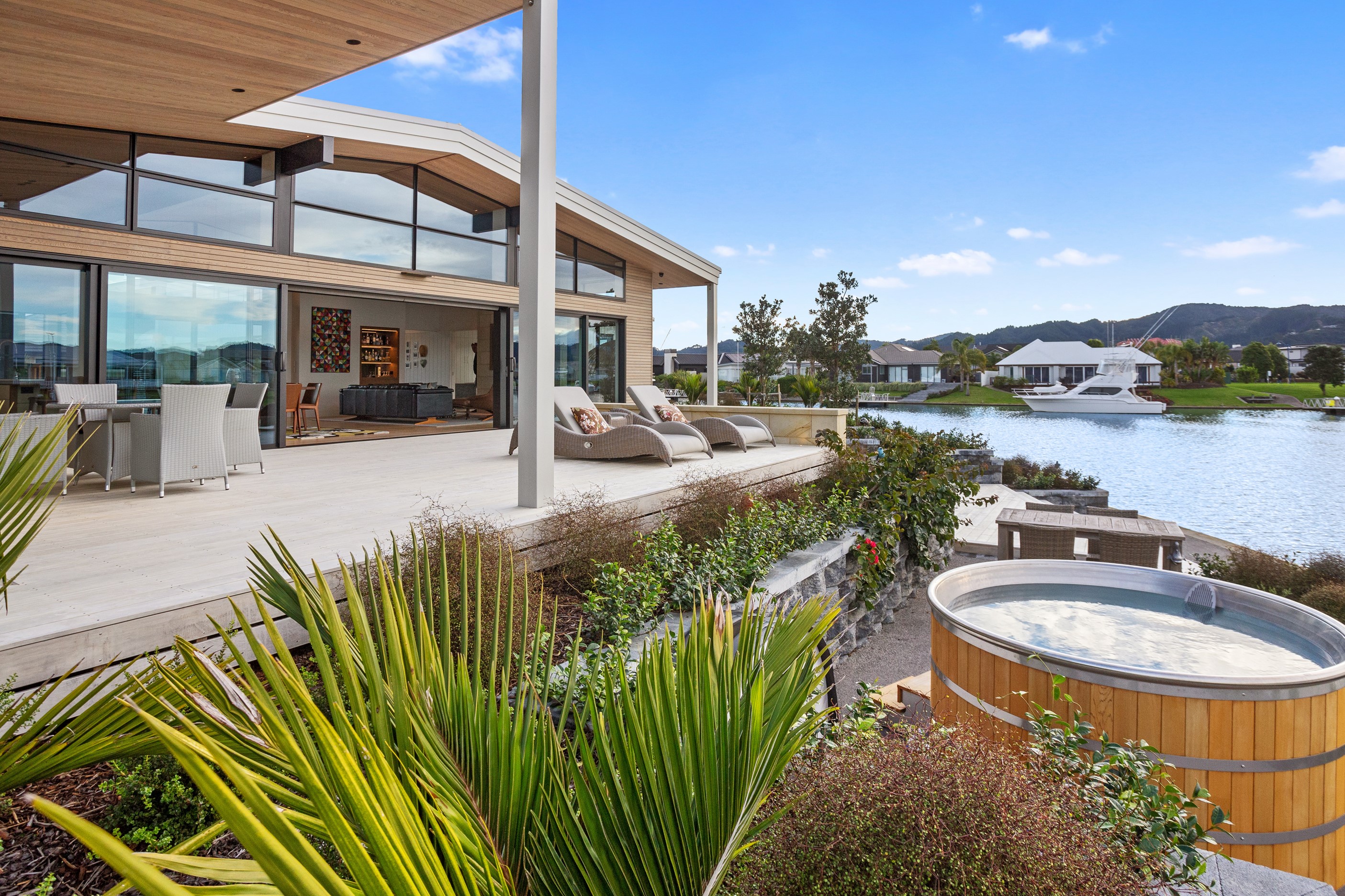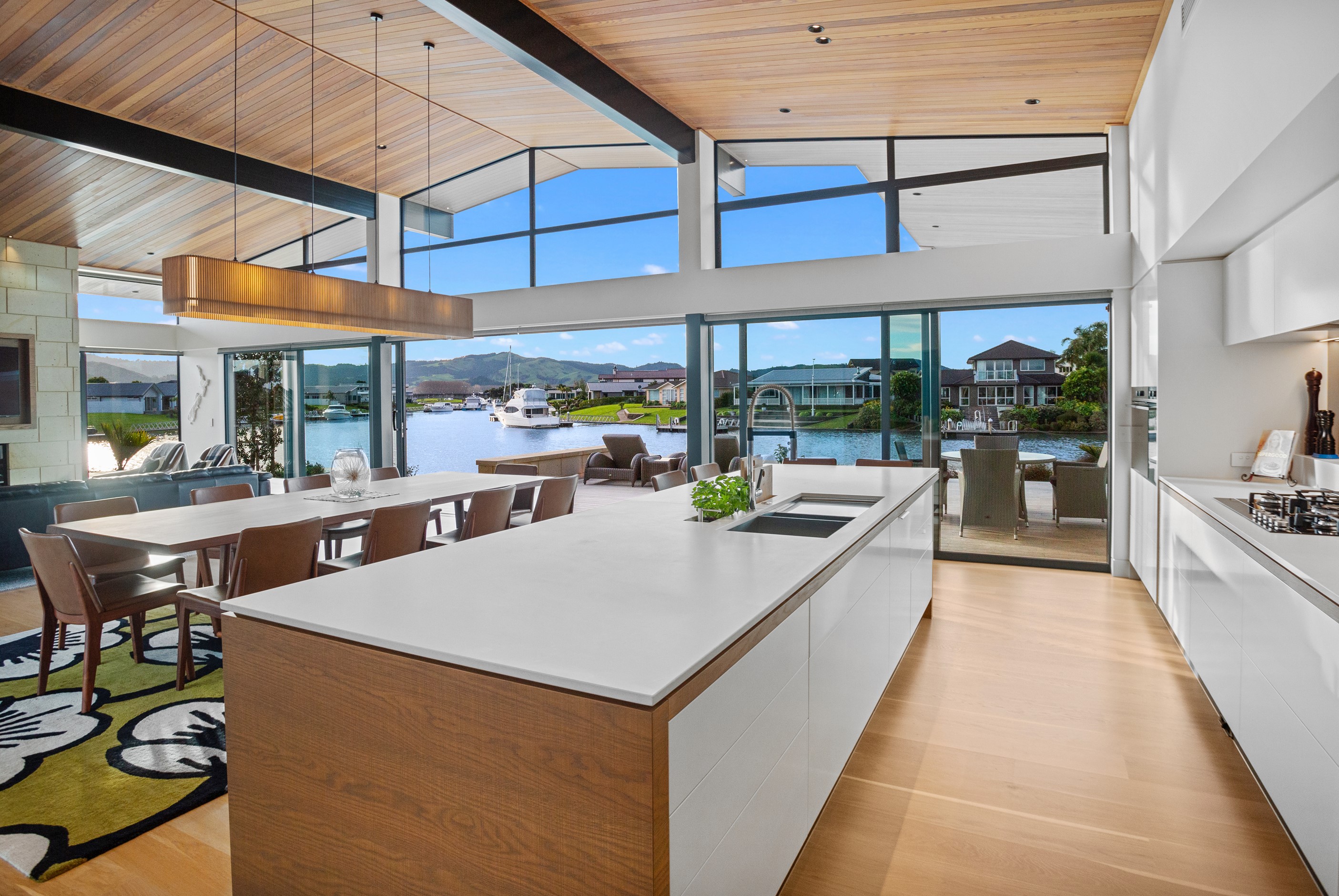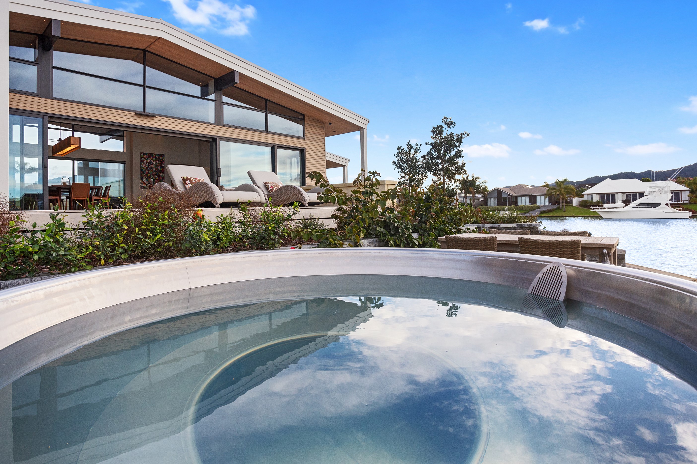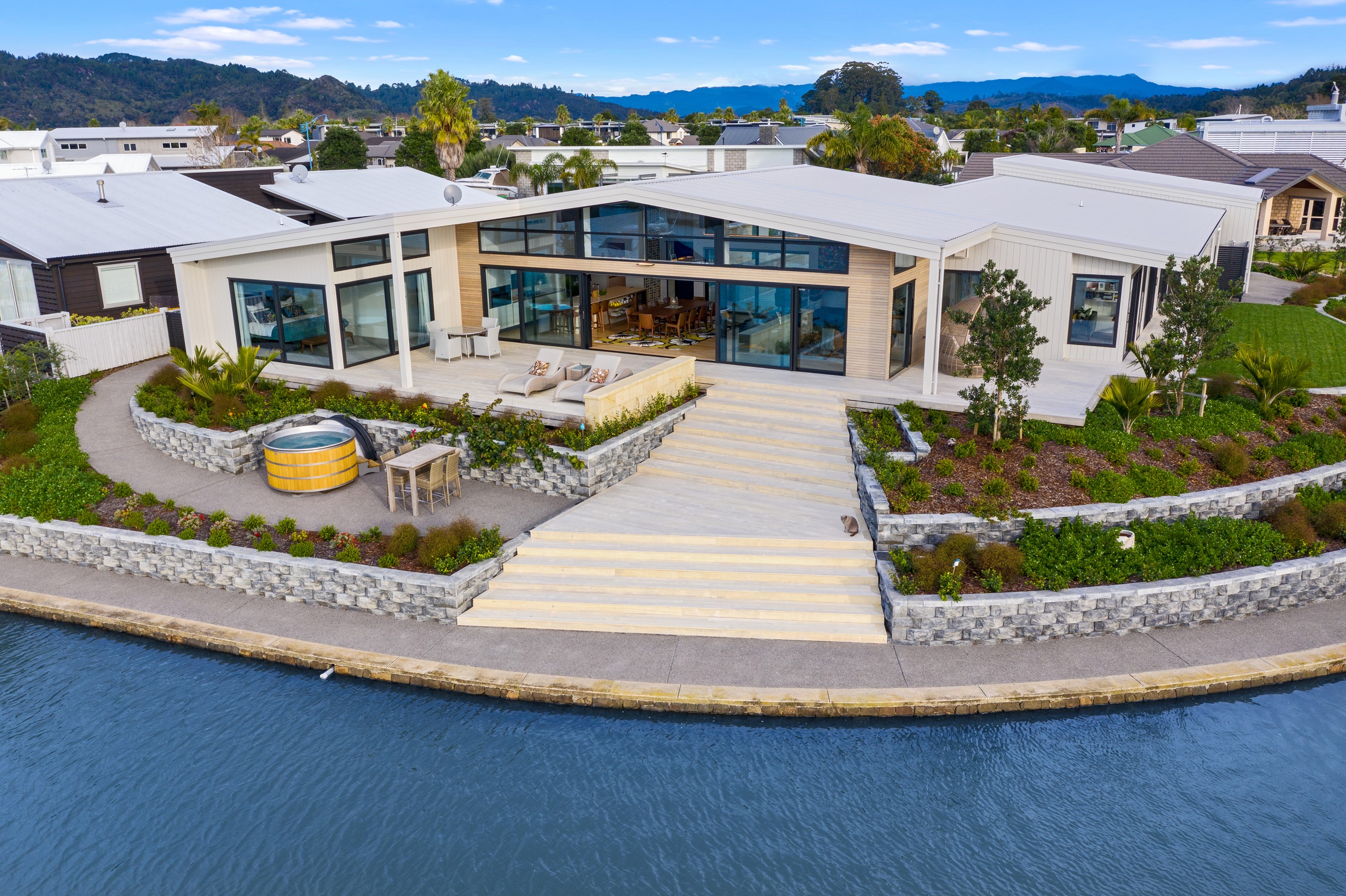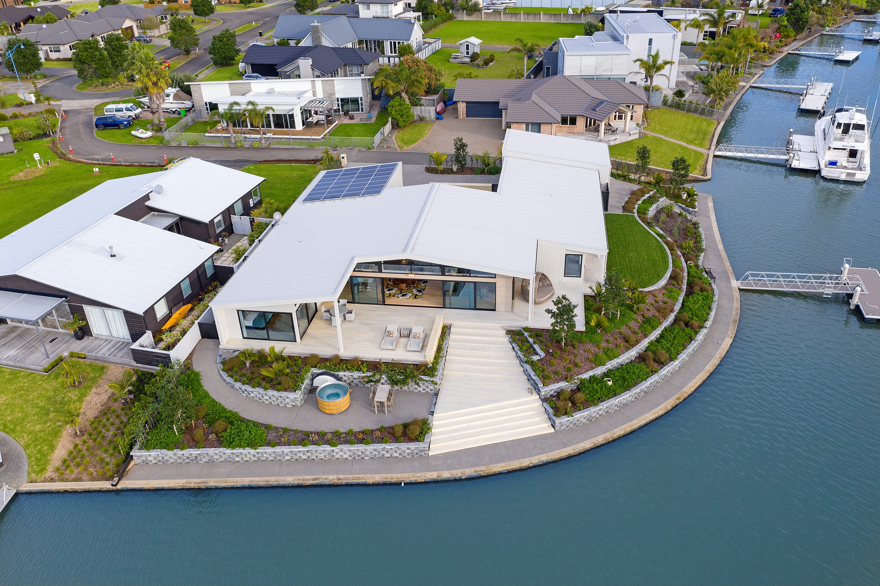 This architecturally designed beauty is on a corner site, but not one as you know it. Instead of perching on the apex of streets, this 477sqm three-bedroom home presides over a double corner section bordered by the canal. You can arrive at the front door by car, or to the entertaining area by boat. The Hinuera stone, weatherboard and cedar-clad house wraps an in-ground pool in a central courtyard. Inside you’ll find more solid timber – floors, kitchen features and built-in oak furniture. The TV lounge has an added bonus: a king-size guest bed that disappears into built-in cabinetry. The three bathrooms have handmade concrete basins and brushed-oak cabinets. As if that’s not enough, the house opens to decking on two canal fronts and has a hot tub on the lower level. Sustainability was high on the owners’ list, so you’ll find solar panels, which heat the home as well as the pool in summer. Batteries store the energy so they can live off the grid. There are electric-car chargers, FSC-certified wood and the double glazing is low-e and argon-filled for cool summers and warm winters. Coastal living at its finest.