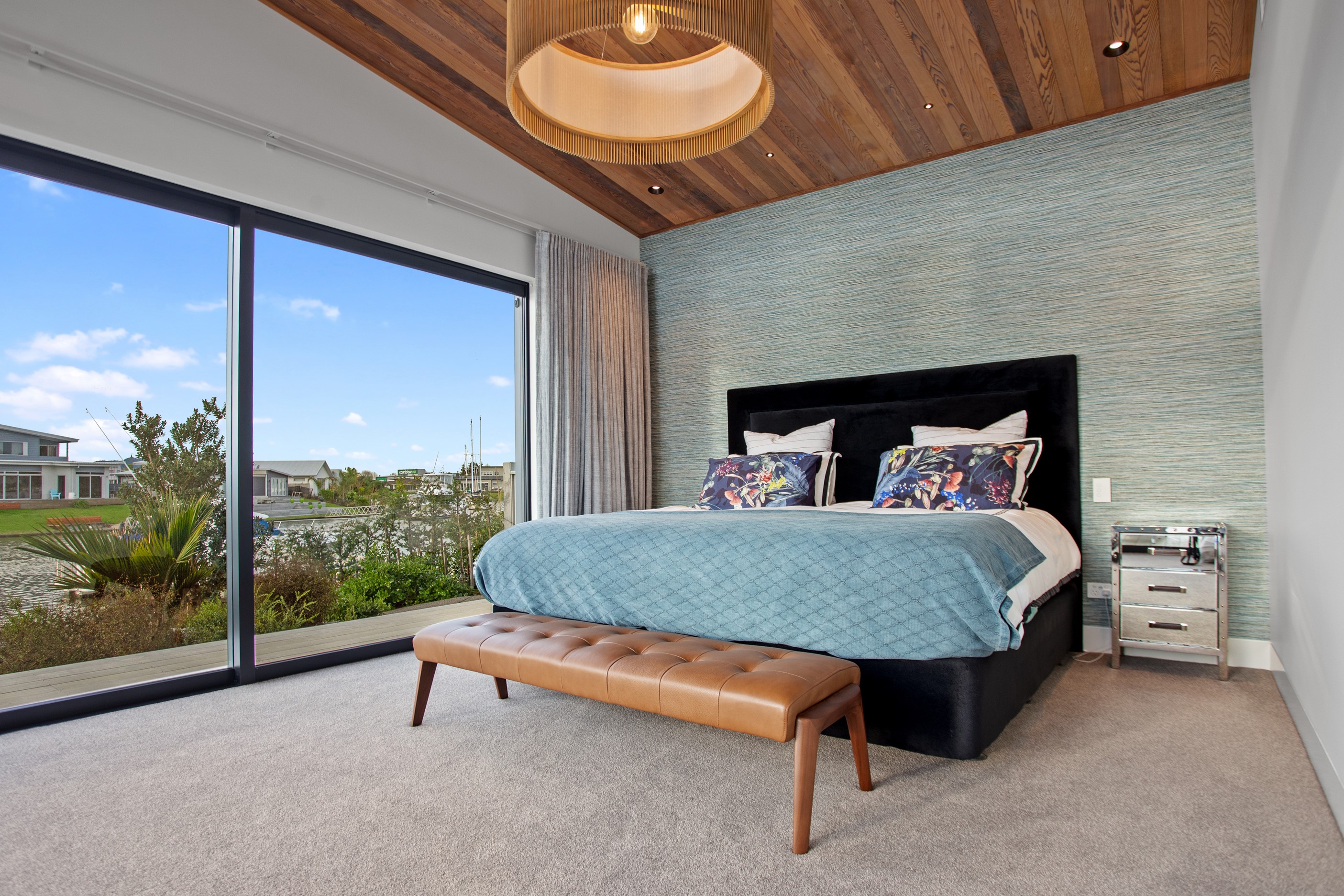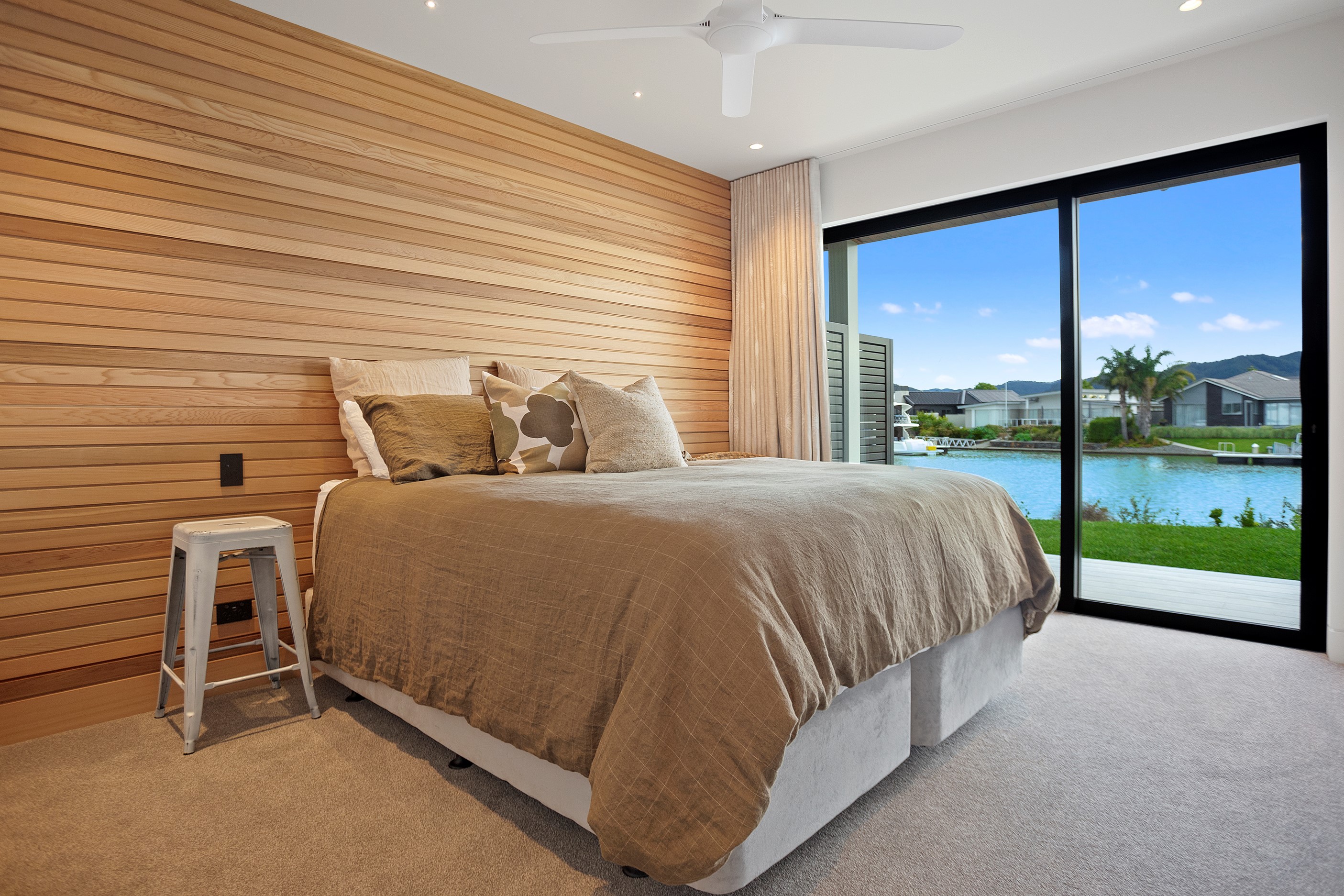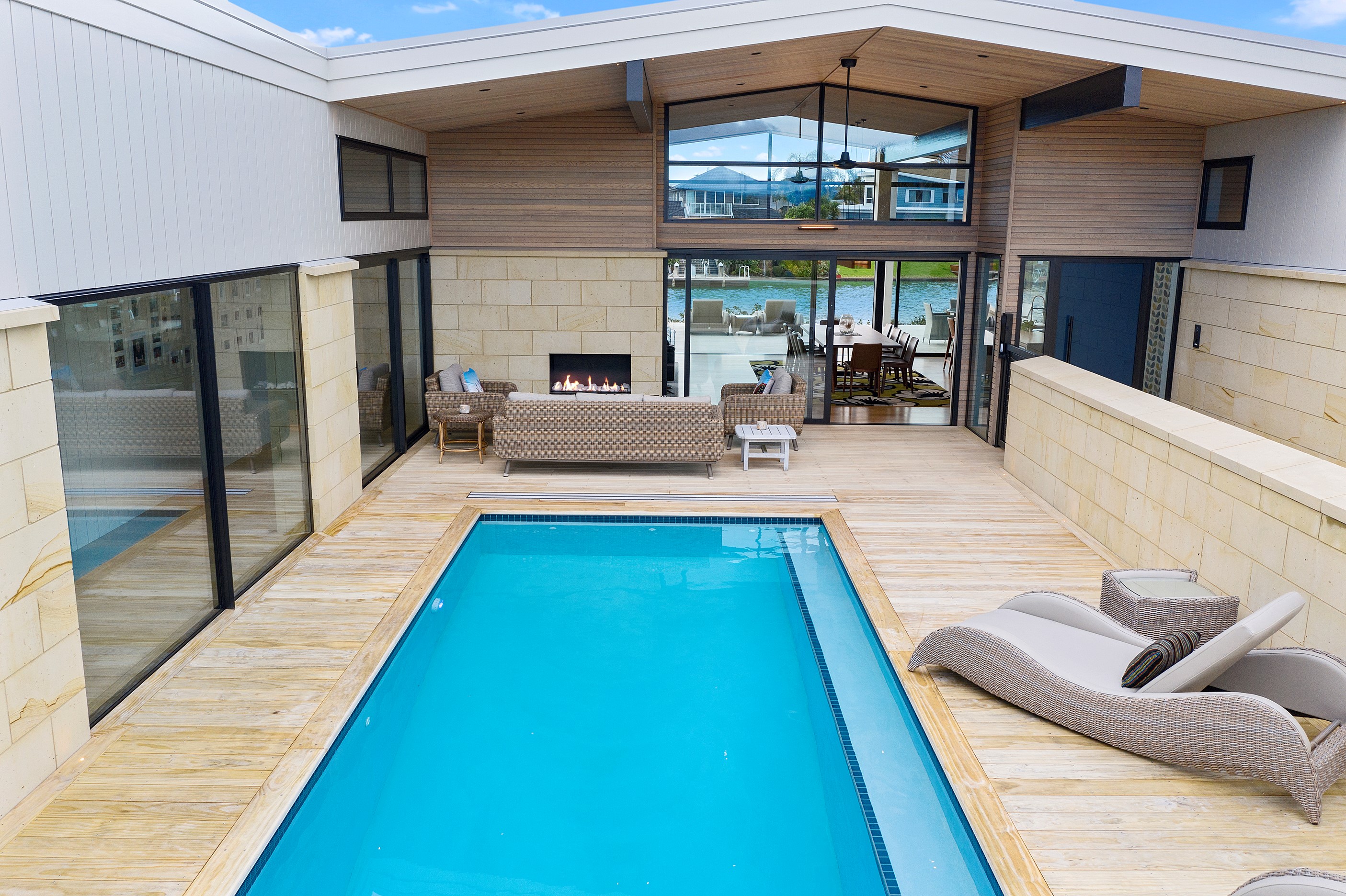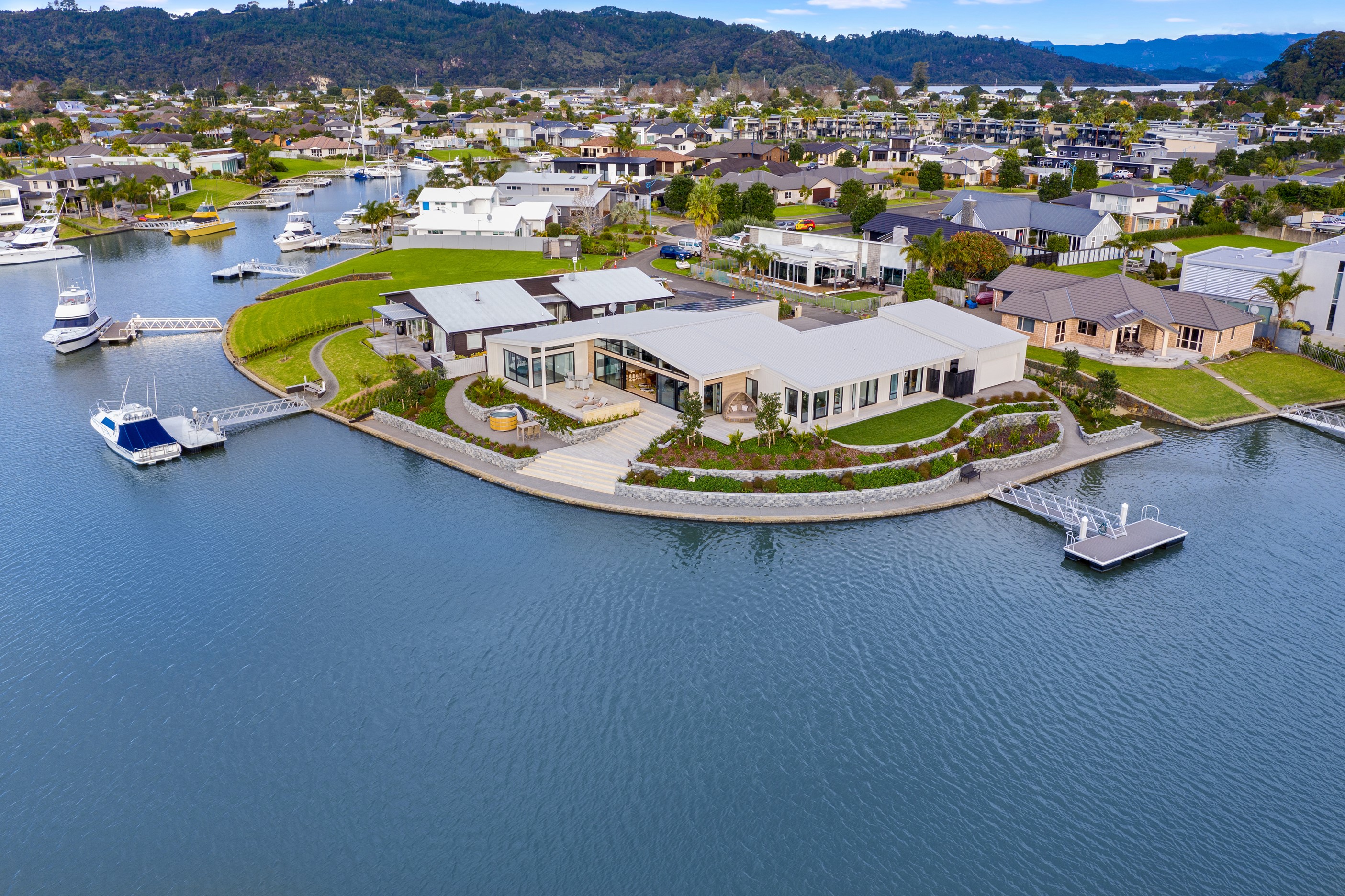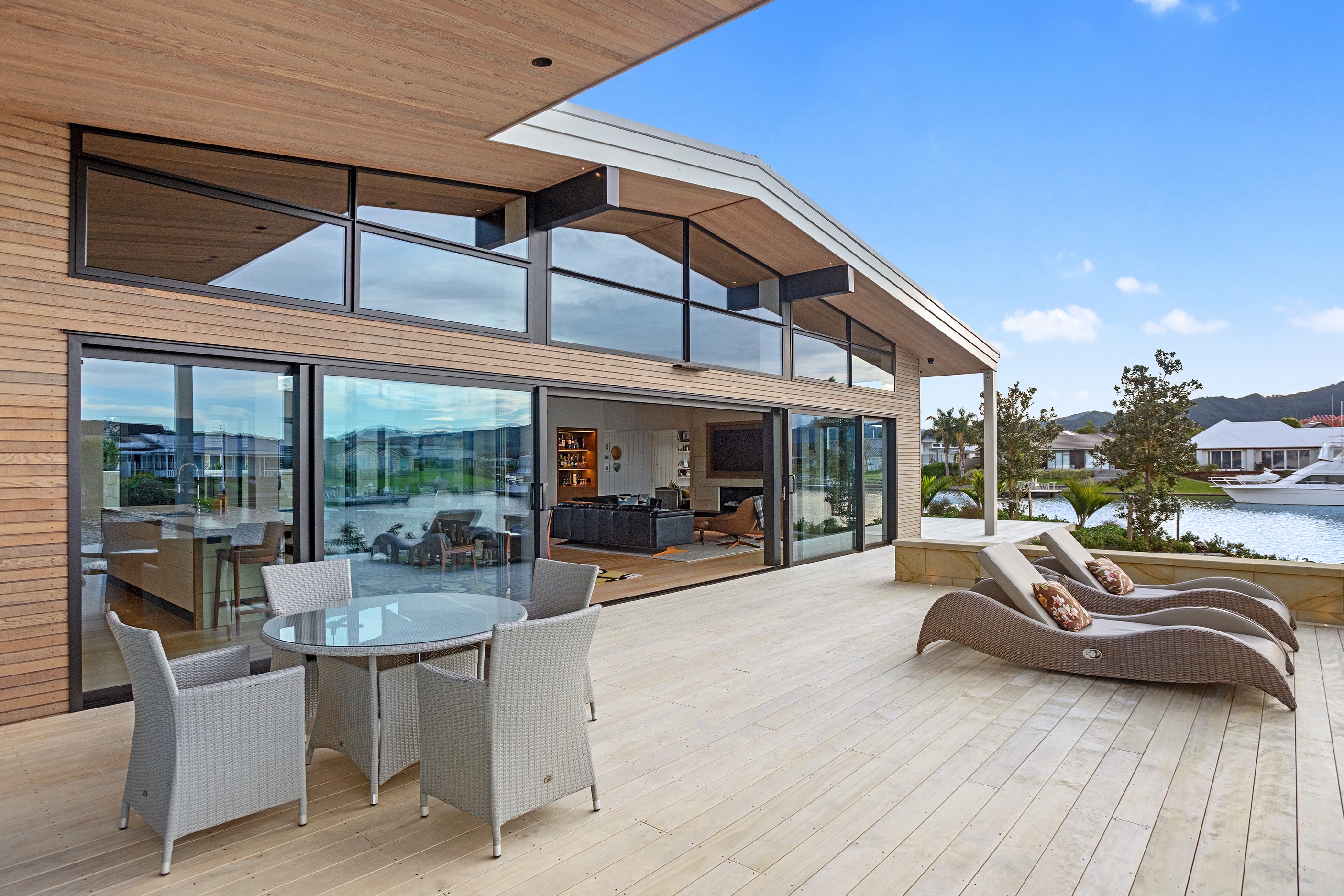 This architecturally designed beauty is on a corner site, but not one as you know it. Instead of perching on the apex of streets, this 477sqm three-bedroom home presides over a double corner section bordered by the canal. You can arrive at the front door by car, or to the entertaining area by boat. The Hinuera stone, weatherboard and cedar-clad house wraps an in-ground pool in a central courtyard. Inside you’ll find more solid timber – floors, kitchen features and built-in oak furniture. The TV lounge has an added bonus: a king-size guest bed that disappears into built-in cabinetry. The three bathrooms have handmade concrete basins and brushed-oak cabinets. As if that’s not enough, the house opens to decking on two canal fronts and has a hot tub on the lower level. Sustainability was high on the owners’ list, so you’ll find solar panels, which heat the home as well as the pool in summer. Batteries store the energy so they can live off the grid. There are electric-car chargers, FSC-certified wood and the double glazing is low-e and argon-filled for cool summers and warm winters. Coastal living at its finest.