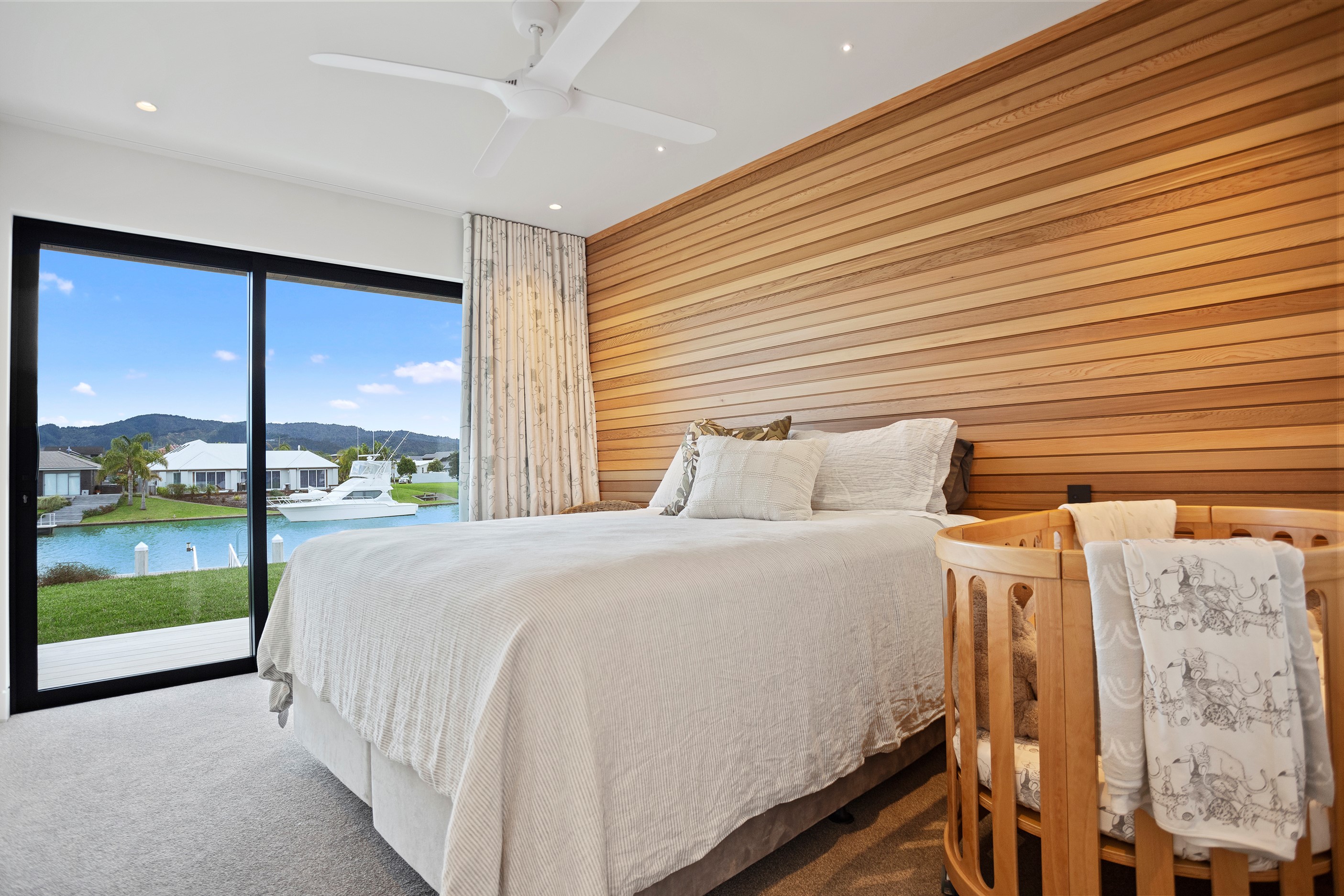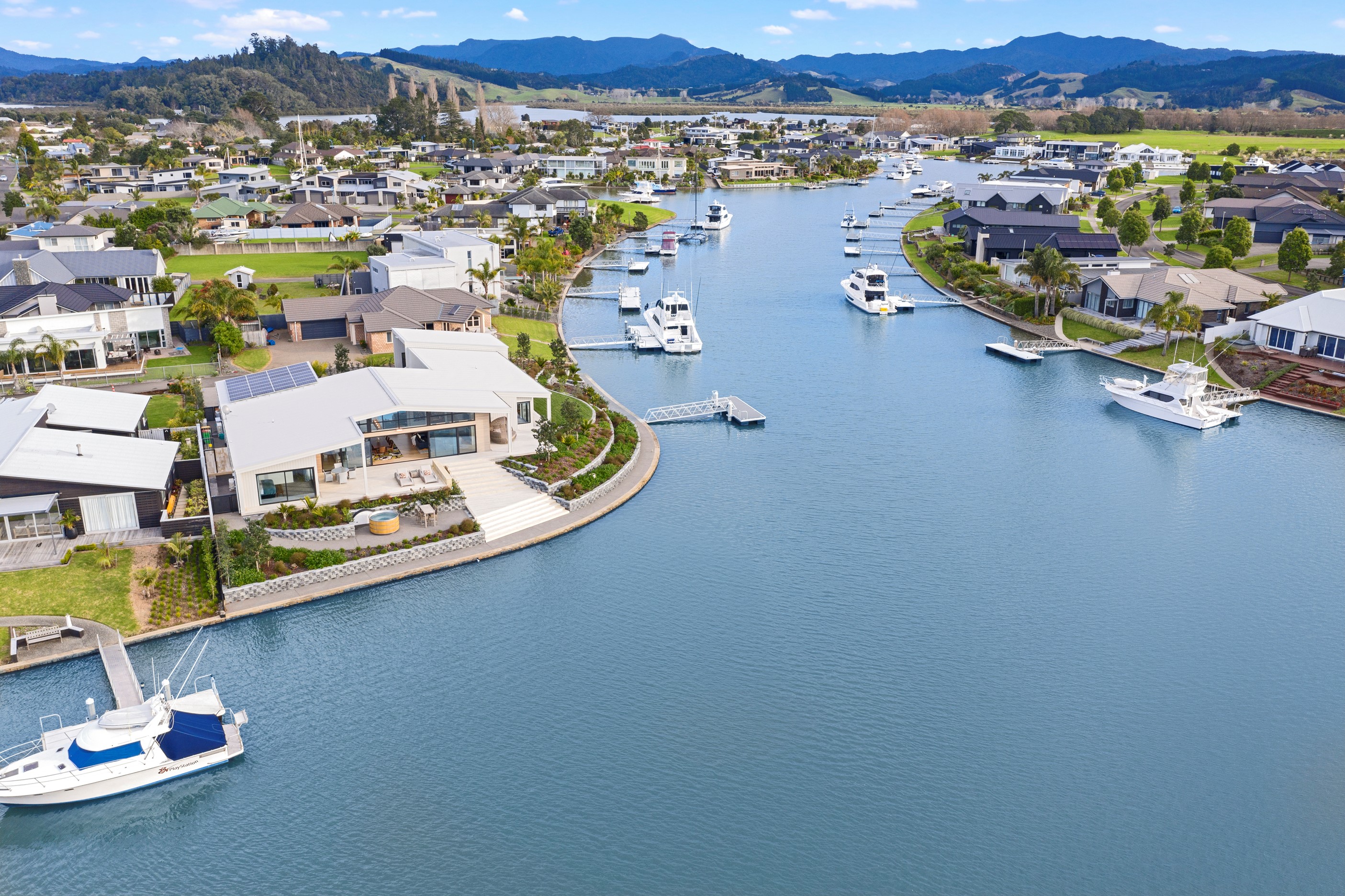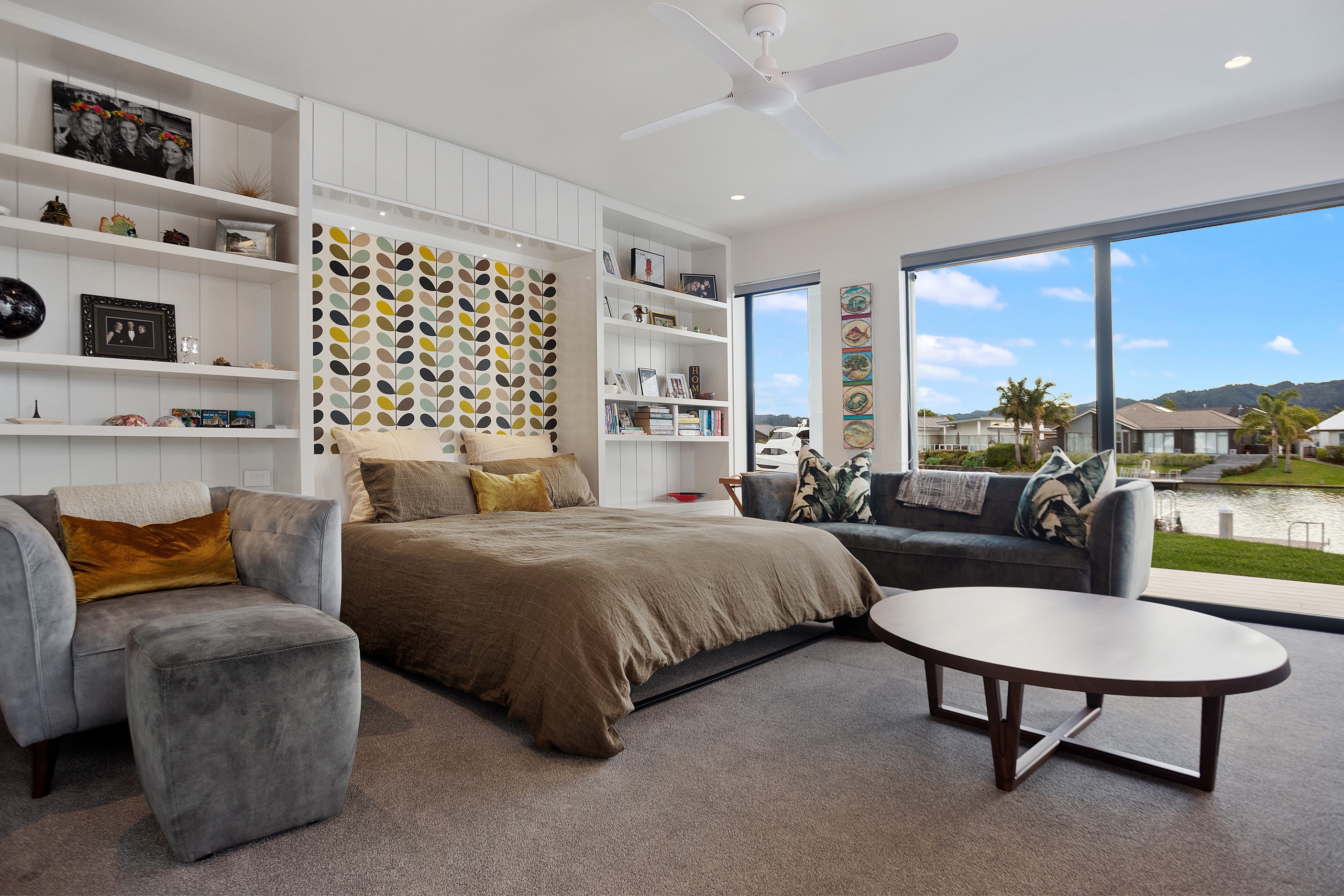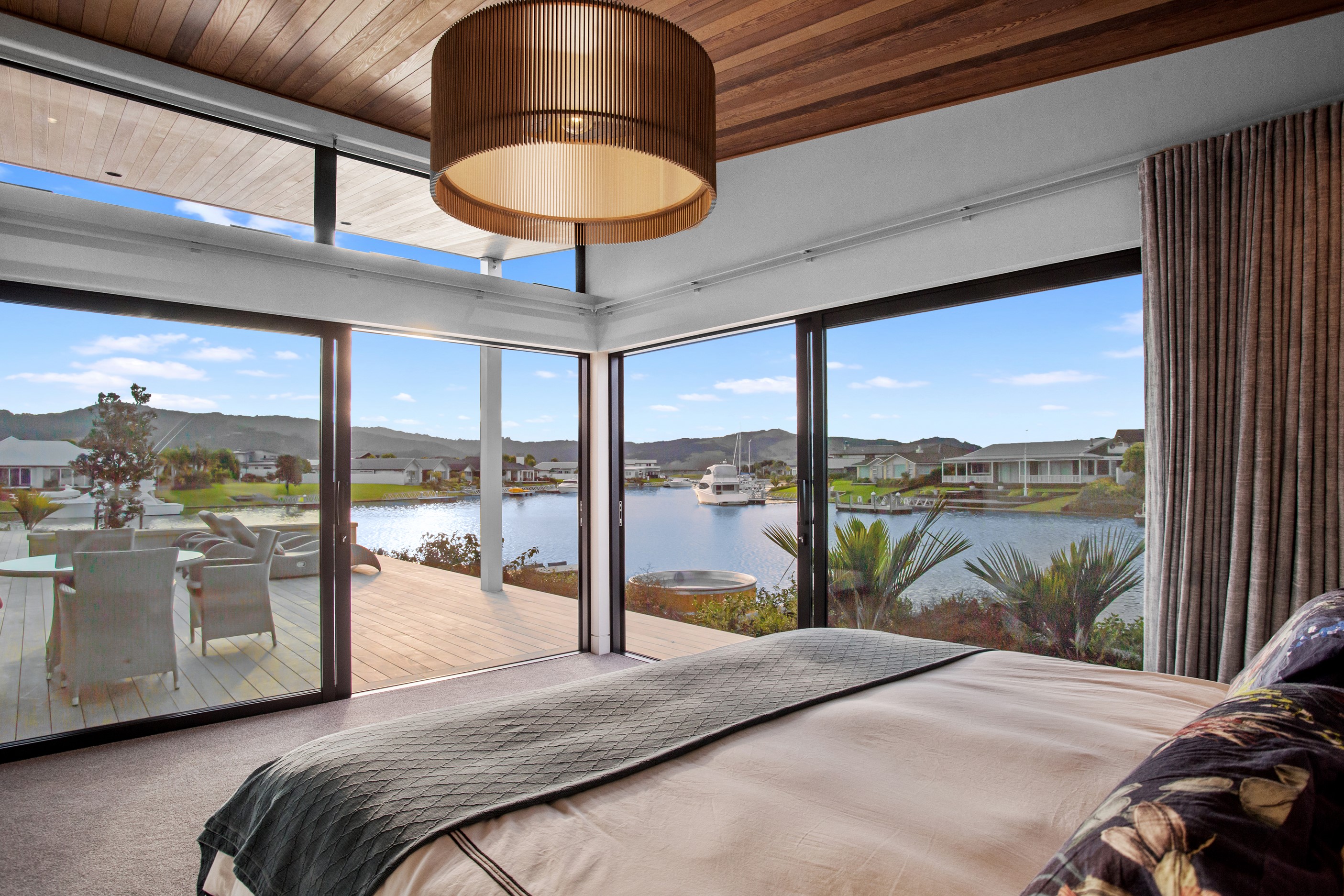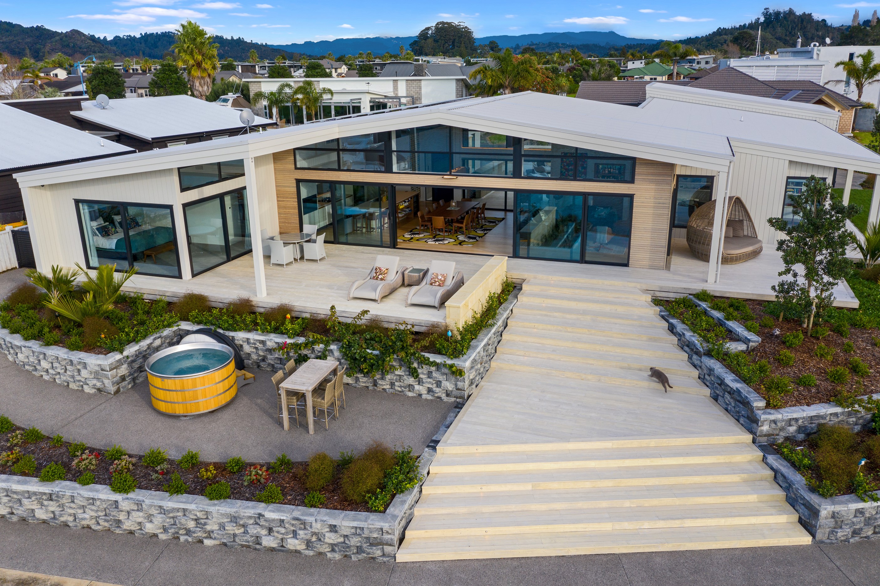 This architecturally designed beauty is on a corner site, but not one as you know it. Instead of perching on the apex of streets, this 477sqm three-bedroom home presides over a double corner section bordered by the canal. You can arrive at the front door by car, or to the entertaining area by boat. The Hinuera stone, weatherboard and cedar-clad house wraps an in-ground pool in a central courtyard. Inside you’ll find more solid timber – floors, kitchen features and built-in oak furniture. The TV lounge has an added bonus: a king-size guest bed that disappears into built-in cabinetry. The three bathrooms have handmade concrete basins and brushed-oak cabinets. As if that’s not enough, the house opens to decking on two canal fronts and has a hot tub on the lower level. Sustainability was high on the owners’ list, so you’ll find solar panels, which heat the home as well as the pool in summer. Batteries store the energy so they can live off the grid. There are electric-car chargers, FSC-certified wood and the double glazing is low-e and argon-filled for cool summers and warm winters. Coastal living at its finest.