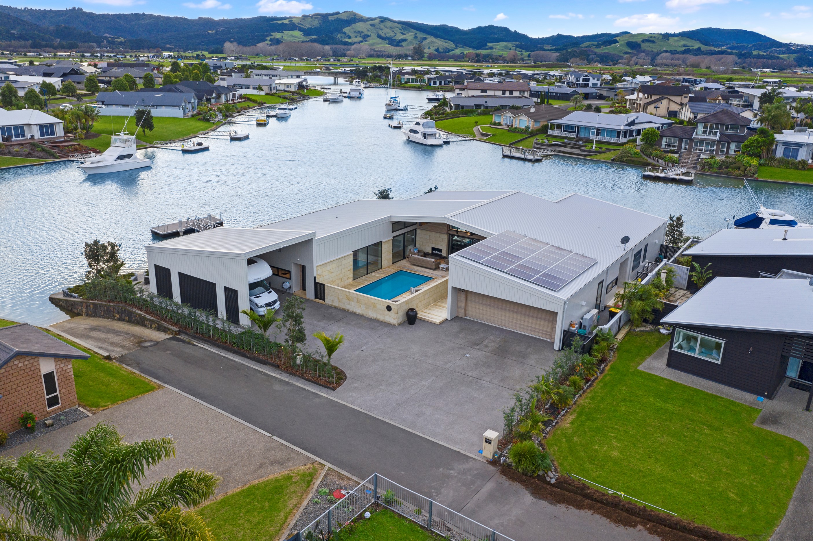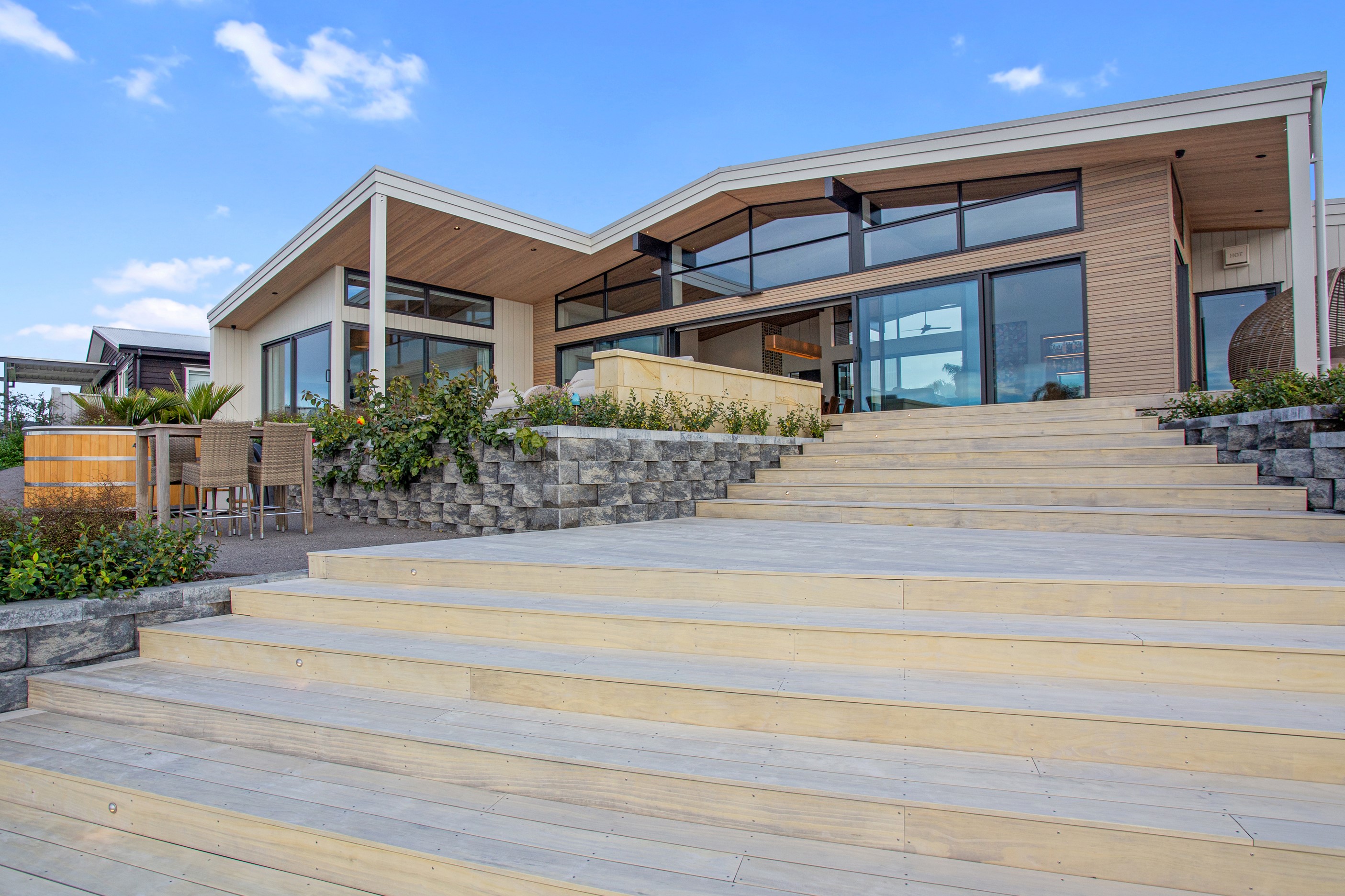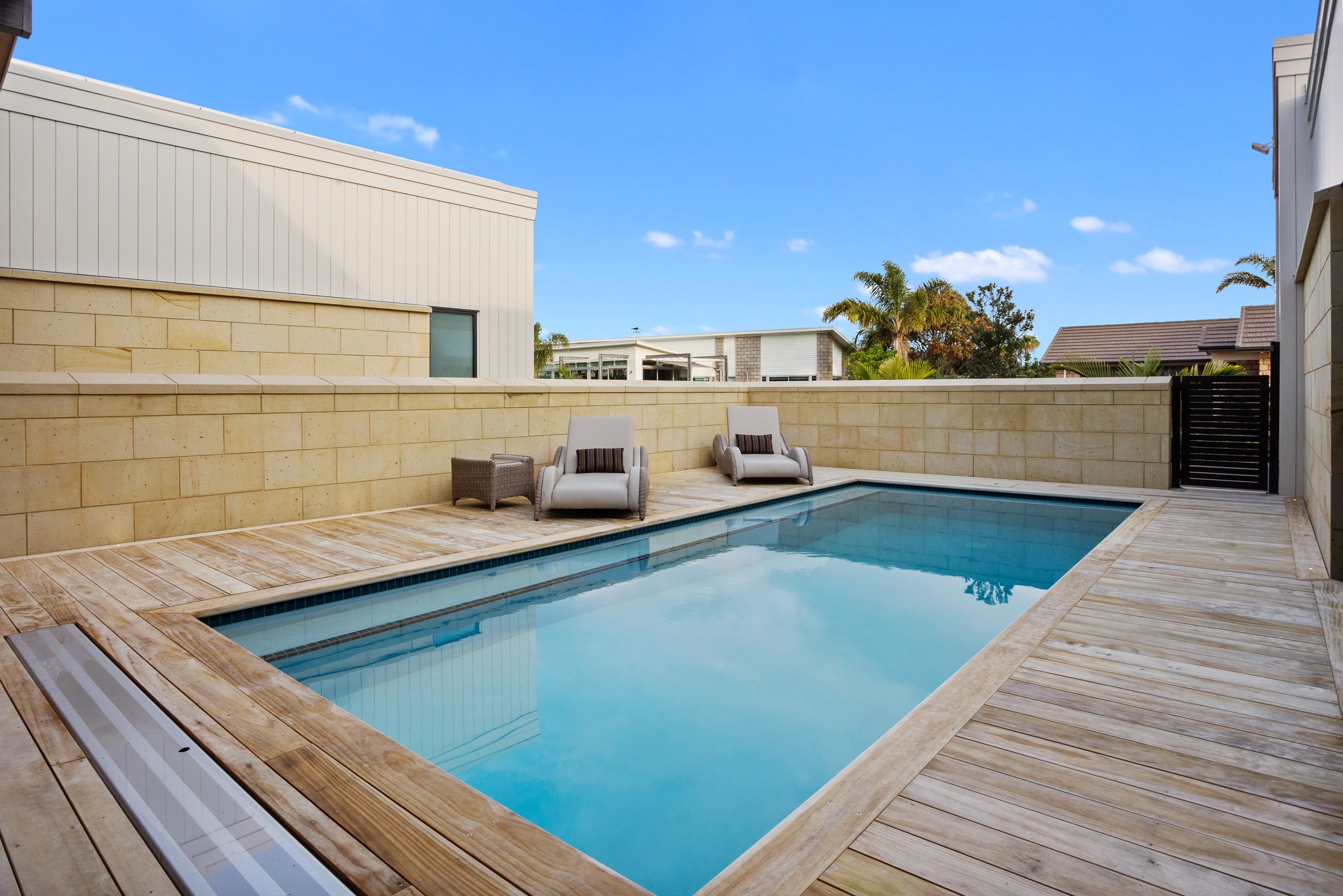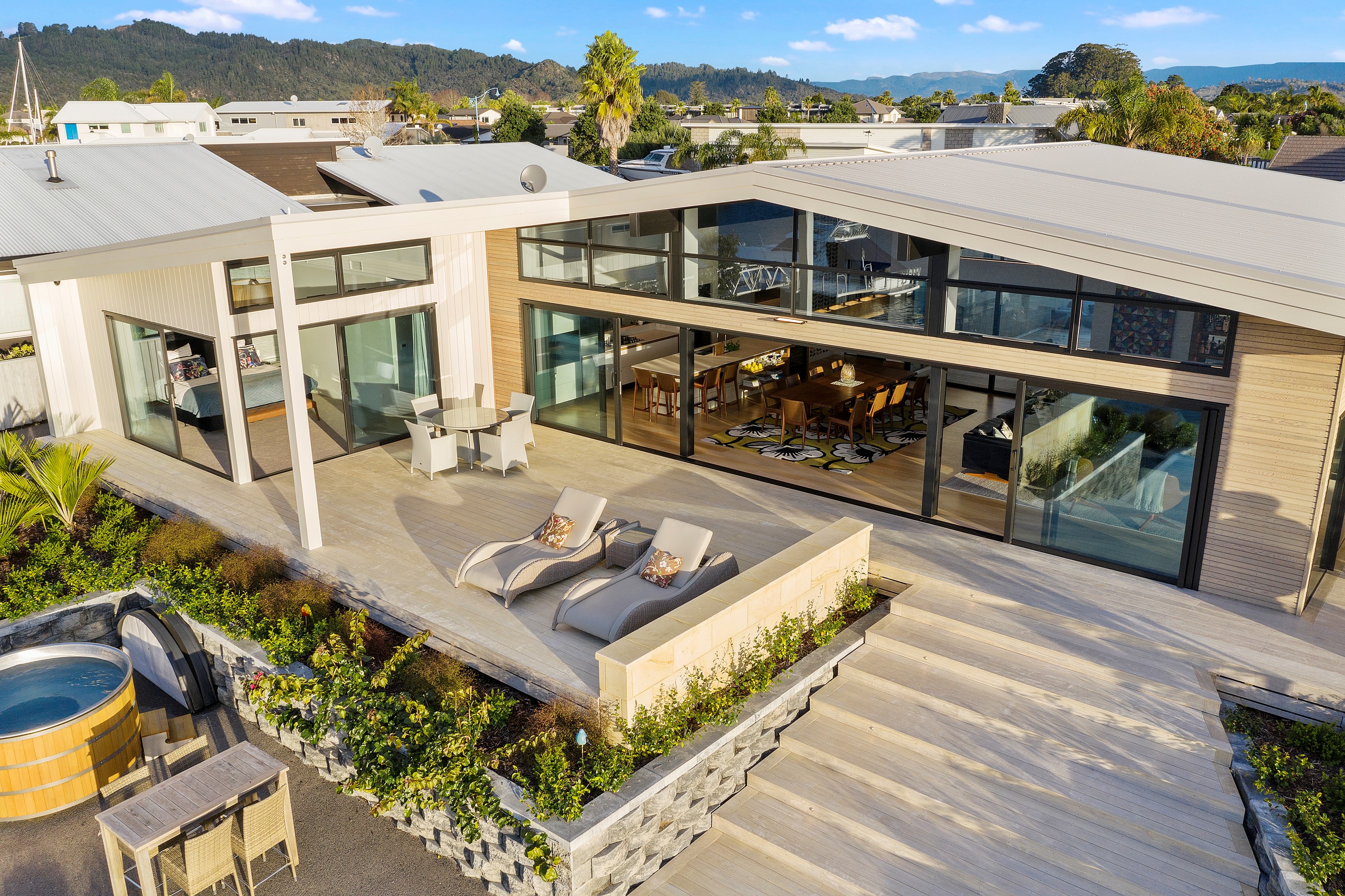 This architecturally designed beauty is on a corner site, but not one as you know it. Instead of perching on the apex of streets, this 477sqm three-bedroom home presides over a double corner section bordered by the canal. You can arrive at the front door by car, or to the entertaining area by boat. The Hinuera stone, weatherboard and cedar-clad house wraps an in-ground pool in a central courtyard. Inside you’ll find more solid timber – floors, kitchen features and built-in oak furniture. The TV lounge has an added bonus: a king-size guest bed that disappears into built-in cabinetry. The three bathrooms have handmade concrete basins and brushed-oak cabinets. As if that’s not enough, the house opens to decking on two canal fronts and has a hot tub on the lower level. Sustainability was high on the owners’ list, so you’ll find solar panels, which heat the home as well as the pool in summer. Batteries store the energy so they can live off the grid. There are electric-car chargers, FSC-certified wood and the double glazing is low-e and argon-filled for cool summers and warm winters. Coastal living at its finest.