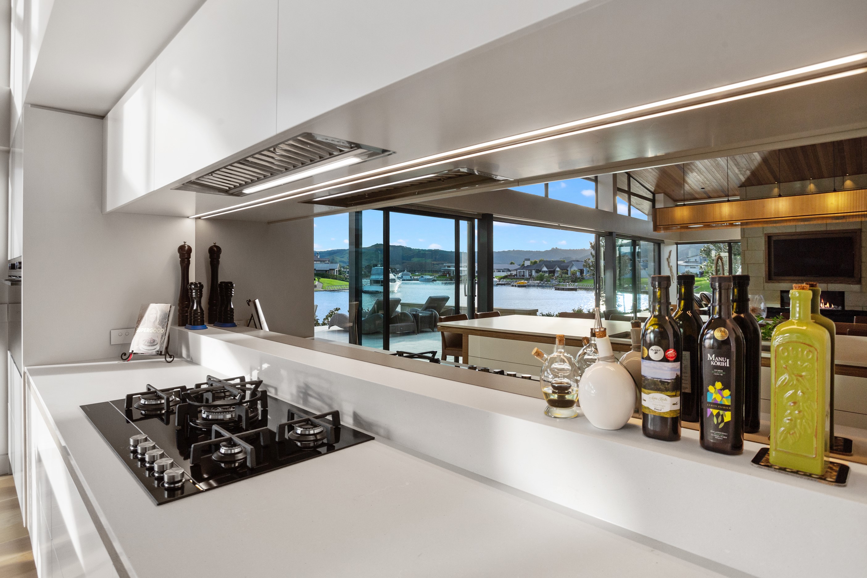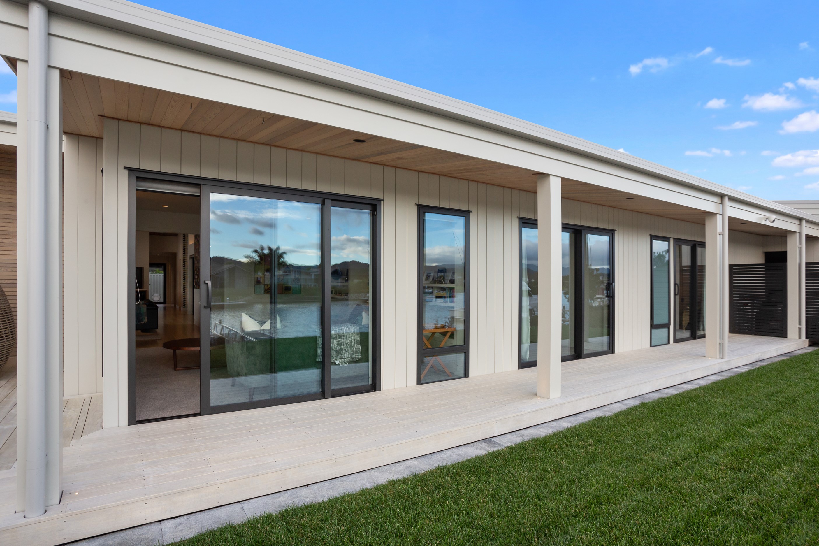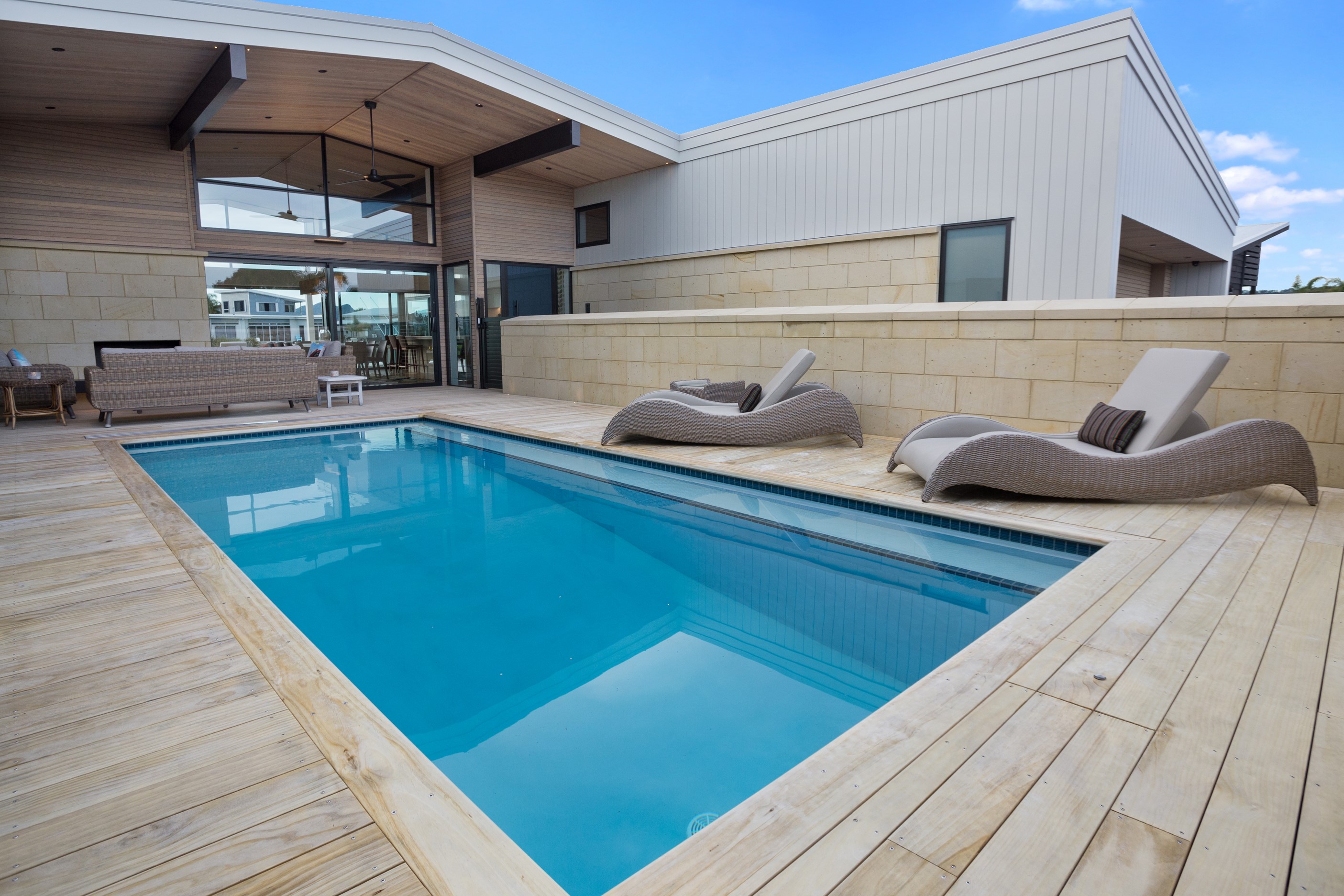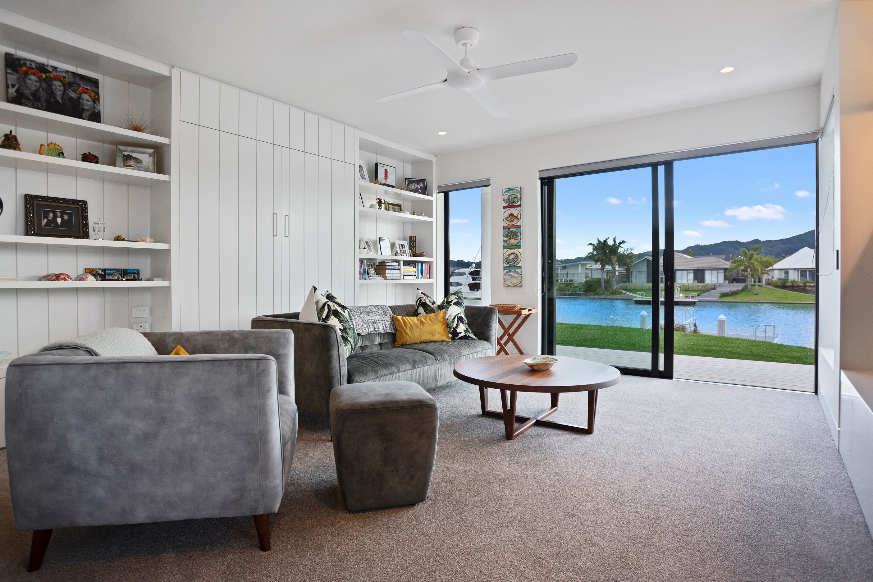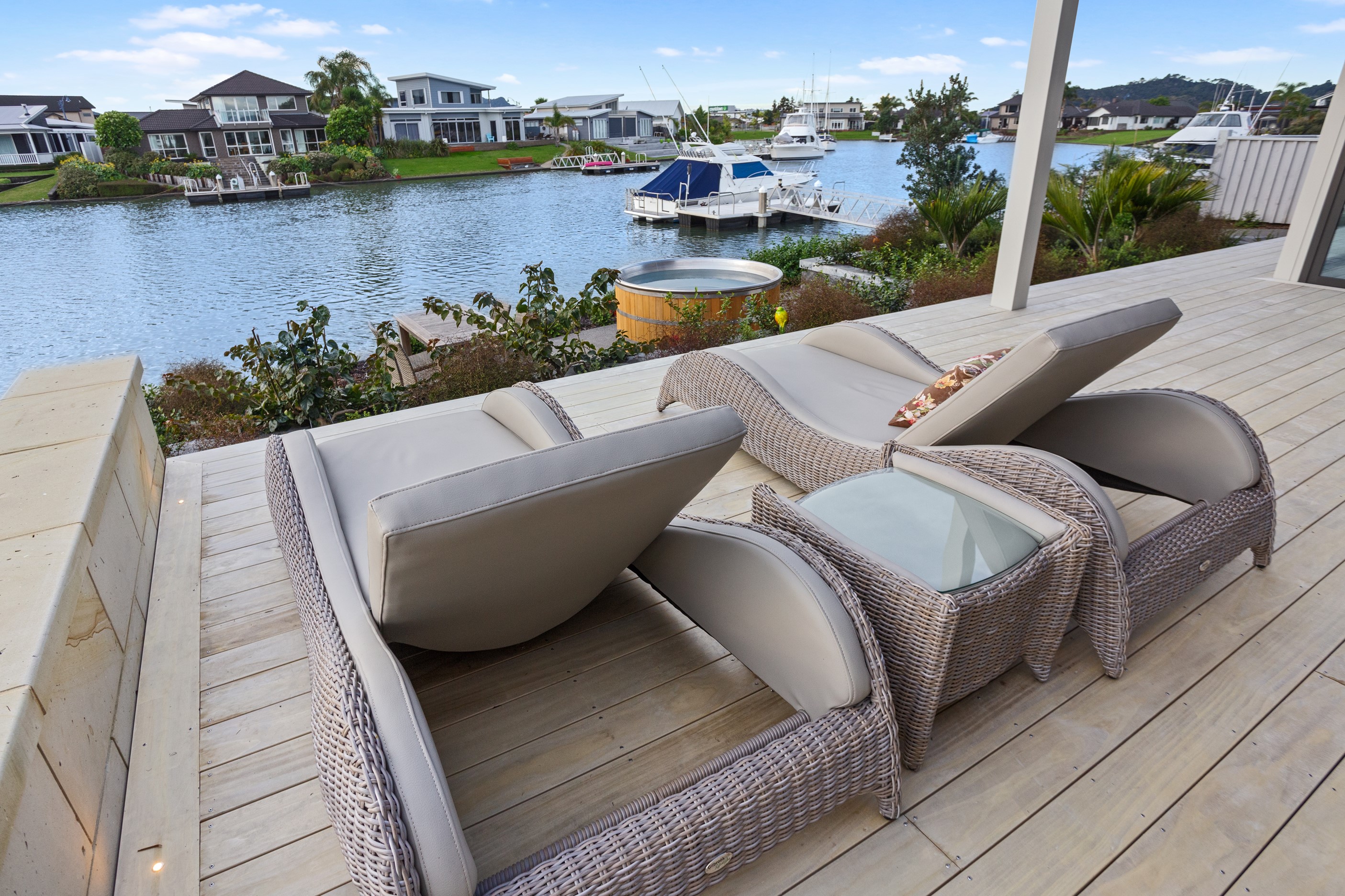 This architecturally designed beauty is on a corner site, but not one as you know it. Instead of perching on the apex of streets, this 477sqm three-bedroom home presides over a double corner section bordered by the canal. You can arrive at the front door by car, or to the entertaining area by boat. The Hinuera stone, weatherboard and cedar-clad house wraps an in-ground pool in a central courtyard. Inside you’ll find more solid timber – floors, kitchen features and built-in oak furniture. The TV lounge has an added bonus: a king-size guest bed that disappears into built-in cabinetry. The three bathrooms have handmade concrete basins and brushed-oak cabinets. As if that’s not enough, the house opens to decking on two canal fronts and has a hot tub on the lower level. Sustainability was high on the owners’ list, so you’ll find solar panels, which heat the home as well as the pool in summer. Batteries store the energy so they can live off the grid. There are electric-car chargers, FSC-certified wood and the double glazing is low-e and argon-filled for cool summers and warm winters. Coastal living at its finest.