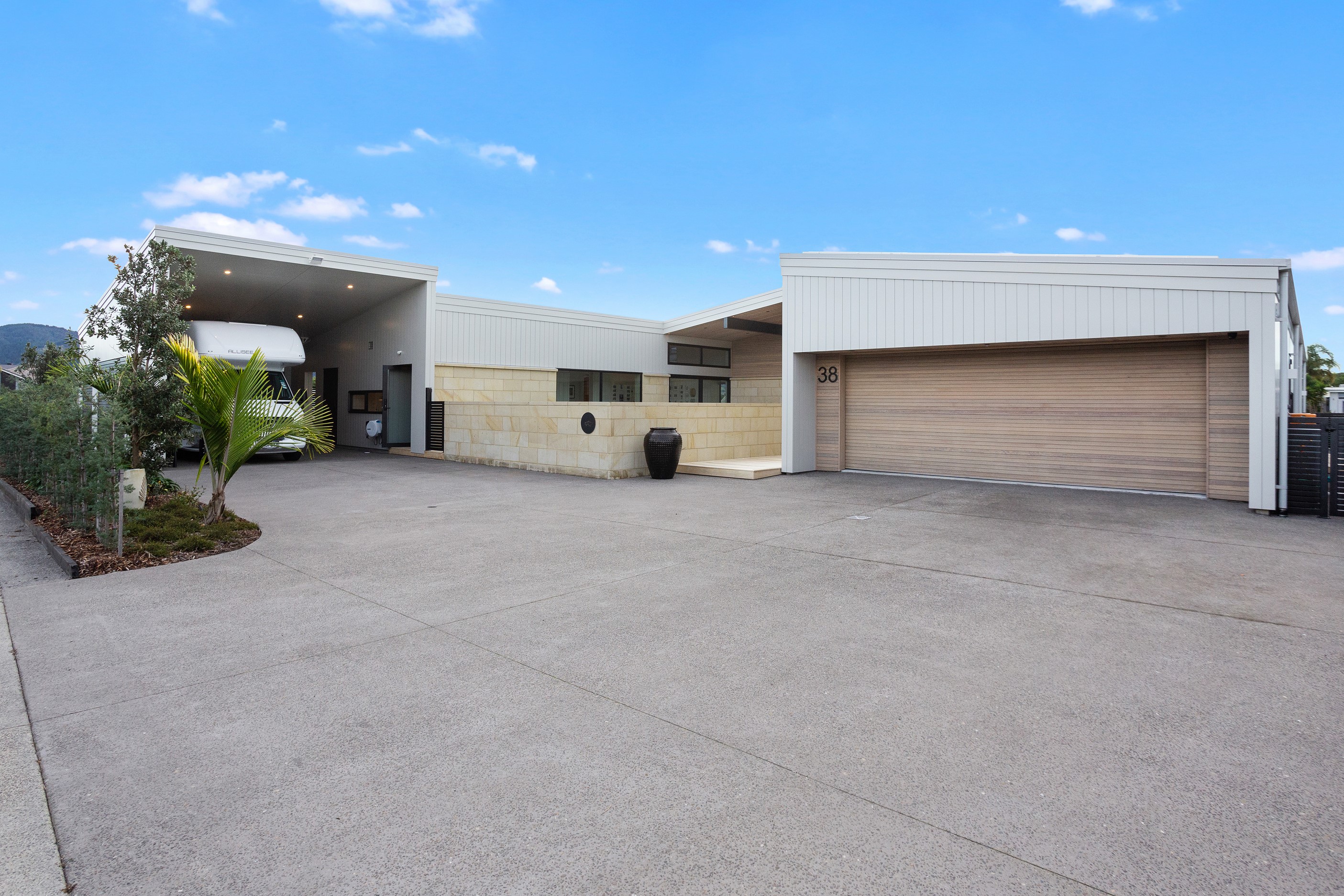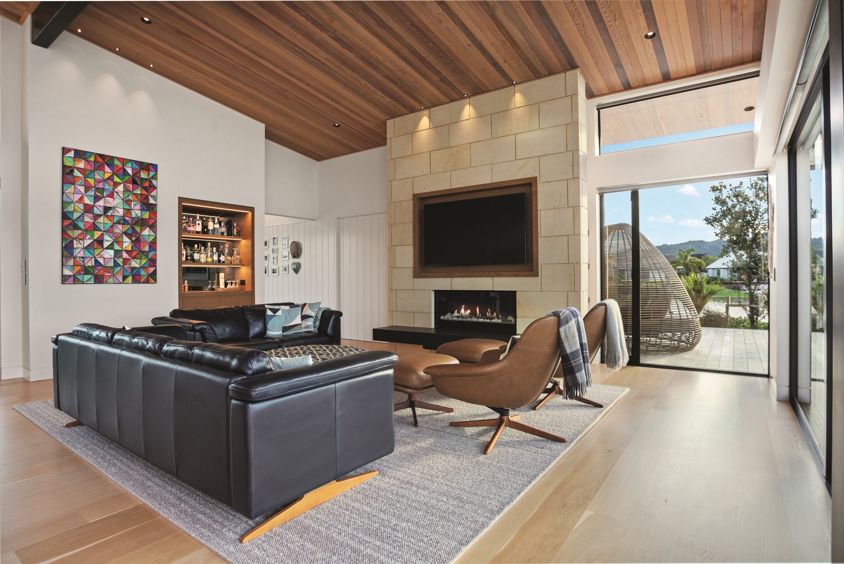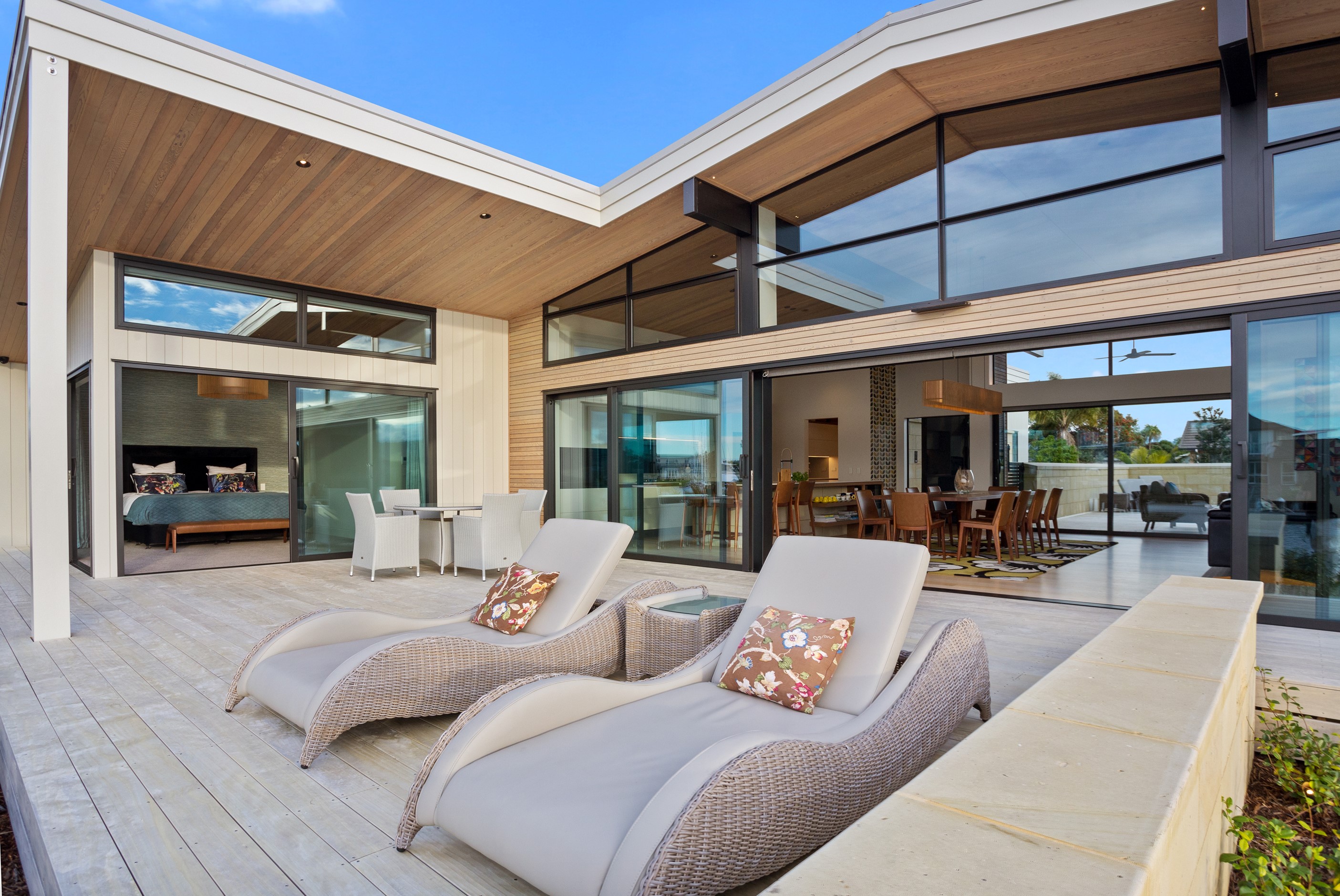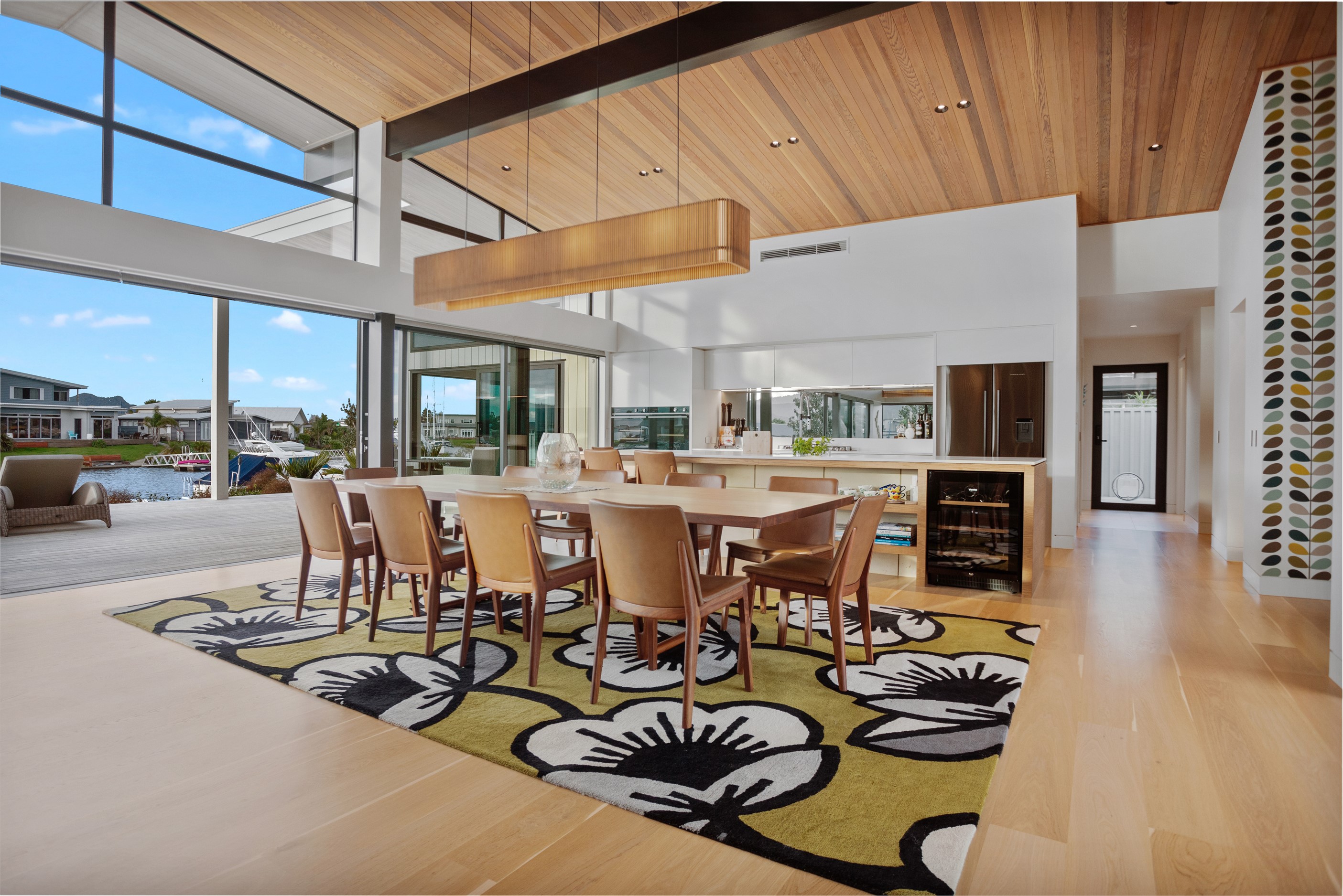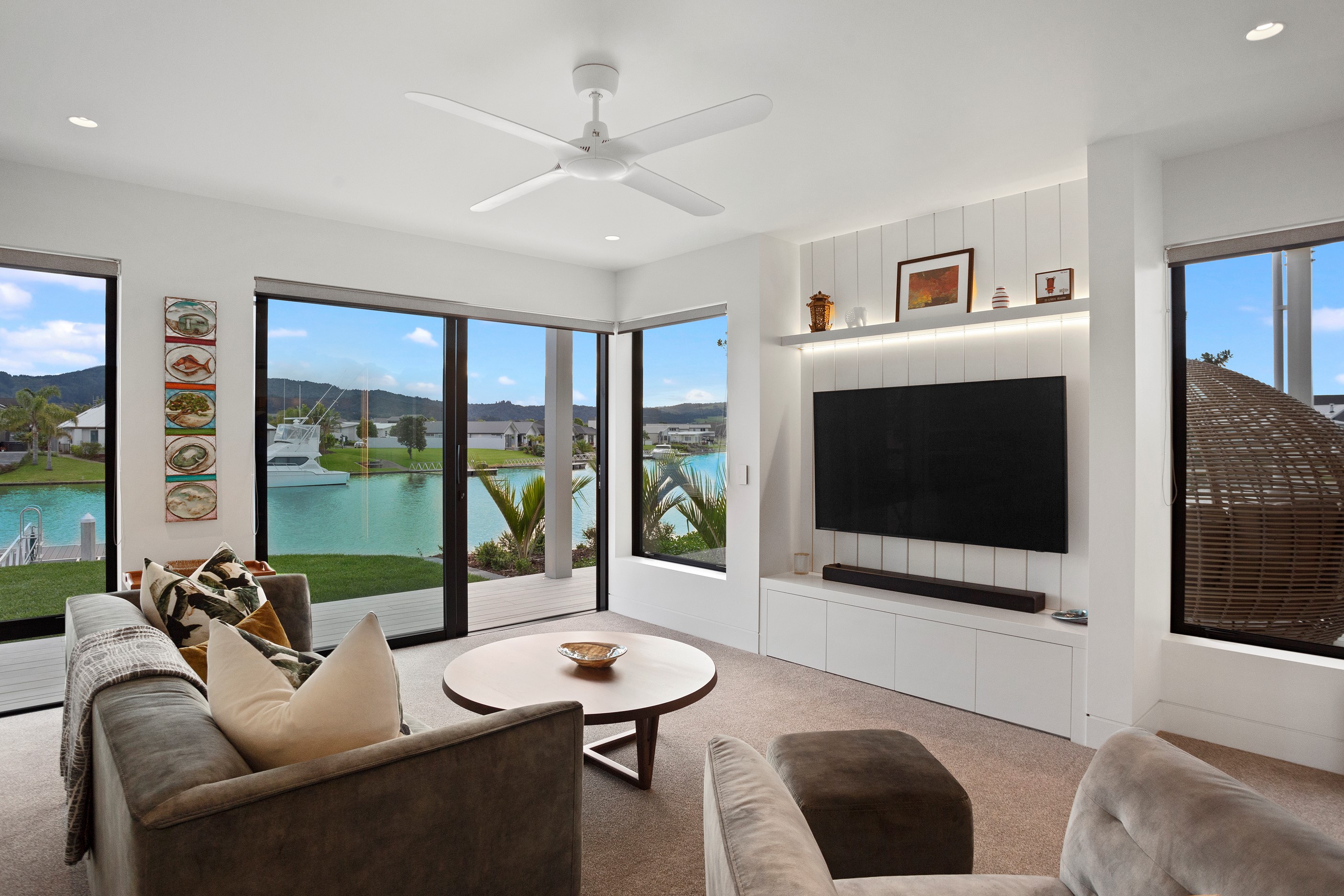 This architecturally designed beauty is on a corner site, but not one as you know it. Instead of perching on the apex of streets, this 477sqm three-bedroom home presides over a double corner section bordered by the canal. You can arrive at the front door by car, or to the entertaining area by boat. The Hinuera stone, weatherboard and cedar-clad house wraps an in-ground pool in a central courtyard. Inside you’ll find more solid timber – floors, kitchen features and built-in oak furniture. The TV lounge has an added bonus: a king-size guest bed that disappears into built-in cabinetry. The three bathrooms have handmade concrete basins and brushed-oak cabinets. As if that’s not enough, the house opens to decking on two canal fronts and has a hot tub on the lower level. Sustainability was high on the owners’ list, so you’ll find solar panels, which heat the home as well as the pool in summer. Batteries store the energy so they can live off the grid. There are electric-car chargers, FSC-certified wood and the double glazing is low-e and argon-filled for cool summers and warm winters. Coastal living at its finest.