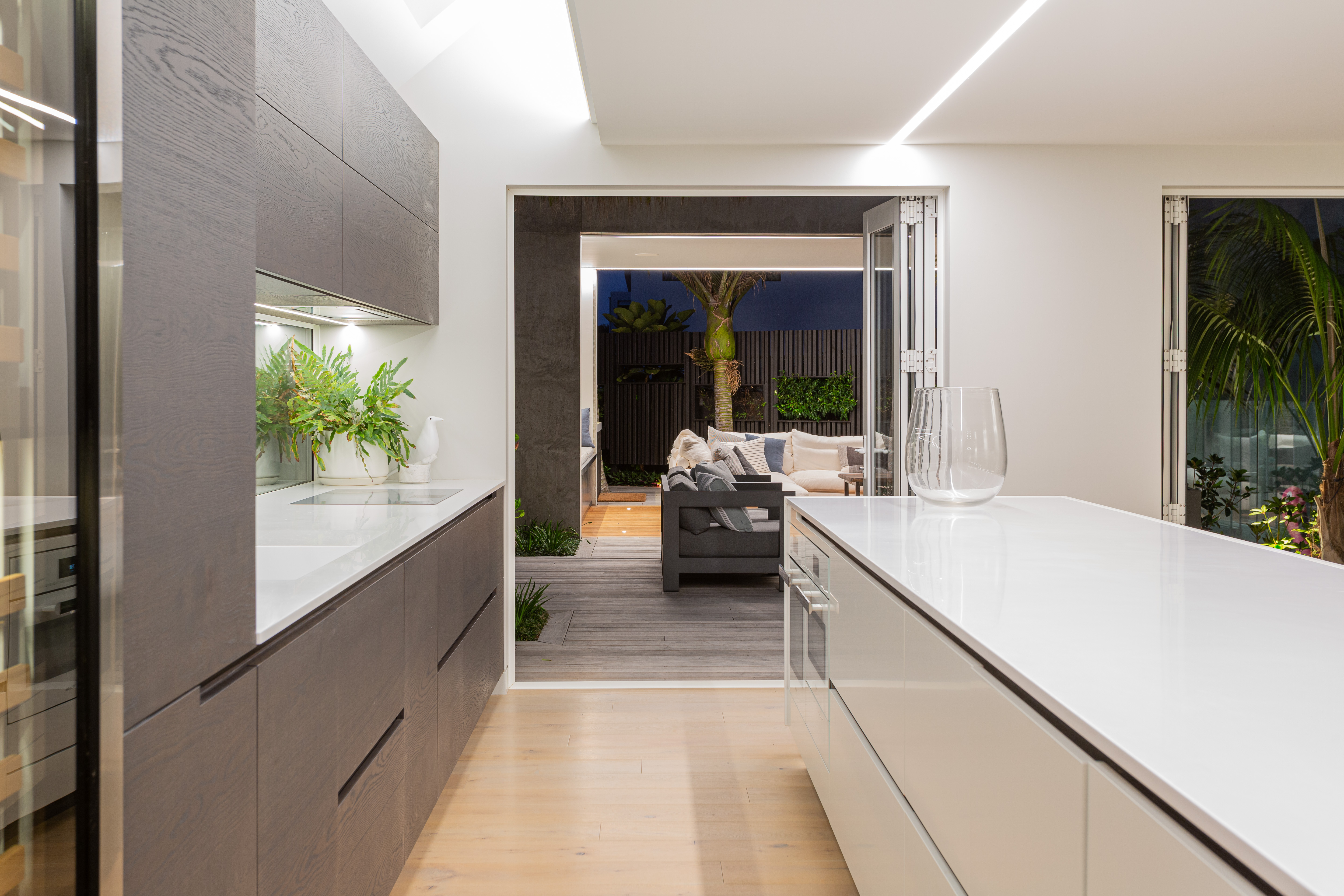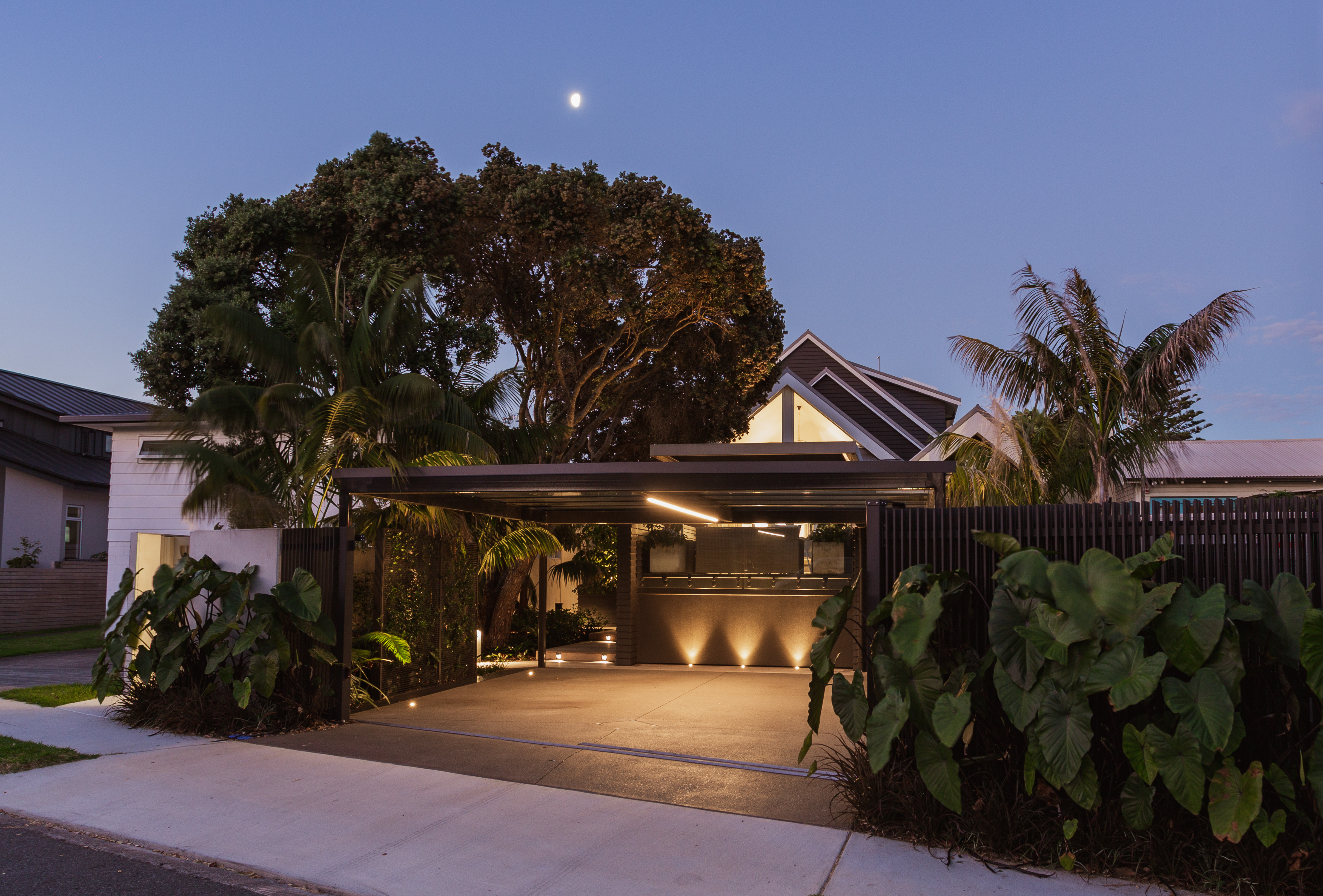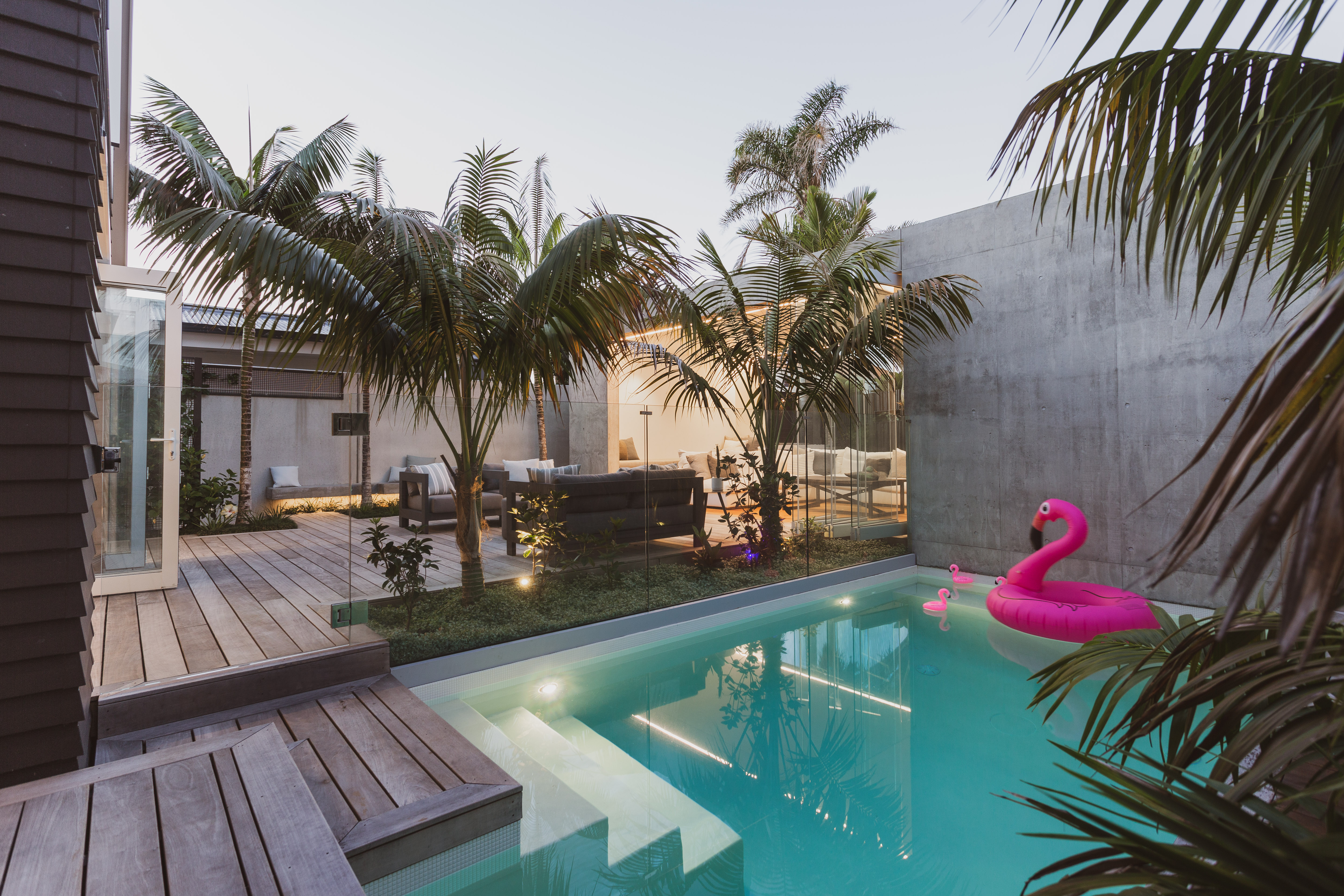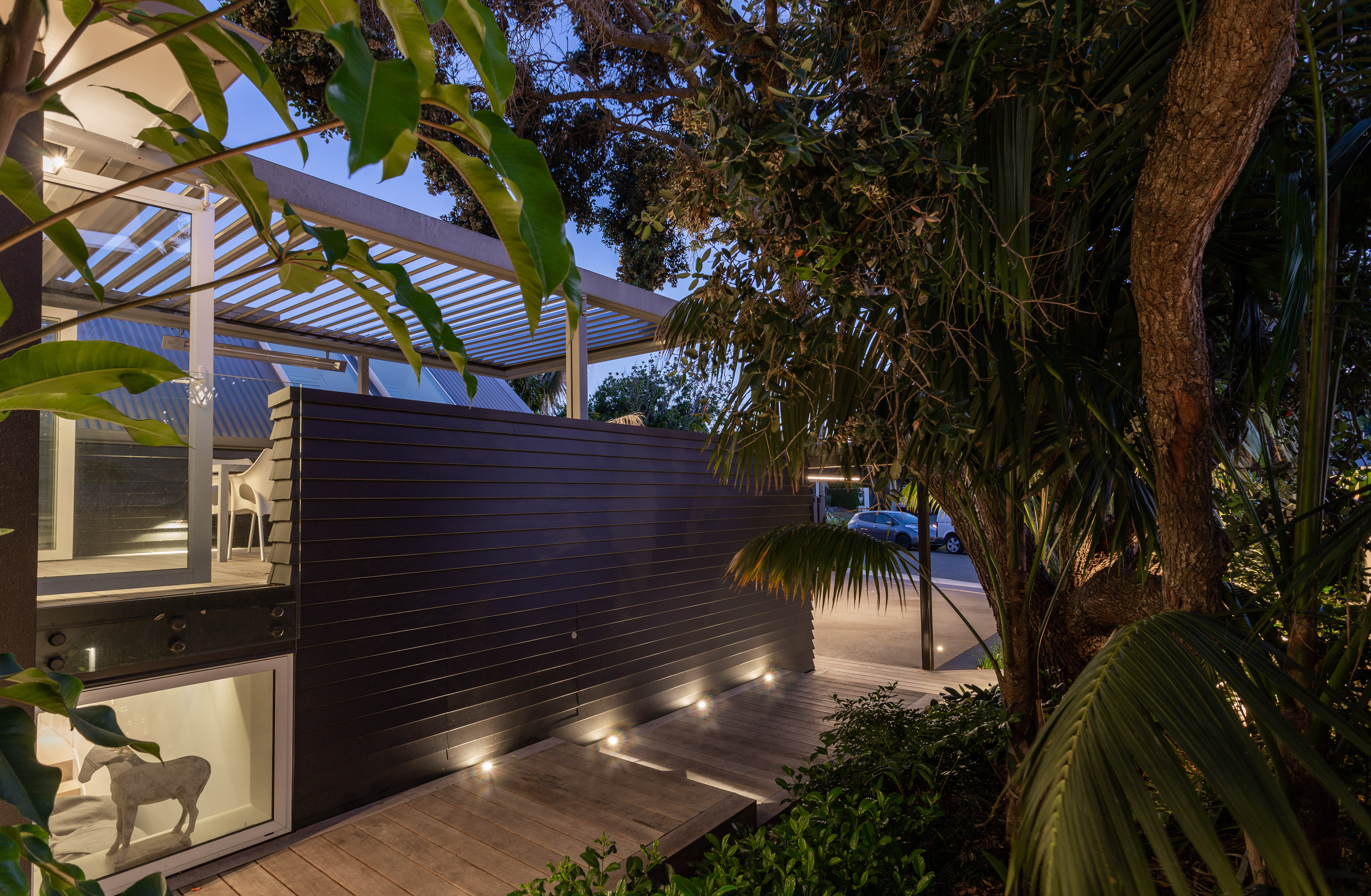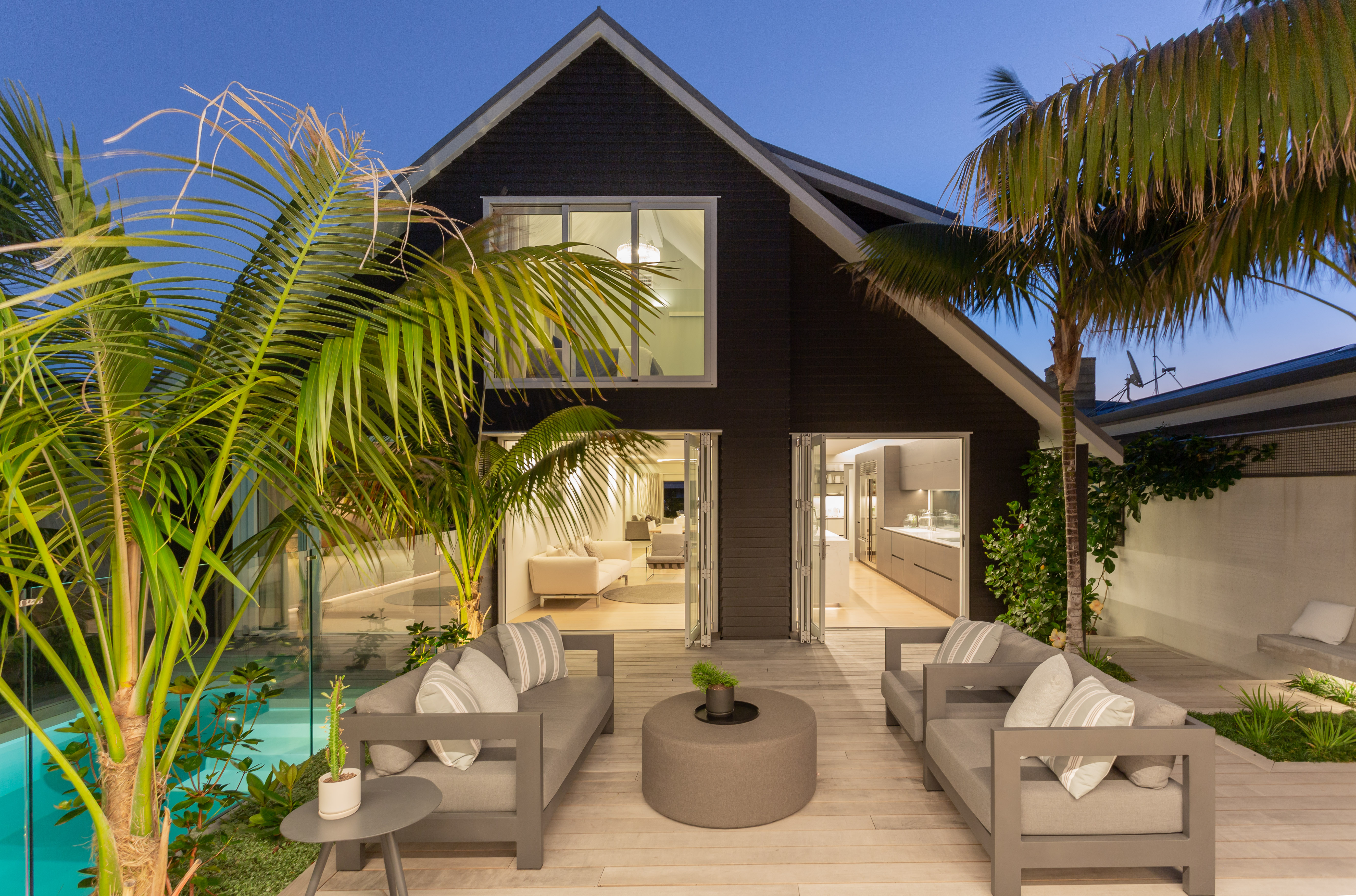 The project to renovate this architect designed four-bedroom house was major, but the results are spectacular. As well as an interior revamp, the outside was clad in striking black Linea weatherboard with white edging and architectural landscaping features were installed. The pool house, separated from the home by a private courtyard and the pool itself, is a major feature of the work. It was constructed with poured concrete and given a ply-grain finish. This magical space has frameless glass bifold doors, decking that flows from inside to out and all the bells and whistles. You’ll also find sophisticated automation, audio, and ducted air conditioning and heating in here and throughout the main house. The kitchen is a statement in style, with a five-metre marble island taking centre stage. Much of the interior lighting is custom designed to provide a minimalist finish, and high-end products are used everywhere: oak flooring, Danish bathroomware, wool carpets, specialty tiles and frameless showers. A glass-roofed carport, tropical landscaping and an automated entrance accentuate the class of the project.