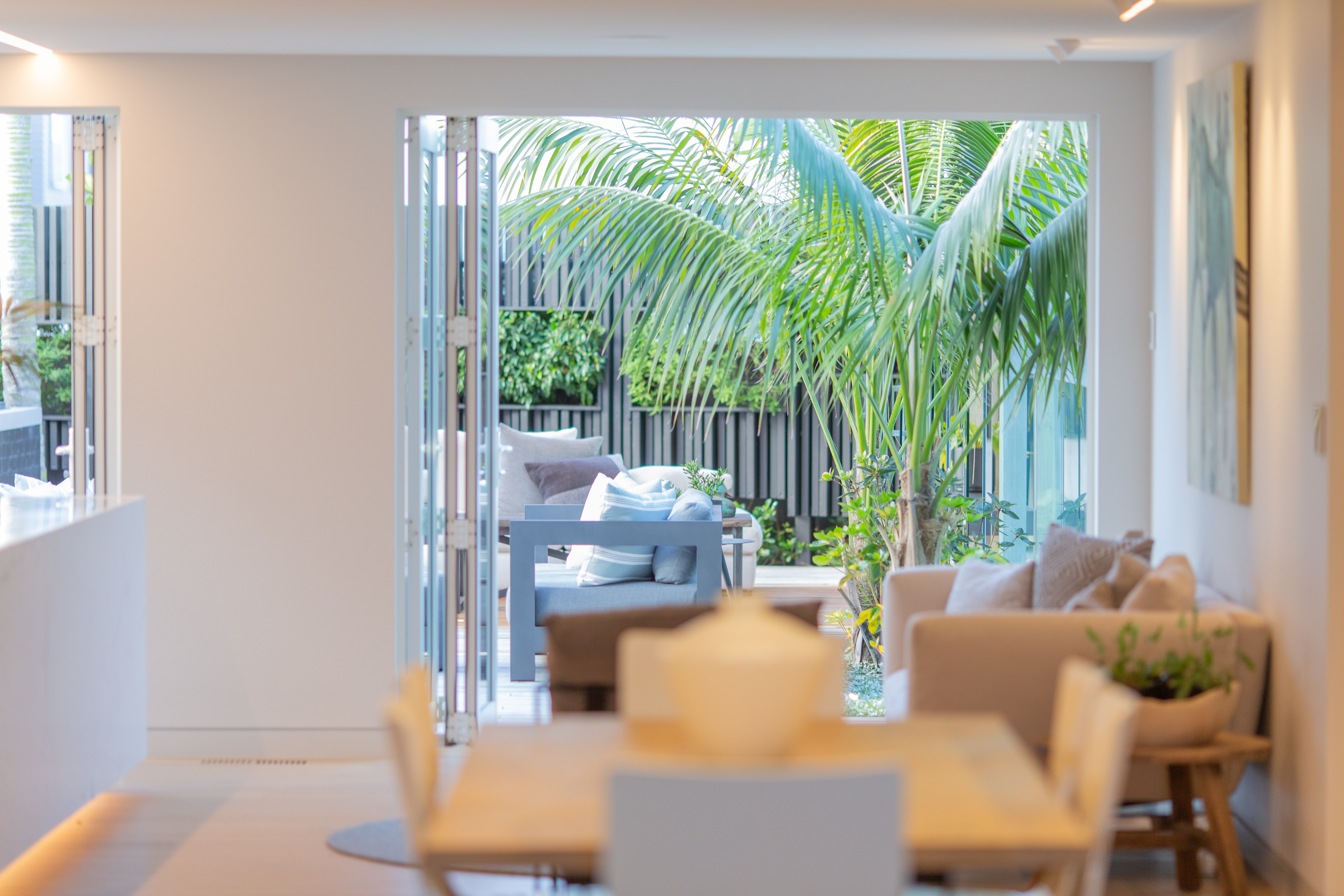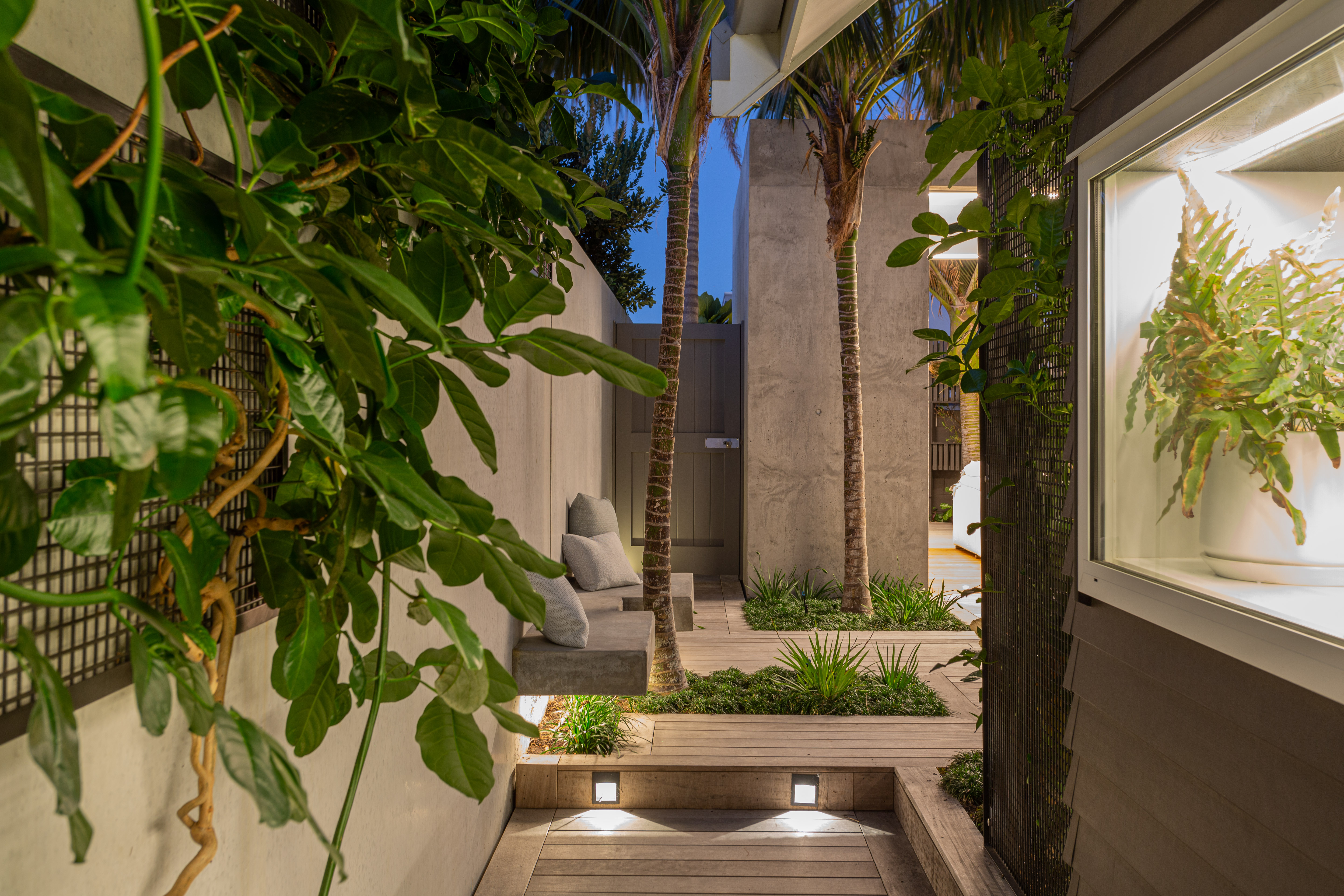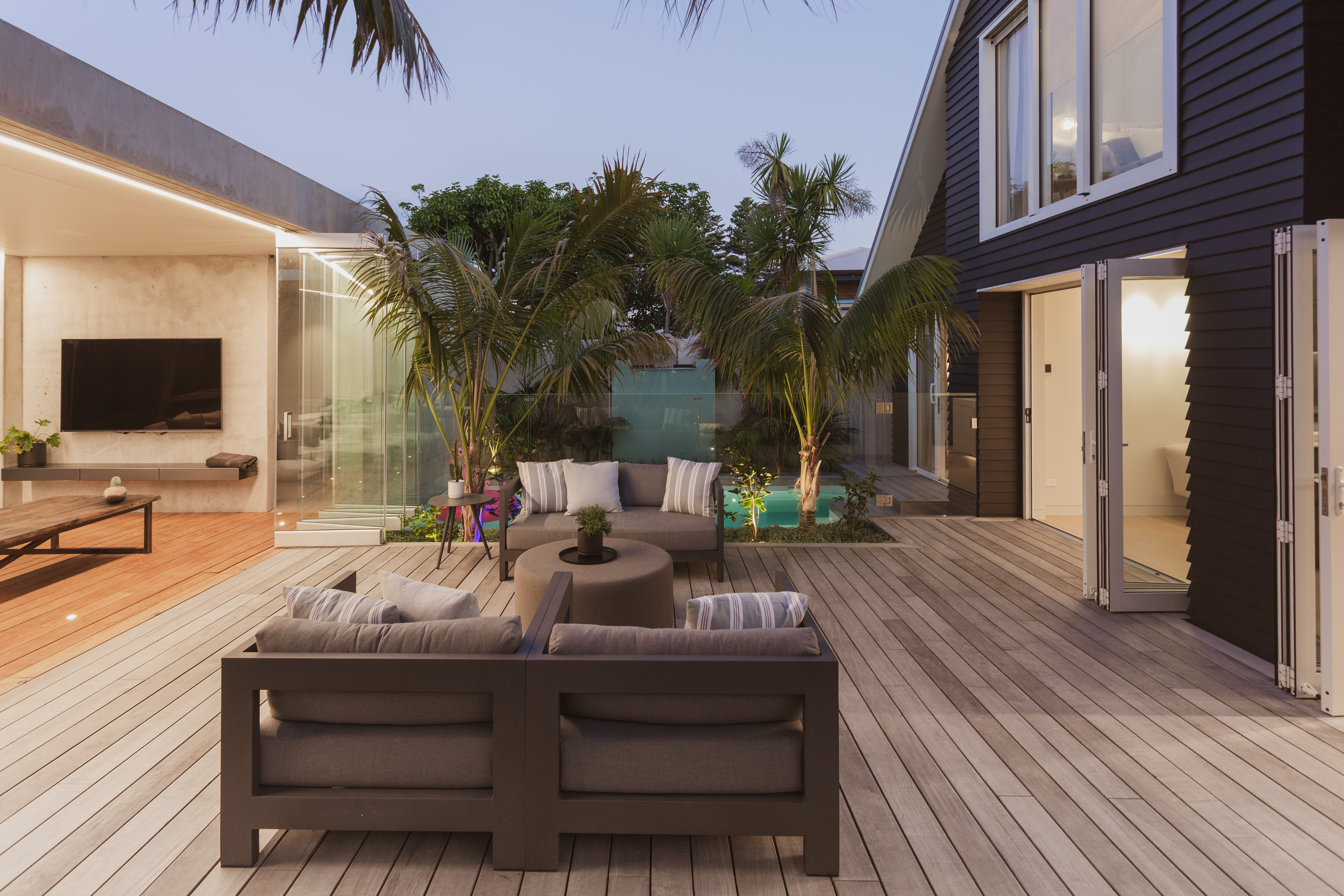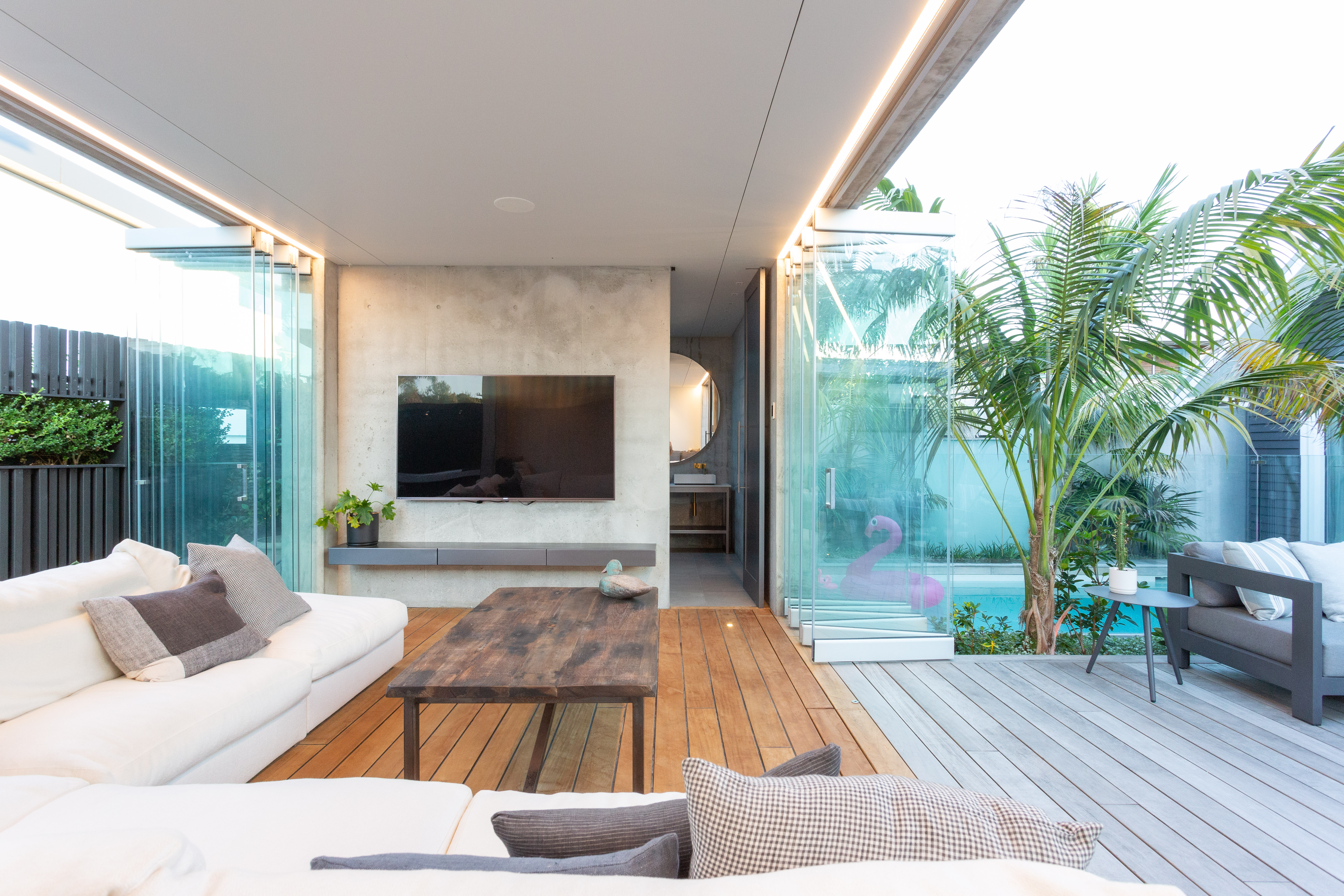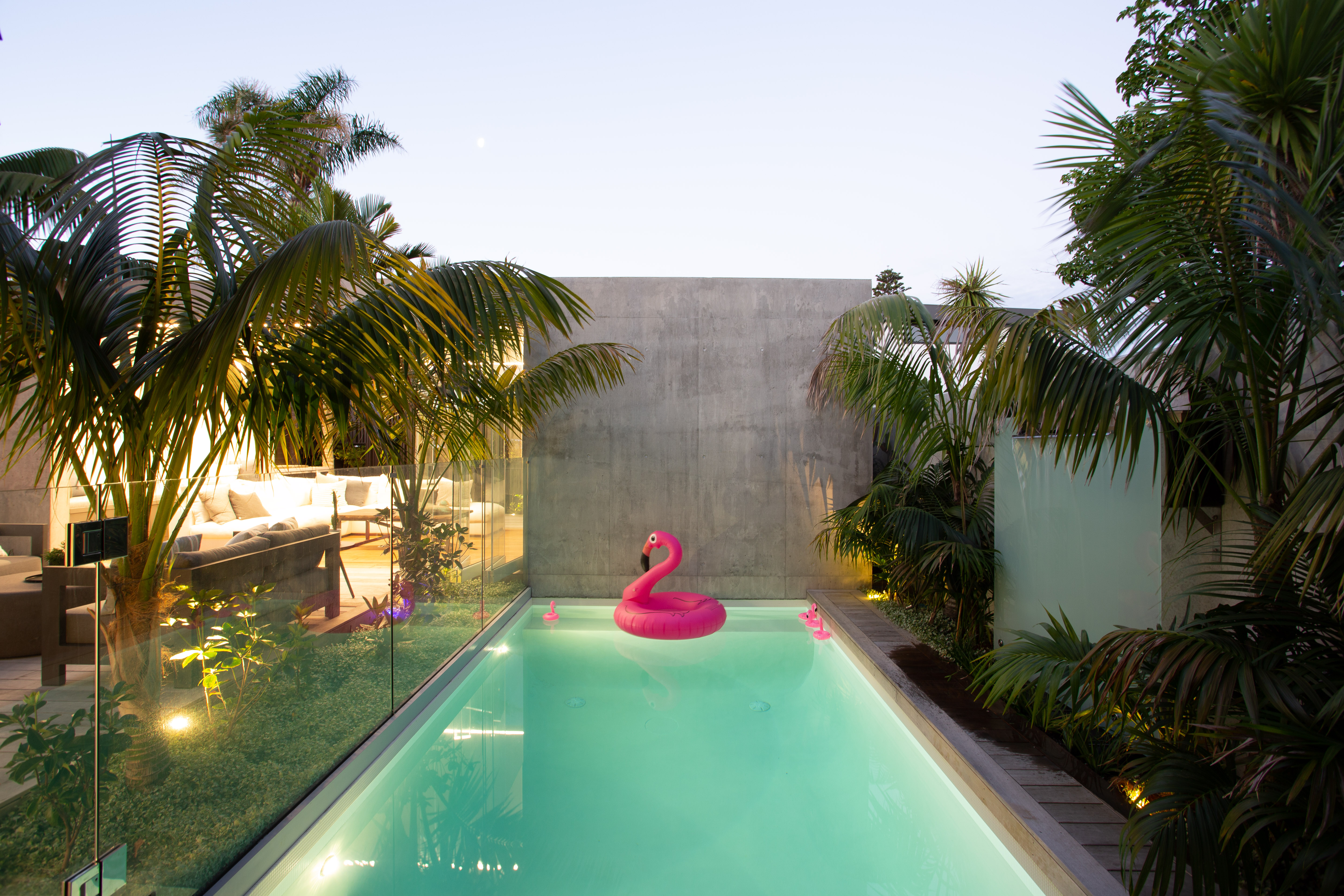 The project to renovate this architect designed four-bedroom house was major, but the results are spectacular. As well as an interior revamp, the outside was clad in striking black Linea weatherboard with white edging and architectural landscaping features were installed. The pool house, separated from the home by a private courtyard and the pool itself, is a major feature of the work. It was constructed with poured concrete and given a ply-grain finish. This magical space has frameless glass bifold doors, decking that flows from inside to out and all the bells and whistles. You’ll also find sophisticated automation, audio, and ducted air conditioning and heating in here and throughout the main house. The kitchen is a statement in style, with a five-metre marble island taking centre stage. Much of the interior lighting is custom designed to provide a minimalist finish, and high-end products are used everywhere: oak flooring, Danish bathroomware, wool carpets, specialty tiles and frameless showers. A glass-roofed carport, tropical landscaping and an automated entrance accentuate the class of the project.