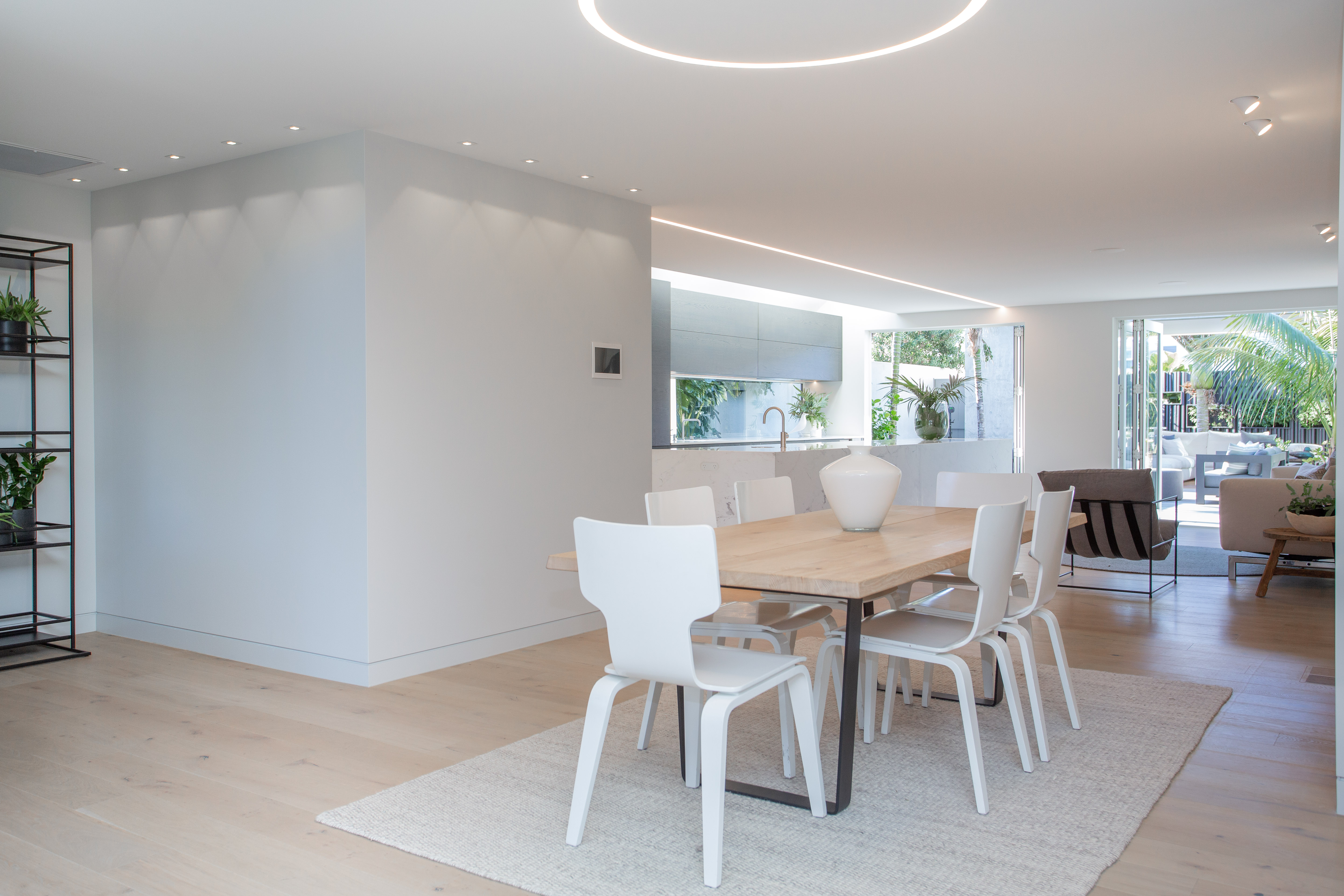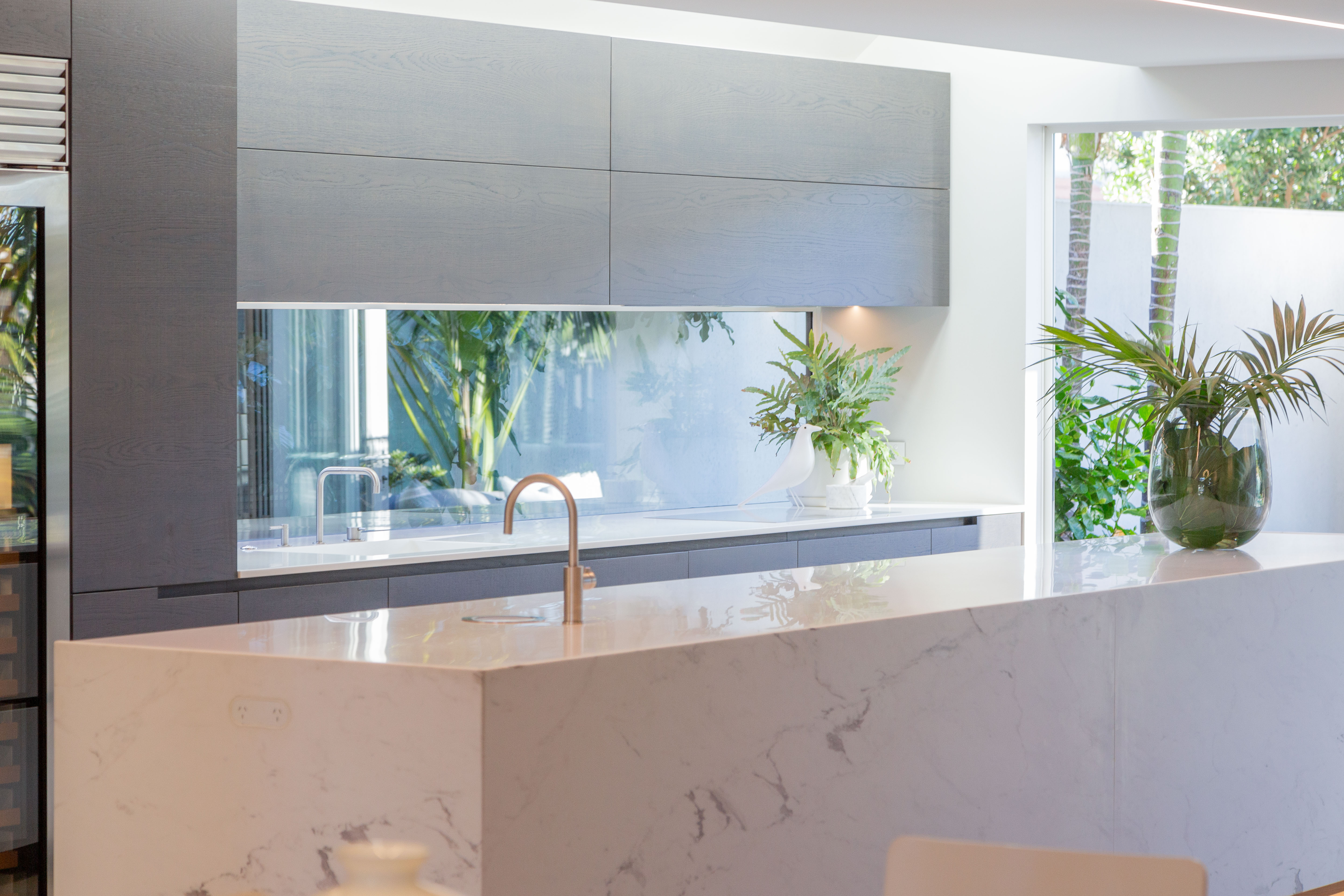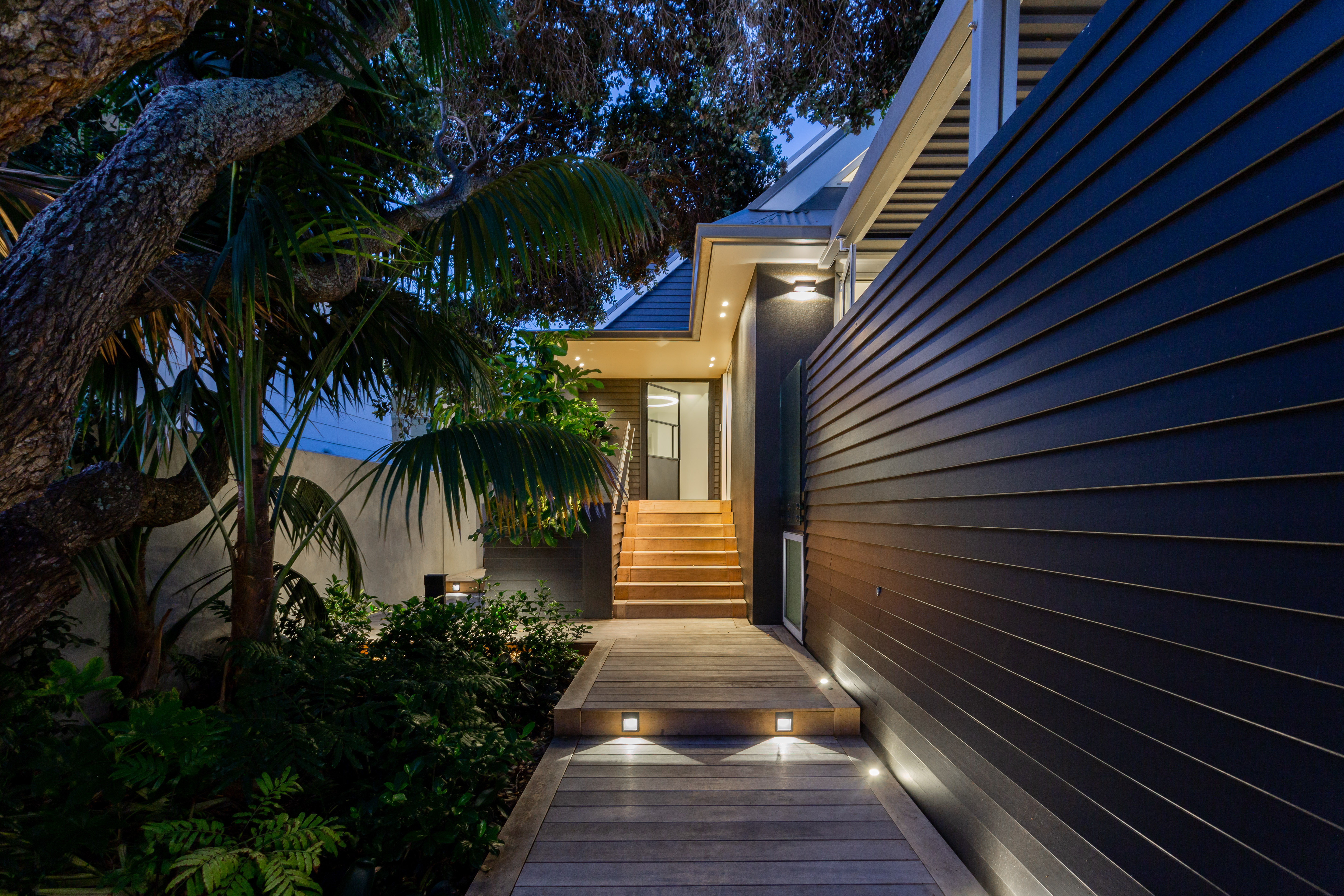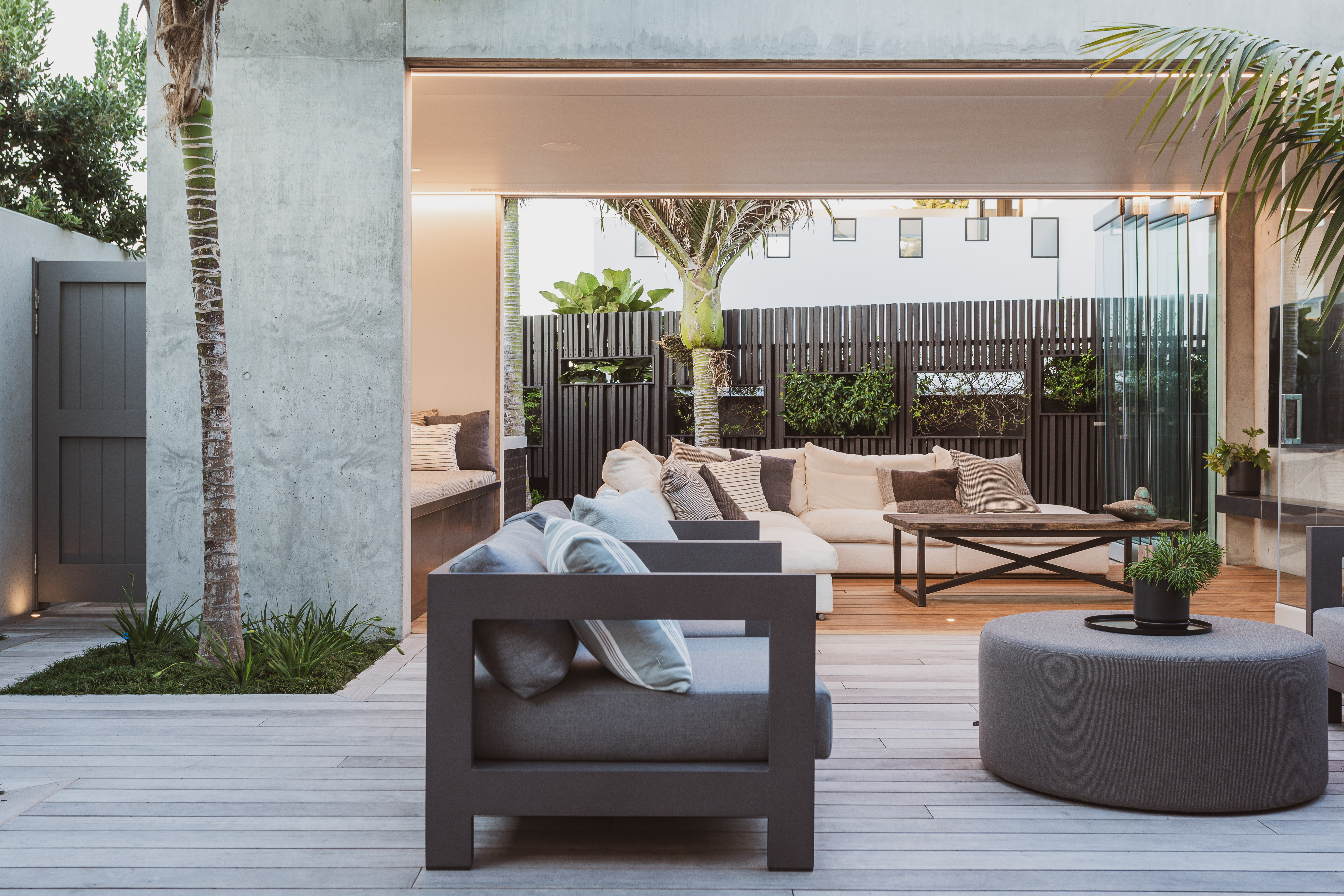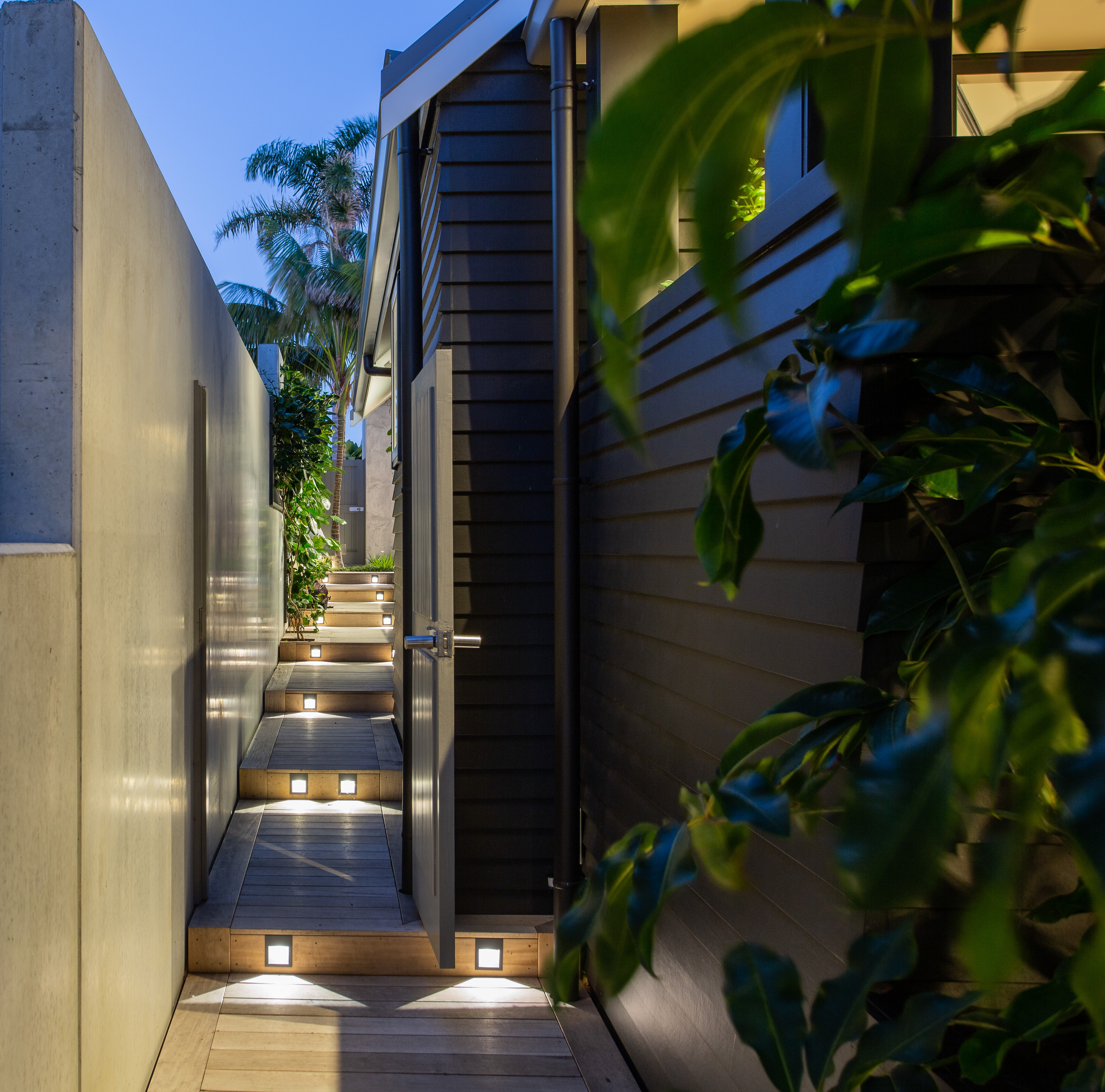 The project to renovate this architect designed four-bedroom house was major, but the results are spectacular. As well as an interior revamp, the outside was clad in striking black Linea weatherboard with white edging and architectural landscaping features were installed. The pool house, separated from the home by a private courtyard and the pool itself, is a major feature of the work. It was constructed with poured concrete and given a ply-grain finish. This magical space has frameless glass bifold doors, decking that flows from inside to out and all the bells and whistles. You’ll also find sophisticated automation, audio, and ducted air conditioning and heating in here and throughout the main house. The kitchen is a statement in style, with a five-metre marble island taking centre stage. Much of the interior lighting is custom designed to provide a minimalist finish, and high-end products are used everywhere: oak flooring, Danish bathroomware, wool carpets, specialty tiles and frameless showers. A glass-roofed carport, tropical landscaping and an automated entrance accentuate the class of the project.