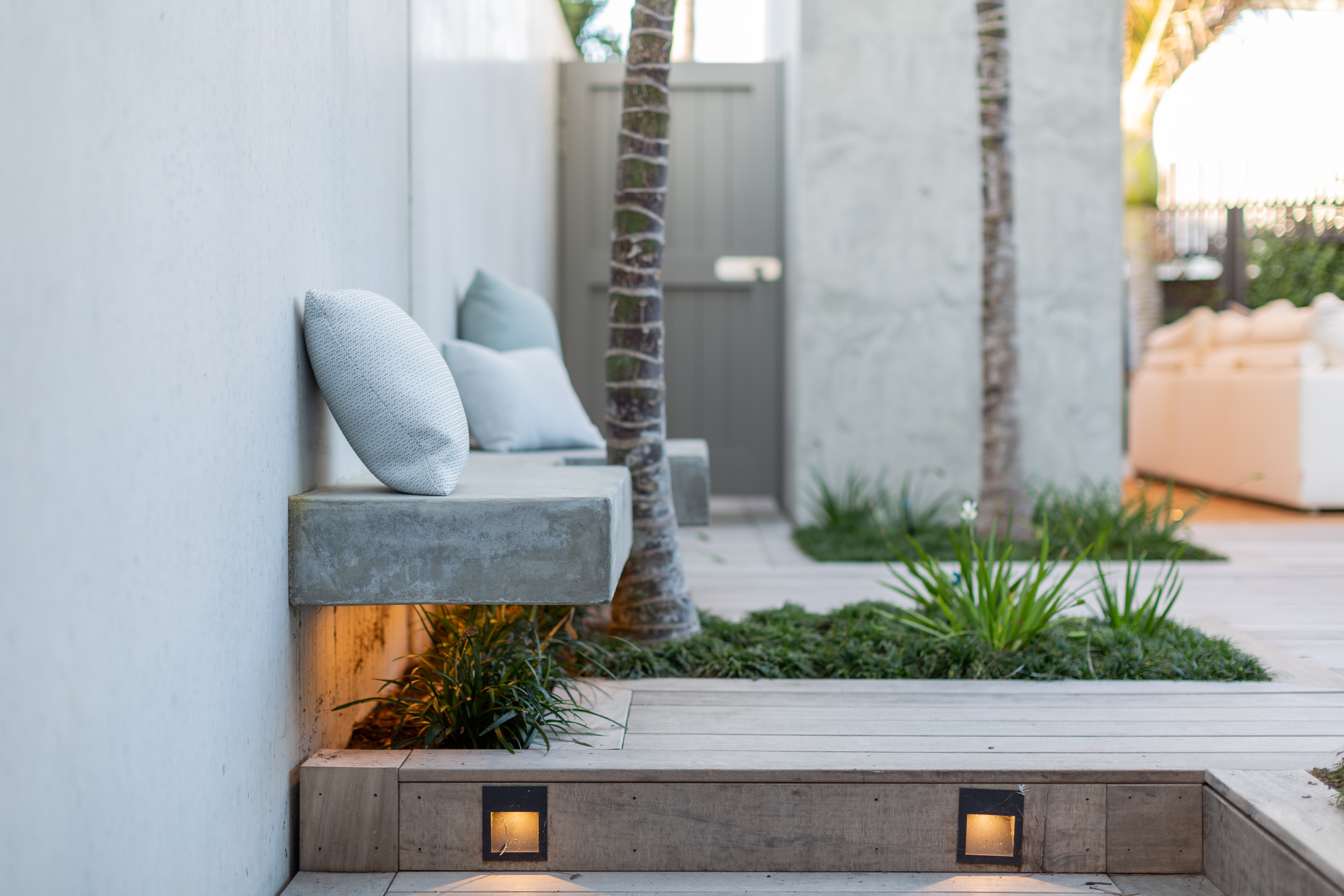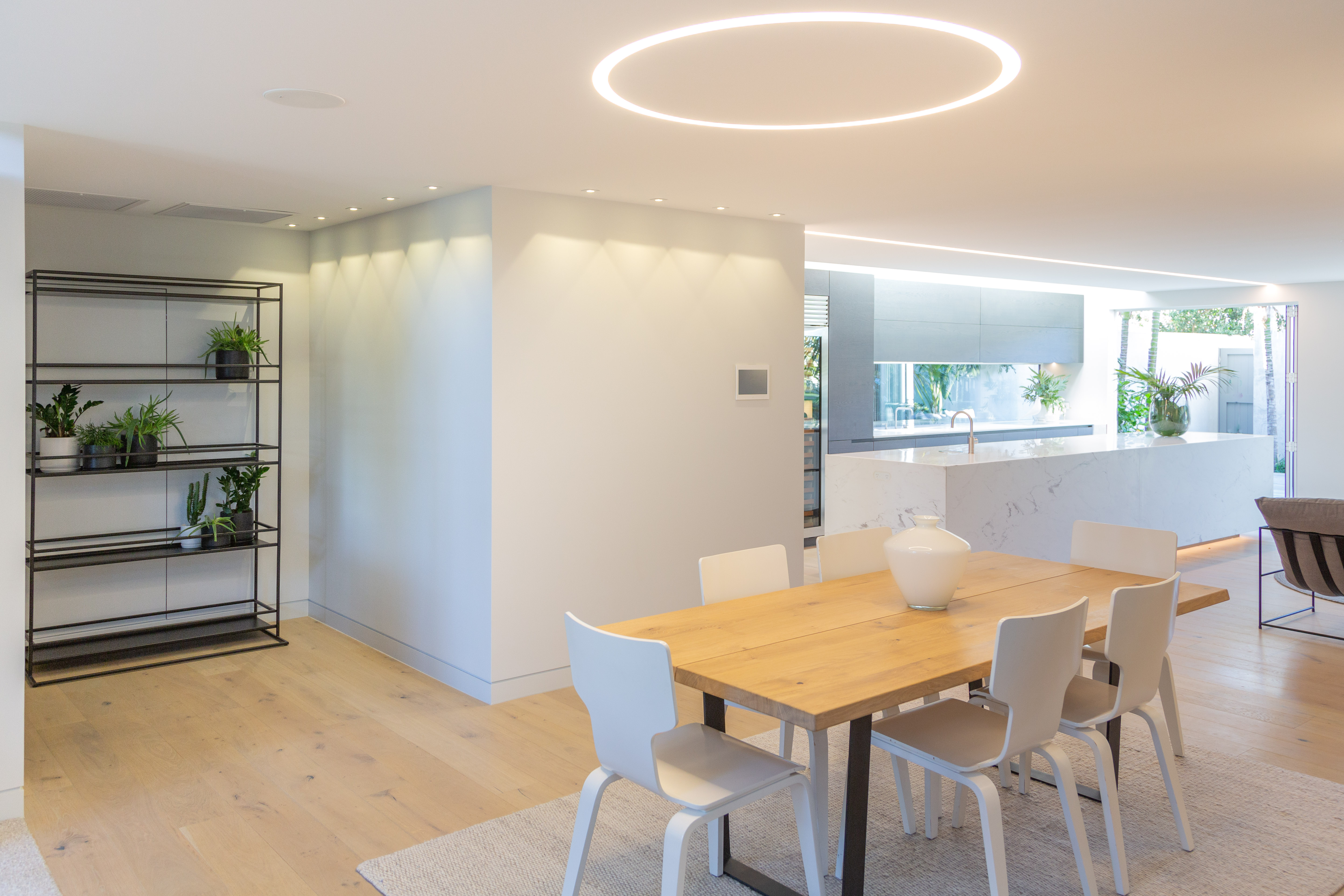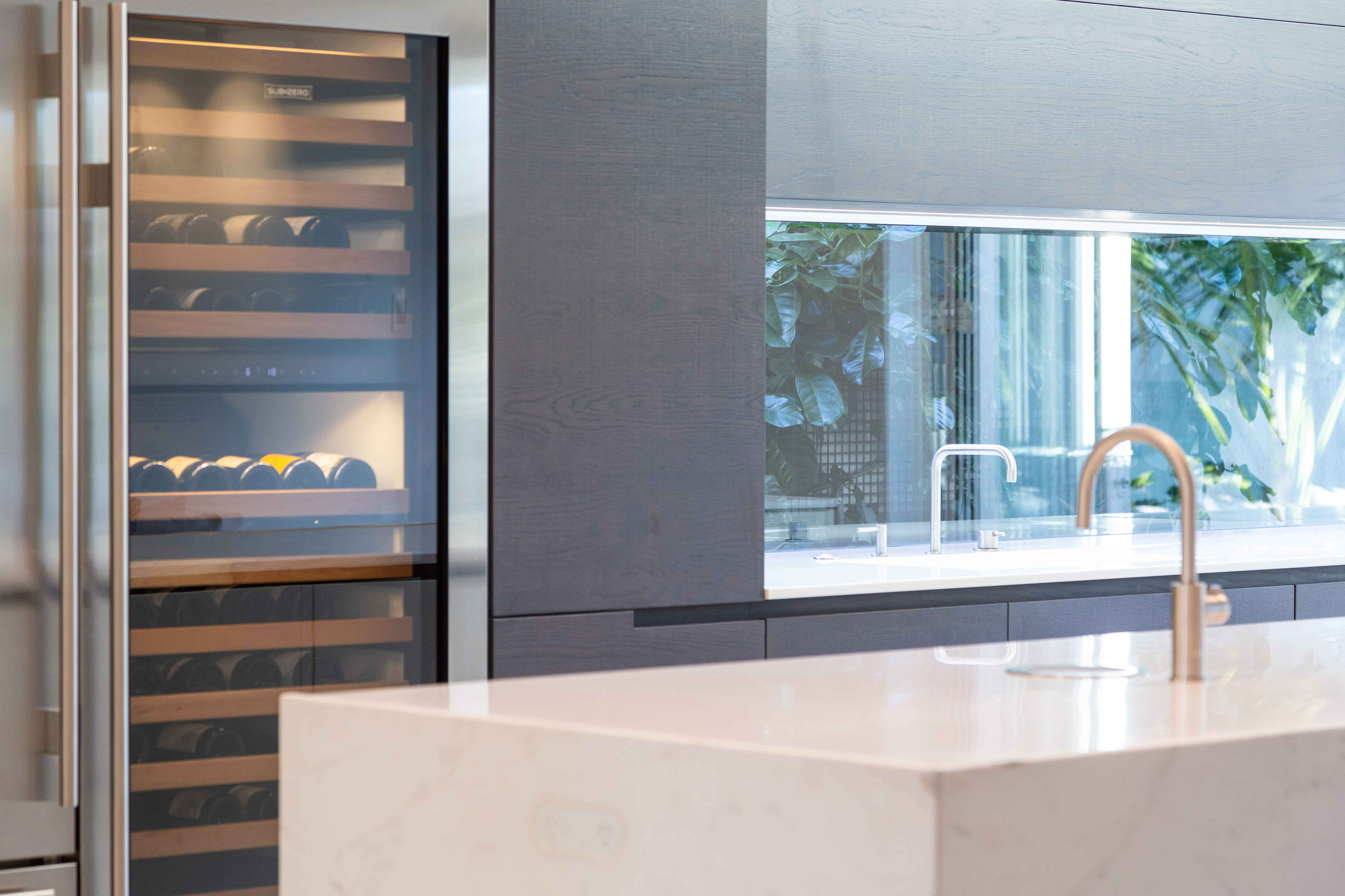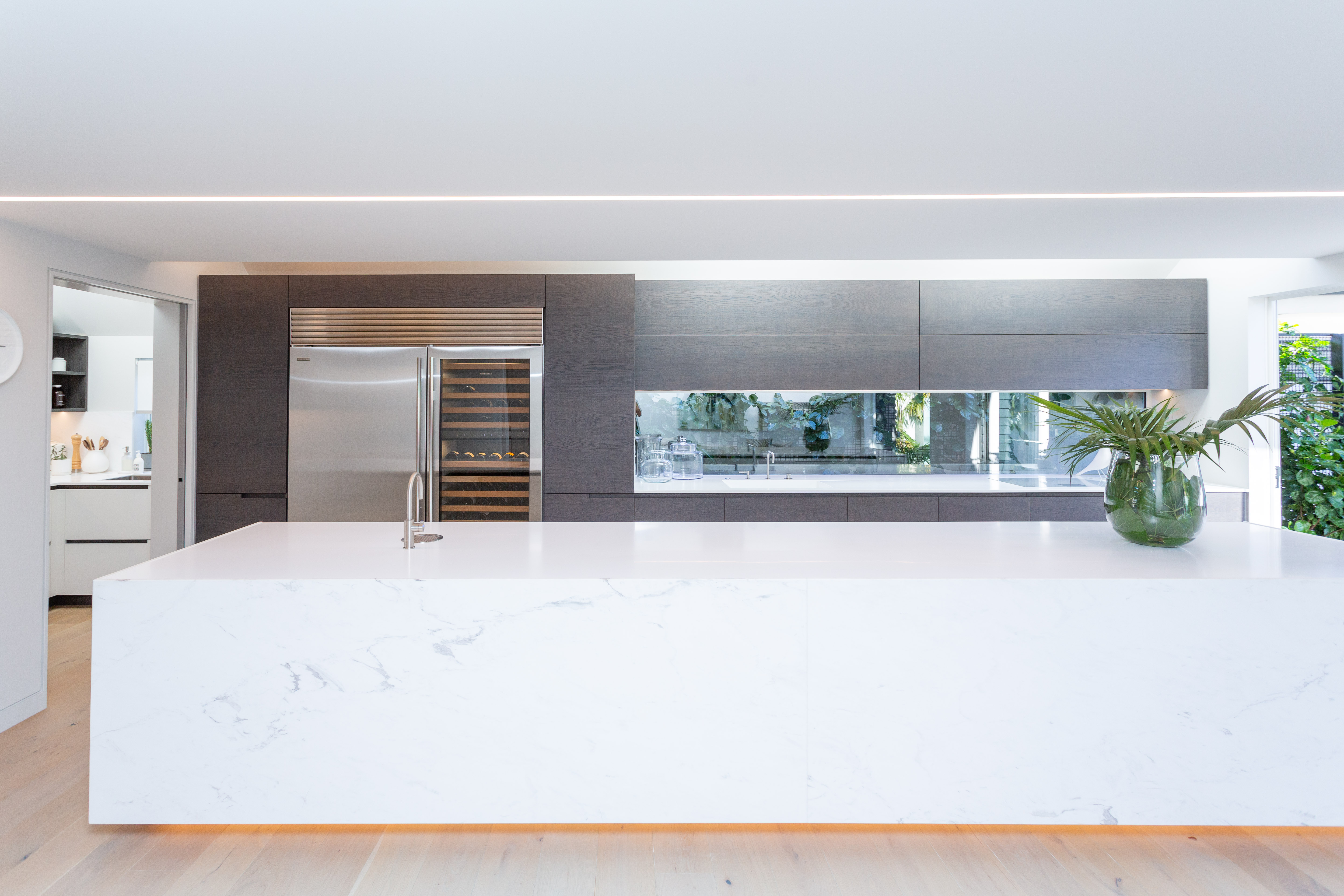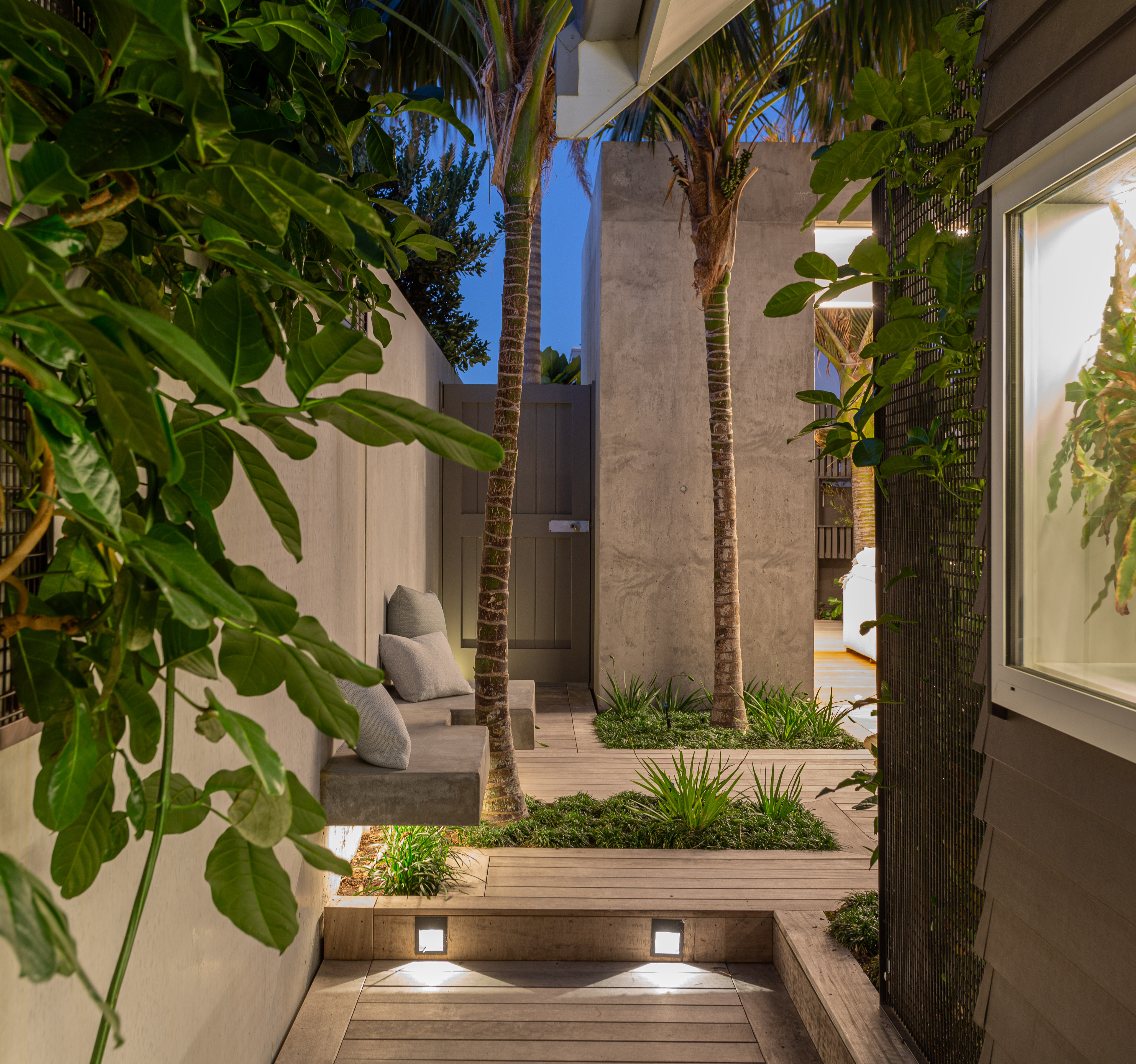 The project to renovate this architect designed four-bedroom house was major, but the results are spectacular. As well as an interior revamp, the outside was clad in striking black Linea weatherboard with white edging and architectural landscaping features were installed. The pool house, separated from the home by a private courtyard and the pool itself, is a major feature of the work. It was constructed with poured concrete and given a ply-grain finish. This magical space has frameless glass bifold doors, decking that flows from inside to out and all the bells and whistles. You’ll also find sophisticated automation, audio, and ducted air conditioning and heating in here and throughout the main house. The kitchen is a statement in style, with a five-metre marble island taking centre stage. Much of the interior lighting is custom designed to provide a minimalist finish, and high-end products are used everywhere: oak flooring, Danish bathroomware, wool carpets, specialty tiles and frameless showers. A glass-roofed carport, tropical landscaping and an automated entrance accentuate the class of the project.