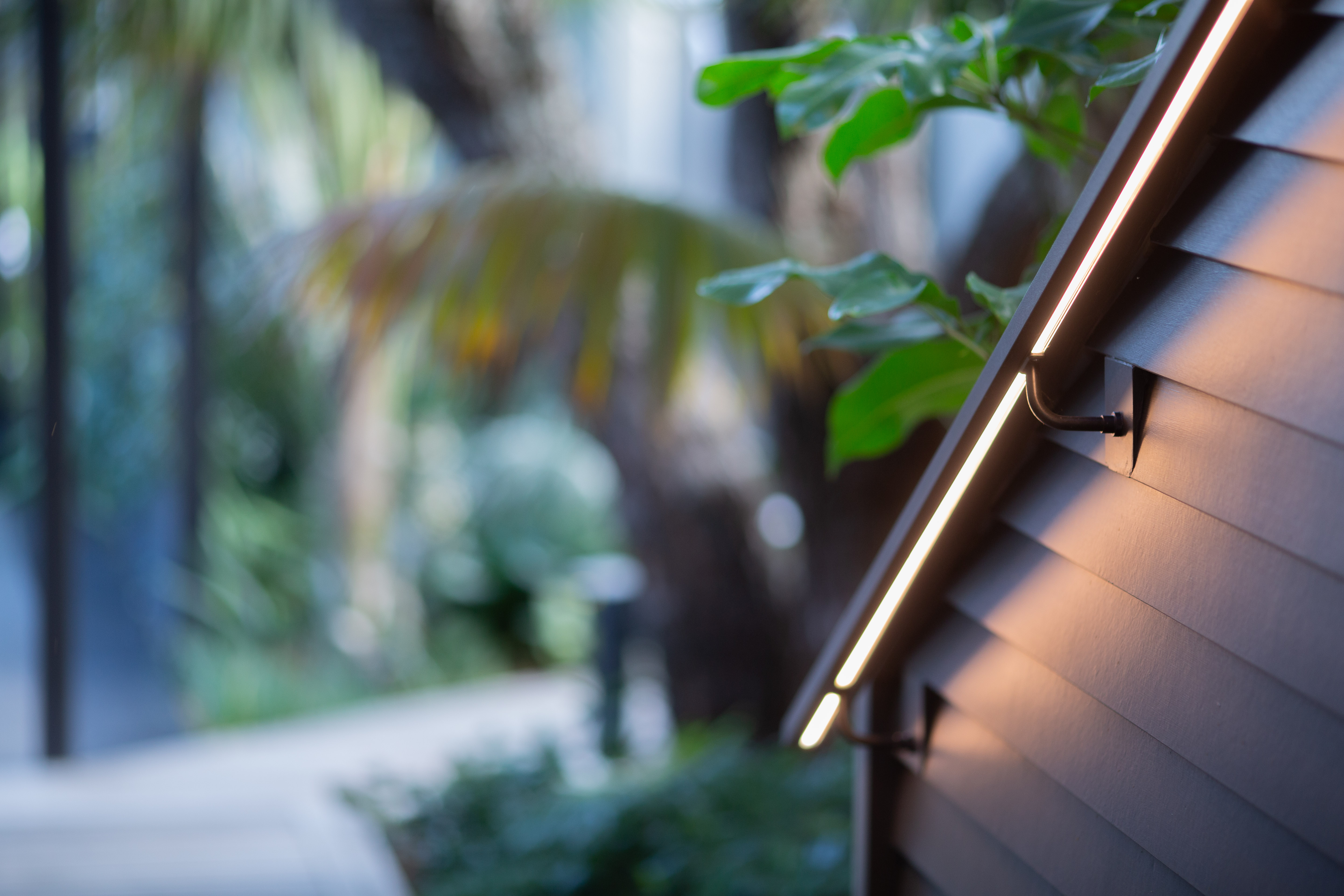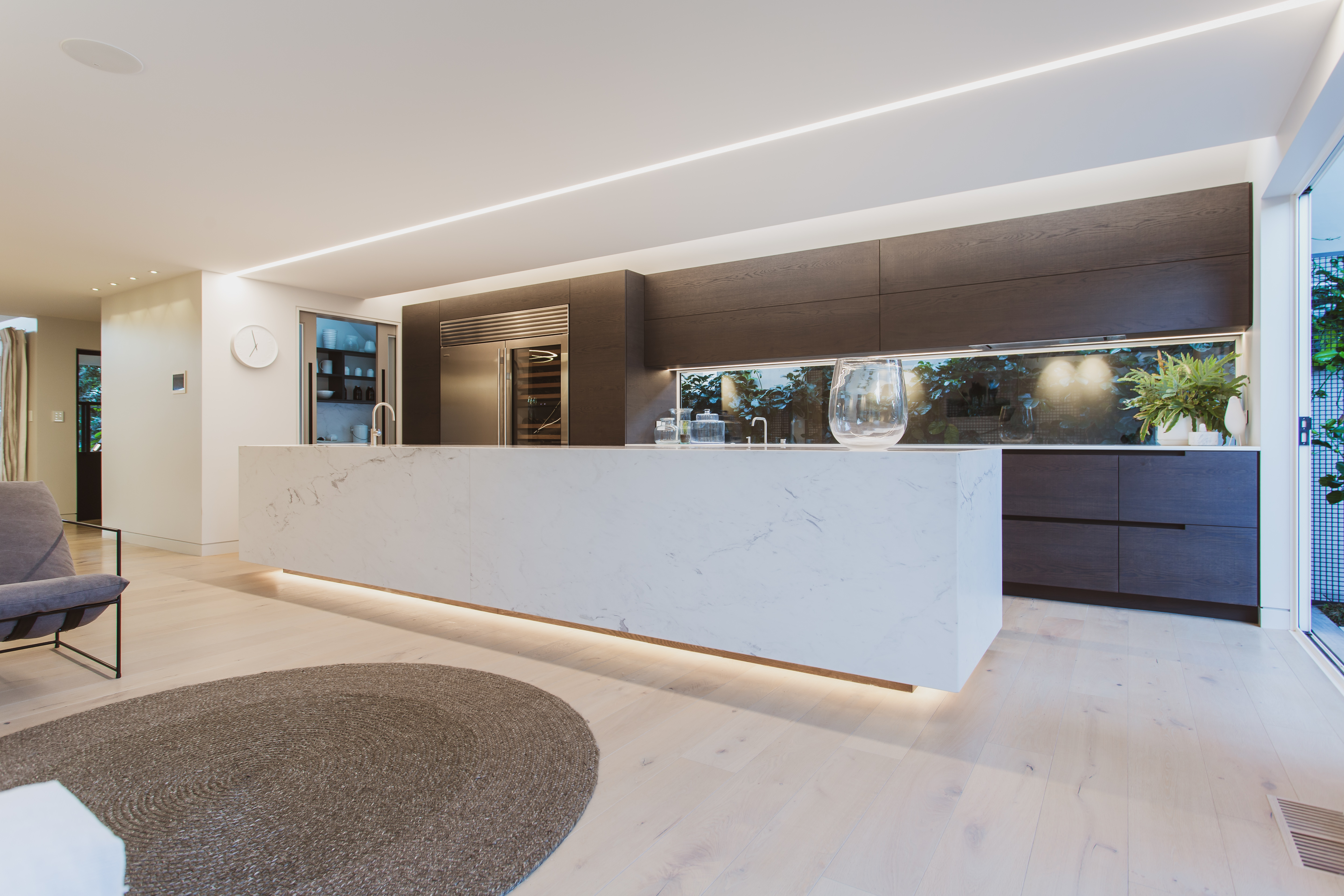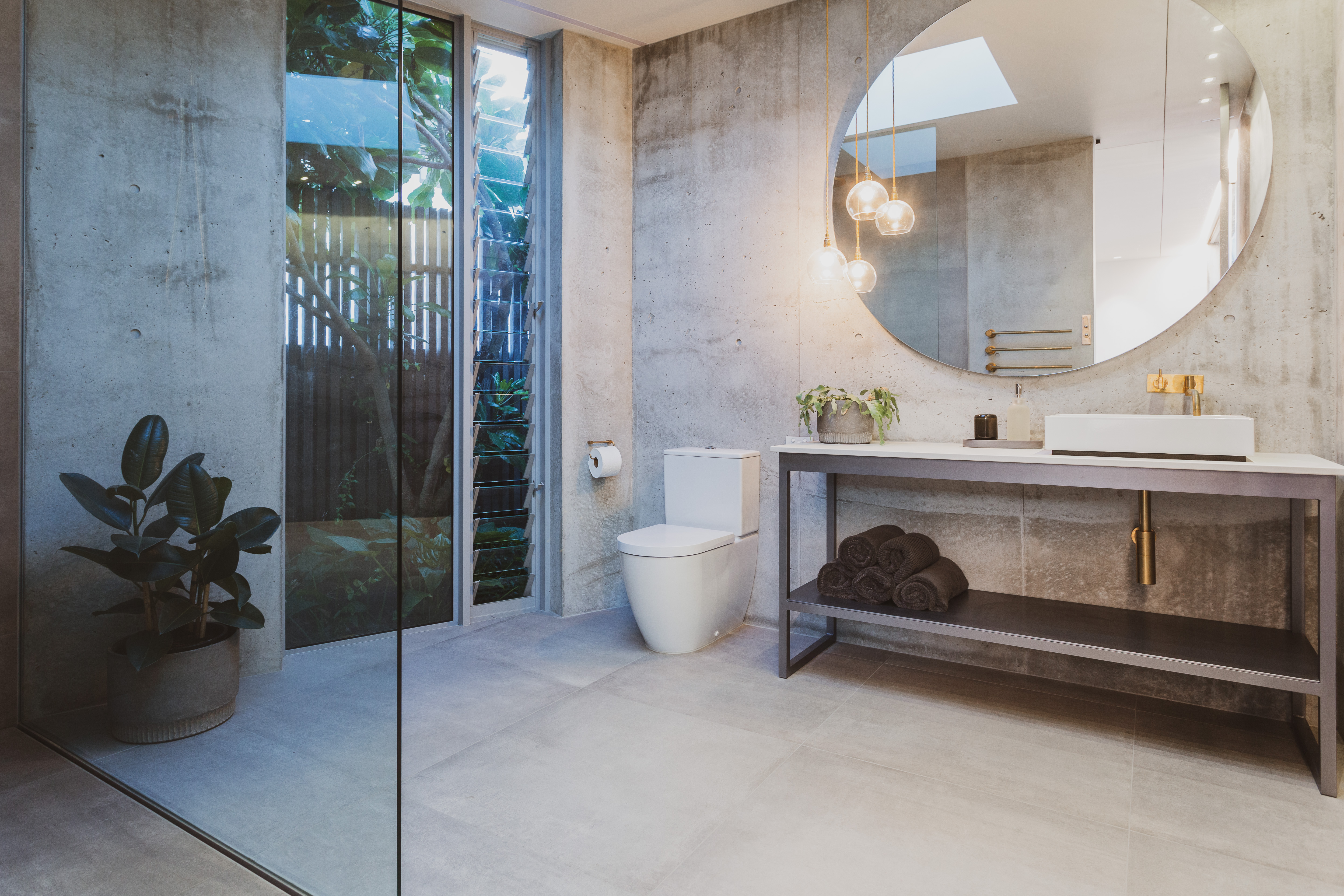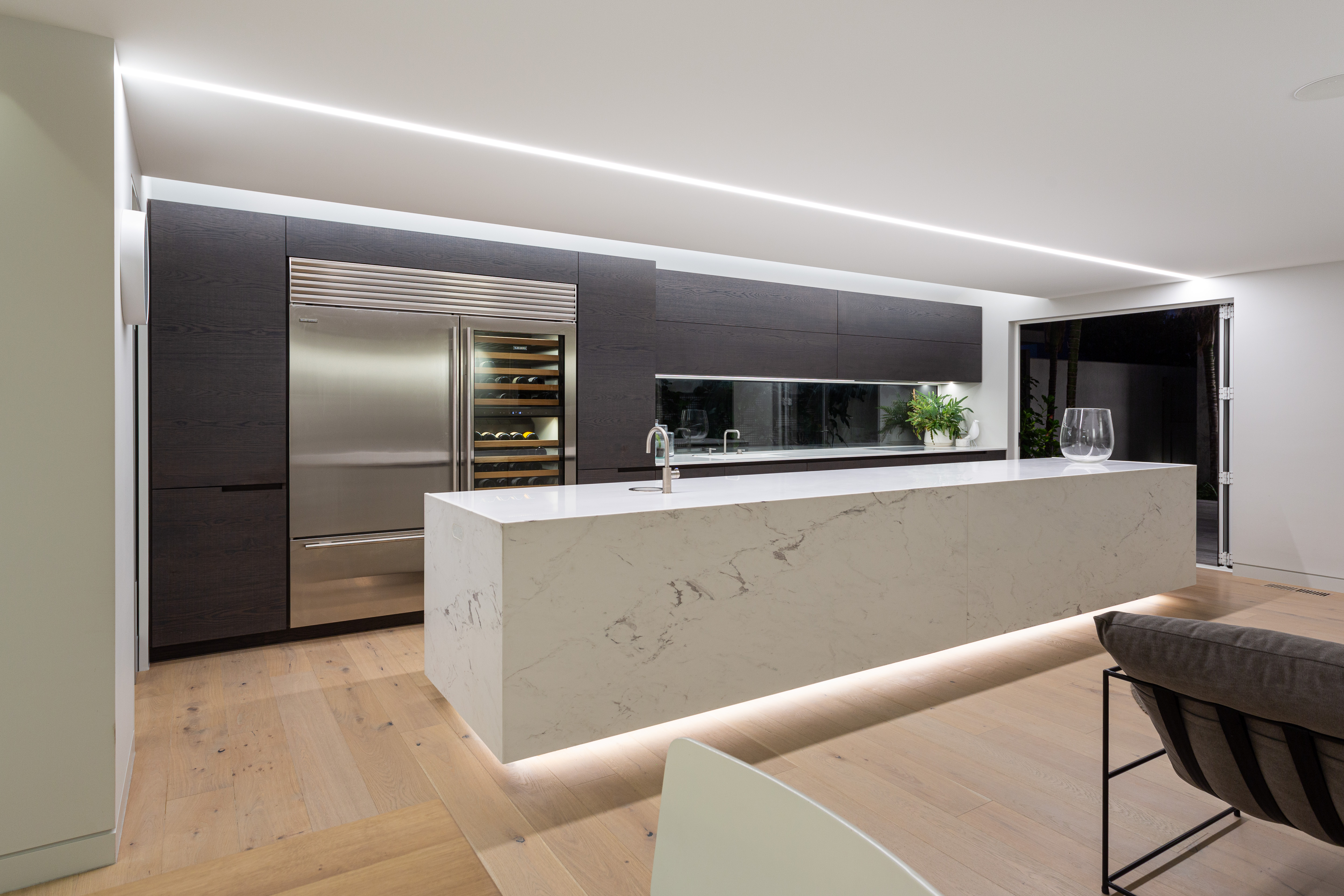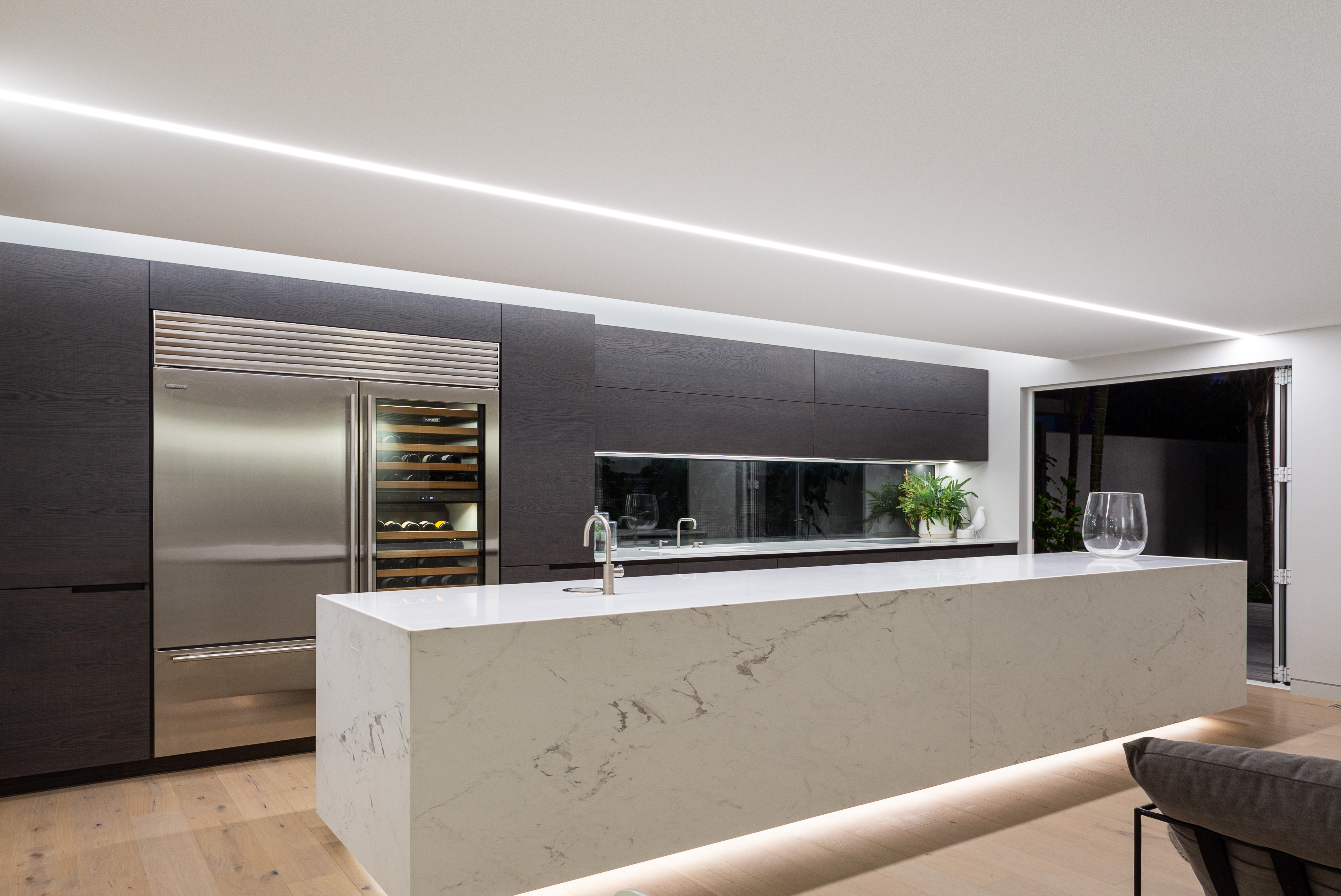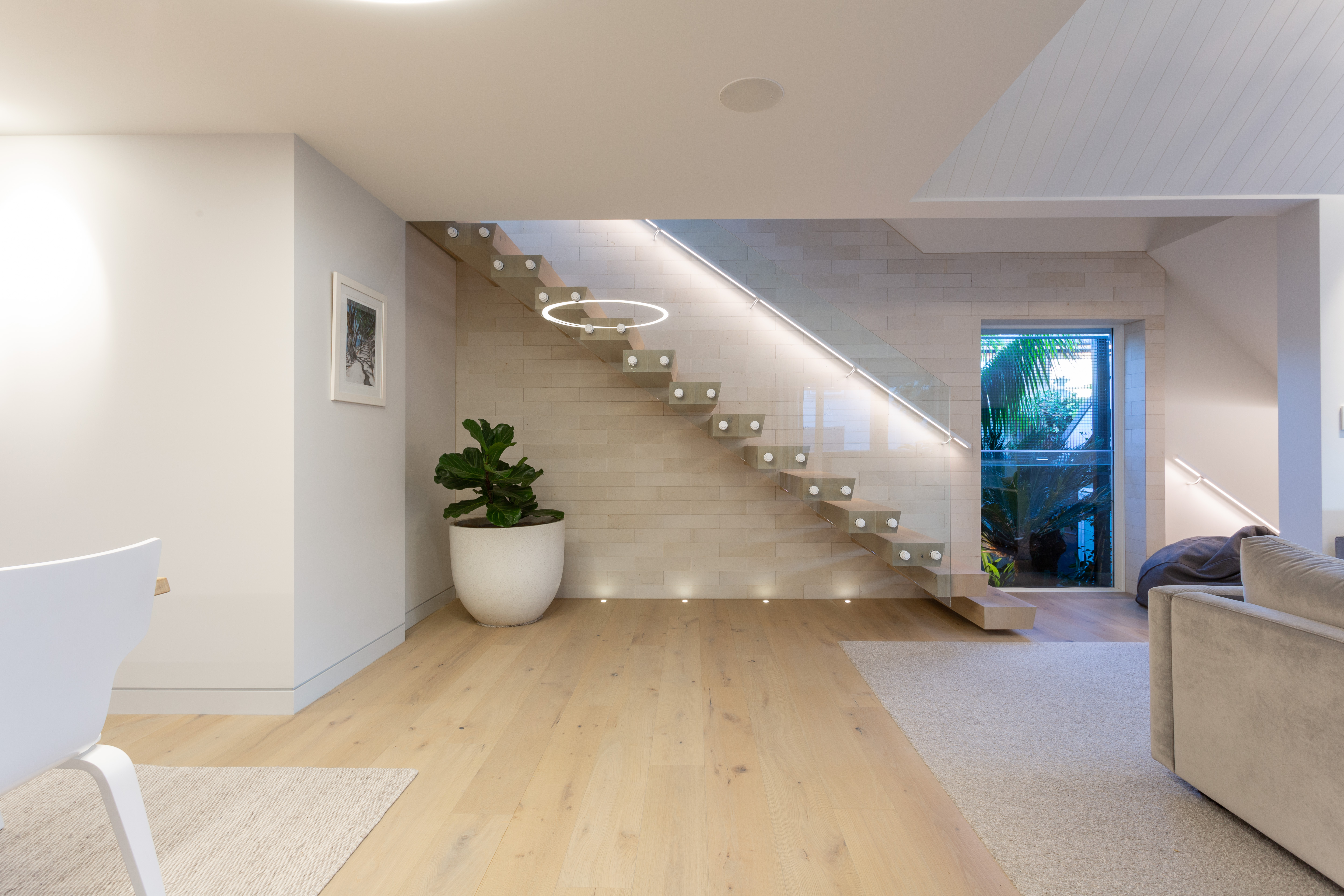 The project to renovate this architect designed four-bedroom house was major, but the results are spectacular. As well as an interior revamp, the outside was clad in striking black Linea weatherboard with white edging and architectural landscaping features were installed. The pool house, separated from the home by a private courtyard and the pool itself, is a major feature of the work. It was constructed with poured concrete and given a ply-grain finish. This magical space has frameless glass bifold doors, decking that flows from inside to out and all the bells and whistles. You’ll also find sophisticated automation, audio, and ducted air conditioning and heating in here and throughout the main house. The kitchen is a statement in style, with a five-metre marble island taking centre stage. Much of the interior lighting is custom designed to provide a minimalist finish, and high-end products are used everywhere: oak flooring, Danish bathroomware, wool carpets, specialty tiles and frameless showers. A glass-roofed carport, tropical landscaping and an automated entrance accentuate the class of the project.