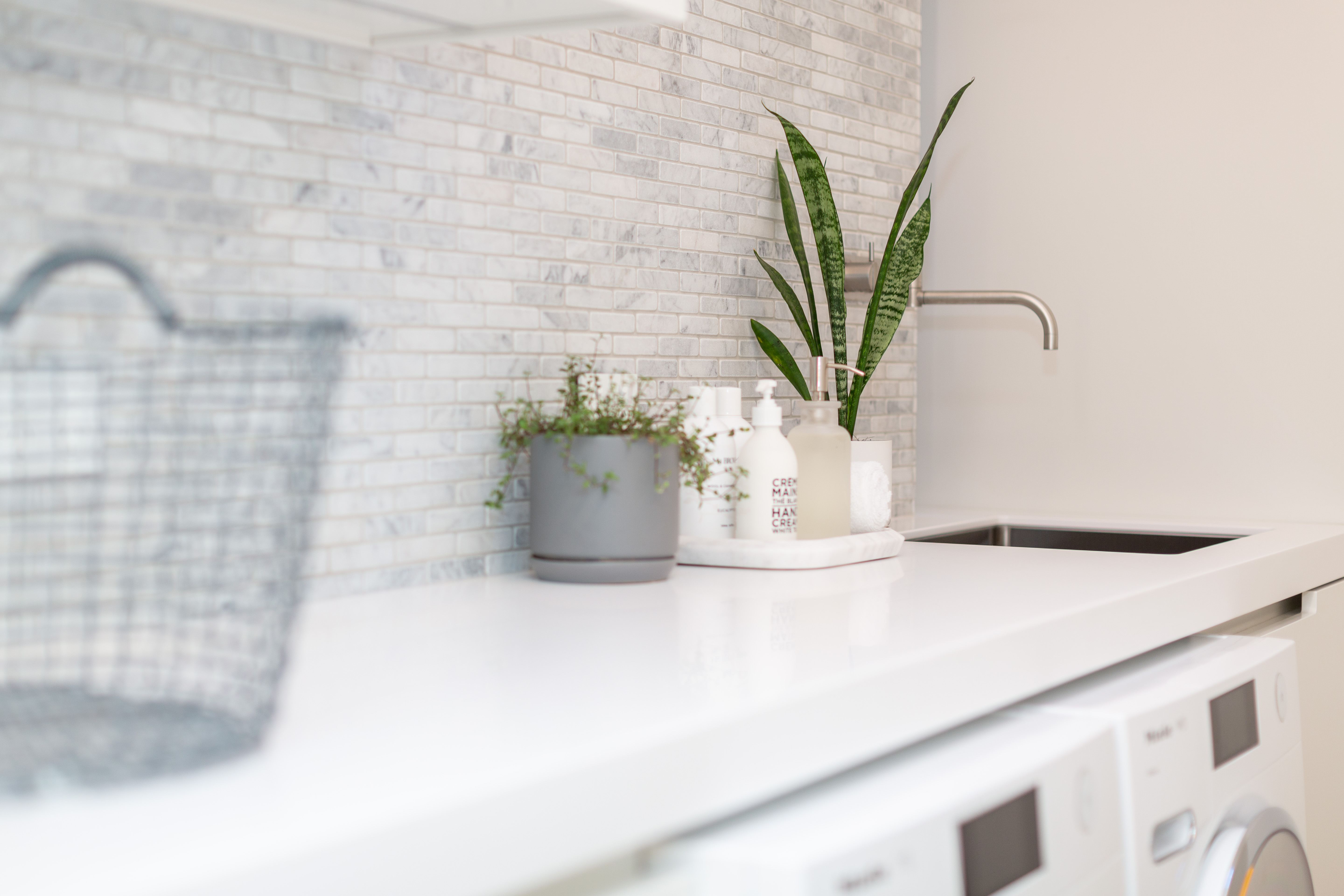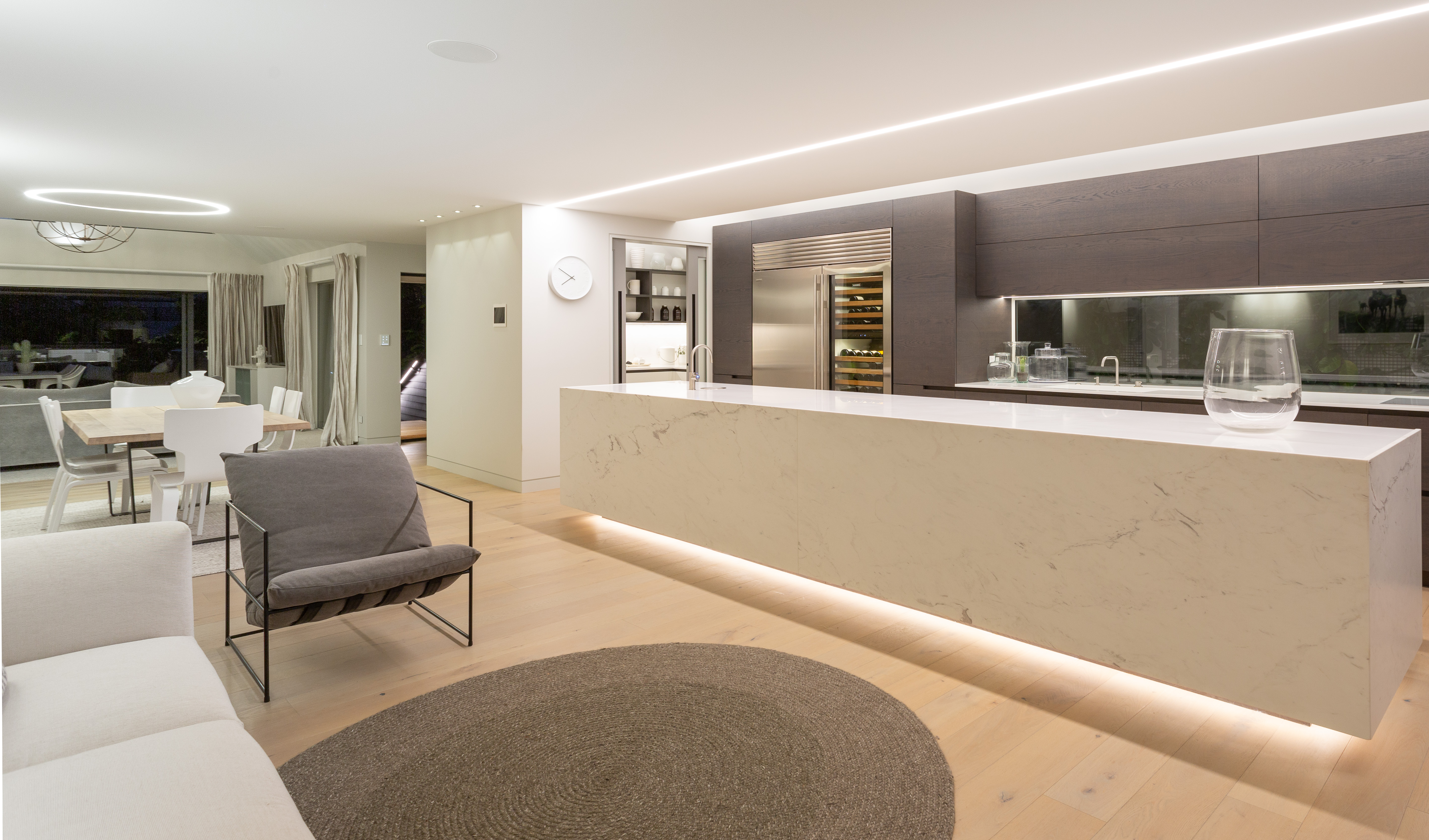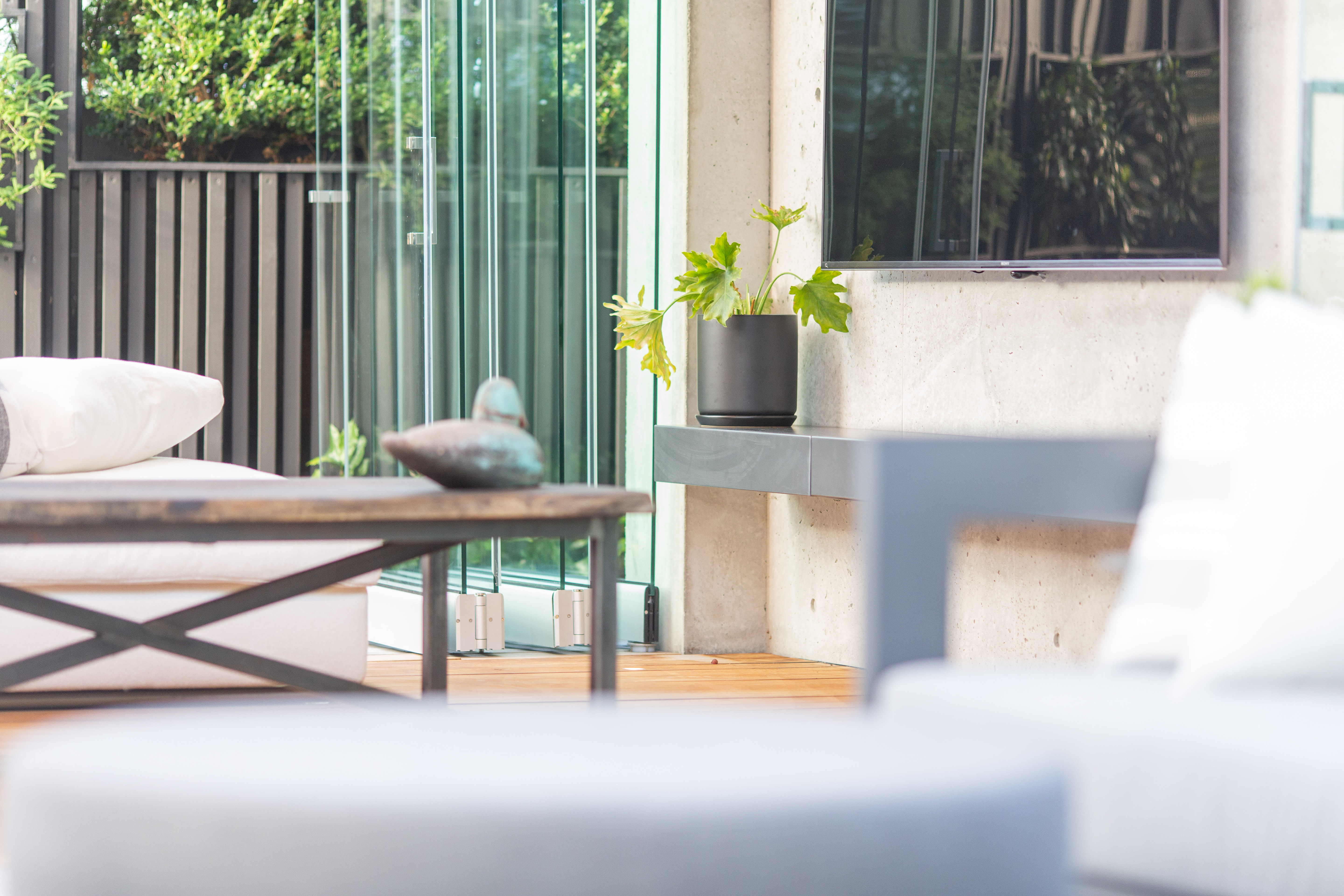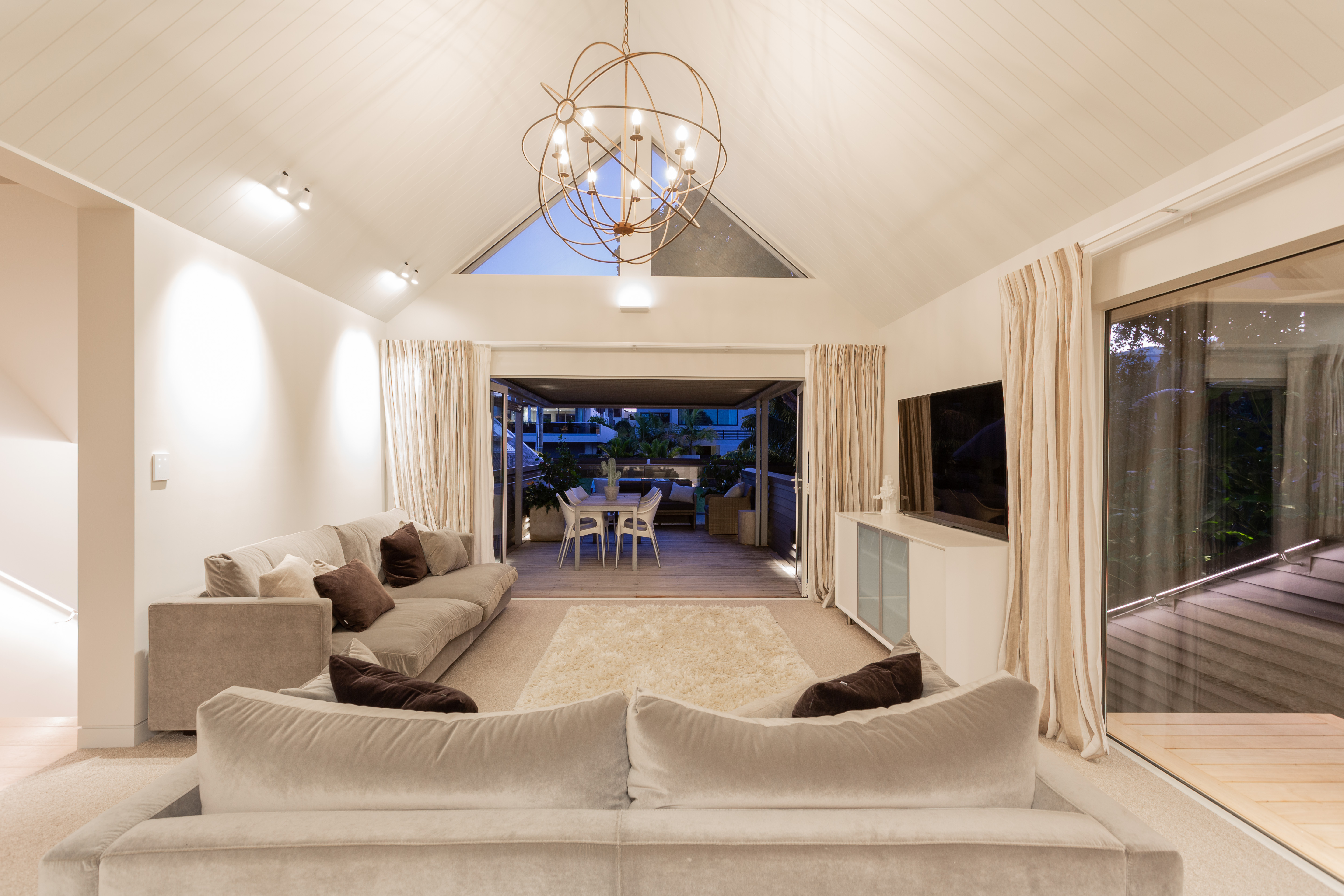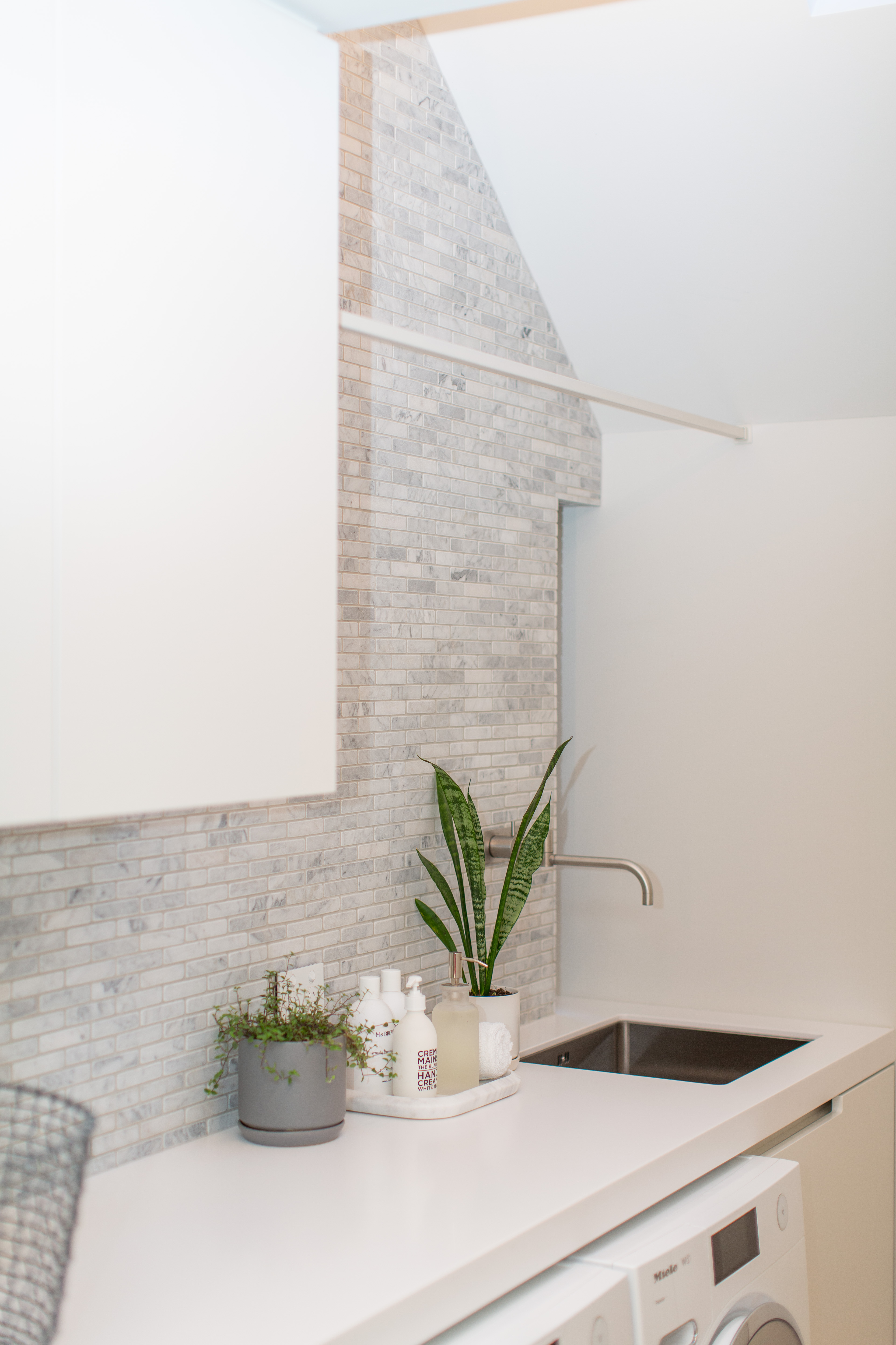 The project to renovate this architect designed four-bedroom house was major, but the results are spectacular. As well as an interior revamp, the outside was clad in striking black Linea weatherboard with white edging and architectural landscaping features were installed. The pool house, separated from the home by a private courtyard and the pool itself, is a major feature of the work. It was constructed with poured concrete and given a ply-grain finish. This magical space has frameless glass bifold doors, decking that flows from inside to out and all the bells and whistles. You’ll also find sophisticated automation, audio, and ducted air conditioning and heating in here and throughout the main house. The kitchen is a statement in style, with a five-metre marble island taking centre stage. Much of the interior lighting is custom designed to provide a minimalist finish, and high-end products are used everywhere: oak flooring, Danish bathroomware, wool carpets, specialty tiles and frameless showers. A glass-roofed carport, tropical landscaping and an automated entrance accentuate the class of the project.