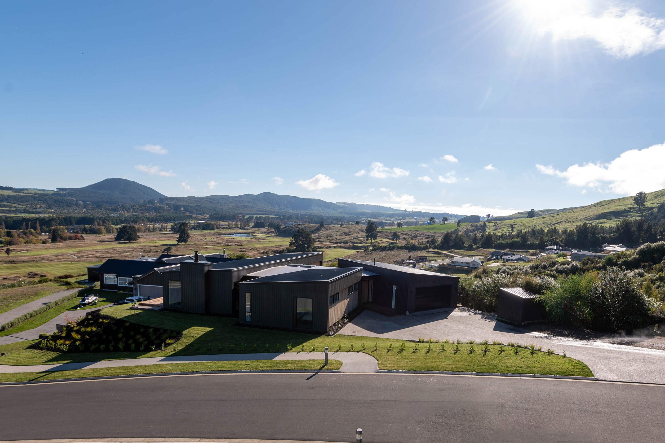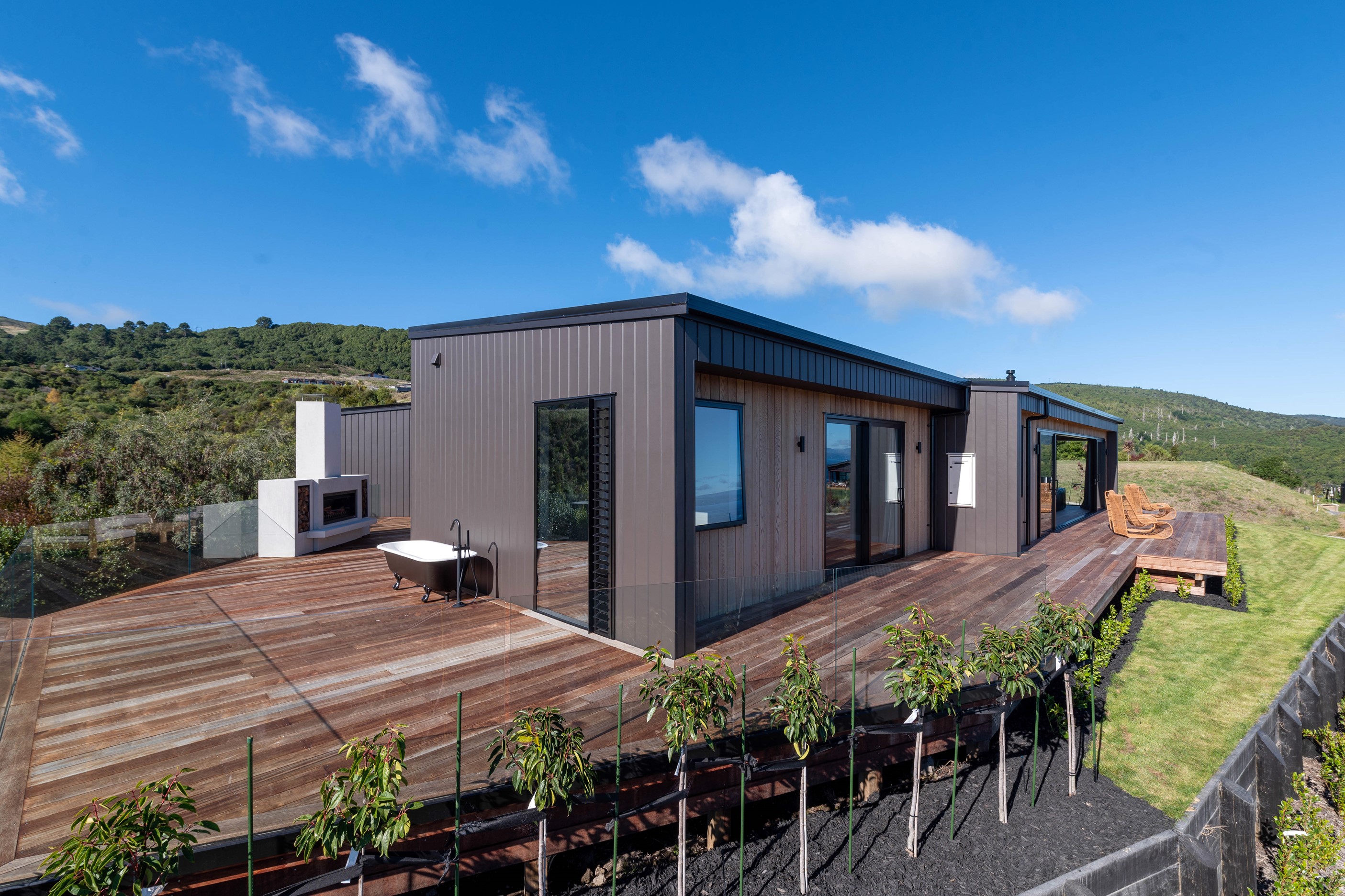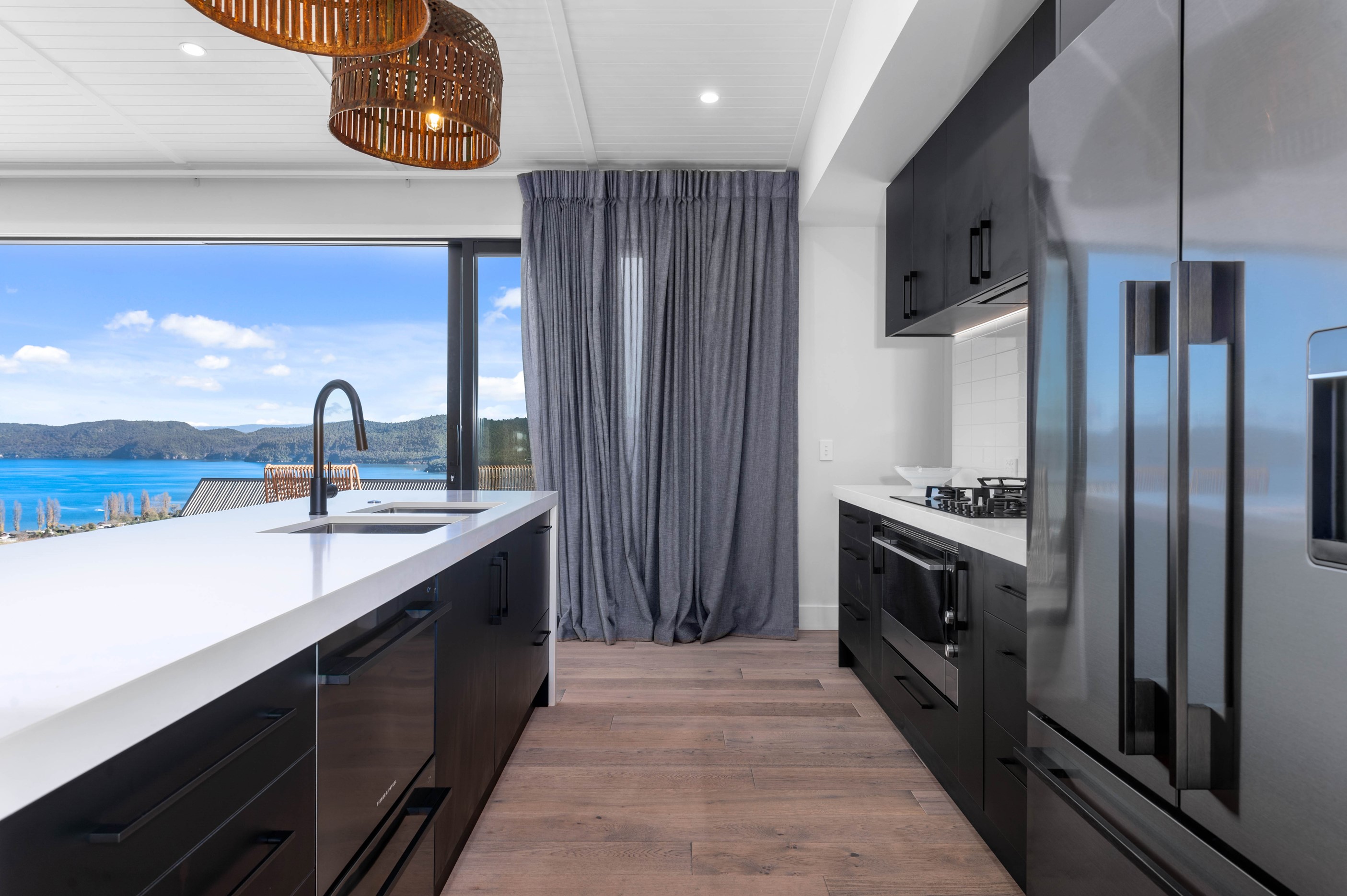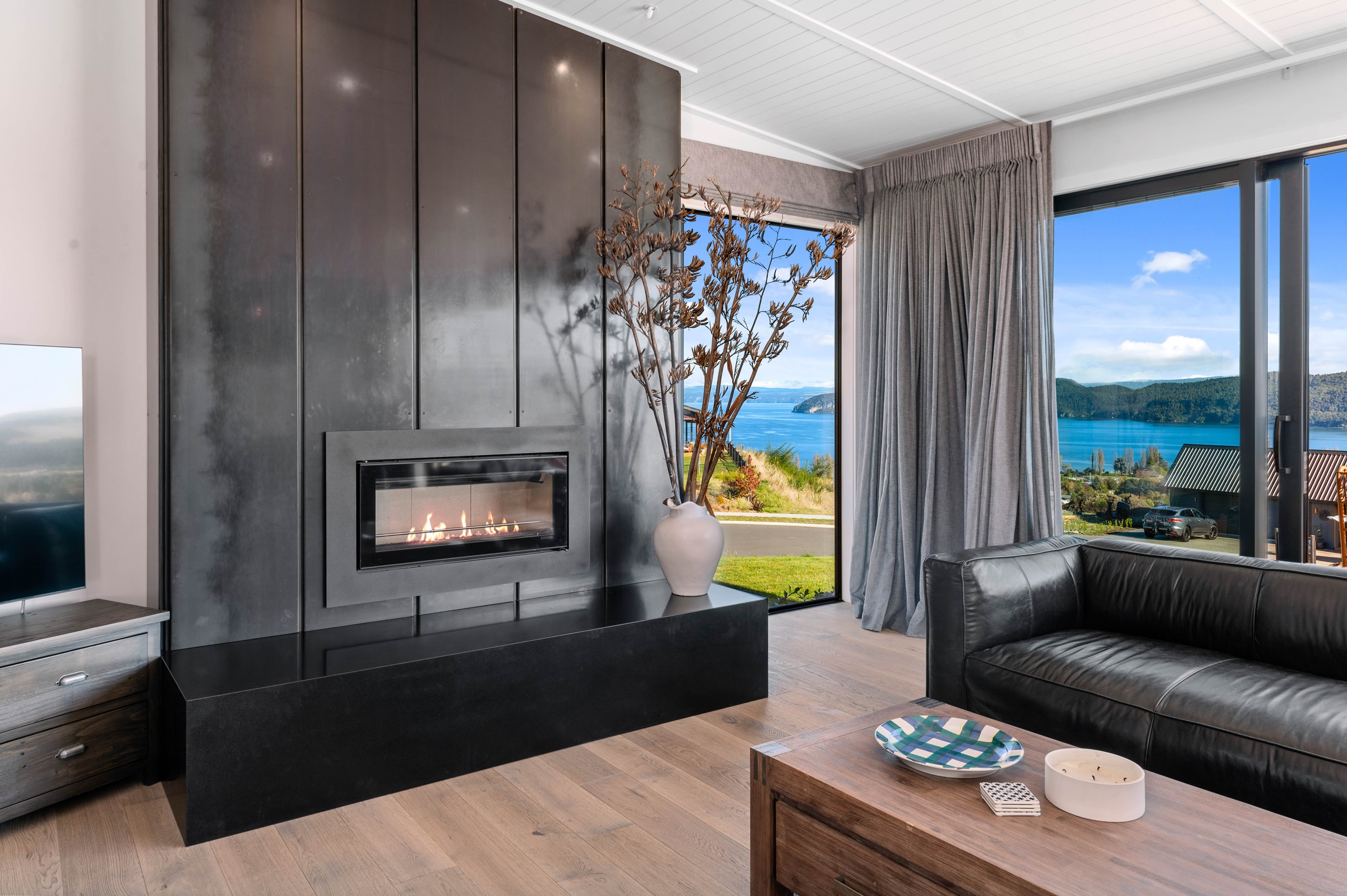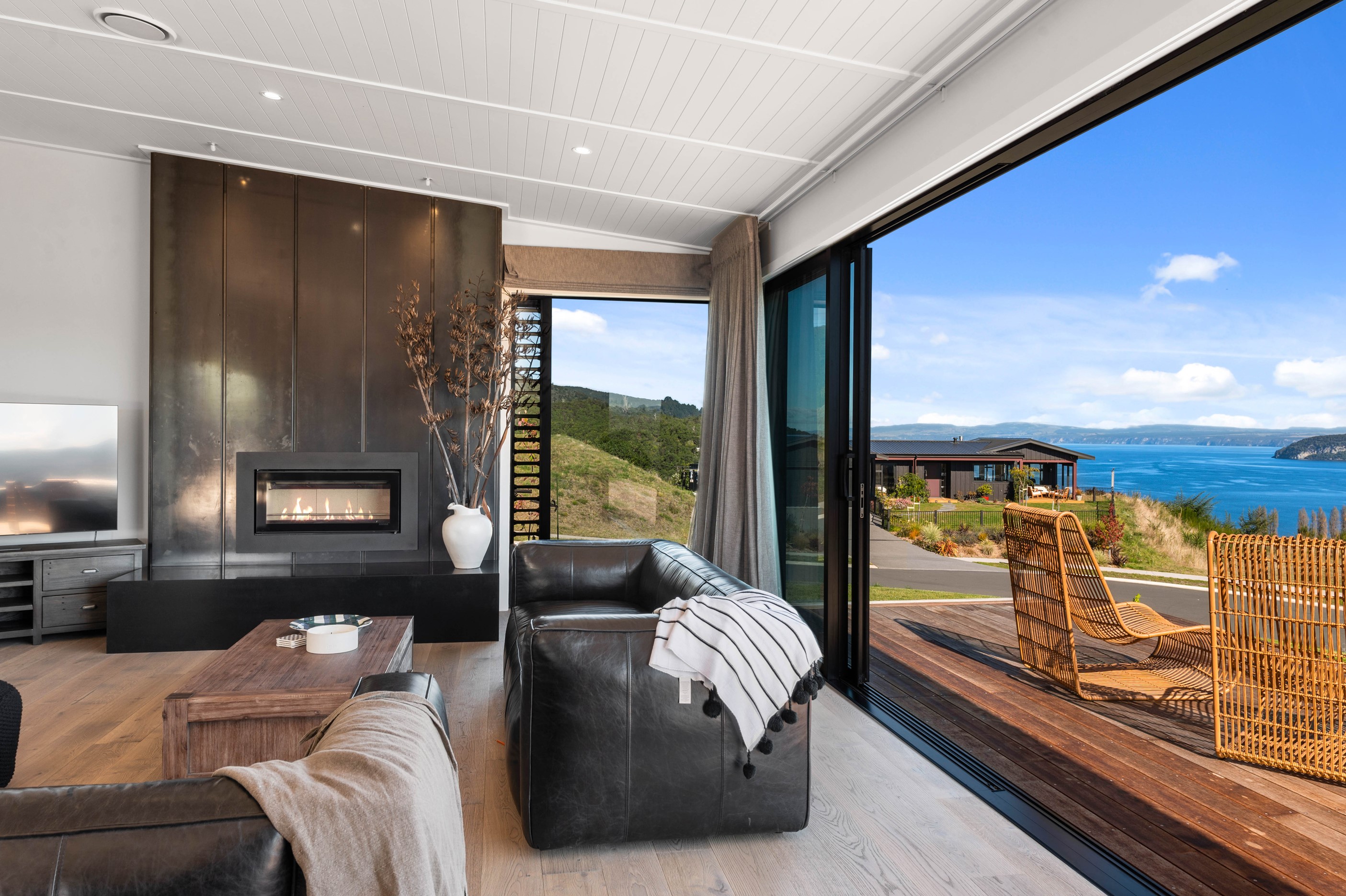 At first glance, this house is a stunner, its dark, woody exterior juxtaposed against the shades-of-green landscape and blues of Lake Taupō. On closer inspection, you’ll find plenty more features that take the 302sqm home to the next level. One of the major drawcards is a 240sqm wrap-around timber deck with an outdoor fire and bath. Is there a better, more tranquil place from which to enjoy the panoramic views of land and lake? And because part of this sprawling terrace is covered, rainy weather is never an issue. Inside, you’ll find four bedrooms, three high-end bathrooms and two living areas. Almost every room has a view and dark cabinetry creates a moody style. The living area, combined with a cleverly designed kitchen and scullery, make it a natural for entertaining. A blackened steel fireplace anchors the main living space, creating a dramatic but cosy effect and an extra-large glass sliding door maximises that remarkable view. Nothing has been left to chance in this light, airy and sunny architectural home, from the way it occupies its site to the many special features within.