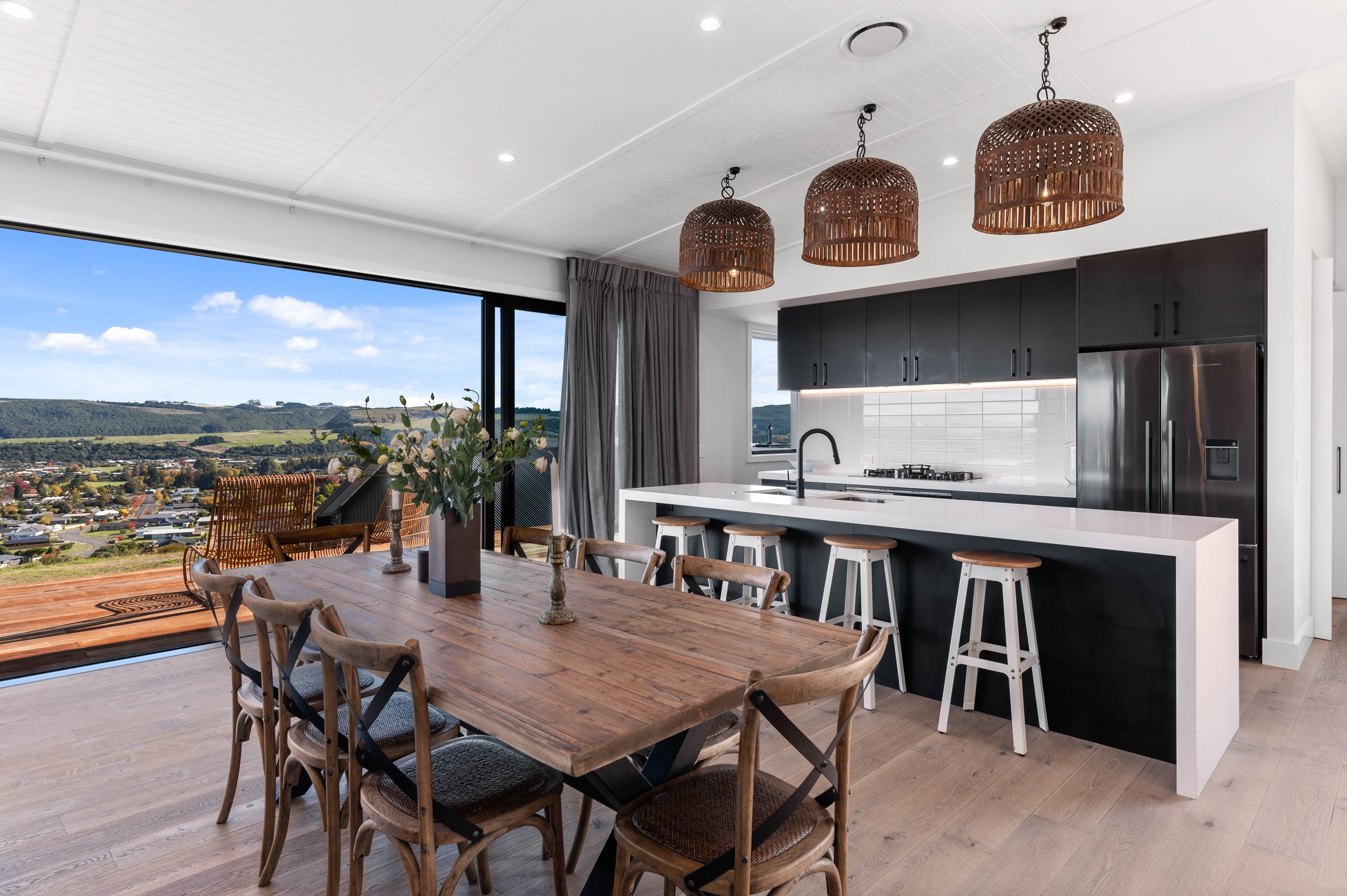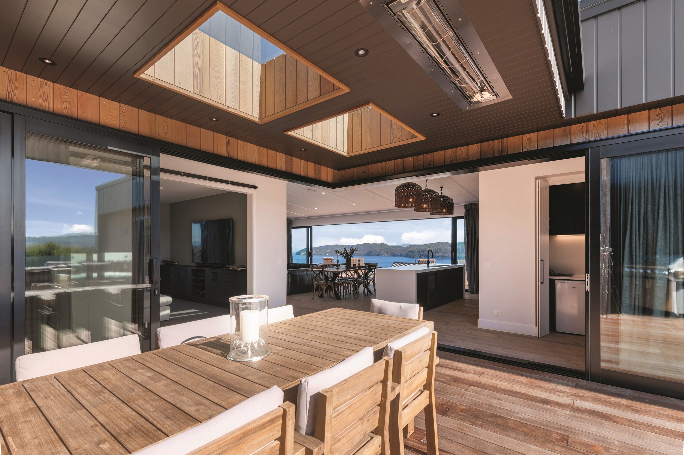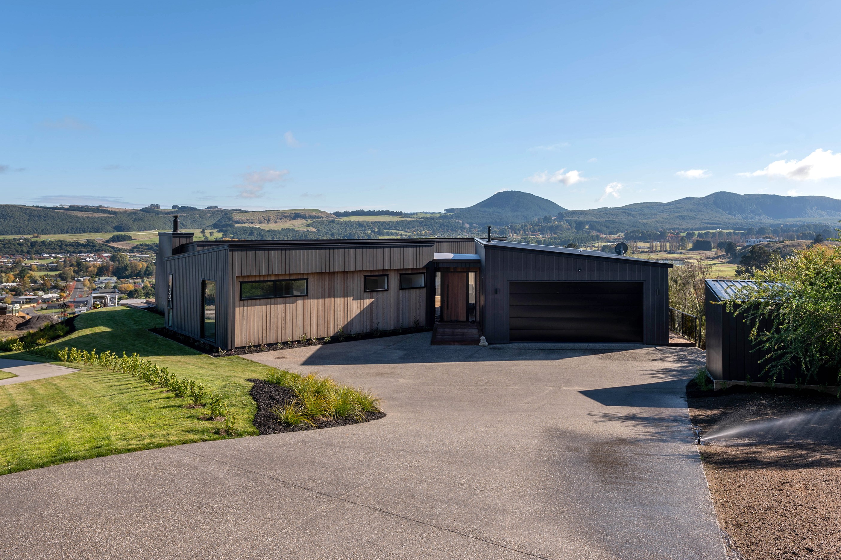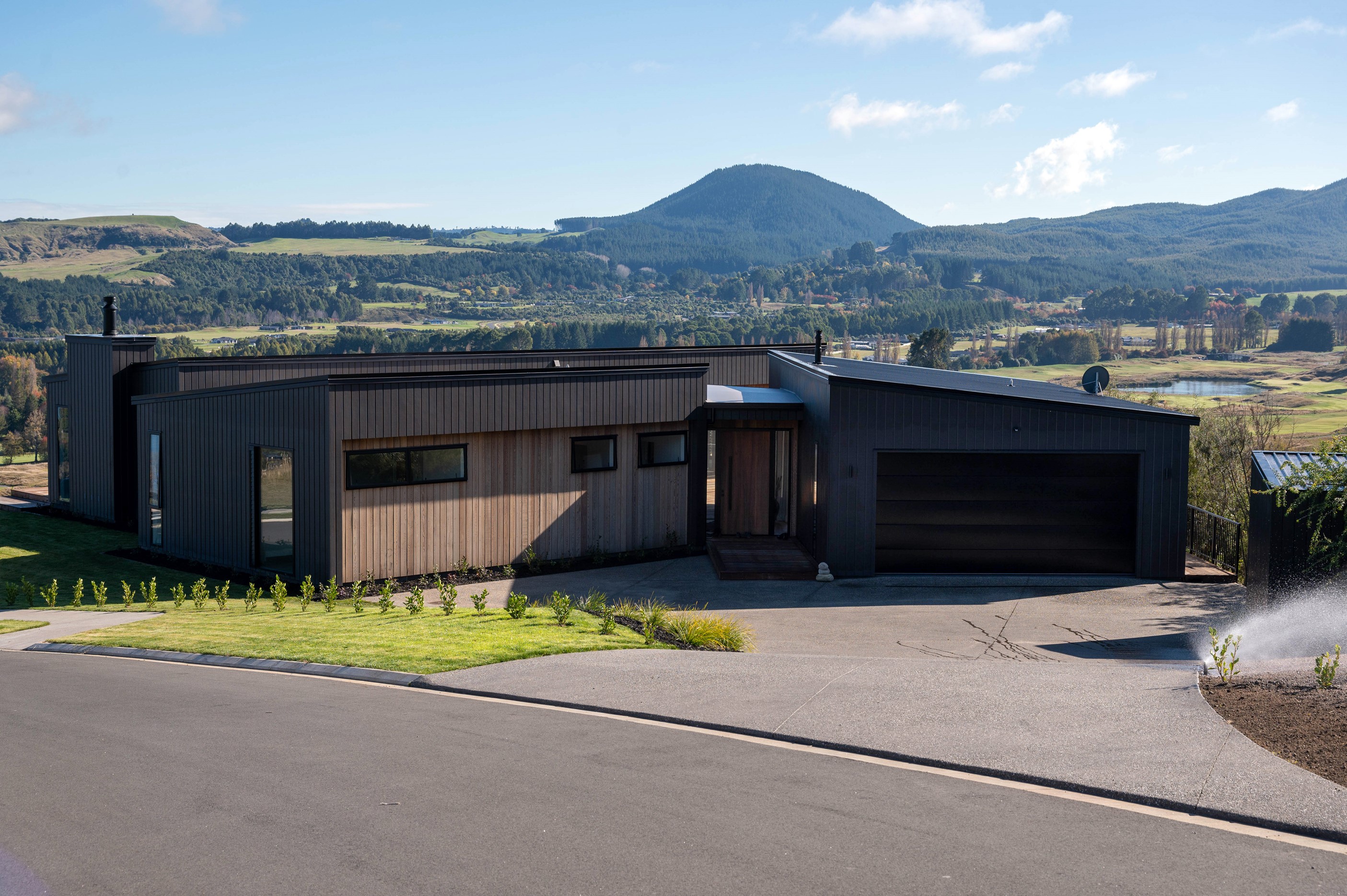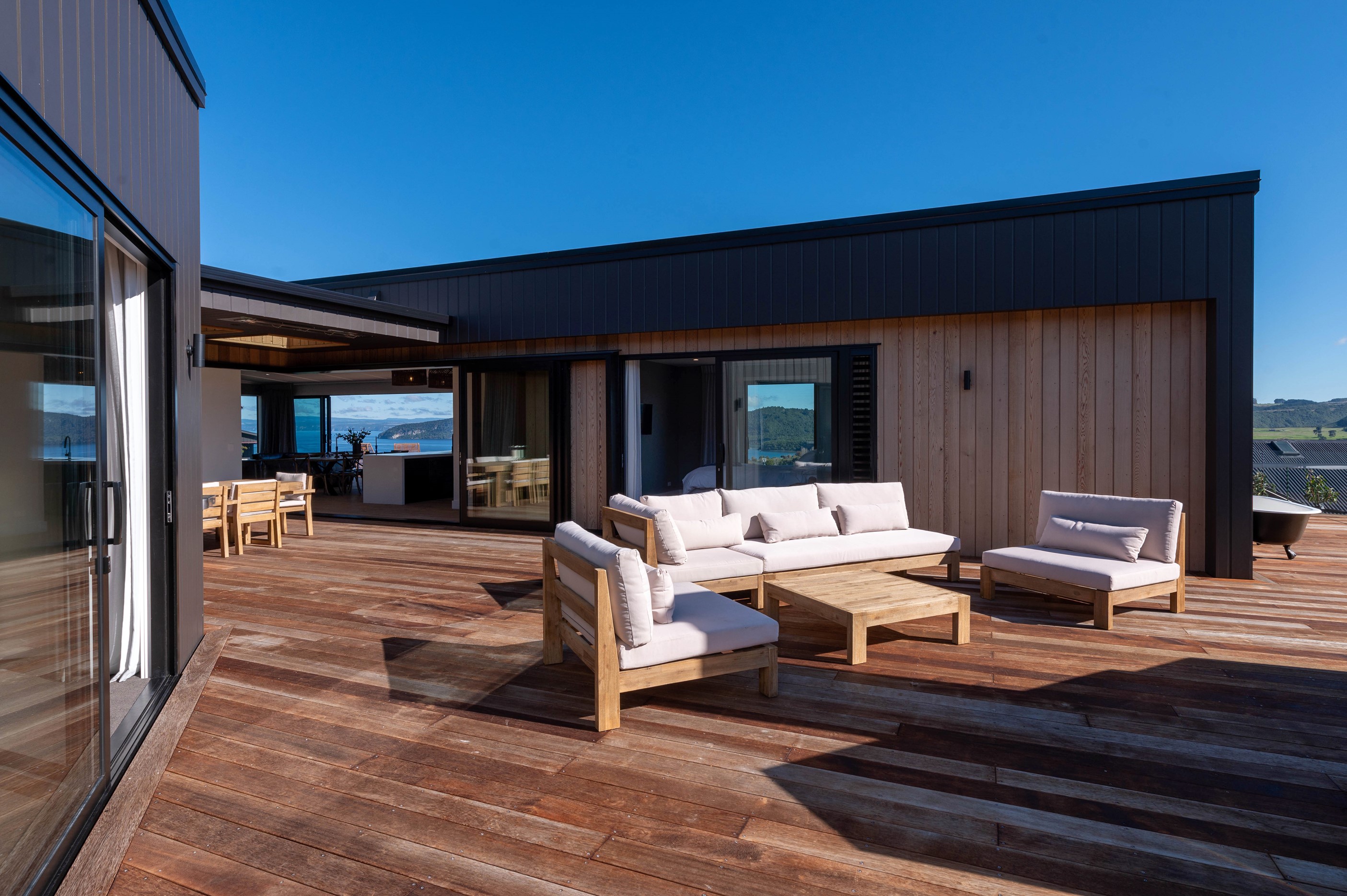 At first glance, this house is a stunner, its dark, woody exterior juxtaposed against the shades-of-green landscape and blues of Lake Taupō. On closer inspection, you’ll find plenty more features that take the 302sqm home to the next level. One of the major drawcards is a 240sqm wrap-around timber deck with an outdoor fire and bath. Is there a better, more tranquil place from which to enjoy the panoramic views of land and lake? And because part of this sprawling terrace is covered, rainy weather is never an issue. Inside, you’ll find four bedrooms, three high-end bathrooms and two living areas. Almost every room has a view and dark cabinetry creates a moody style. The living area, combined with a cleverly designed kitchen and scullery, make it a natural for entertaining. A blackened steel fireplace anchors the main living space, creating a dramatic but cosy effect and an extra-large glass sliding door maximises that remarkable view. Nothing has been left to chance in this light, airy and sunny architectural home, from the way it occupies its site to the many special features within.